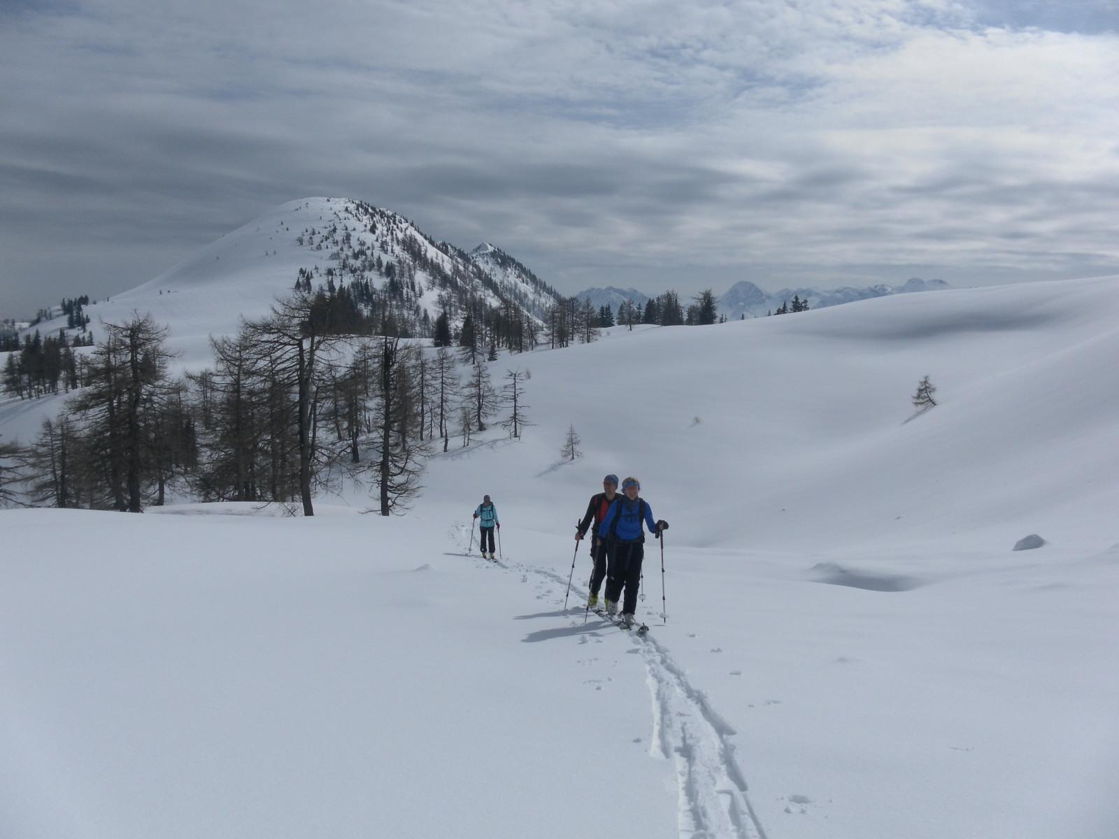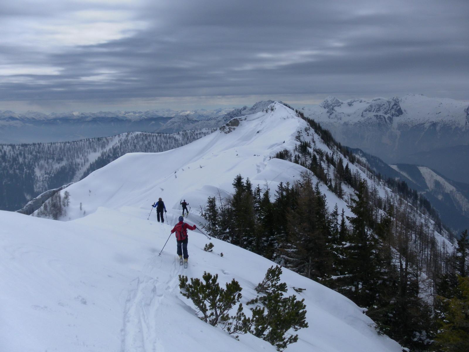 Nach Peter Bruckmosers Zinkentour-Beitrag vom Vortag erwarteten wir einen Massenansturm auf den Hohen Zinken. Aber nur wenige wählen dieses Ziel bei optimalen Anstiegsbedingungen aus. Hinter dem Zinken sind wir dann sowieso allein zum Egelseehörndl unterwegs. Der Schnee zur Fahrnkaralm hinunter ist schon sehr durchfeuchtet, zentral eine große Lawine aus zwei Schneebrettabgängen. Da die Abfahrt vom Pitscherberg nicht einladend aussieht, steigen wir über die Abfahrtsspur zurück zum Großen Radl. Die Abfahrt über den Schneegraben ist ab der engen Steilstufe nicht lukrativ, Steine, Grasnarbe, Lawinenknollen... Wir steigen zurück zum Zinken. Nur mehr im dichten Wald Pulver, sonst durchwegs feuchter Neuschnee, manchmal leichter Winddeckel.