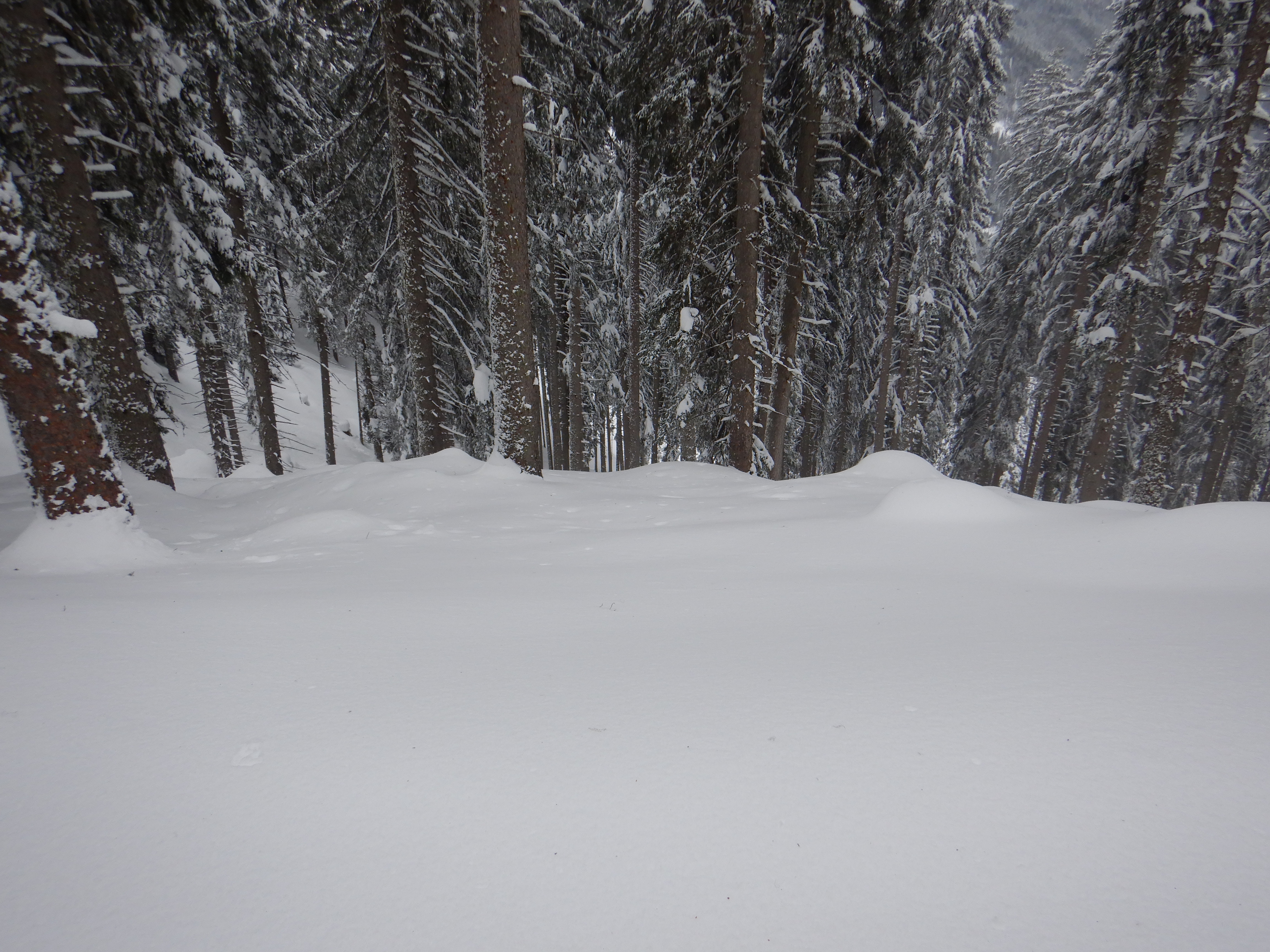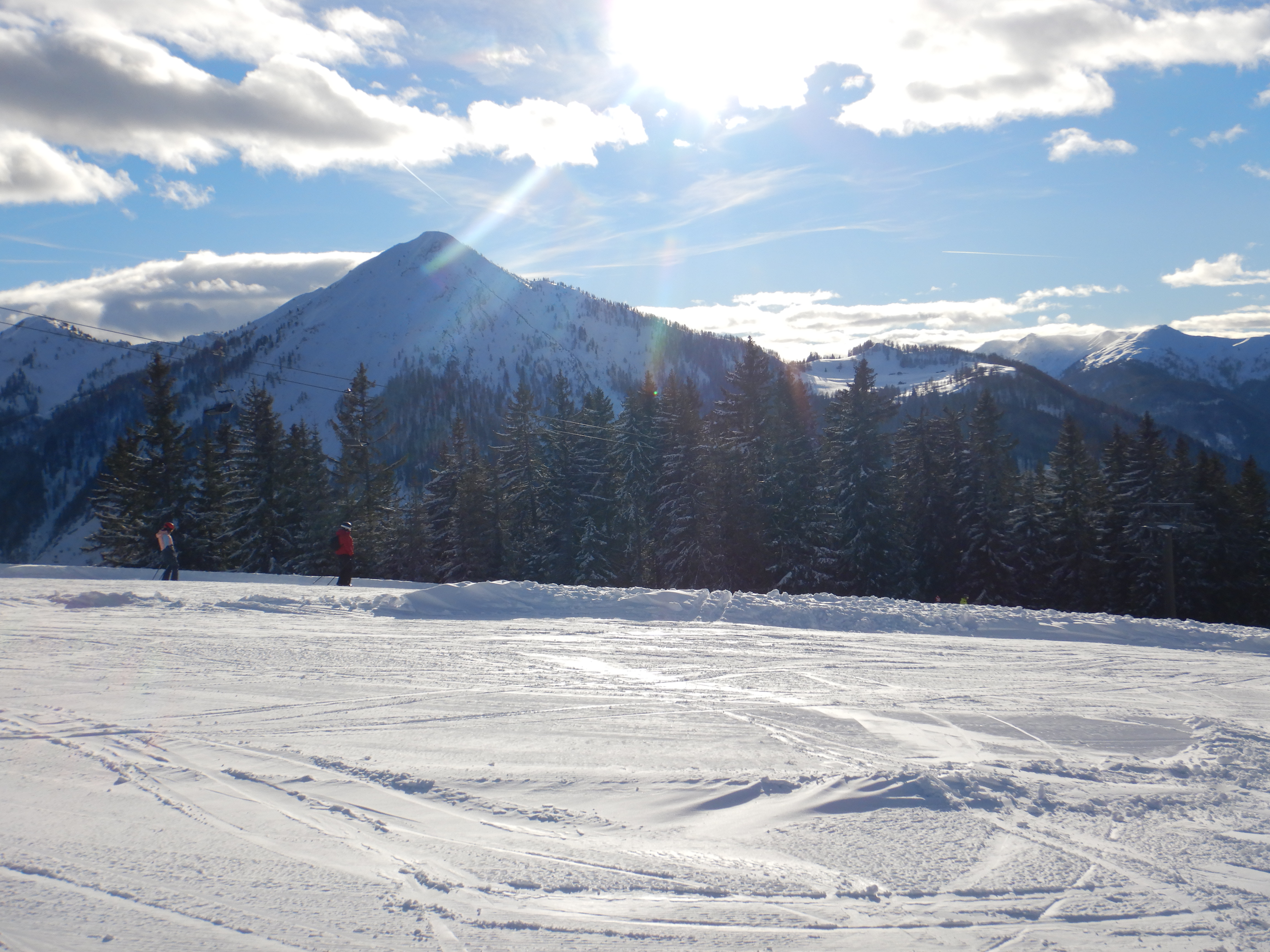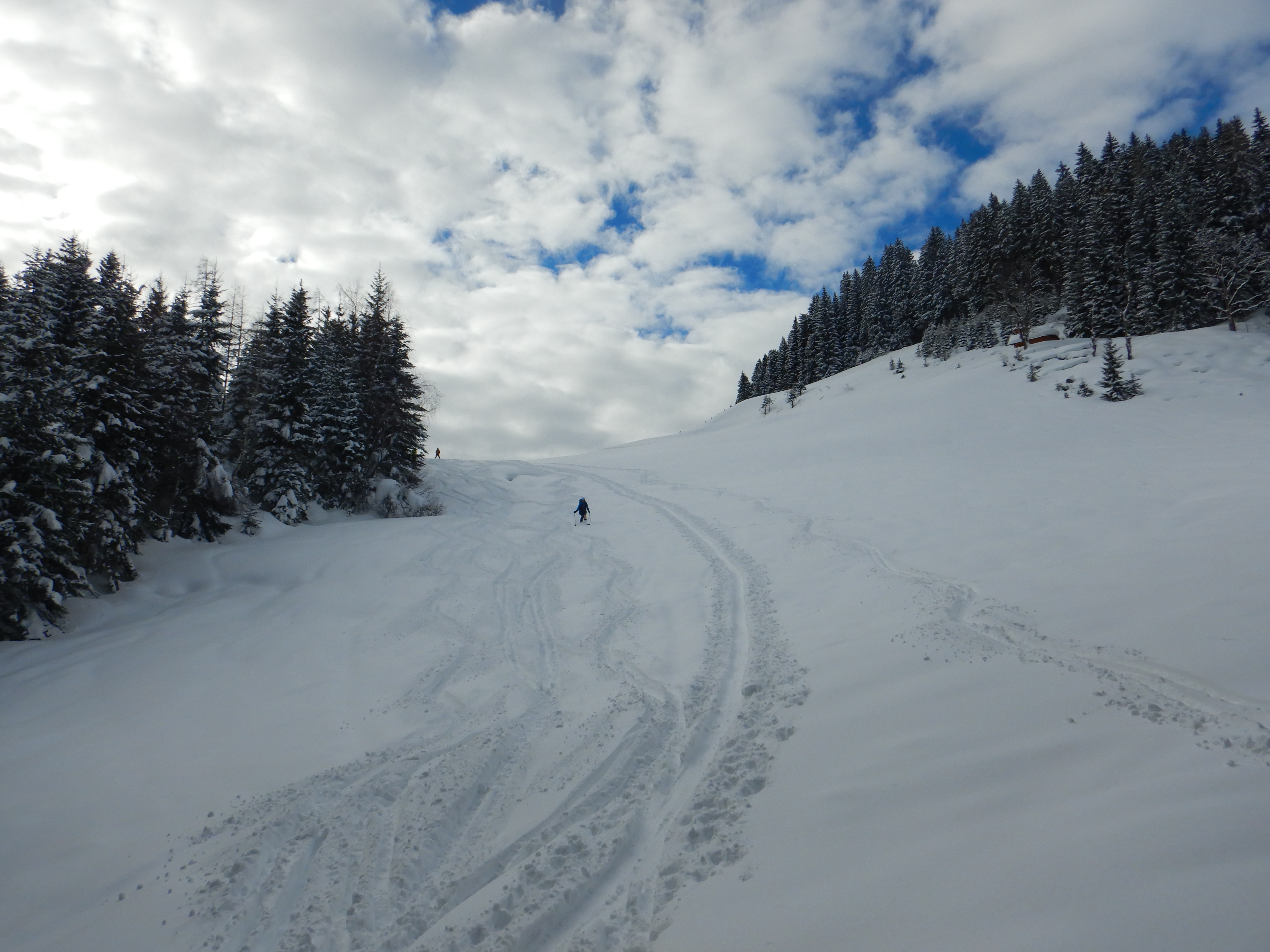 Bis zur Lackenalm wunderbar unverspurter Pulver, am Kamm zum Lackenkogel böig windig, der Schnee windgepresst, den letzten Gipfelhang haben heute die meisten Tourengeher ausgelassen. Abfahrt bis zur Lackenalm ok., ab dann wunderbar, obwohl auf den untersten Wiesen der Schnee durch den Temperaturanstieg bereits weich zu werden beginnt.