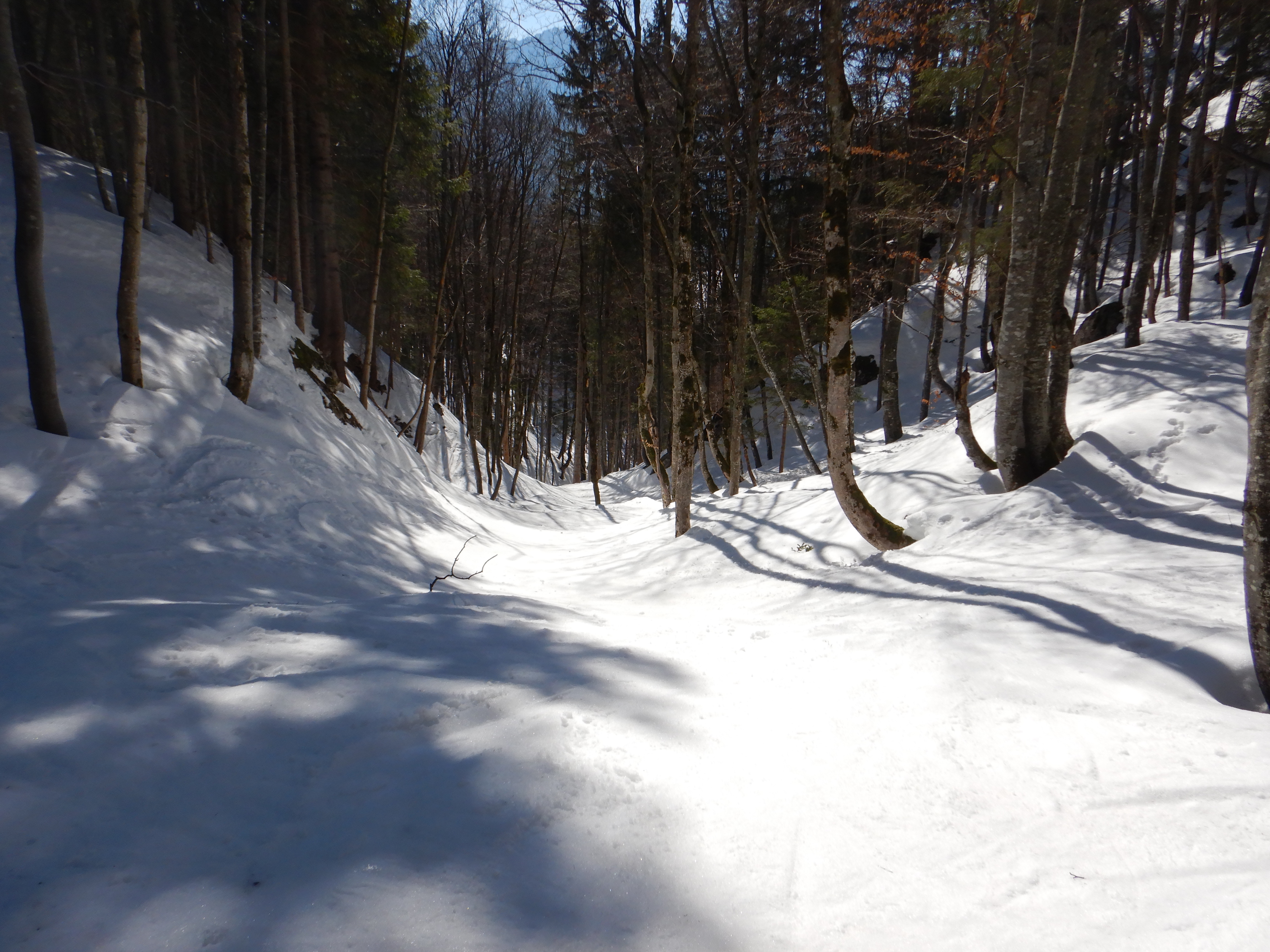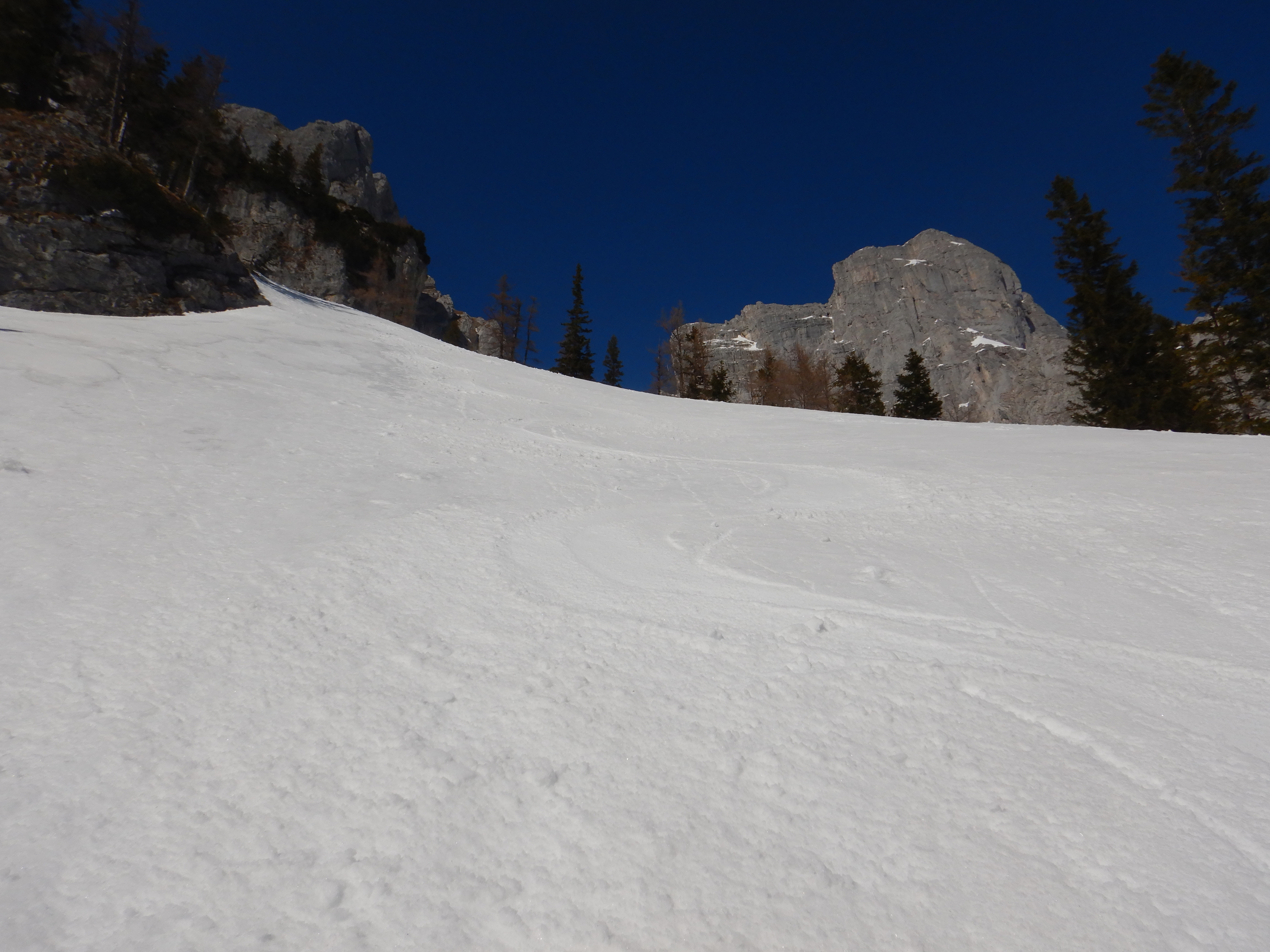 Oberes Drittel windgepresster Schnee, Mitte Firn, unten bei Sonneneinstrahlung weich, im Wald bobbahnartig hart ausgefahren. Stabile Schneedecke, für Nassschneegefährdung derzeit noch zu geringe Tageserwärmung.