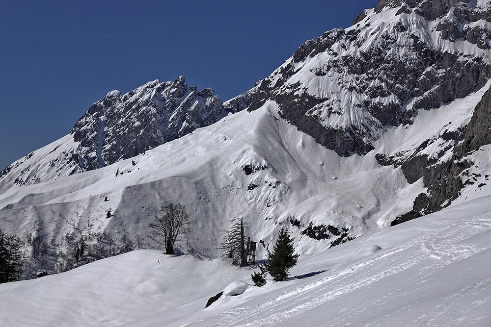 Endlich warm an den Südhängen, die zähe , kalte polare Luftströmung hat sich verabschiedet, Firn bildet sich und hat mir heute am Fuß der Mandlwände Freude bereitet.