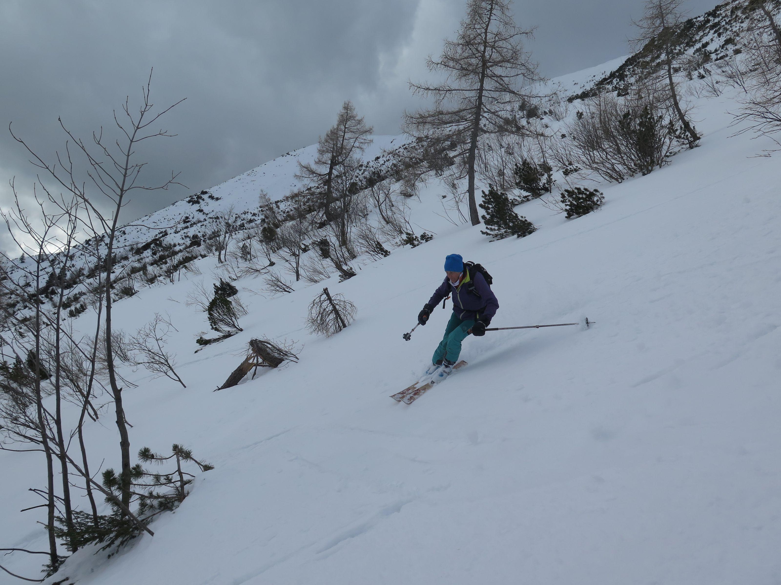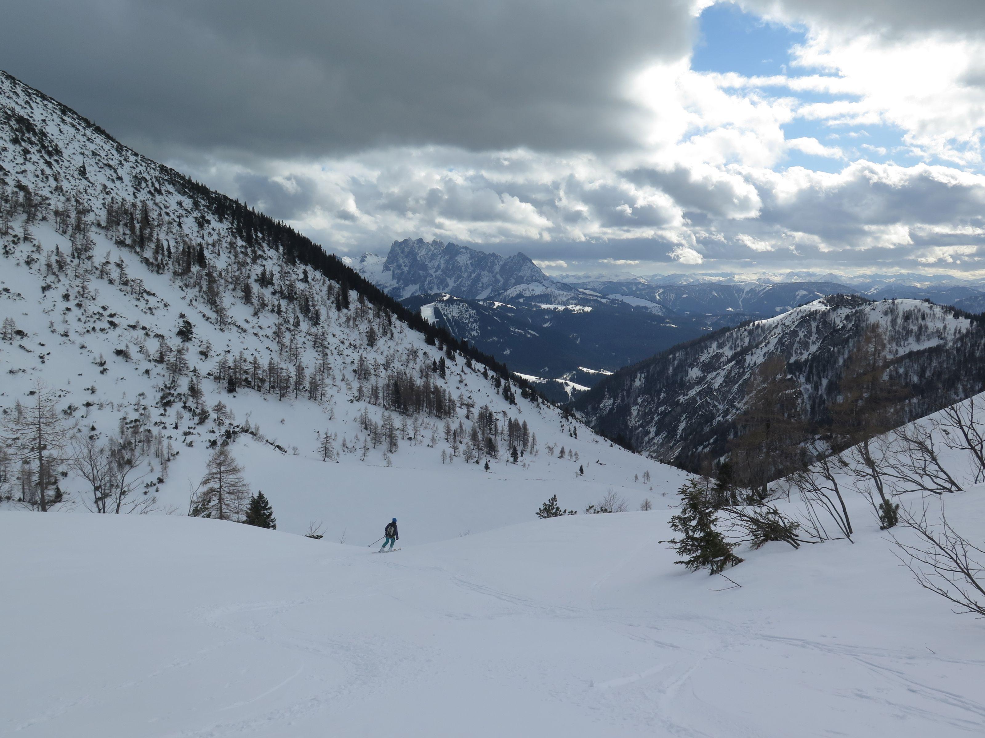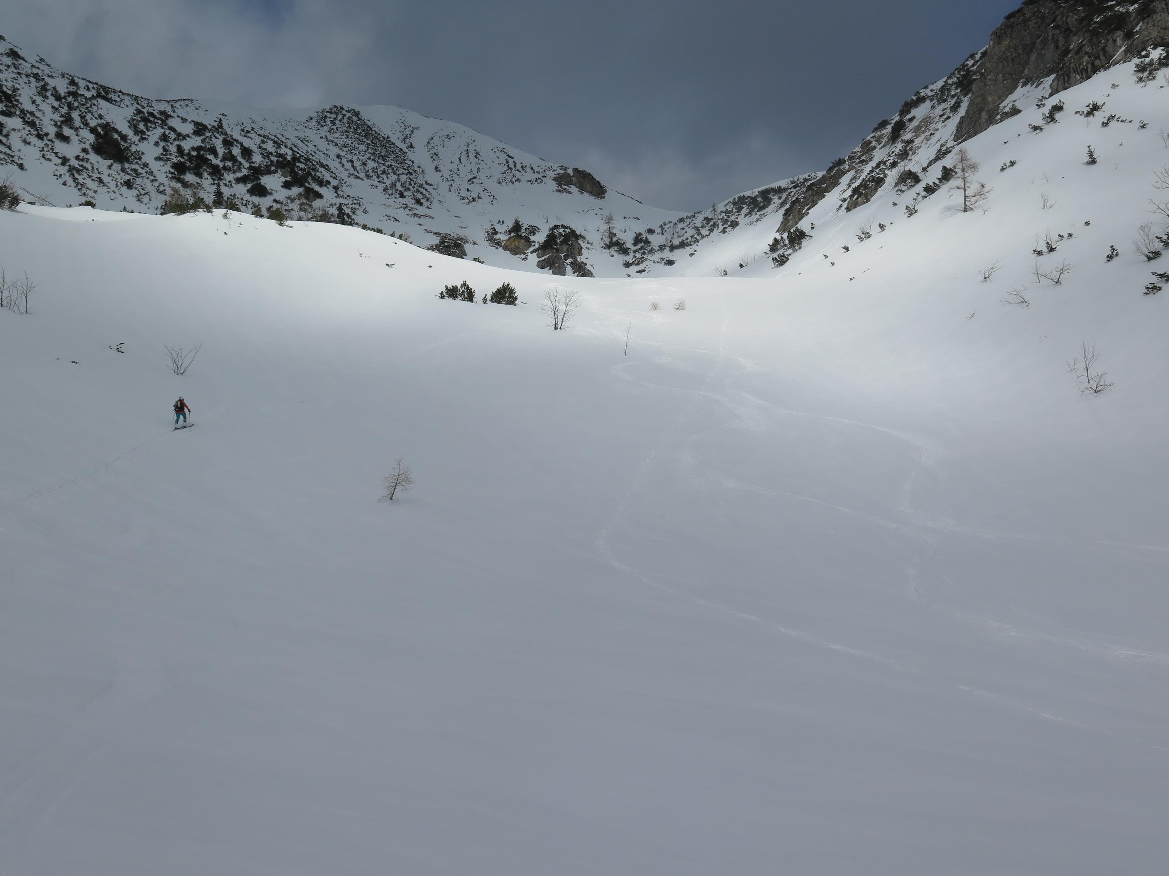 Abfahrt über den Osthang hart und griffig mit geringer Neuschneeauflage, im Mittelteil tragfähiger Harschdeckel, auf den Almböden zur Rinnbergalm schöner Bruchharsch
