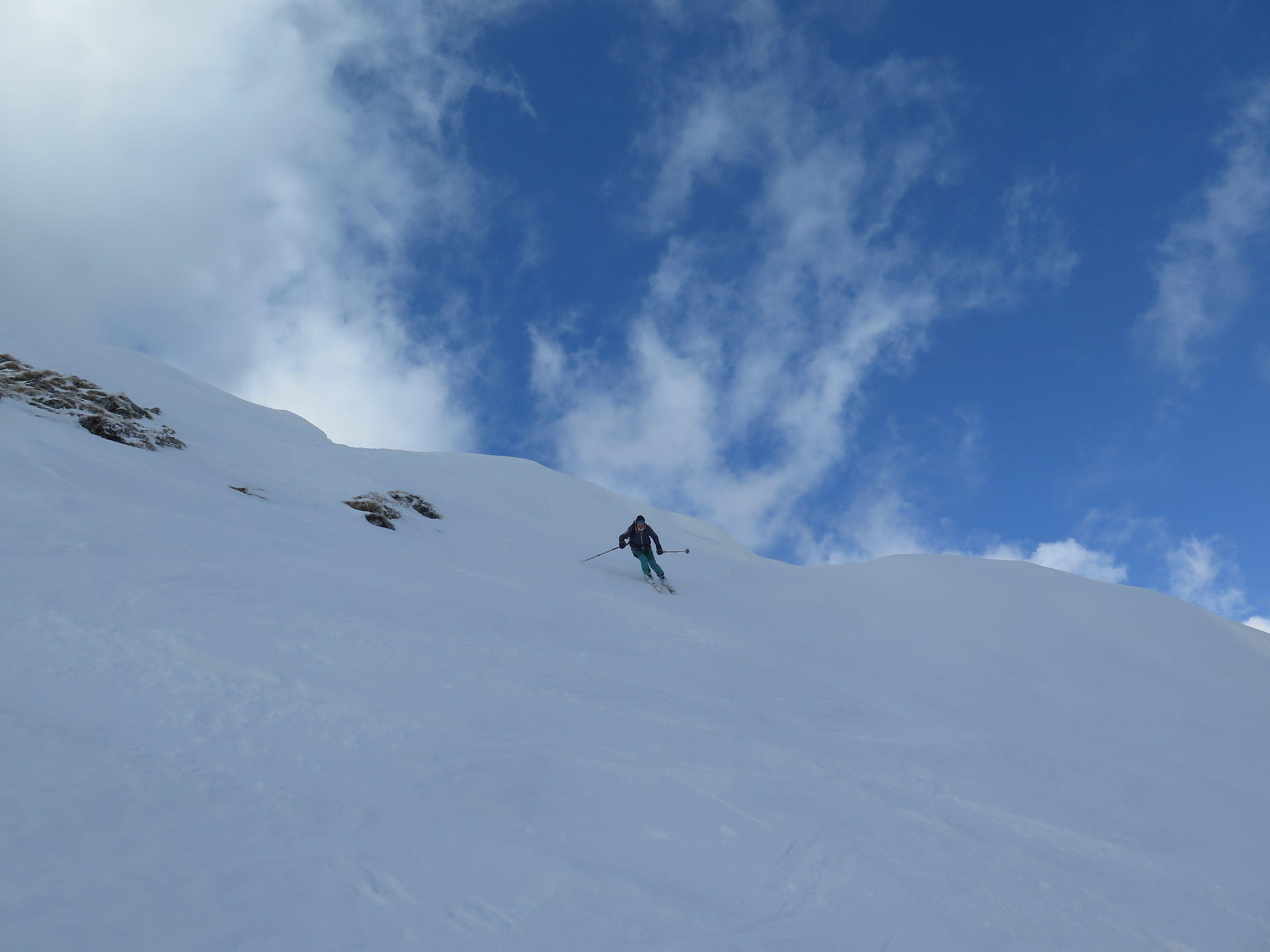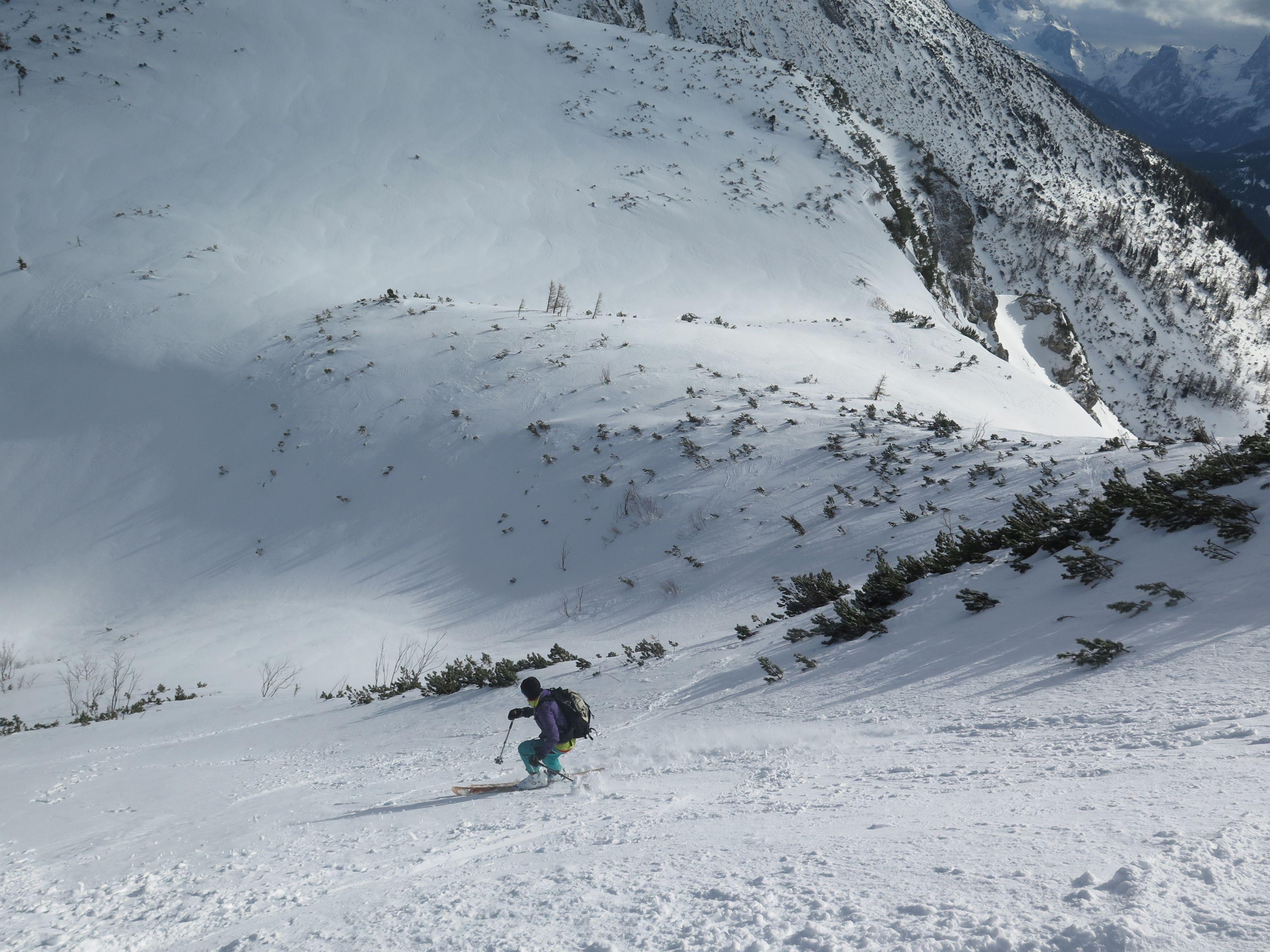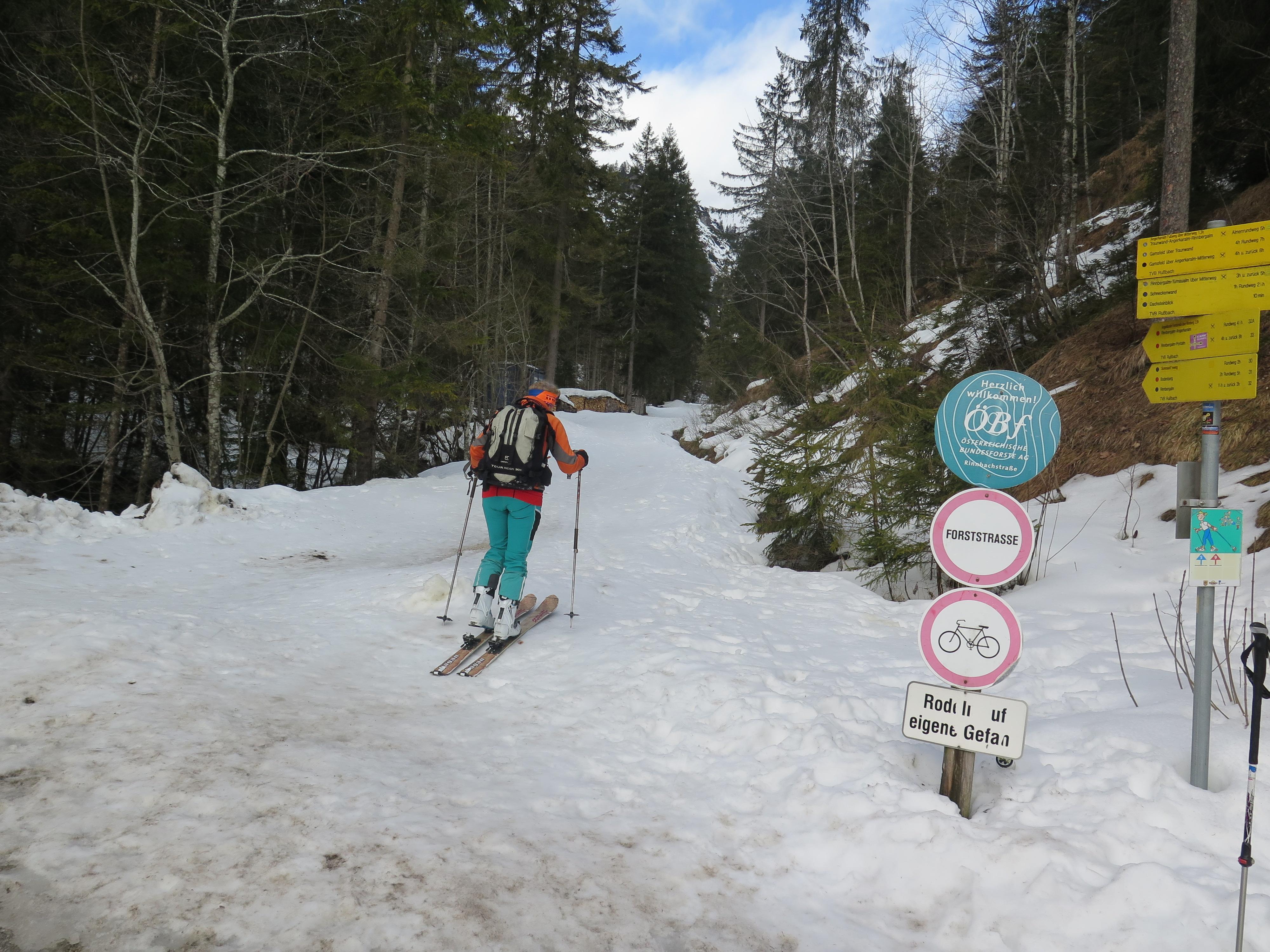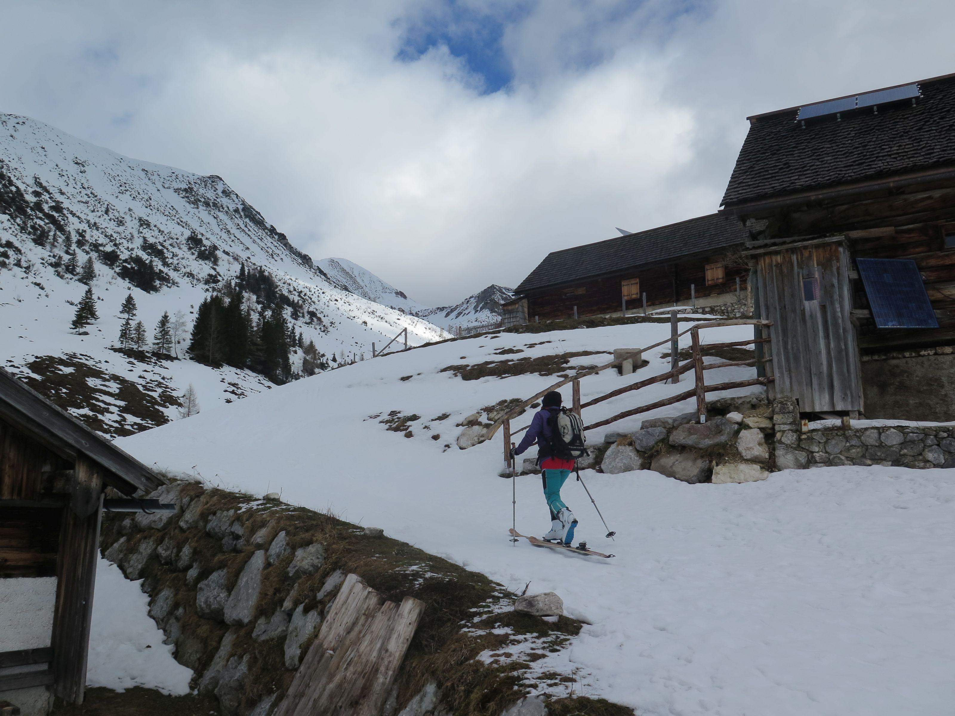 Abfahrt über den Osthang hart und griffig mit geringer Neuschneeauflage, im Mittelteil tragfähiger Harschdeckel, auf den Almböden zur Rinnbergalm schöner Bruchharsch