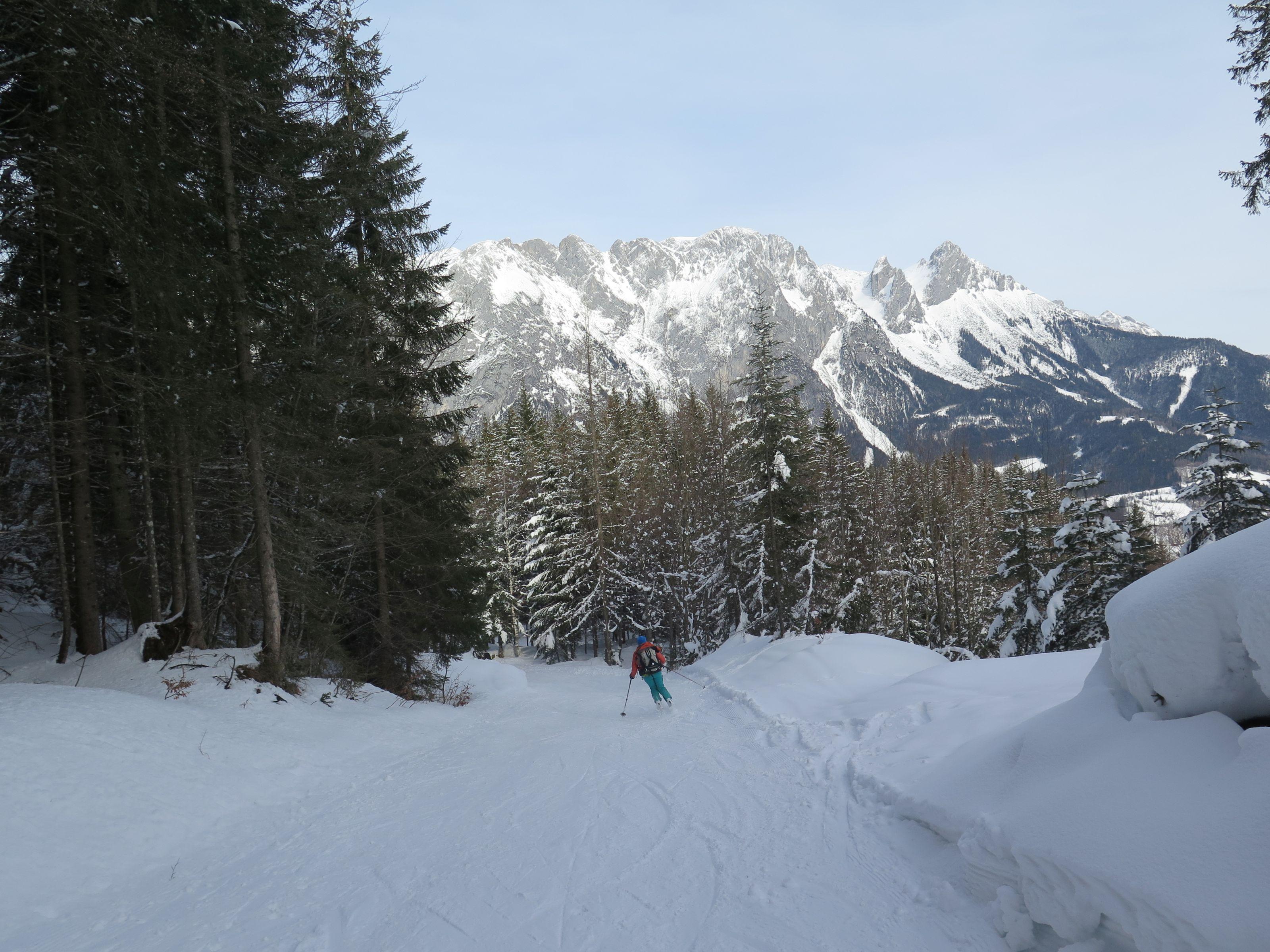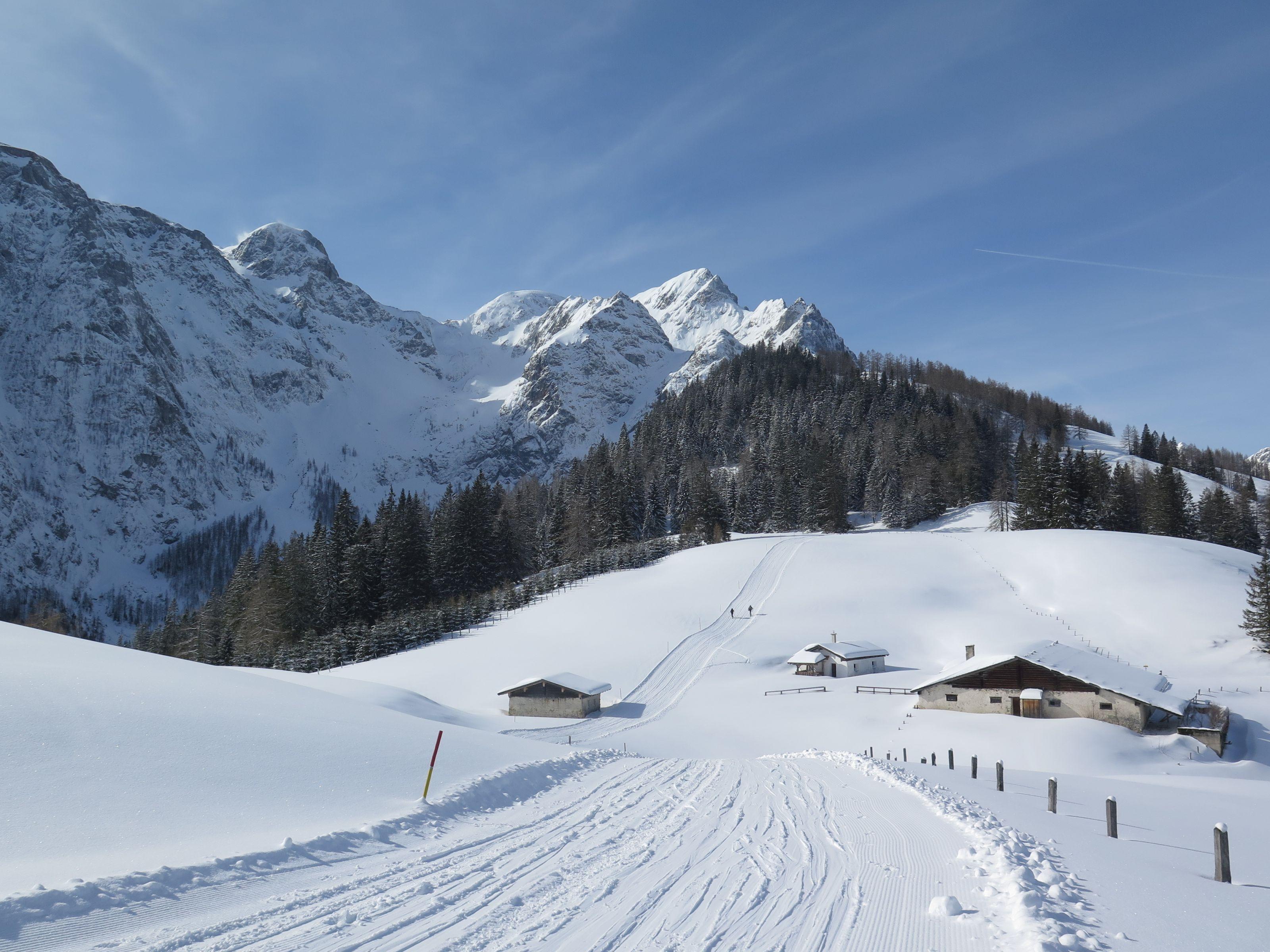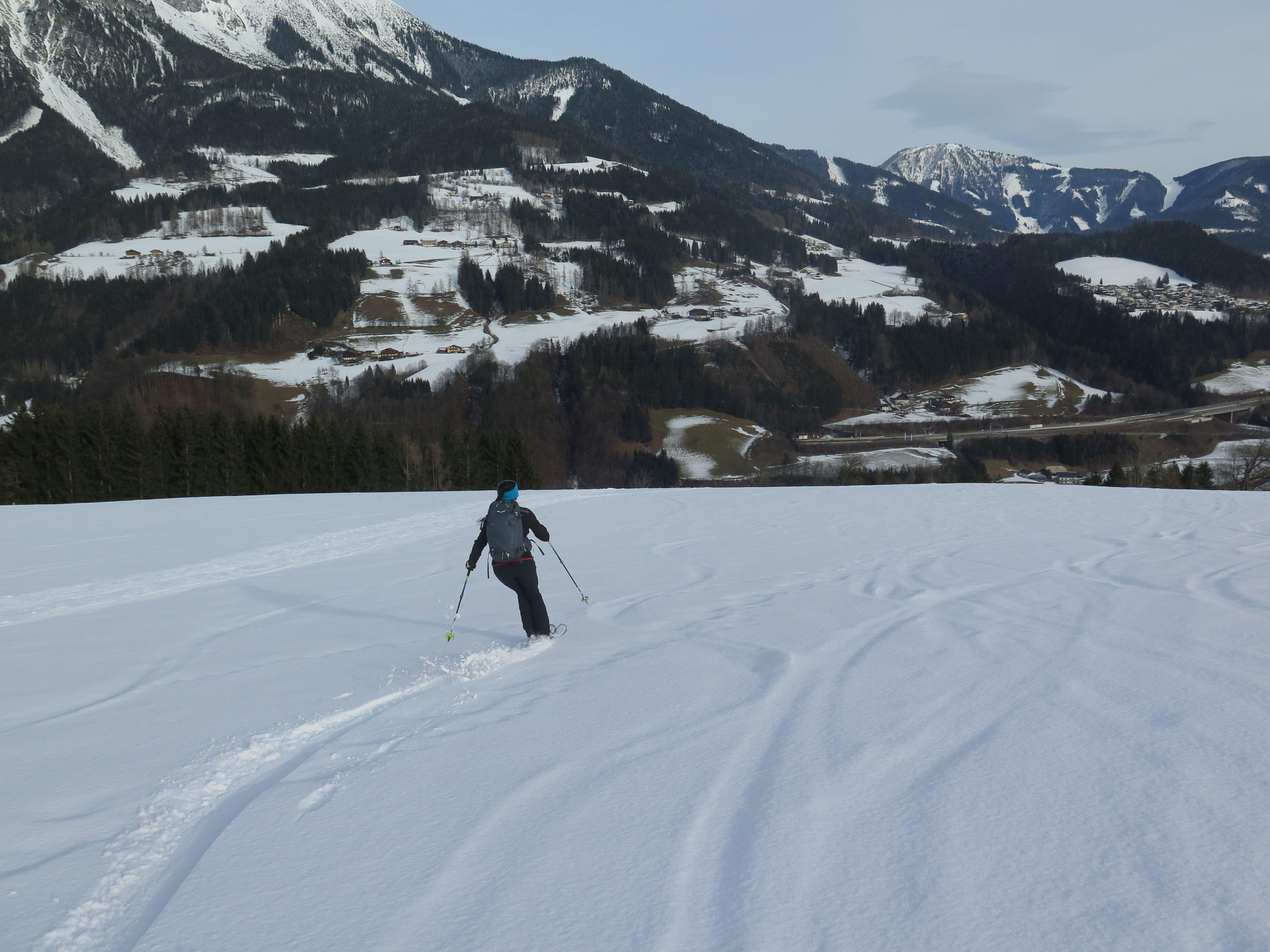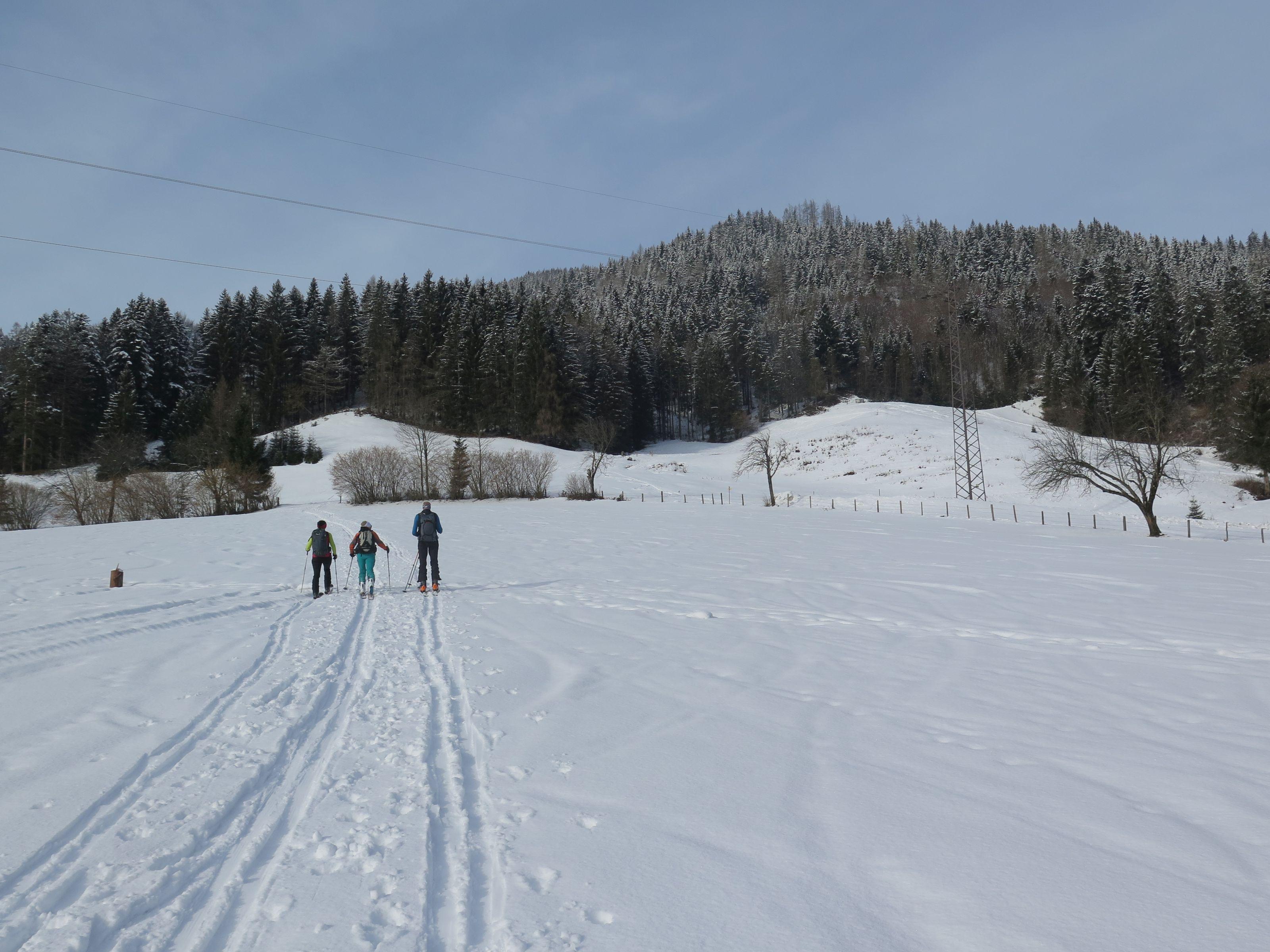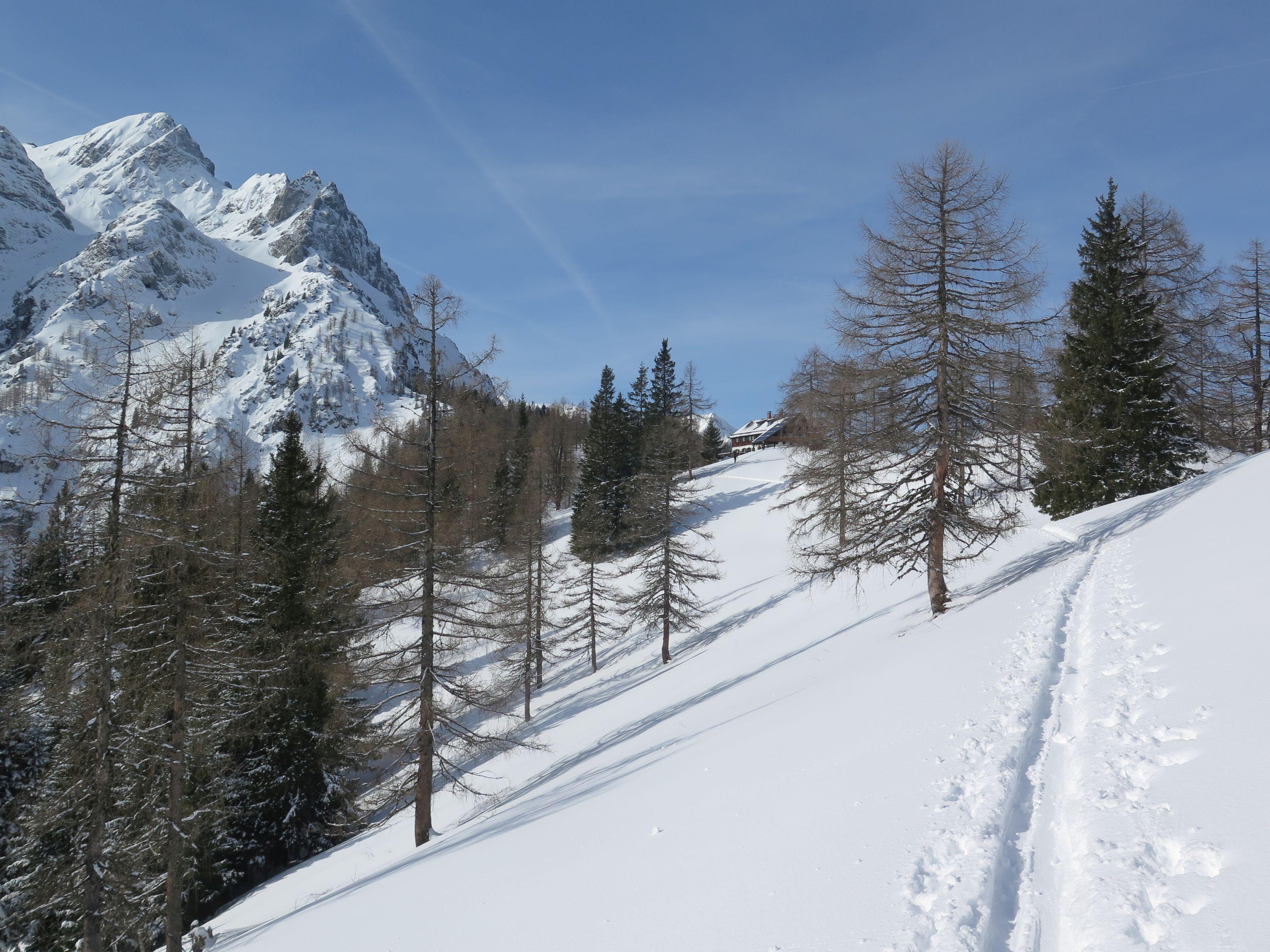 Heute gemütliche Familientour zu den Kochtöpfen der Ostpreußenhütte. Über die Obauerwiesen noch dünne Schneedecke, ab Gschwandanger gute Schneelage. Von der Dielalm bis zur Ostpreußenhütte gewalzen.