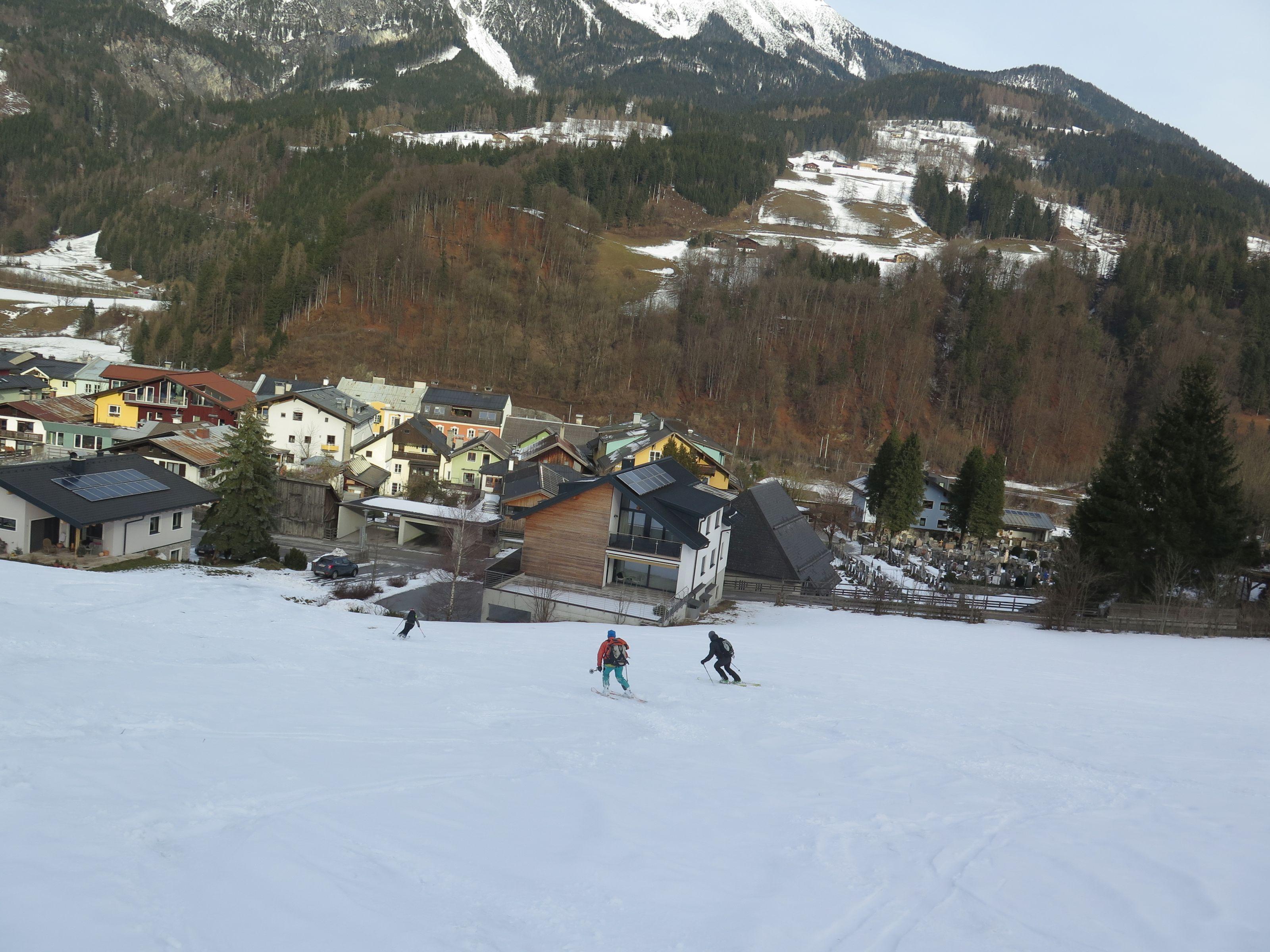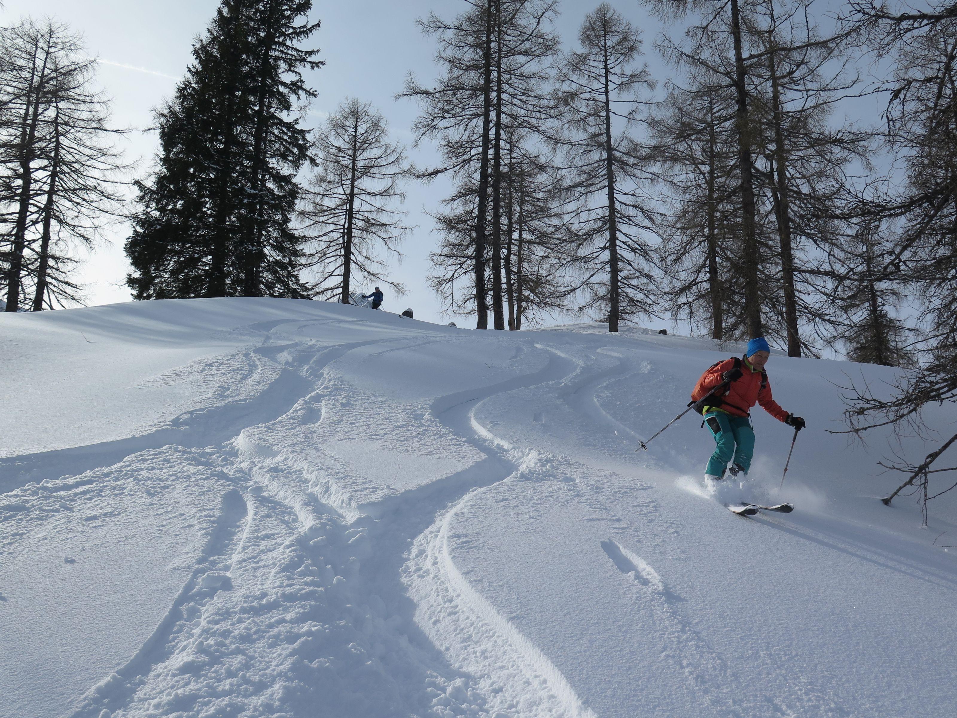 Wetter: Sonne, Schleierwolken, schwacher Wind, auf den höheren Gipfeln Schneefahnen sichtbar. Gute Abfahrtsverhältnisse.