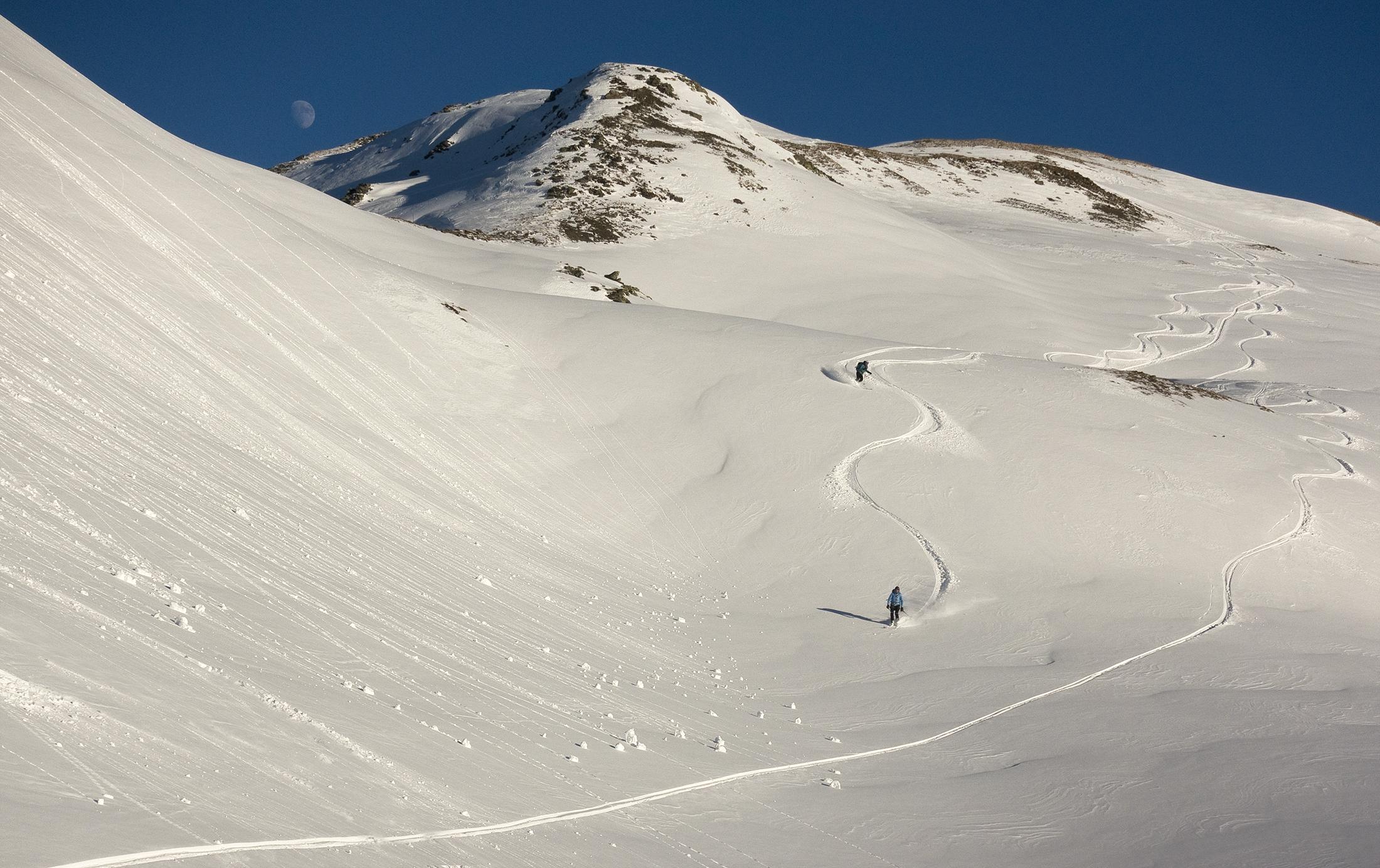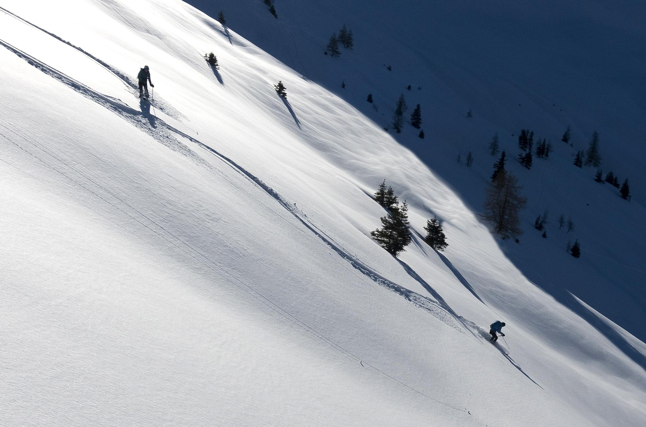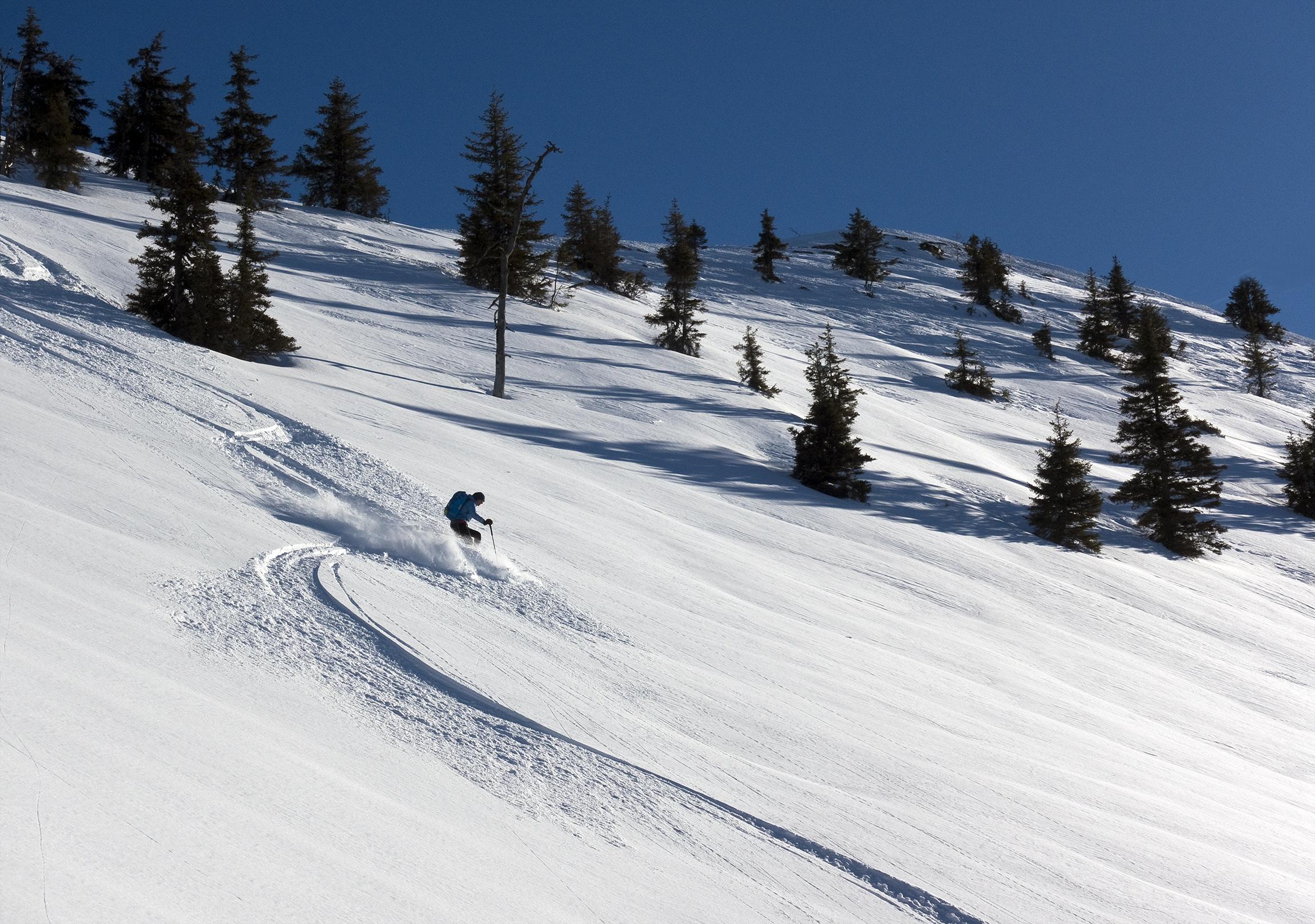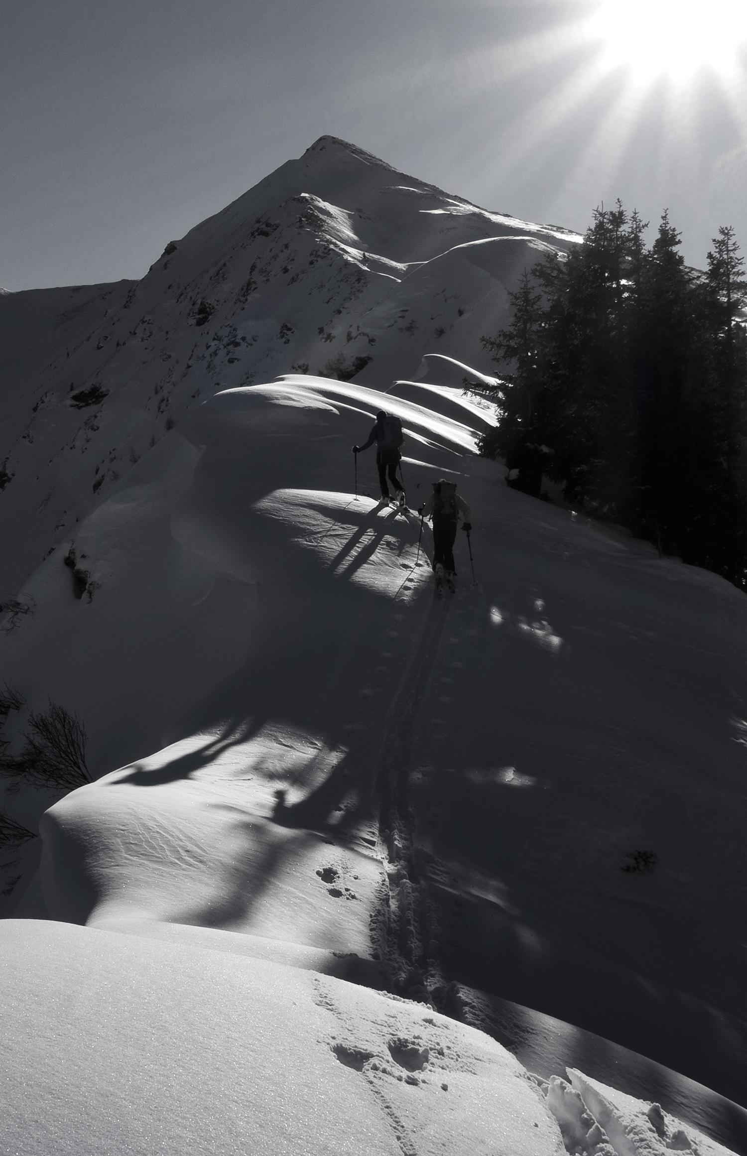 Wunderbarer Powder über dem Schwarzachgraben! Bis 1500m Höhe ist die Schneedecke ziemlich dünn mit wenig Grundlage, darüber liegen die herrlichen 20cm Pulverschnee auf tragender griffiger Altschneeschicht. Erst ganz oben auf Gipfeln und Graten ist der Schnee vom Sturm abgeweht, er hat den eisharten Altschnee und Felsen freigelegt. Sonst ist der Pulver locker und leicht, rein schattseitig trägt er schon eine Reifschicht. Südseitig war er aufgeweicht und wird morgen sicher einen Deckel haben.