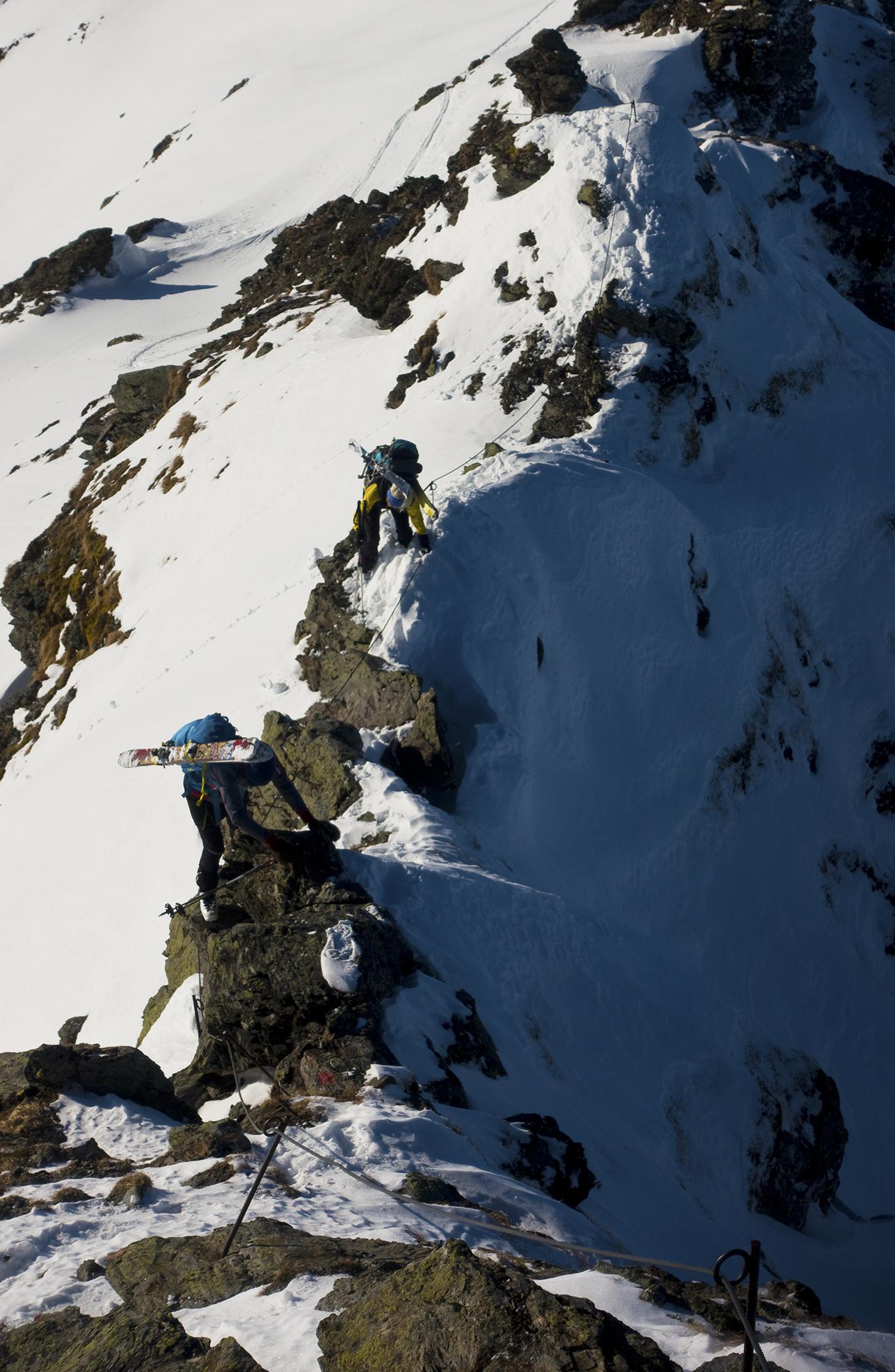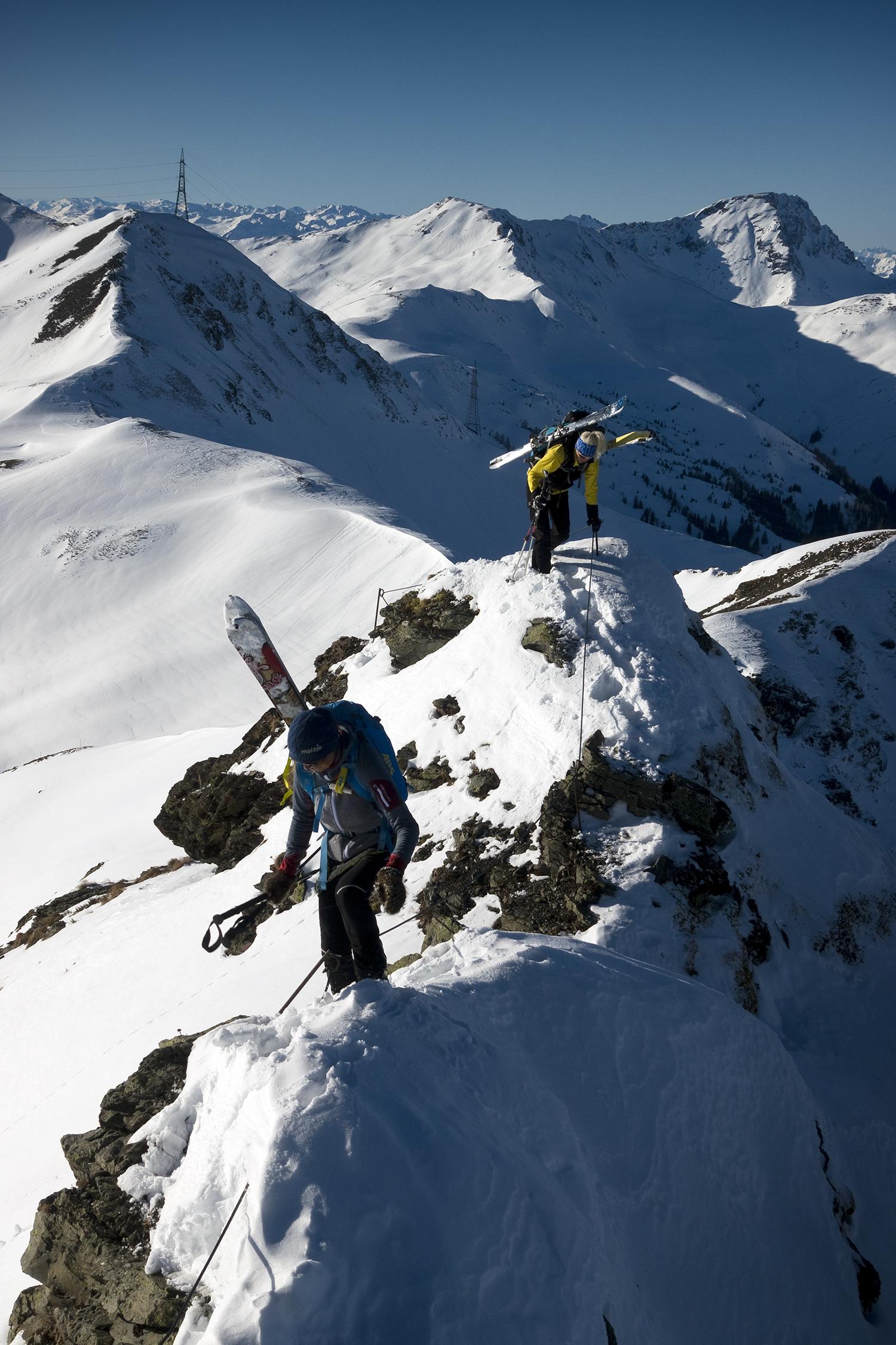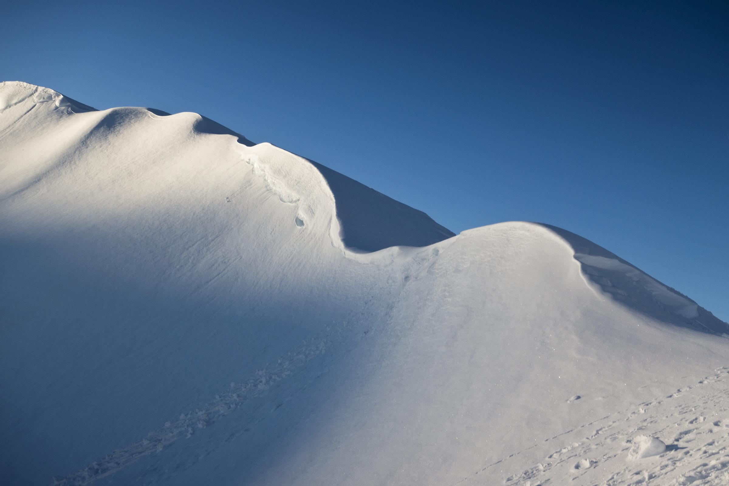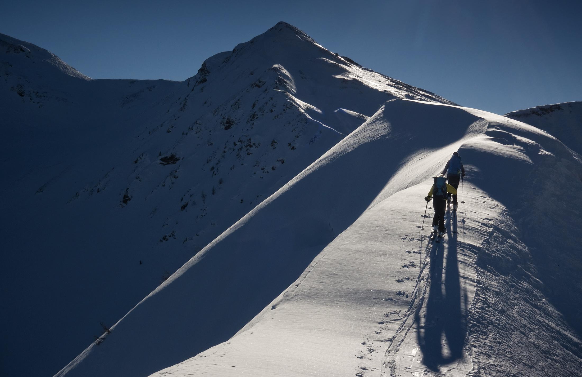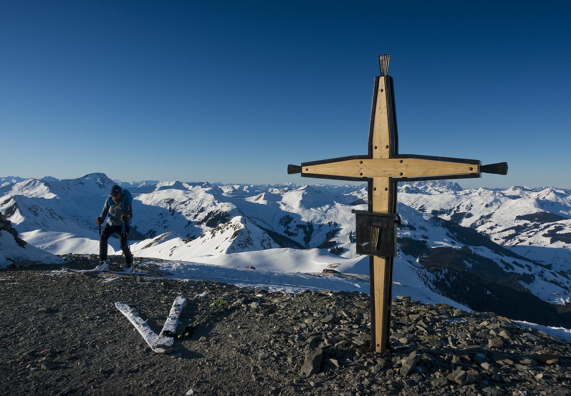 Wir konnten der Versuchung nicht widerstehen und sind schon vom Grat unter dem Medalkogel im fluffigen Pulver hinunter ins Medalkar gefahren, dann zur Scharte aufgestiegen, und über den Kamm zum Hochsaalbachkogel hinauf. Die Felsen sind freigelegt, die Ski mussten an den Rucksack. Vom Hochsaalbachkogel ging es direkt nach Süden hinunter im feuchten Pulver, heute war der noch sehr gut zu fahren. Wiederauffellen und ab zum Hochkogel! Hier oben ließ der Wind das Gipfelkreuz singen. Auch die südwestlich exponierte Abfahrt vom Hochkogel hatte feinen Pulver zu bieten. Nochmal wurde aufgefellt für die Medalscharte, und von dort schwebten wir die schattigen Hänge hinab in den Schwarzachgraben.