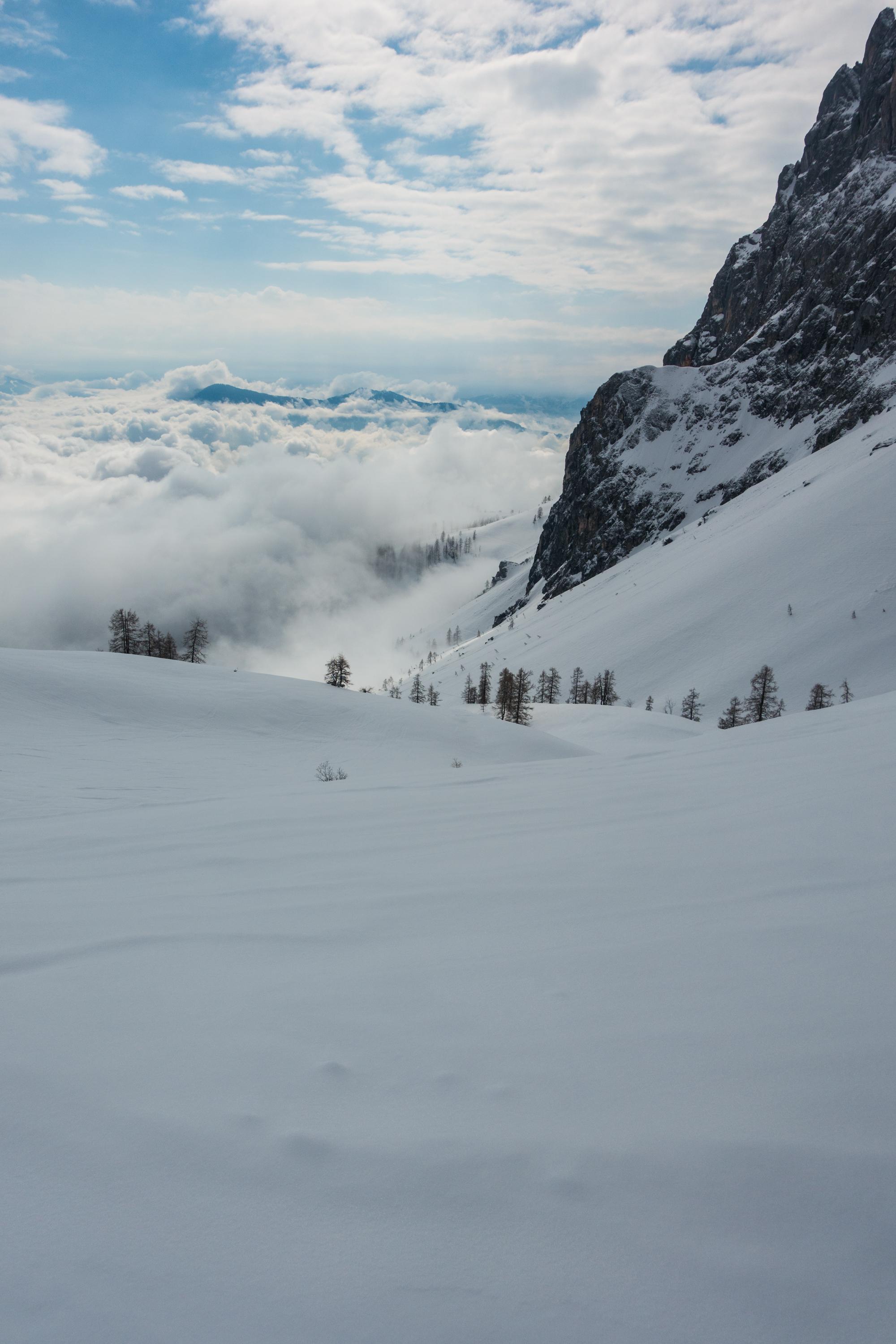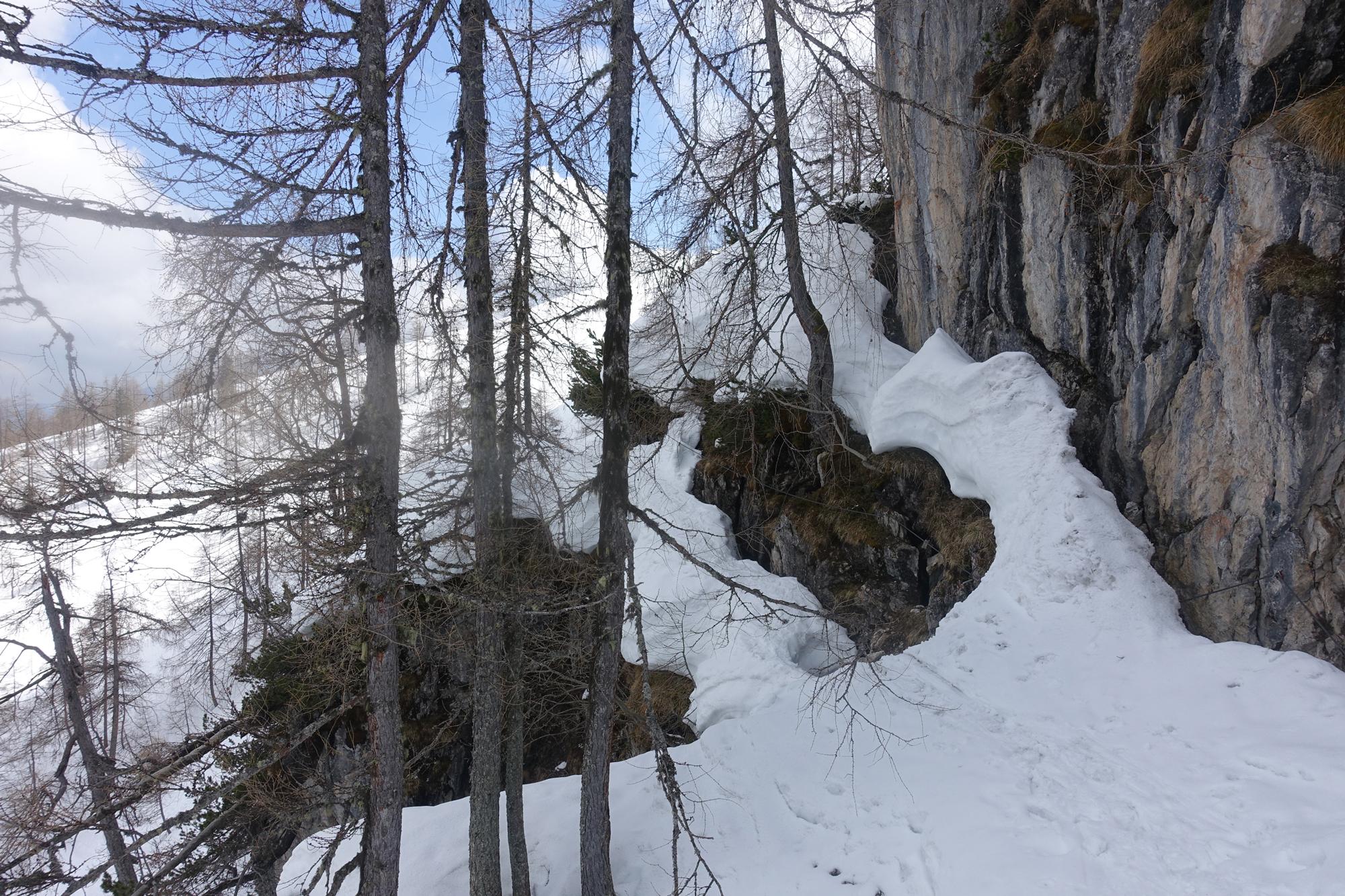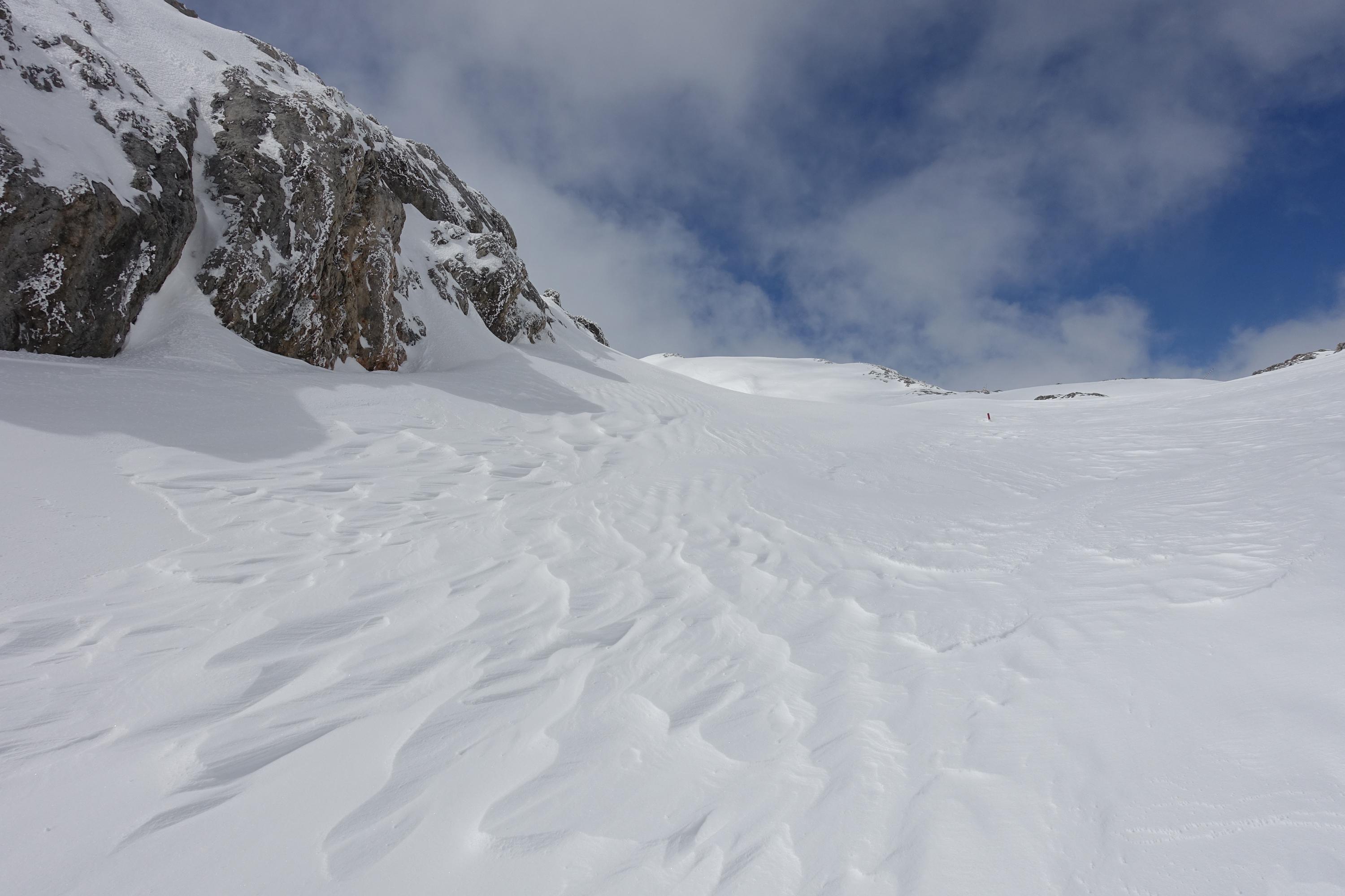 Großer Bratschenkopf vom Arturhaus am Montag. 5-10cm Neuschnee in der Nacht von Sonntag auf Montag. Von Beginn an beim Arturhaus können bereits die Ski angeschnallt werden. Über den Forstweg zur Mitterfeldalm. In der folgenden Querung sind bereits einige kleine abgegangene Lawinen zu bewältigen. Die "Schlüsselstelle" eventuell tiefer umgehen, die Schneebrücke wirkt schon instabil. Nach aufziehenden Nebel im Ochsenkar Orientierung schwierig, die Steilstufe darin mit Harscheisen besser als ohne. Wegen anhaltenden Nebels am Wanderweg gehalten und an einigen Stellen abgeschnallt. In der Aufstiegsrinne zum Bratschenkopf leider viele scharfe Steine unter der Auflage. Abfahrt ein Traum, ab 2000M Höhe wirds dann sulzig.