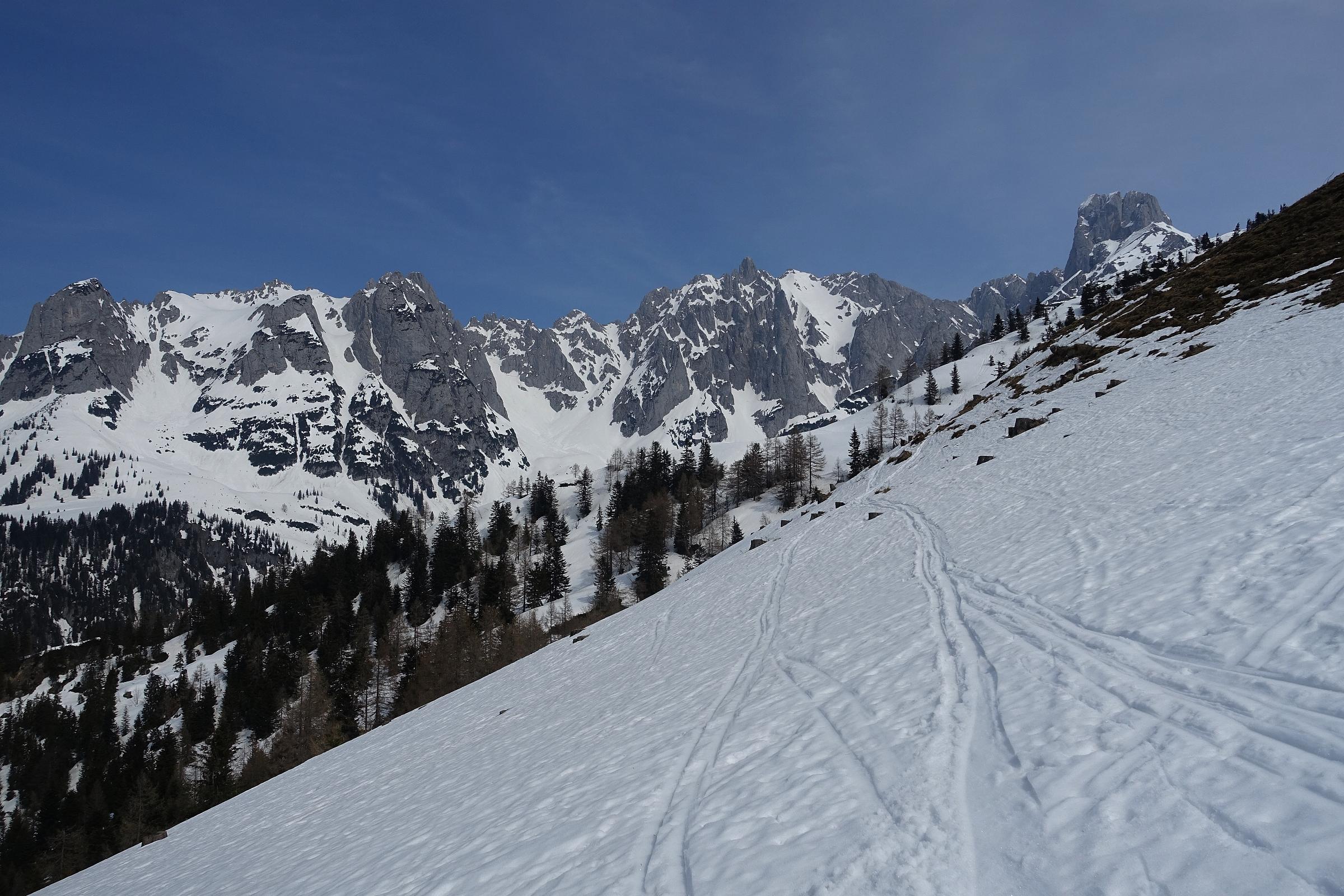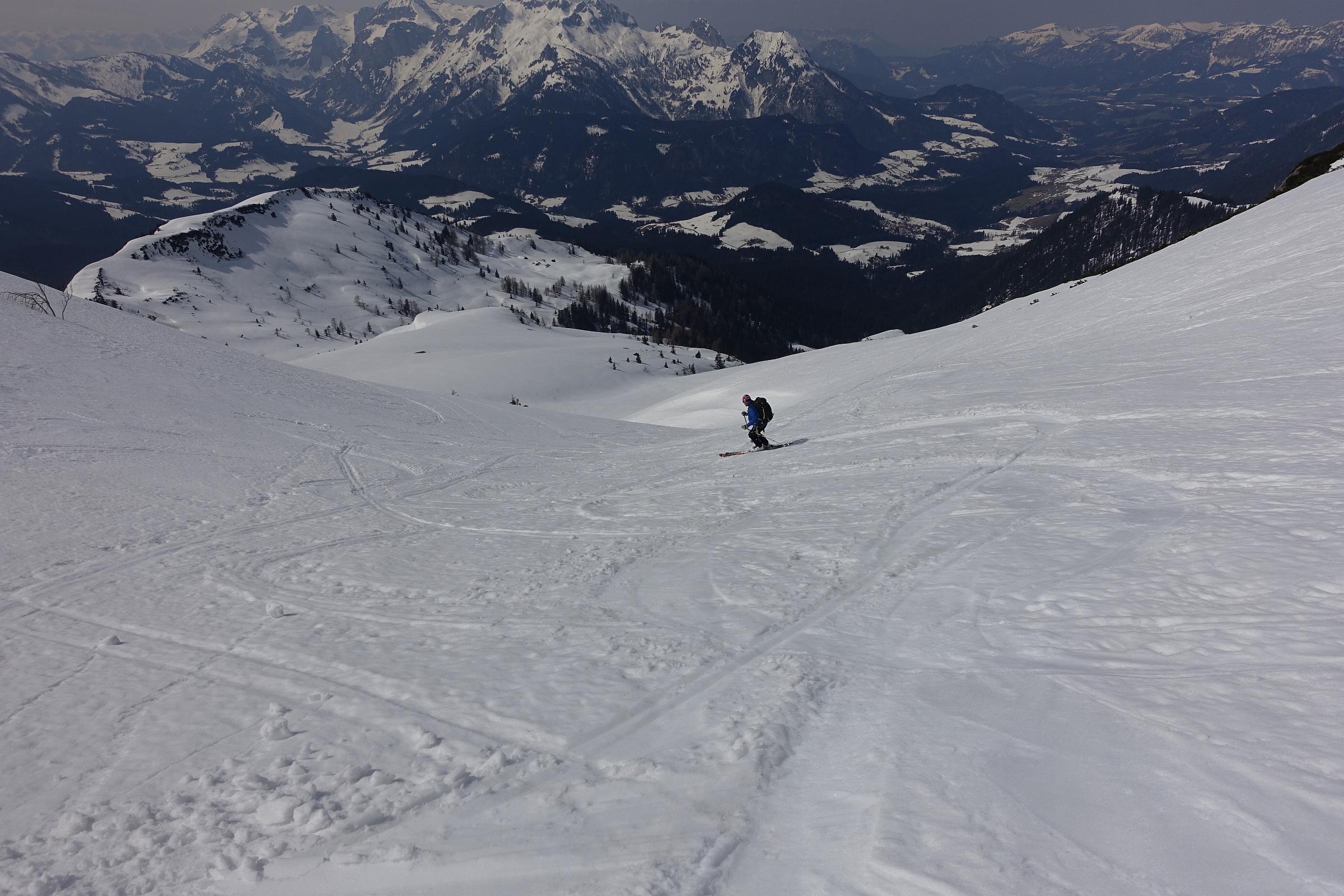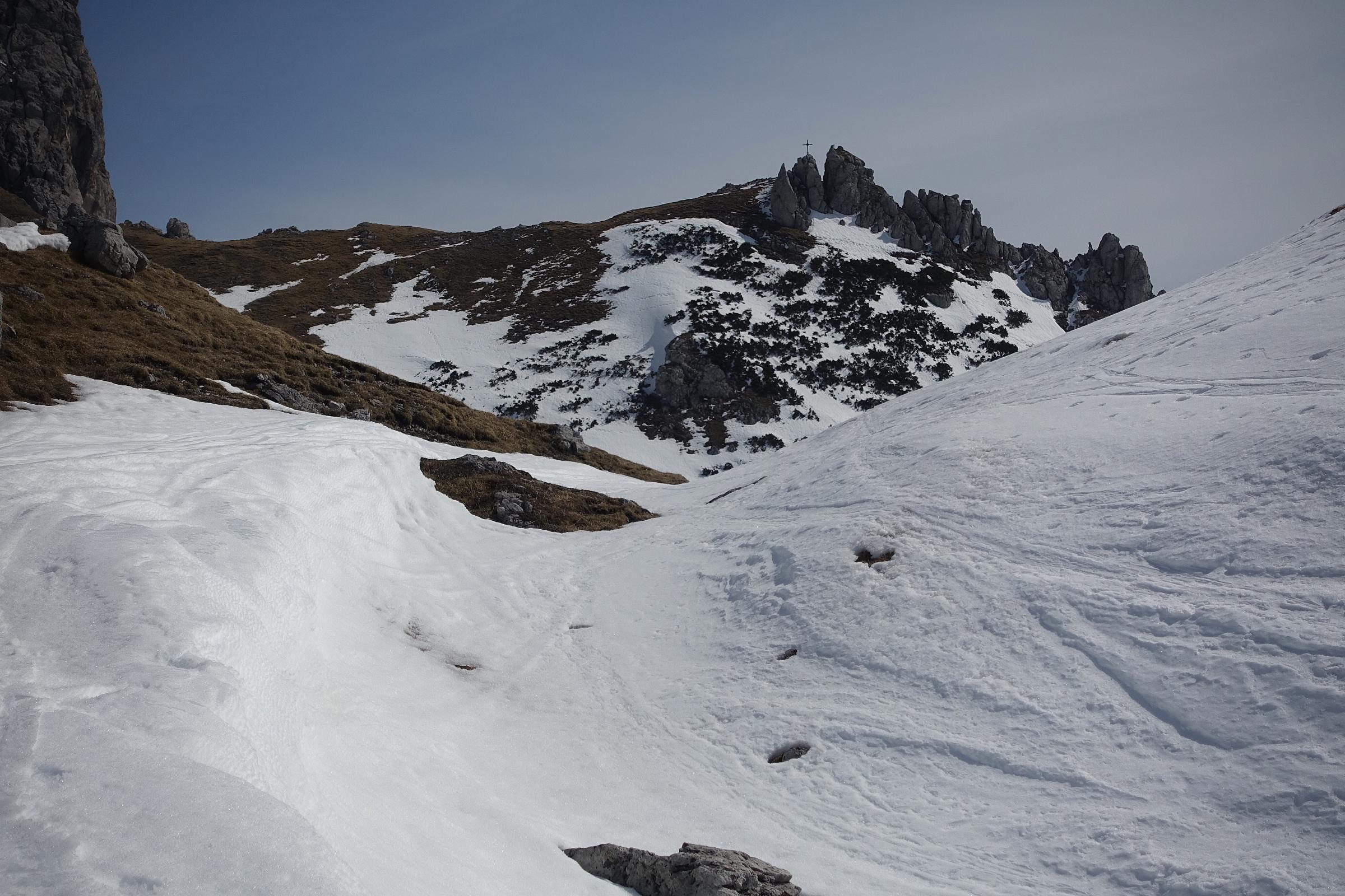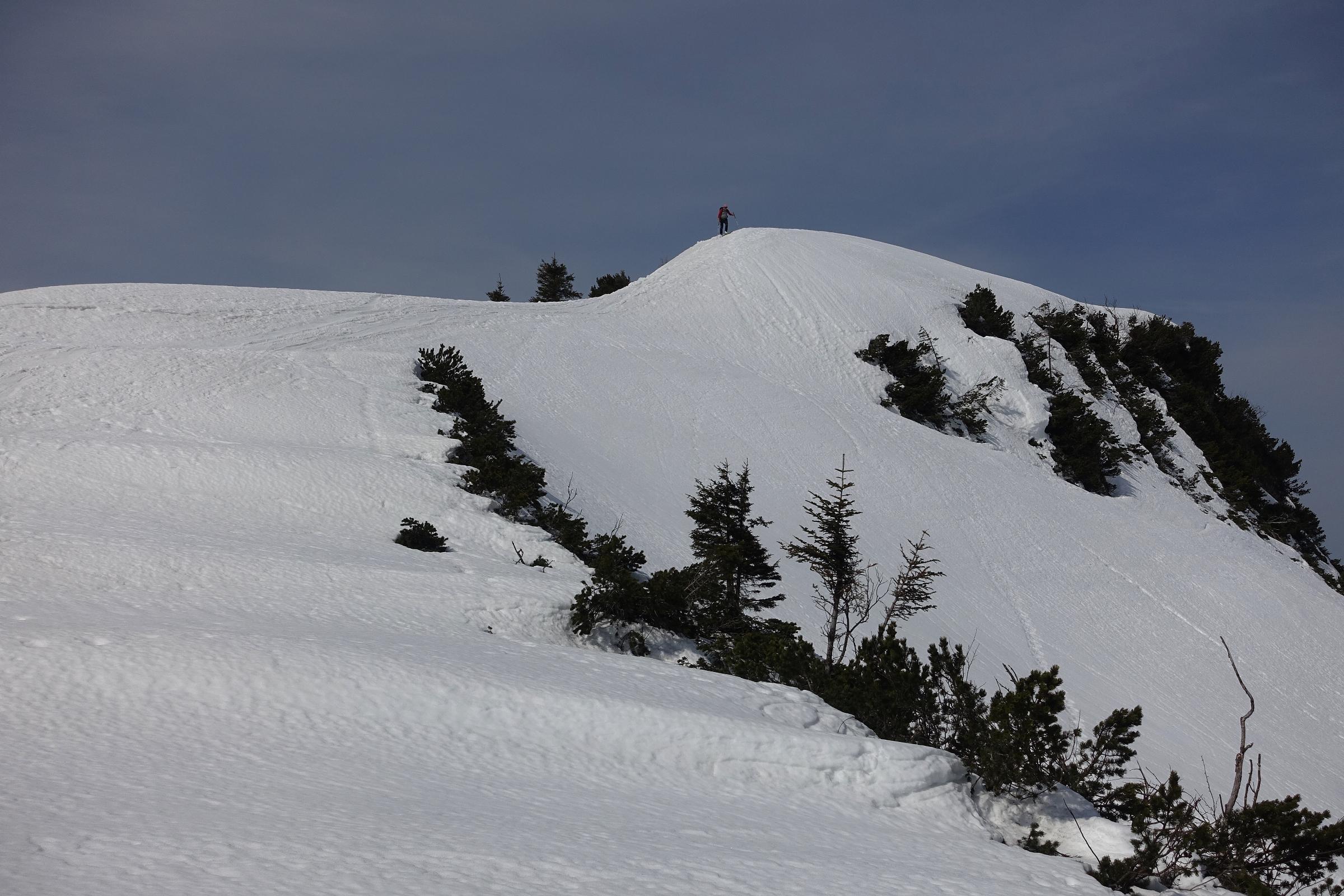 Heute nochmals auf Firnsuche, durch die Schleierbewölkung vermutlich schwächere Abkühlung als gestern am Hohen Zinken - daher heute teilweise schon etwas tieferer Firn, aber alles noch im grünen Bereich. Anstieg über Mauerreith, Mahdalm, Mähder Riedel und durch das Kar der Eisgrube zur Kamplbrunnspitze.