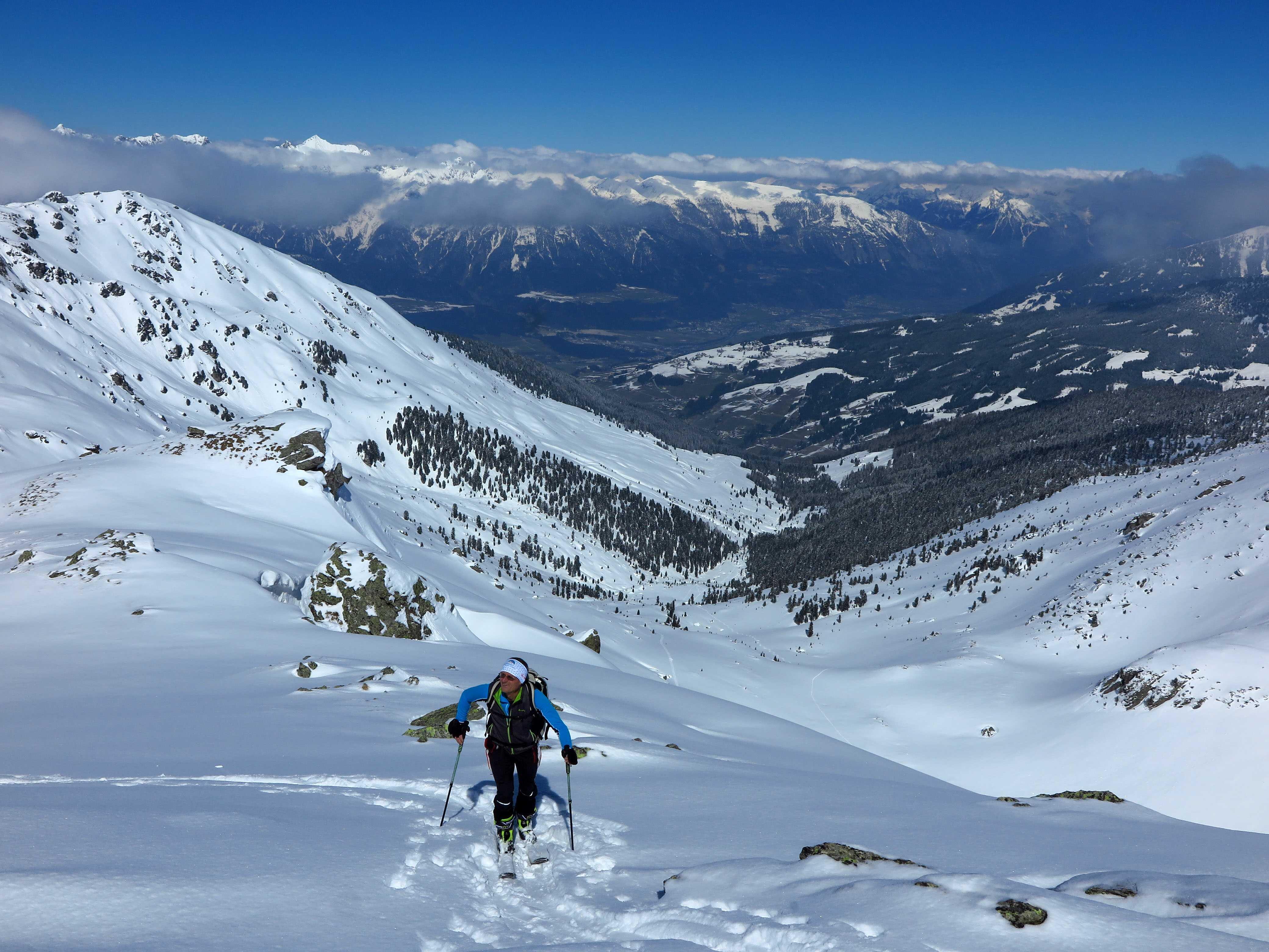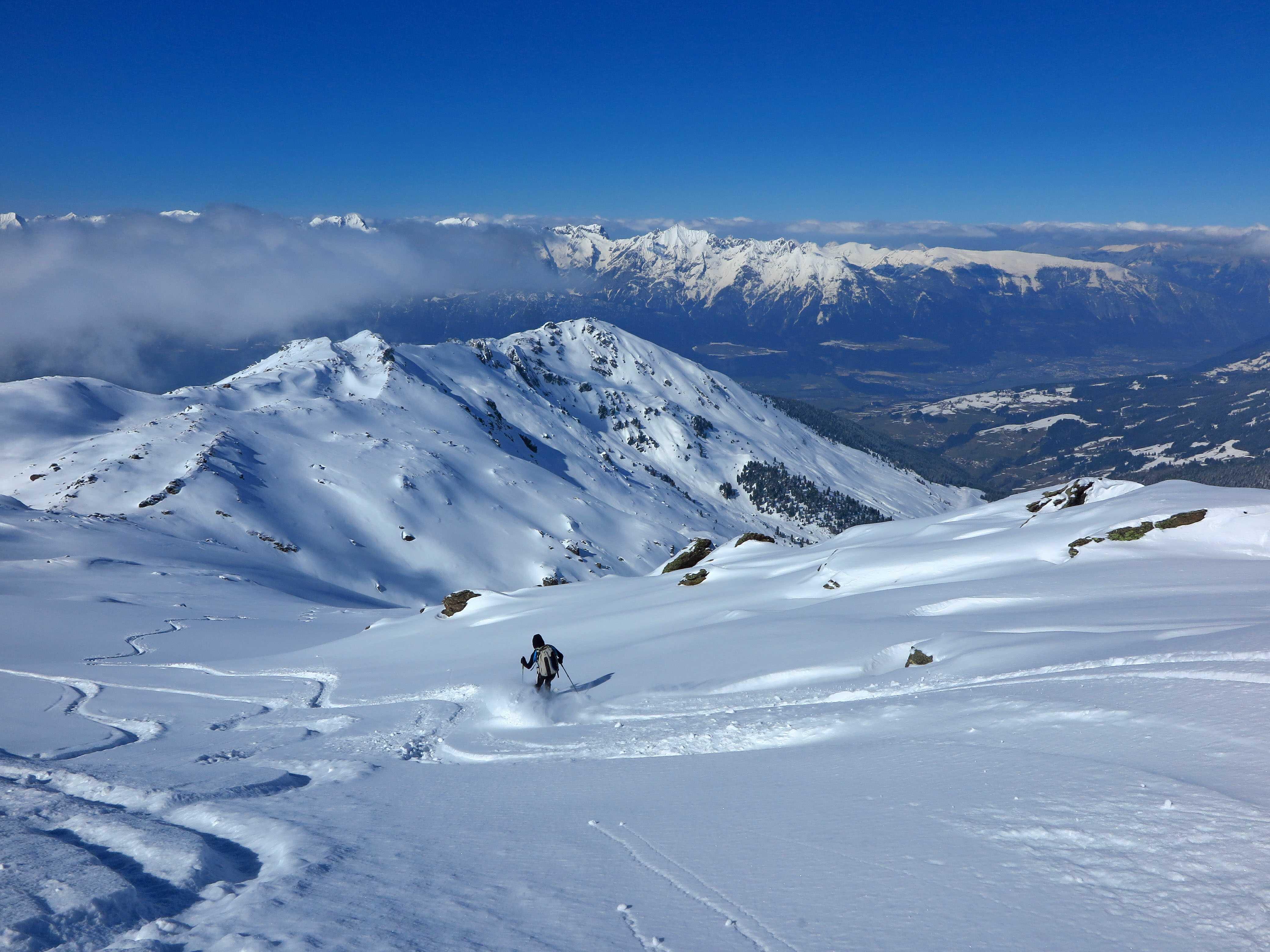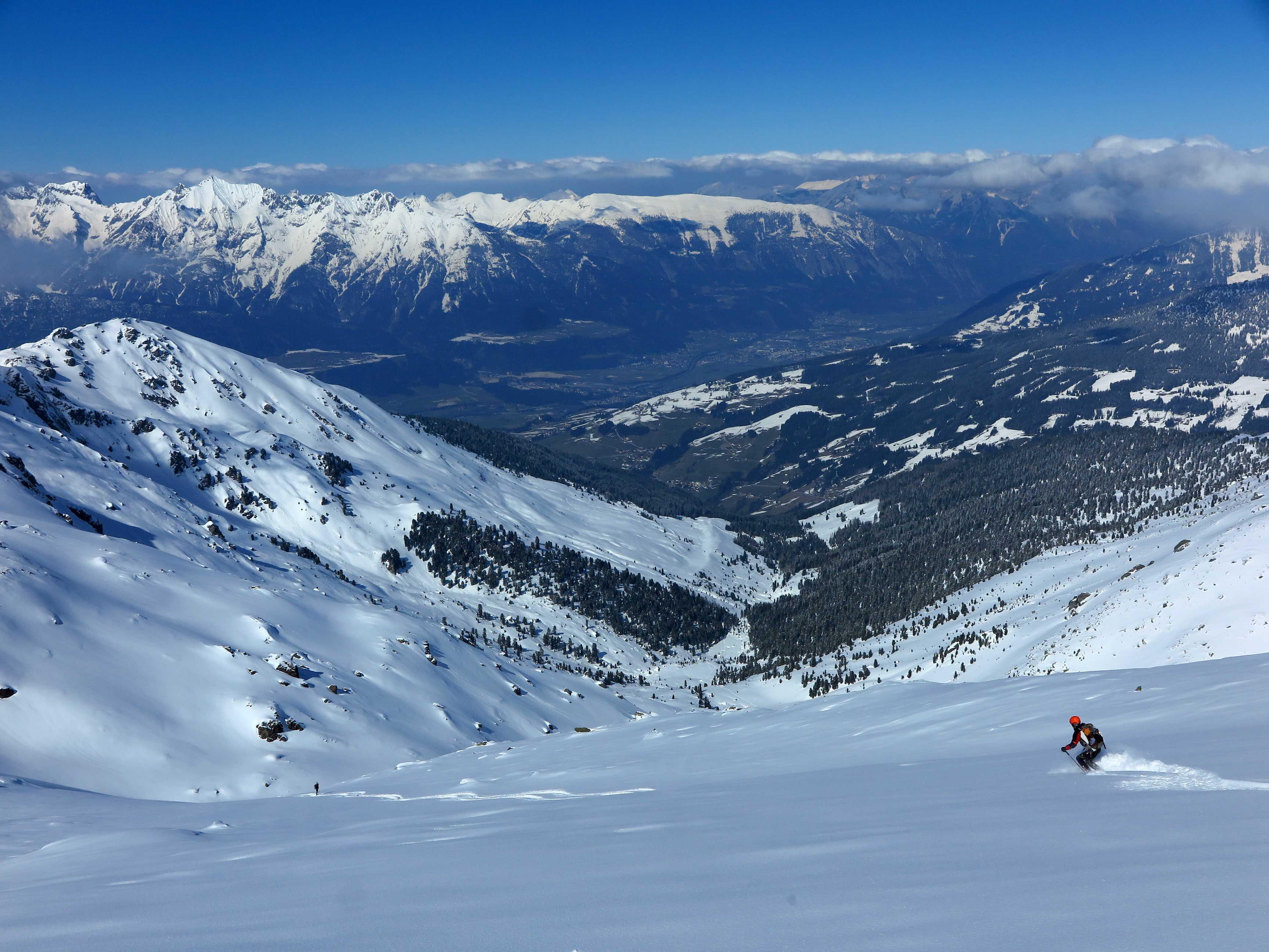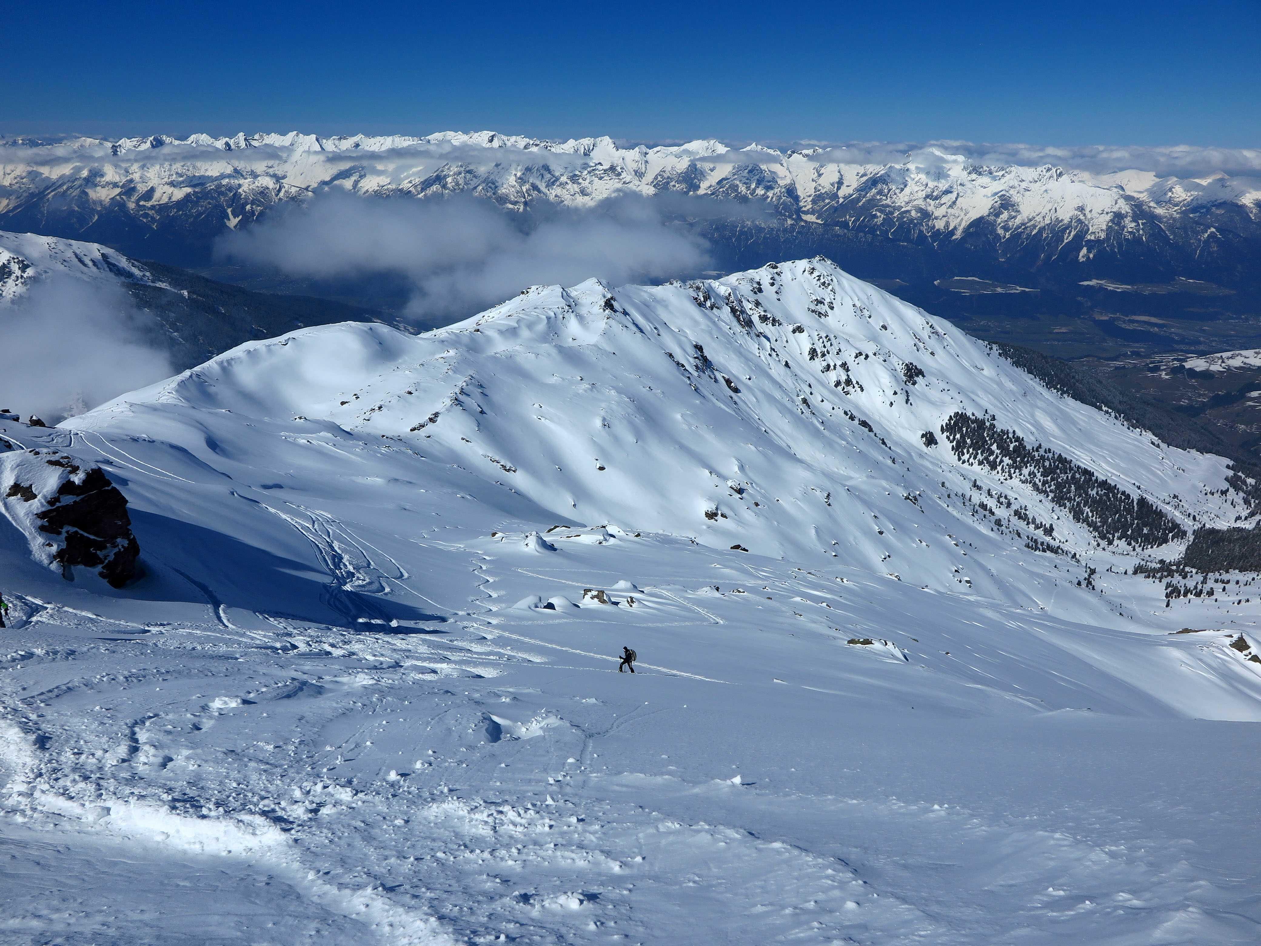 Von Kolsassberg/Fanghaus (1040) über die Studlalm (1600) und durchs Hirzerkar zum Hirzer (2725). Eine relativ lange, aber lohnende Pulvertour.