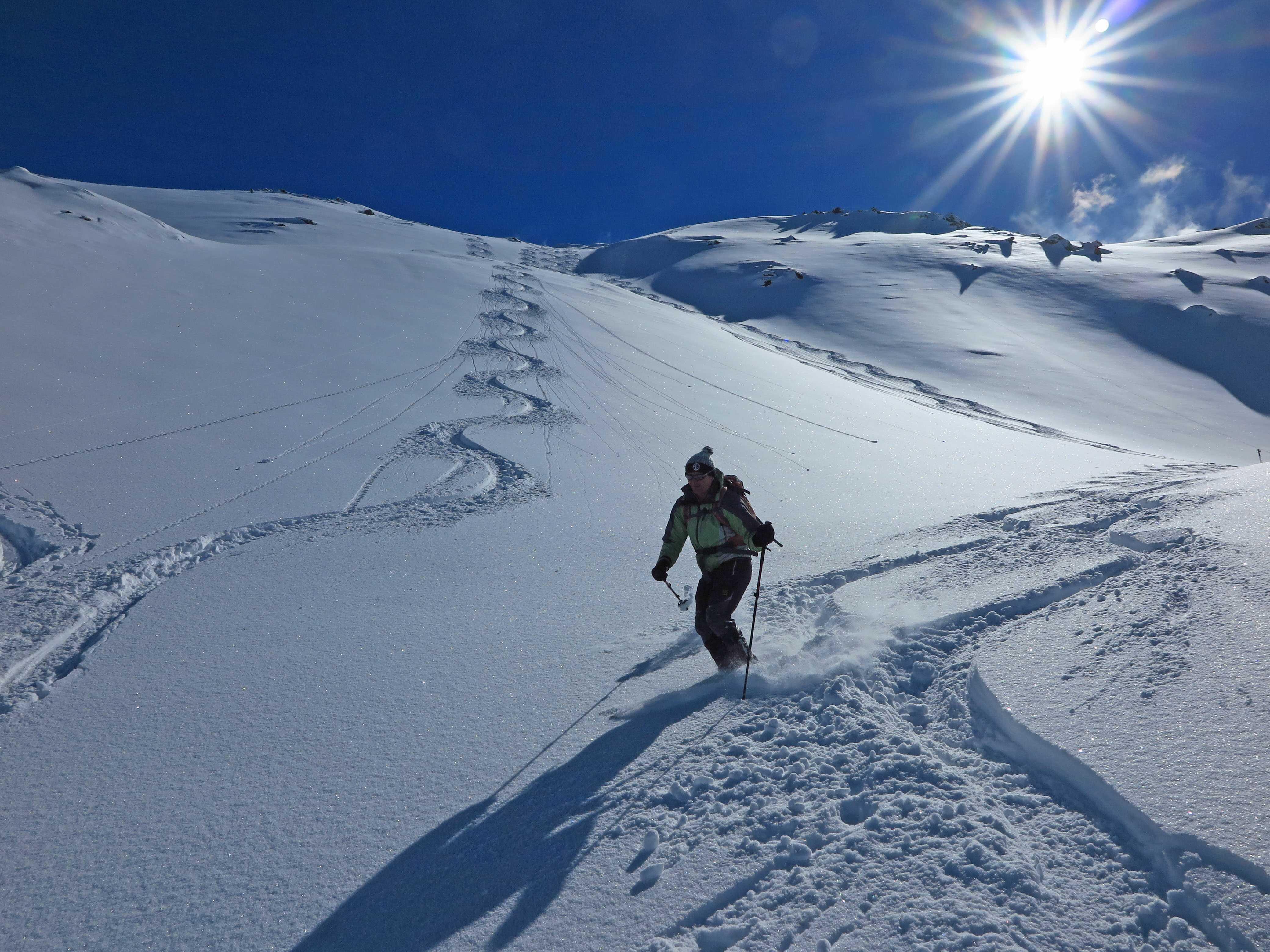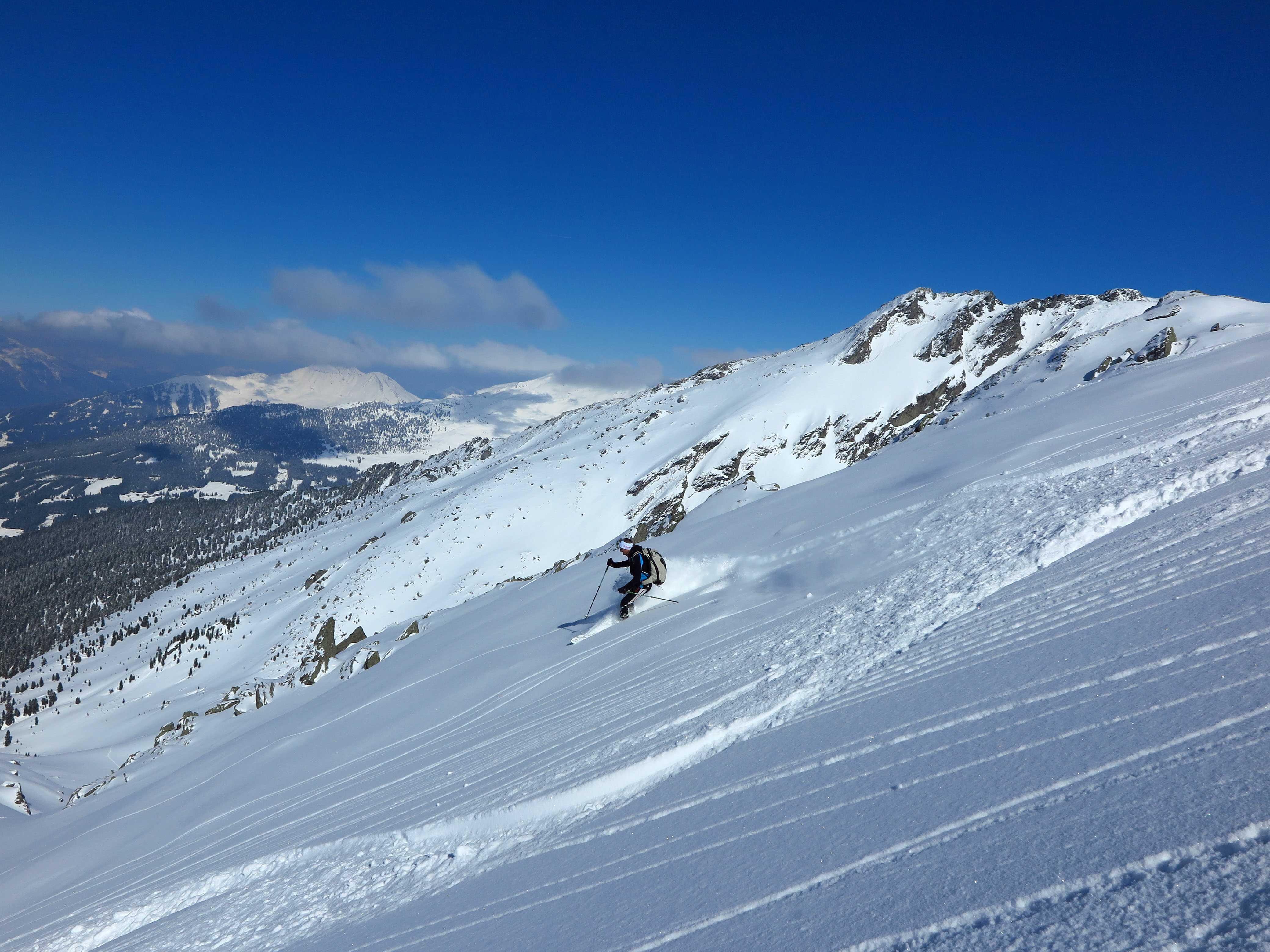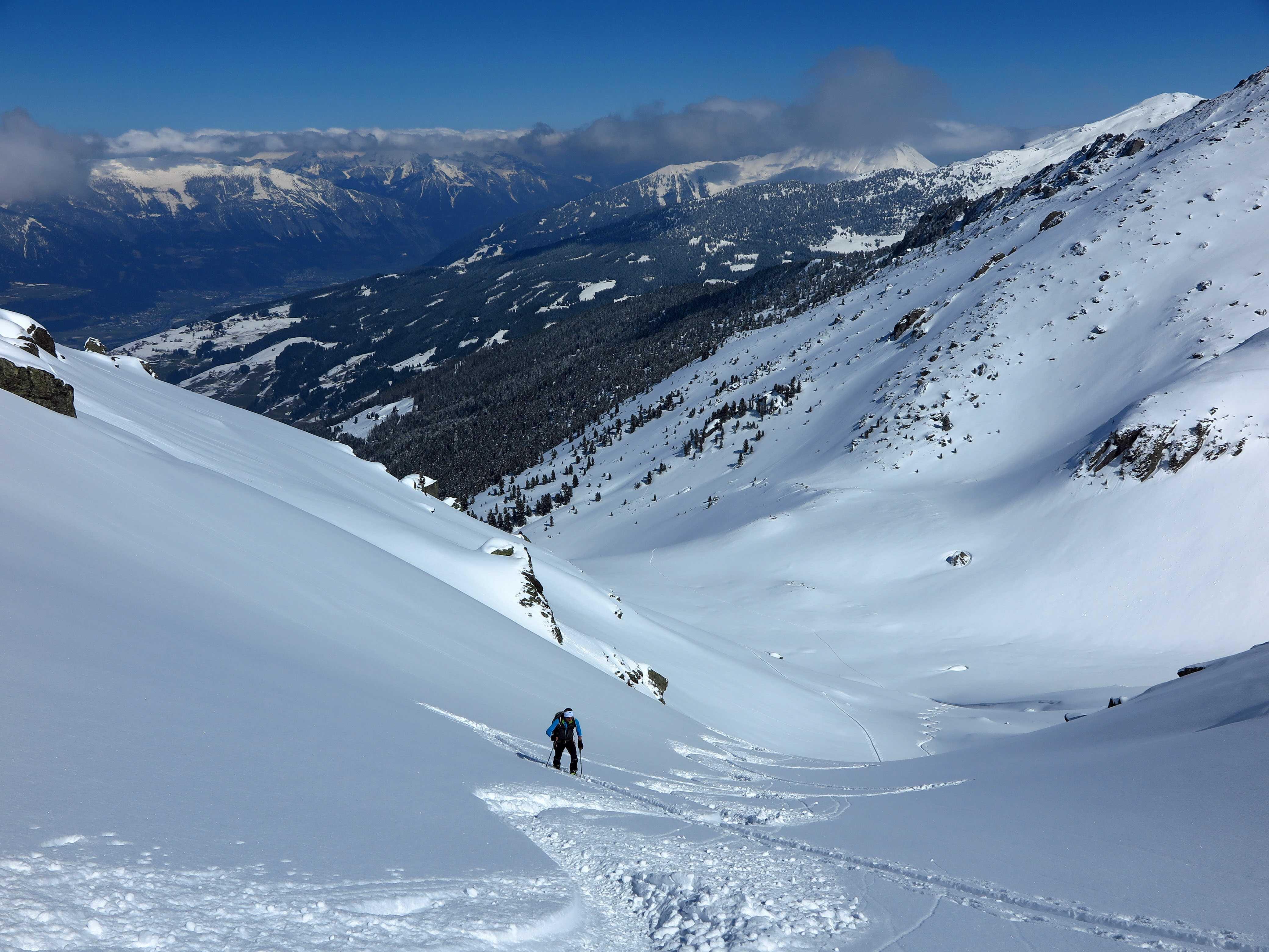 Von Kolsassberg/Fanghaus (1040) über die Studlalm (1600) und durchs Hirzerkar zum Hirzer (2725). Eine relativ lange, aber lohnende Pulvertour.