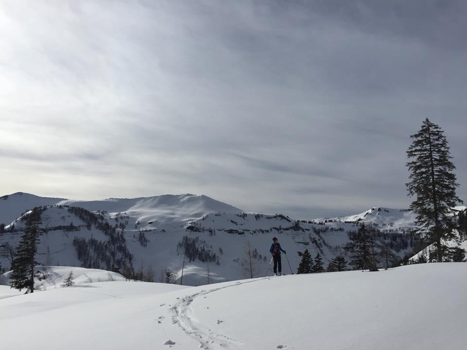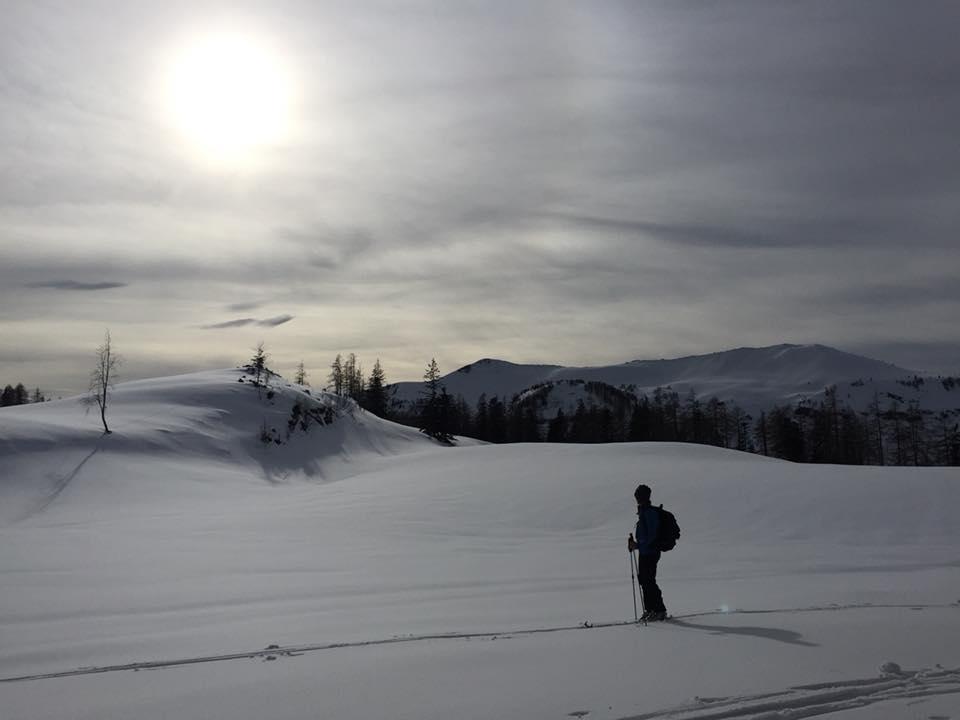 Verhältnisse: 10-15 cm Pulverschnee der je nach Exposition angefeuchtet ist. Nordseitig oben noch guter Pulverschnee. Schneefallgrenze am Sa etwa 1200 m. Bis auf die unteren Bereiche des Egelseerhöndls eigentlich sehr gut fahrbar.