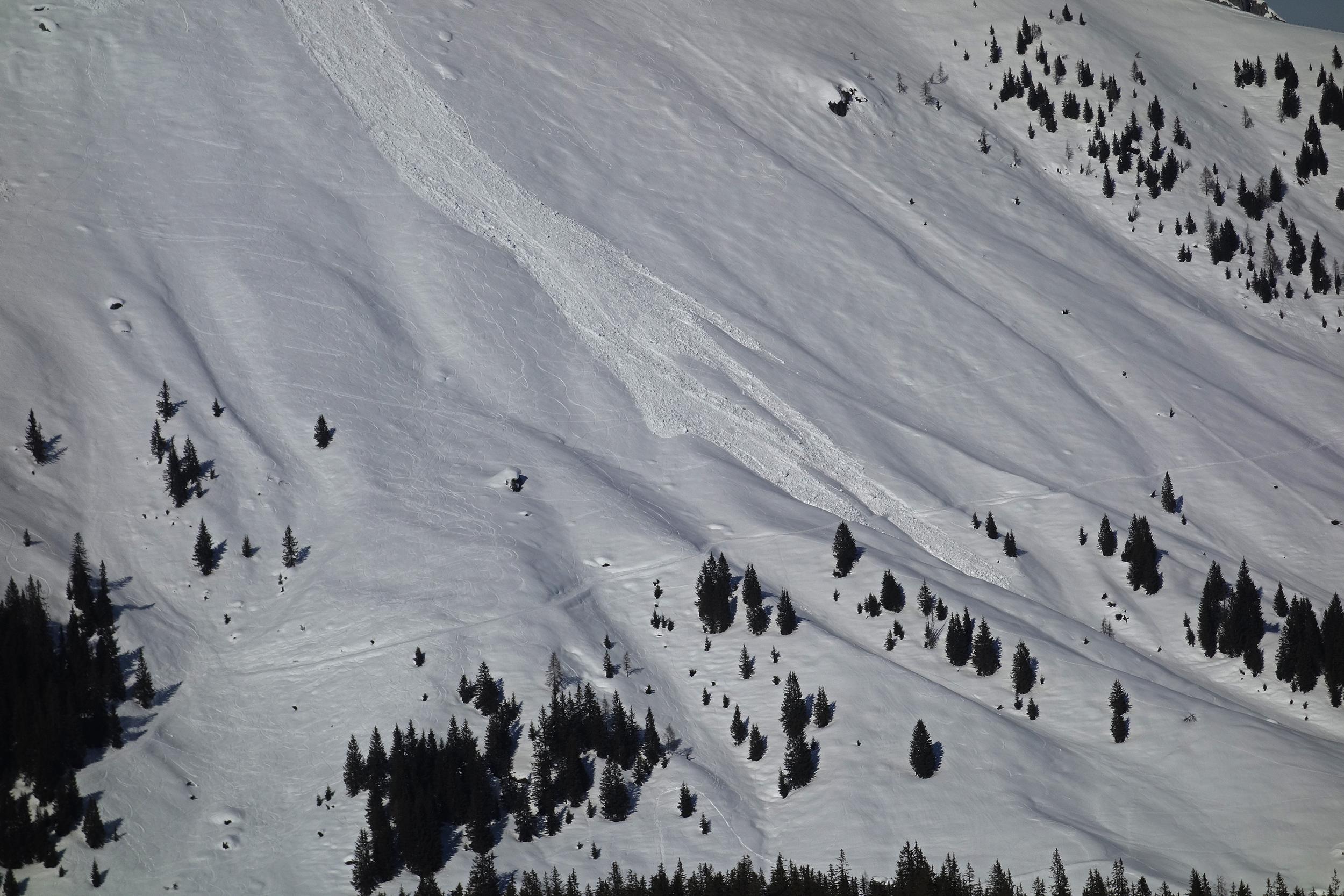 Lawinenabgang Mandlwand Süd, ca. 11.00 Uhr. Verlauf von Seehöhe 2100 m bis etwa 1550 m, knapp über Wanderweg zur Mitterfeldalm.
