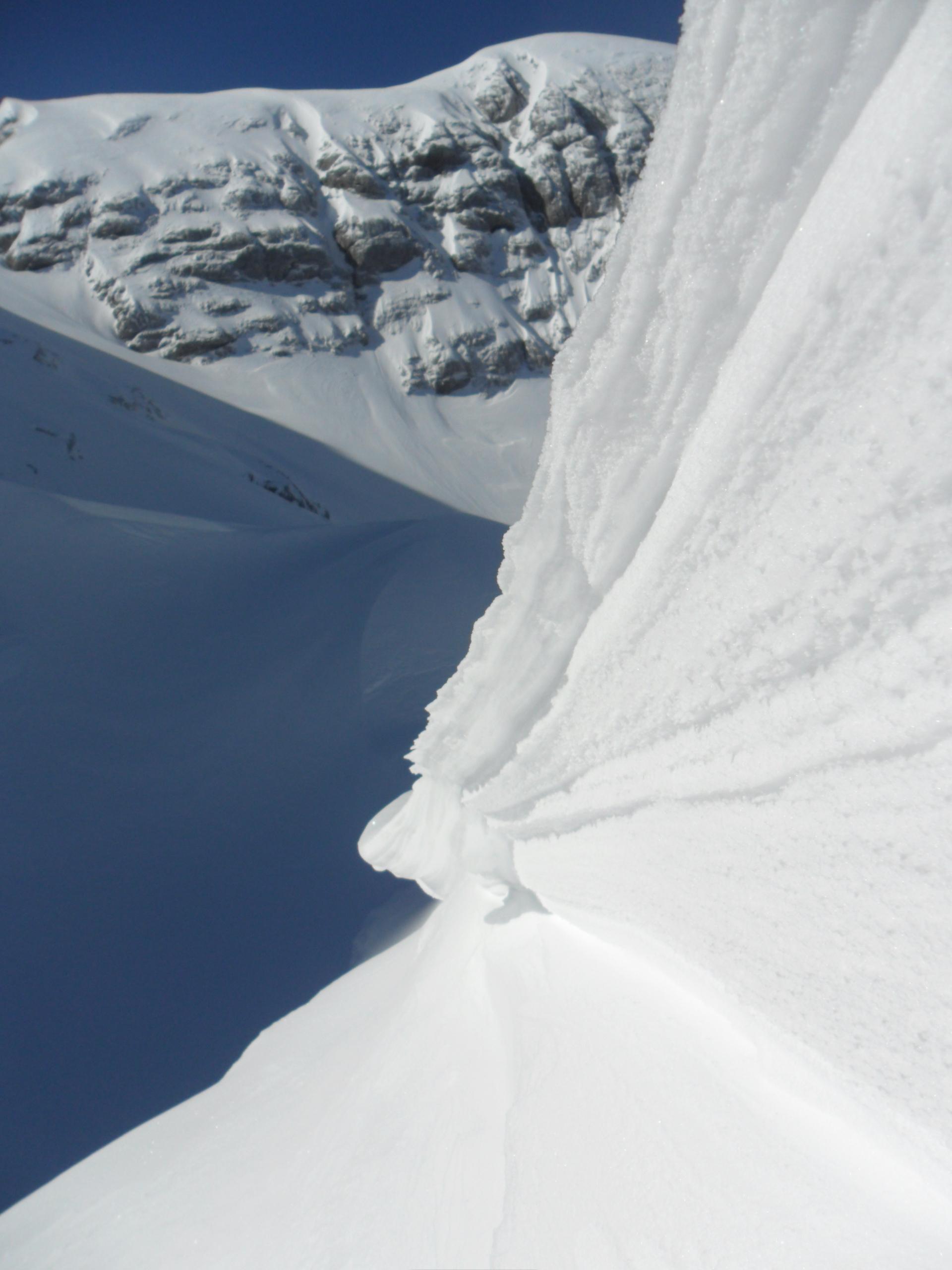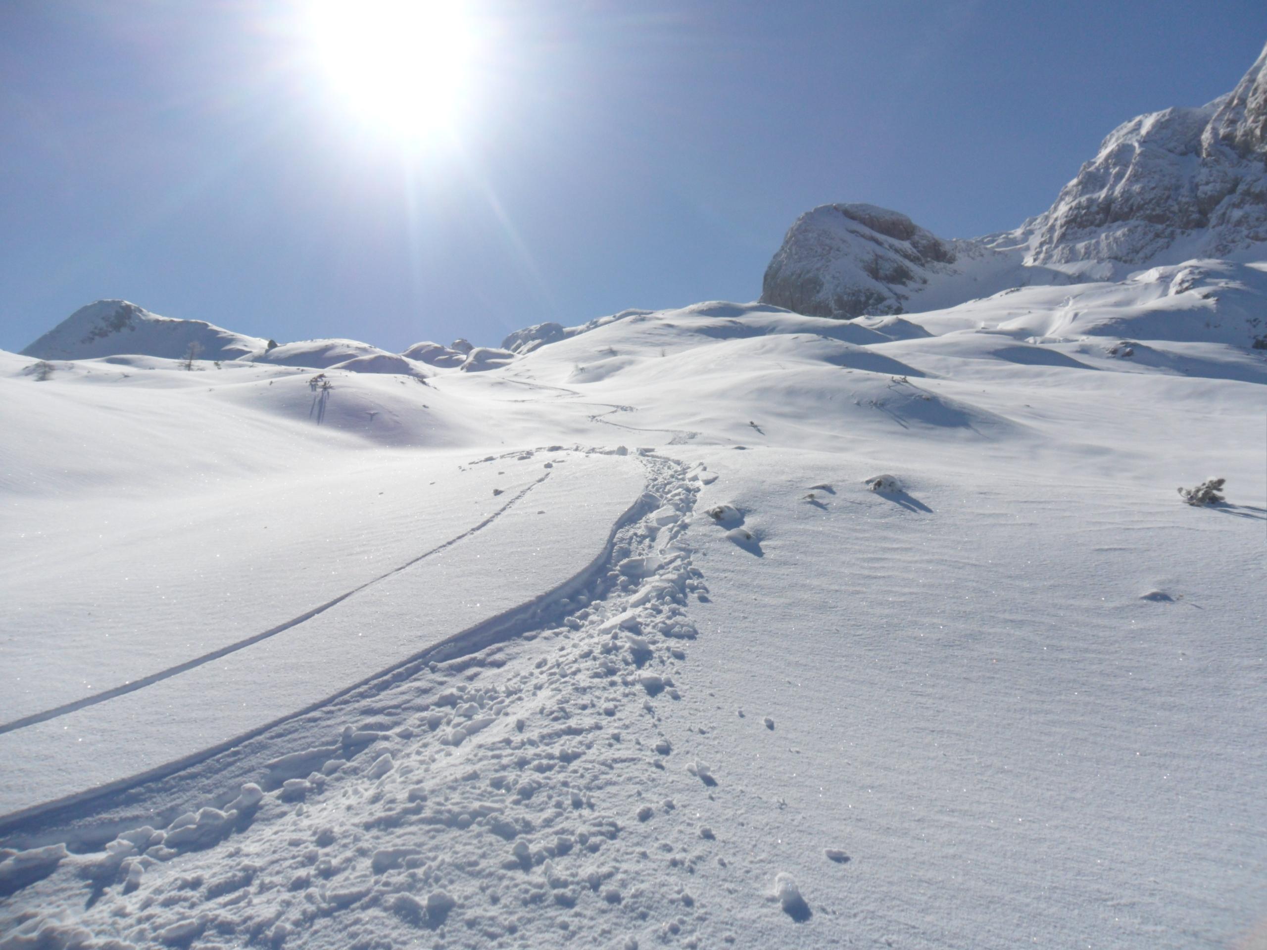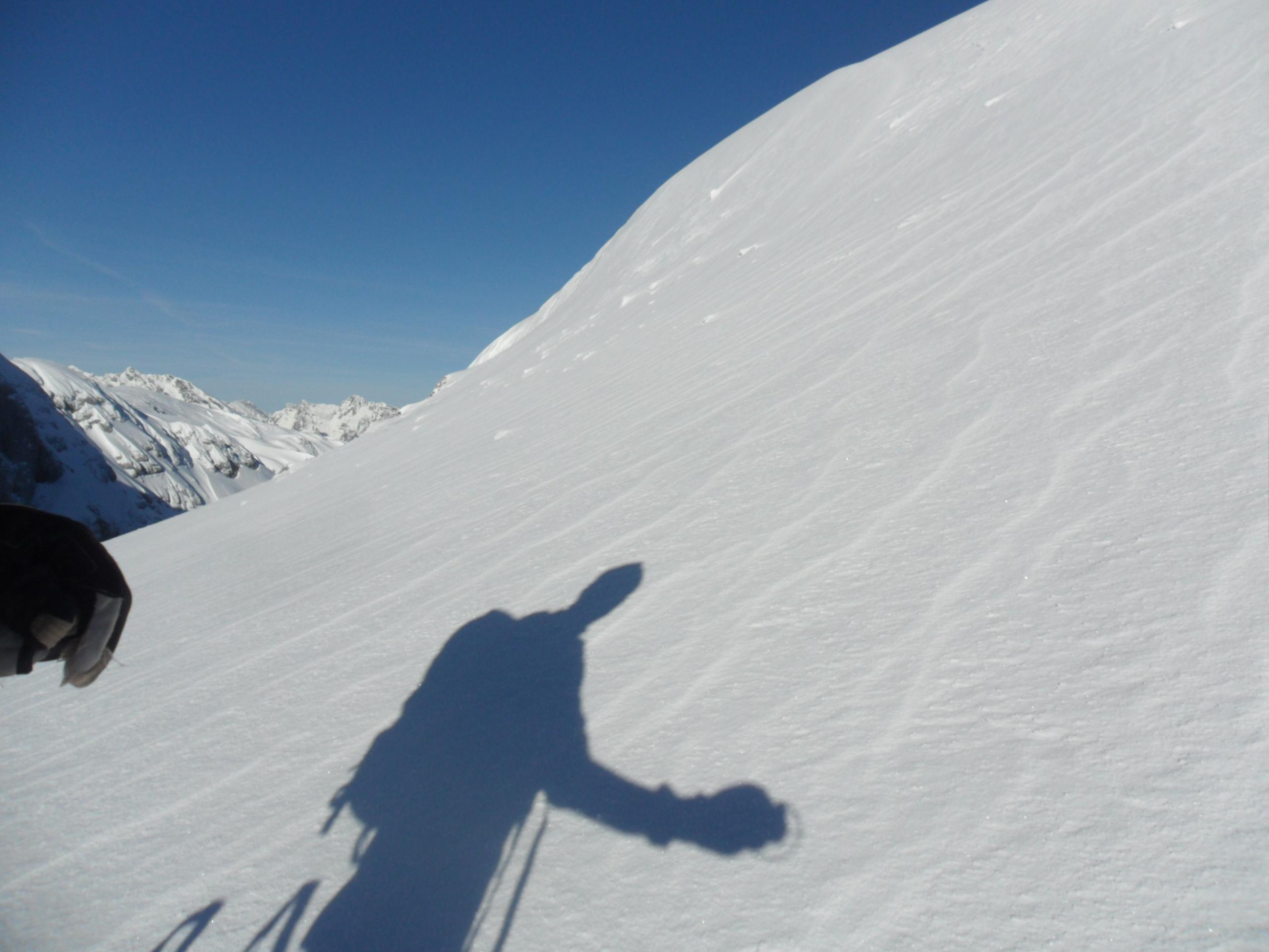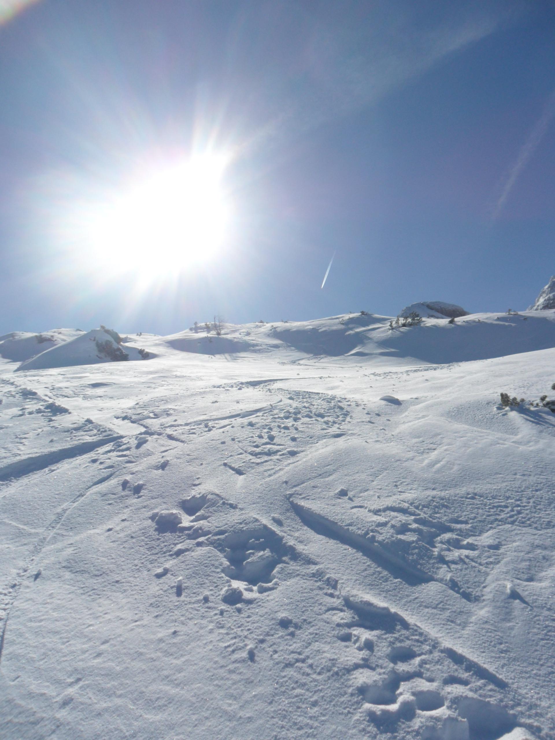 Ideal für die flachen Hänge im Alpetal. Auch im steileren Gelände konnte man Spass haben, wenn man die Lawinenknollen vergangener Abgänge umfahren hat. Für die hats dann doch zu wenig geschneit, aber Platz war genug. In der früh zumindest noch ;).