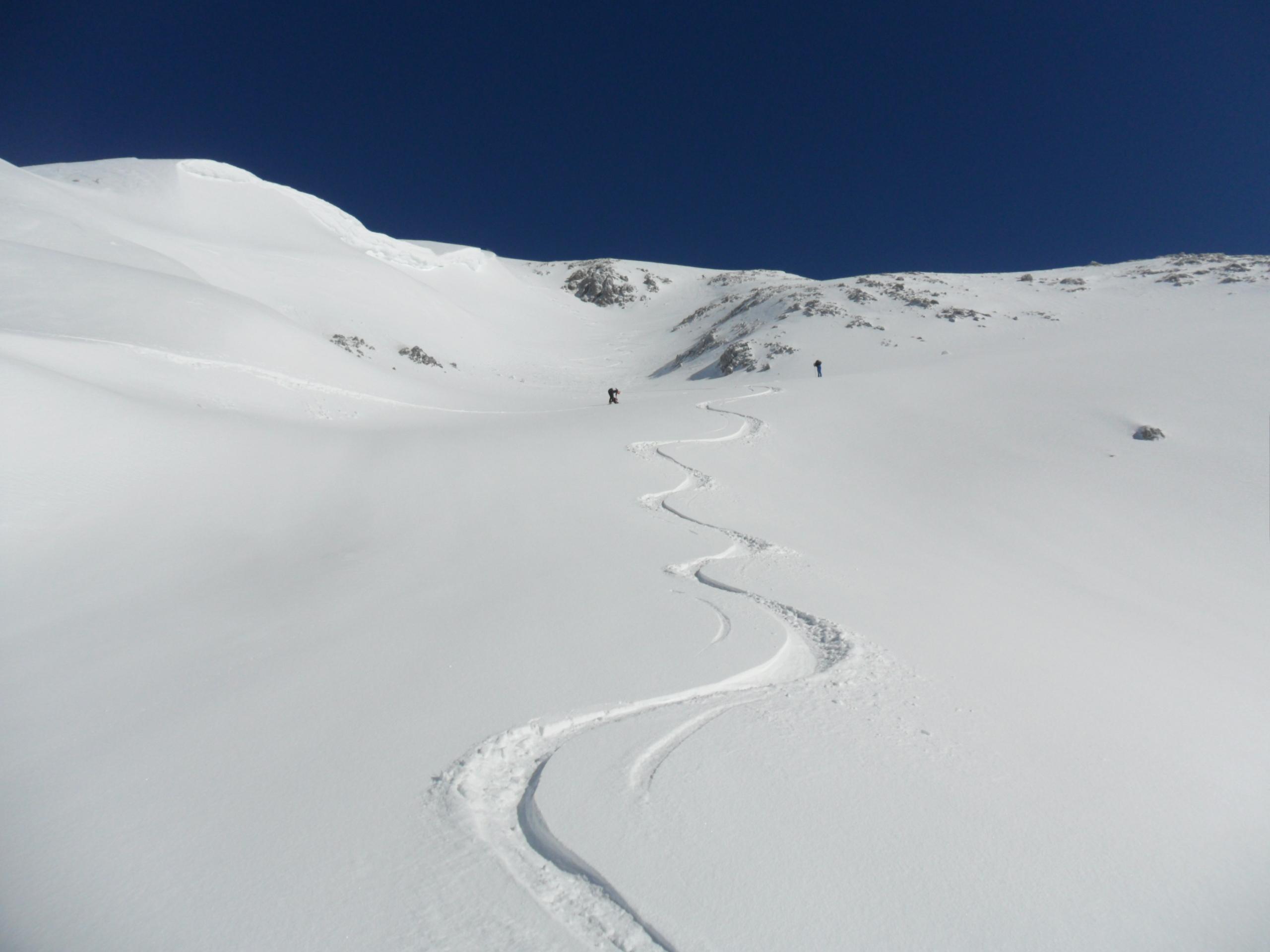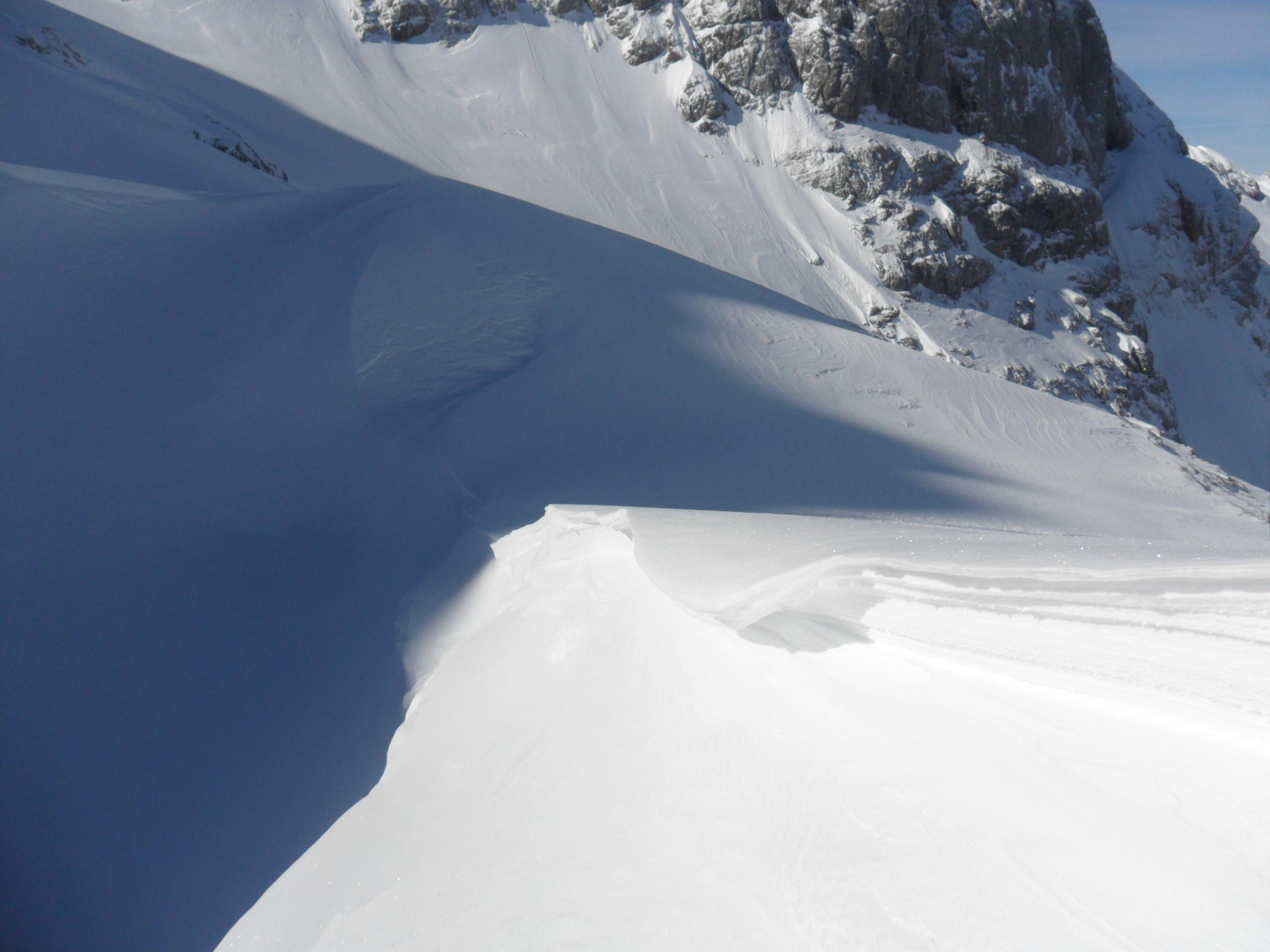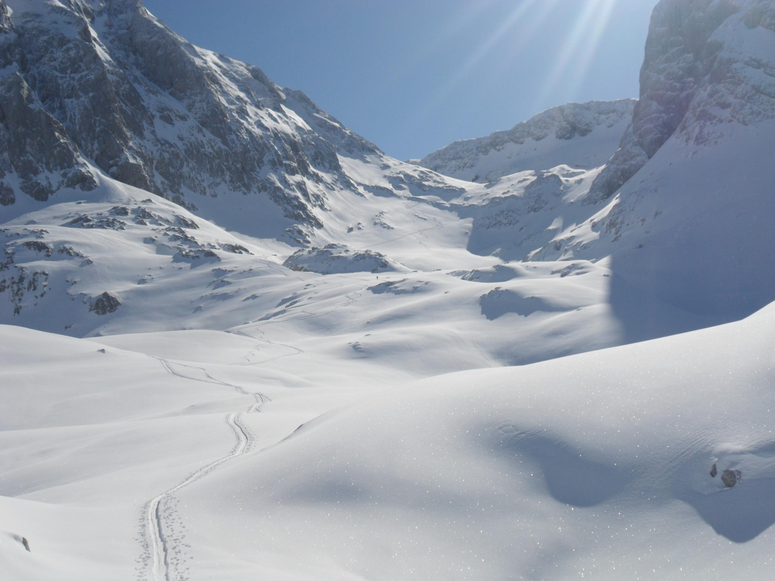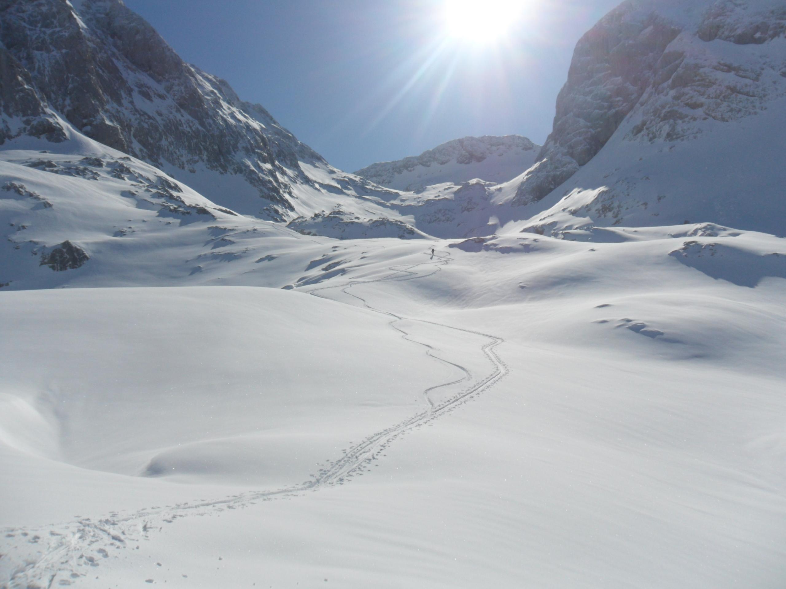 Ideal für die flachen Hänge im Alpetal. Auch im steileren Gelände konnte man Spass haben, wenn man die Lawinenknollen vergangener Abgänge umfahren hat. Für die hats dann doch zu wenig geschneit, aber Platz war genug. In der früh zumindest noch ;).