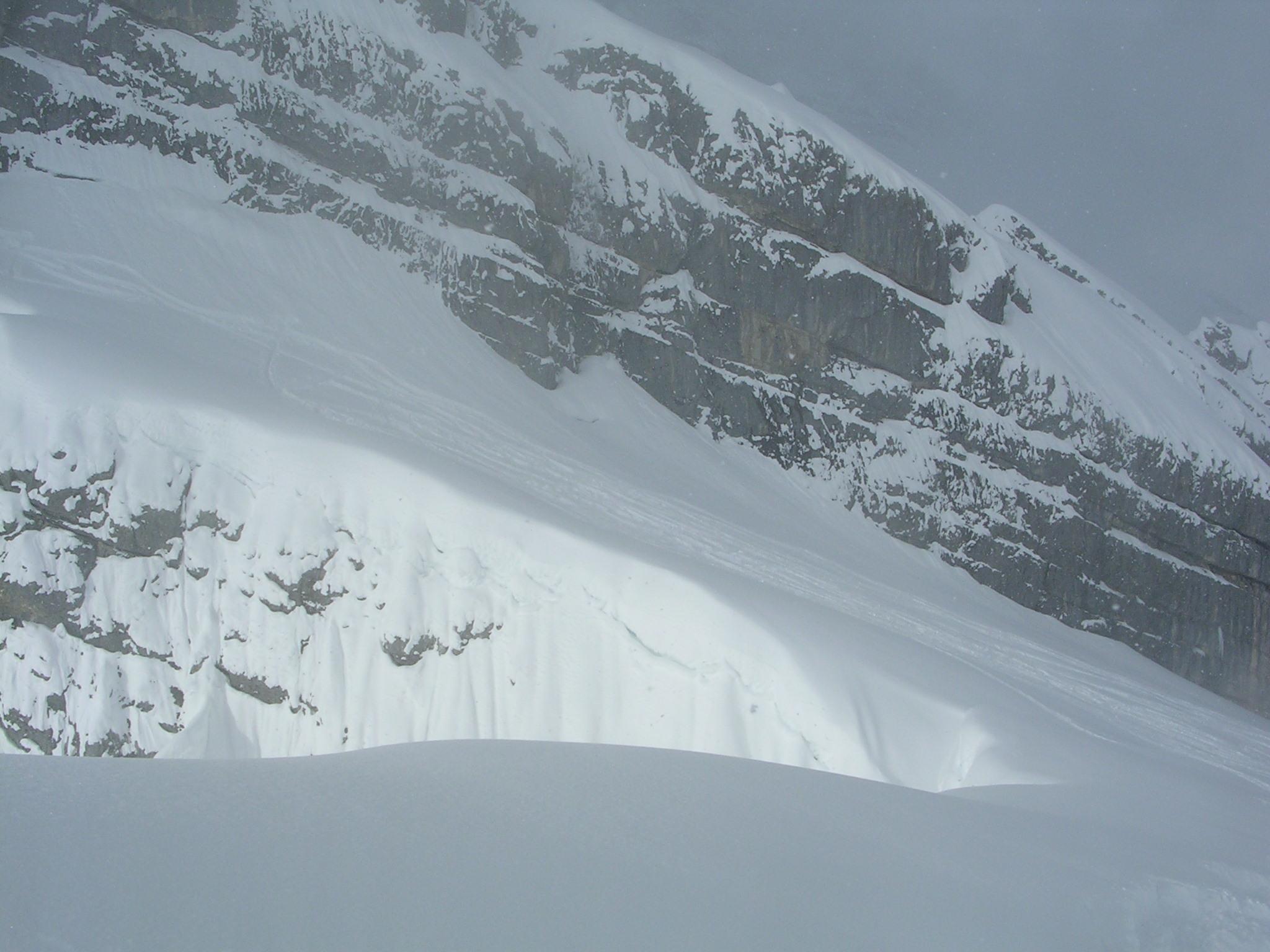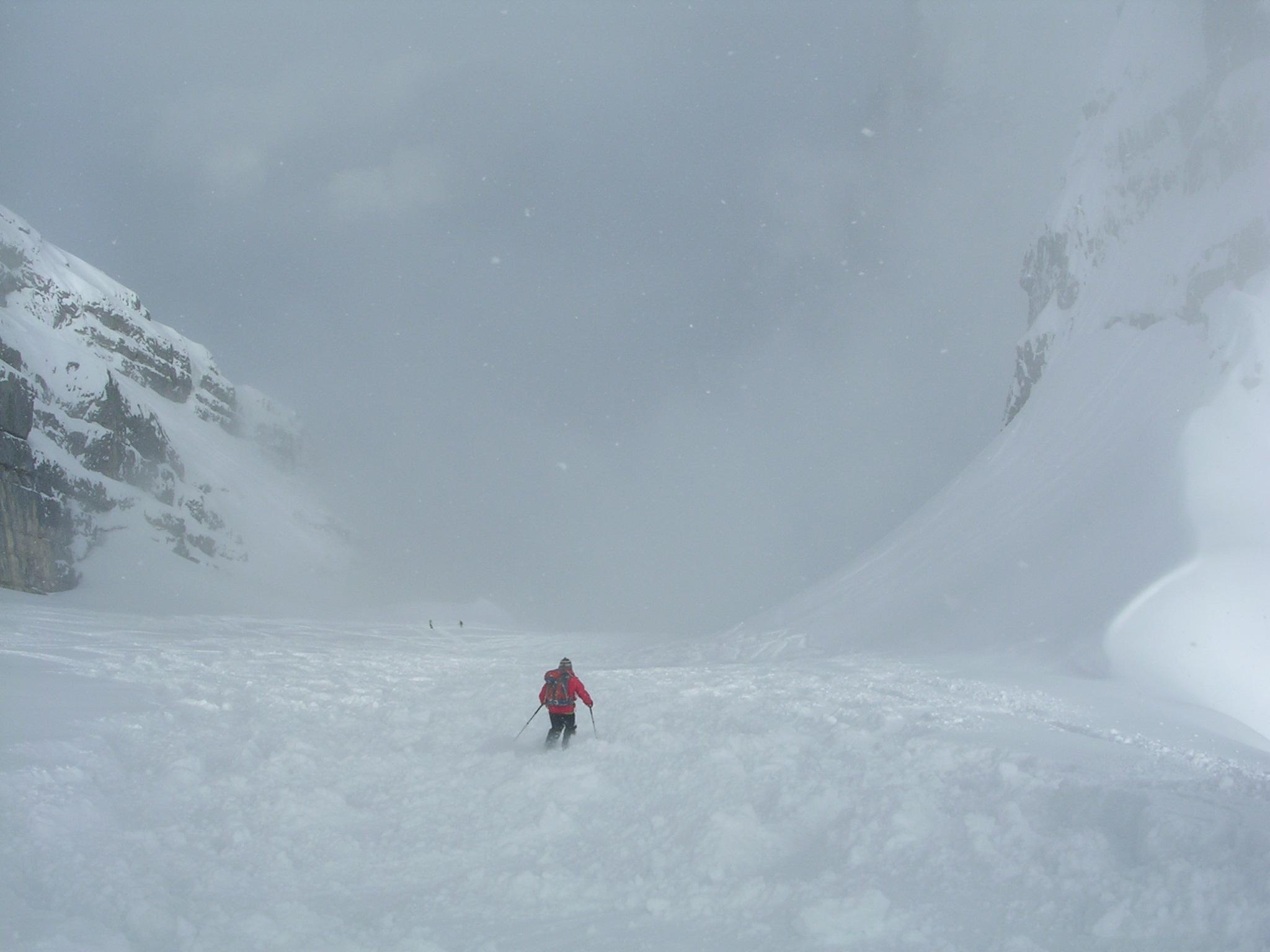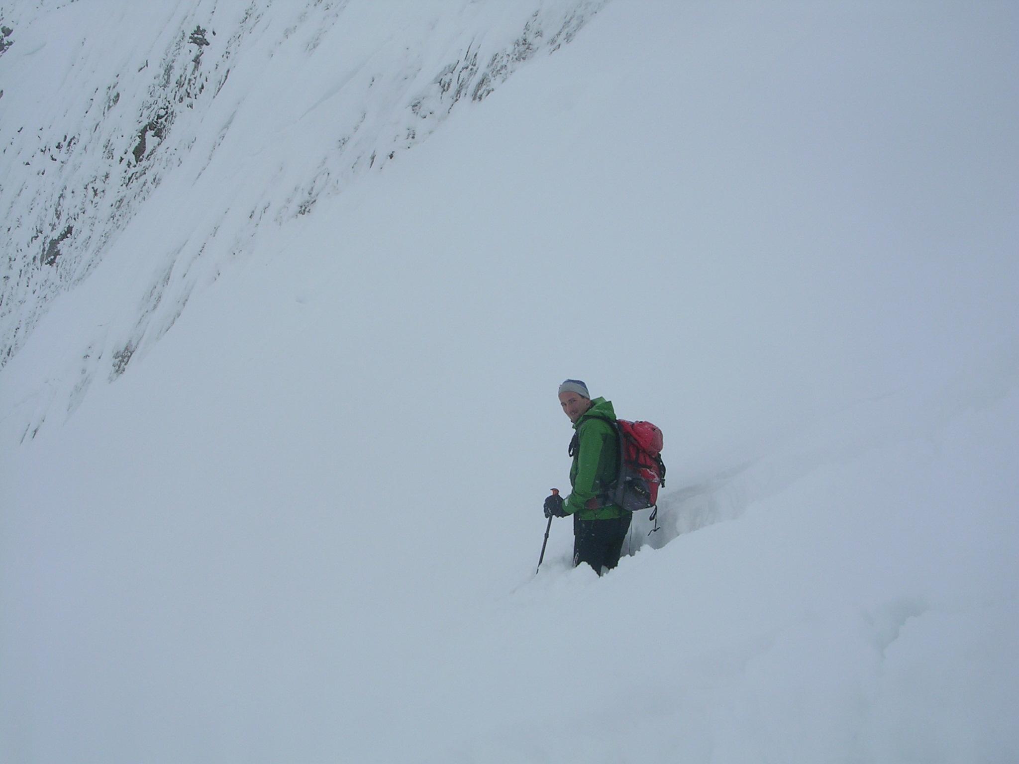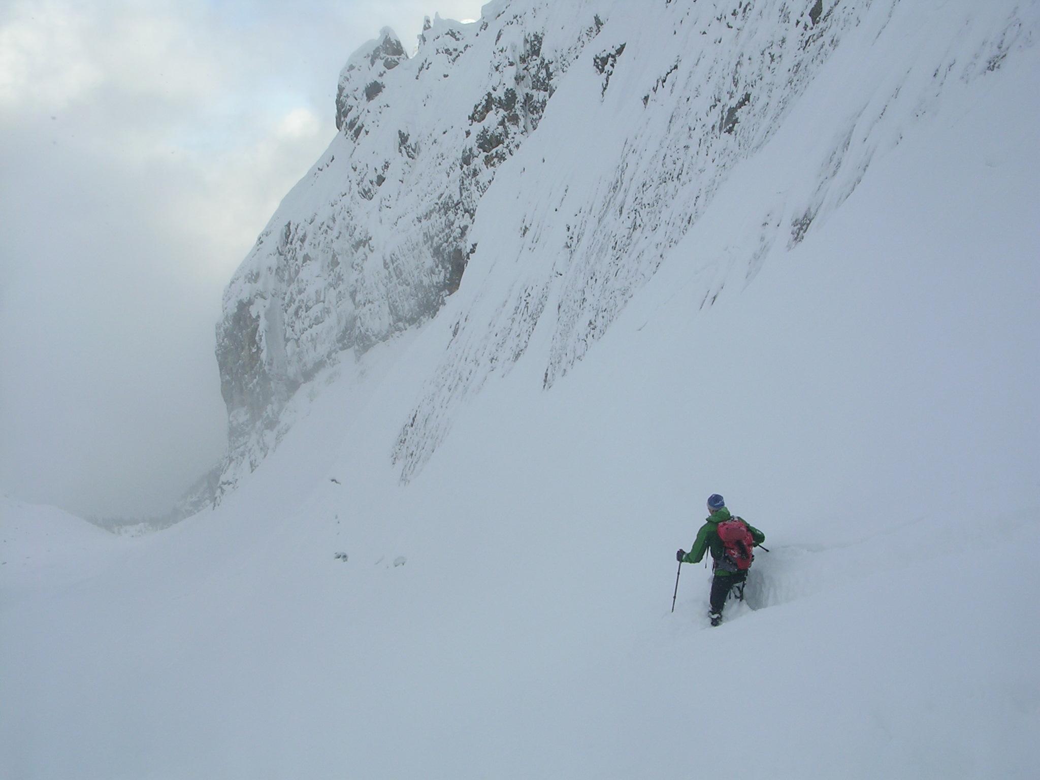 Im Watzmannkar liegt oben etwa 70 cm Pulverschnee. Danke an die Spurer.Wo noch niemand gefahren ist, braucht man eine ordentliche Steilheit, um sich abwärts durchzuwühlen.