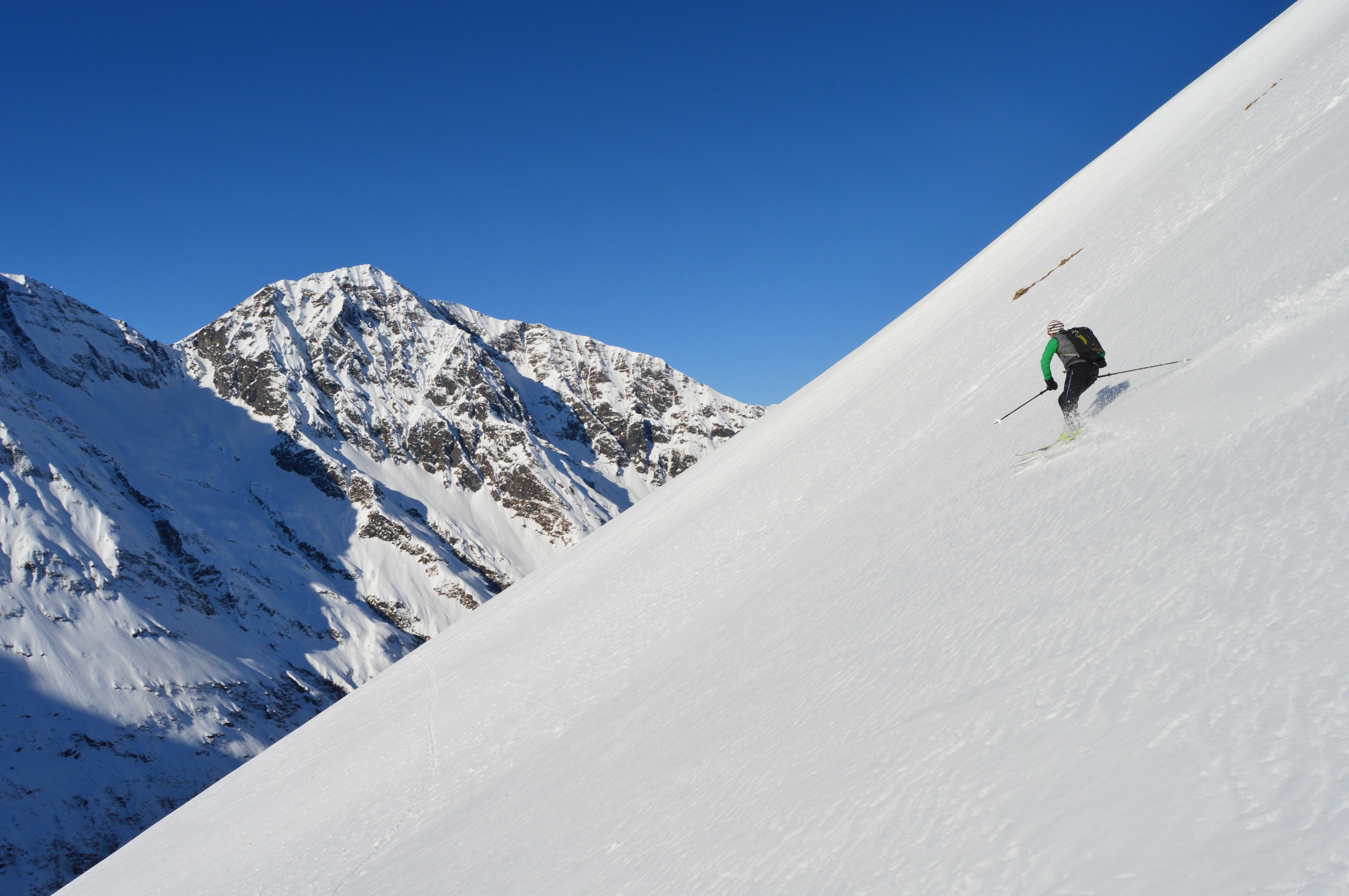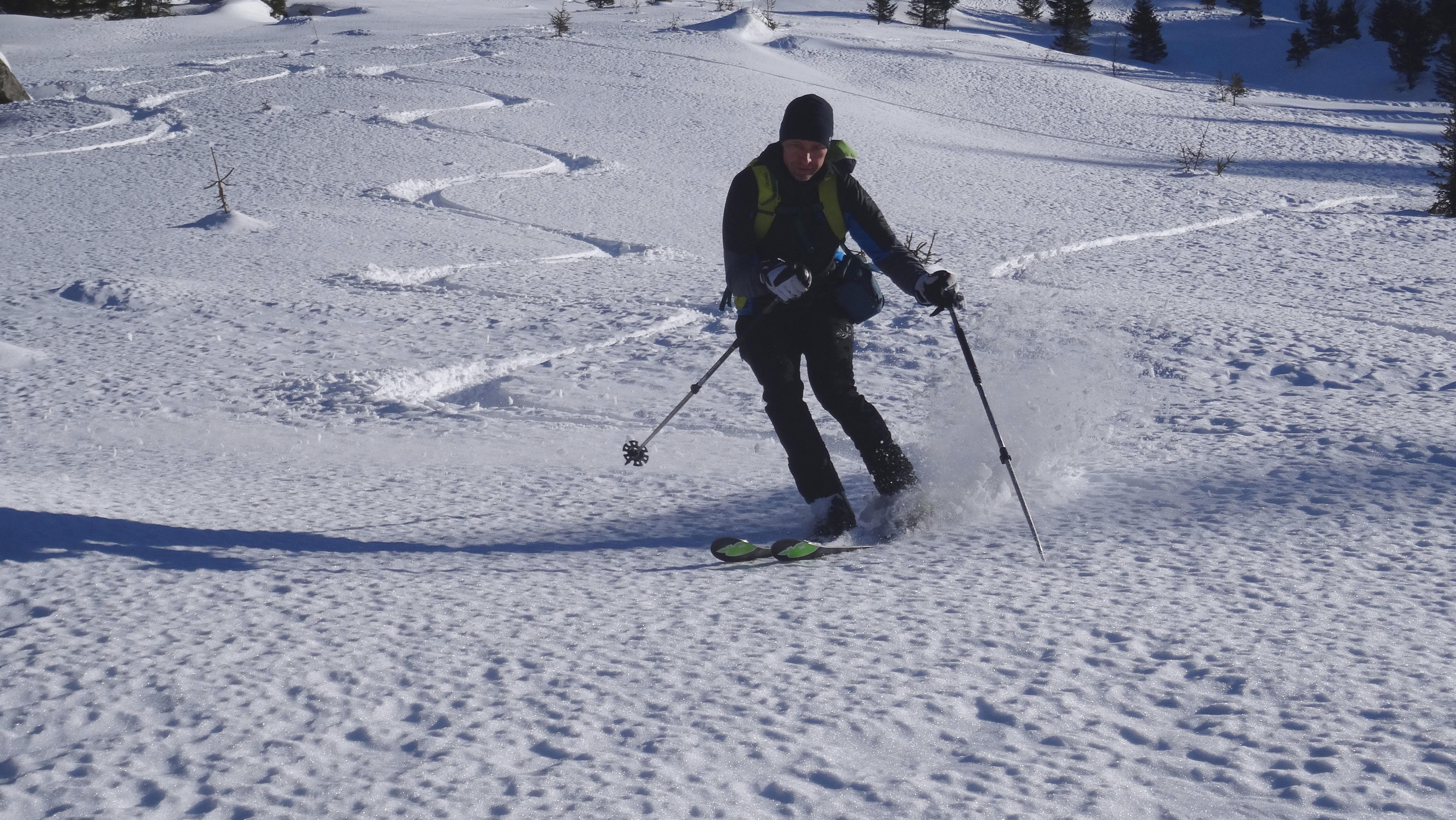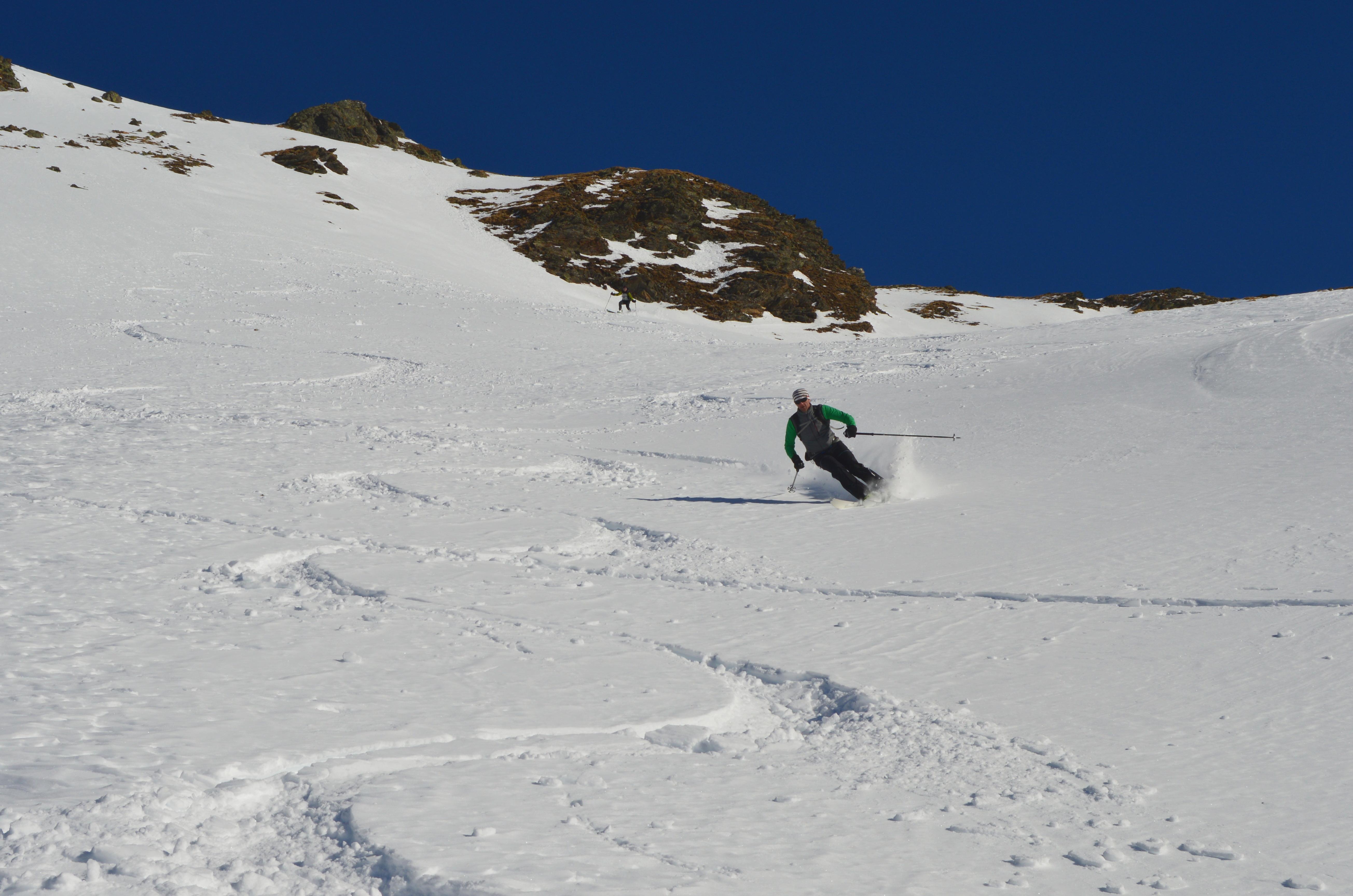 Die Schneeverhältnisse waren überraschend gut. Beim Aufstieg hatten wir noch mit viel schlechteren Bedingungen gerechnet. Größtenteils fuhren wir über tragenden Windharsch wie auf einer Piste ab. Unten im Graben waren dann noch ein paar Schwünge in gesetztem und windbehandelten Pulverschnee zu finden.