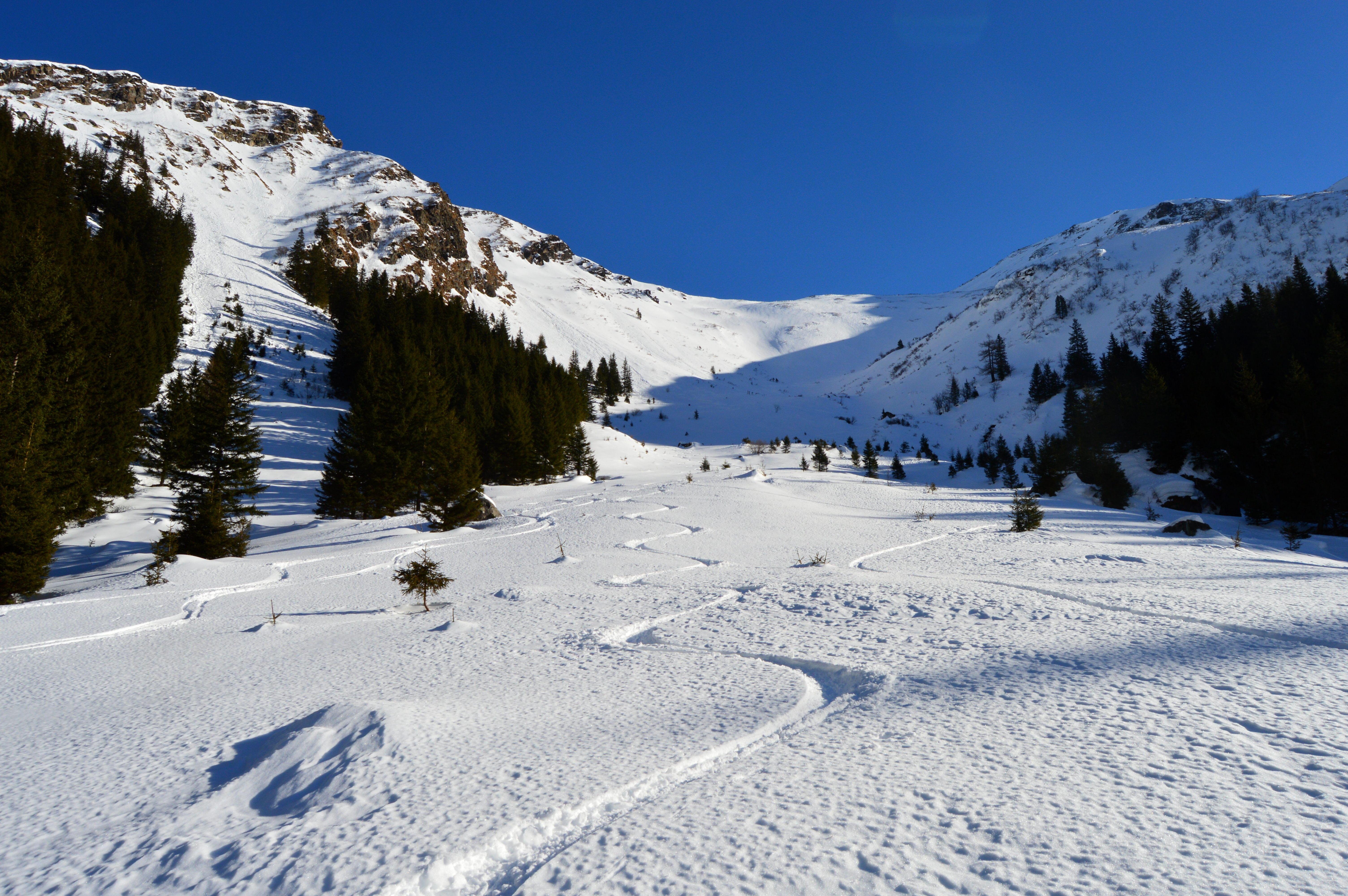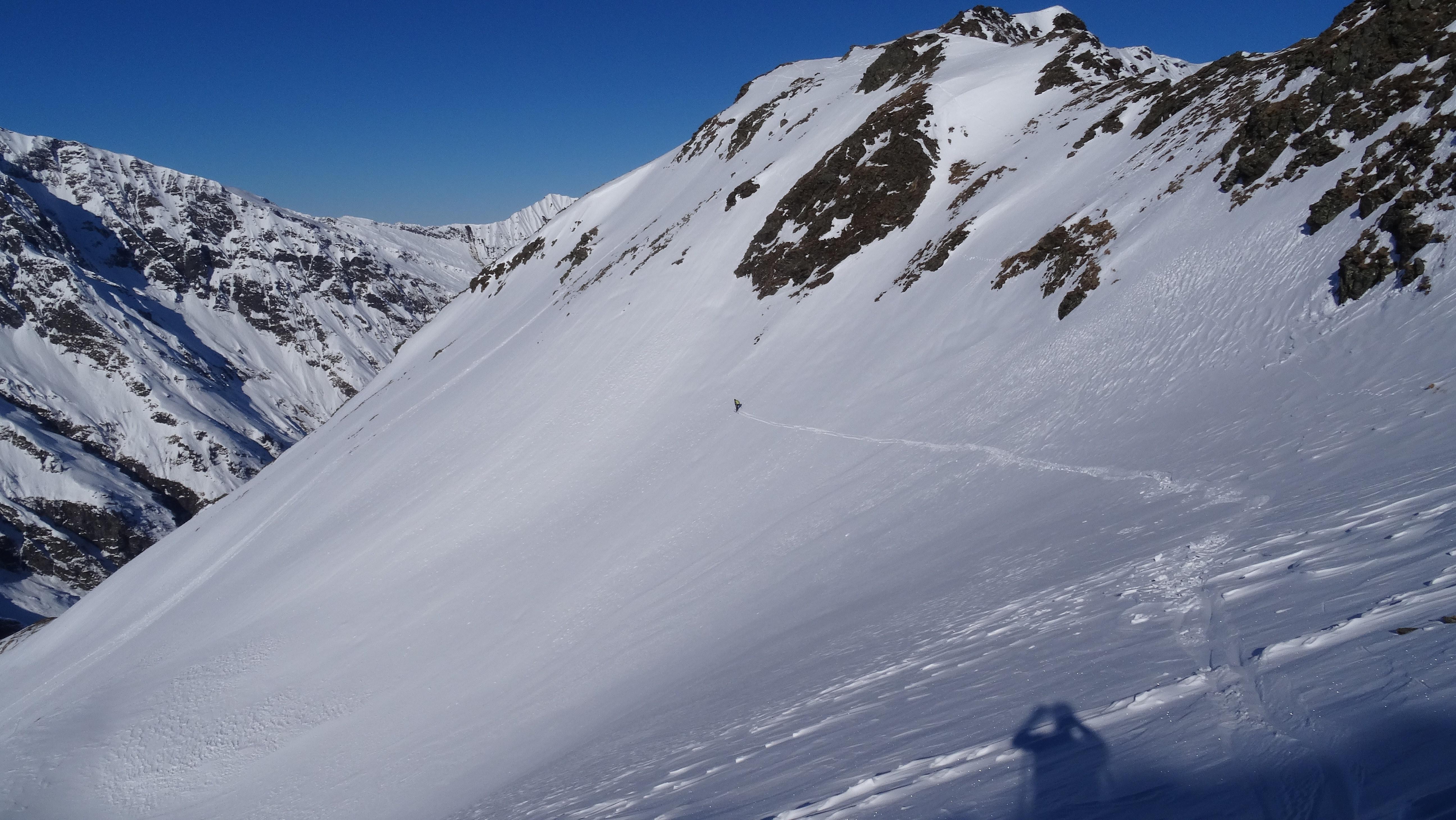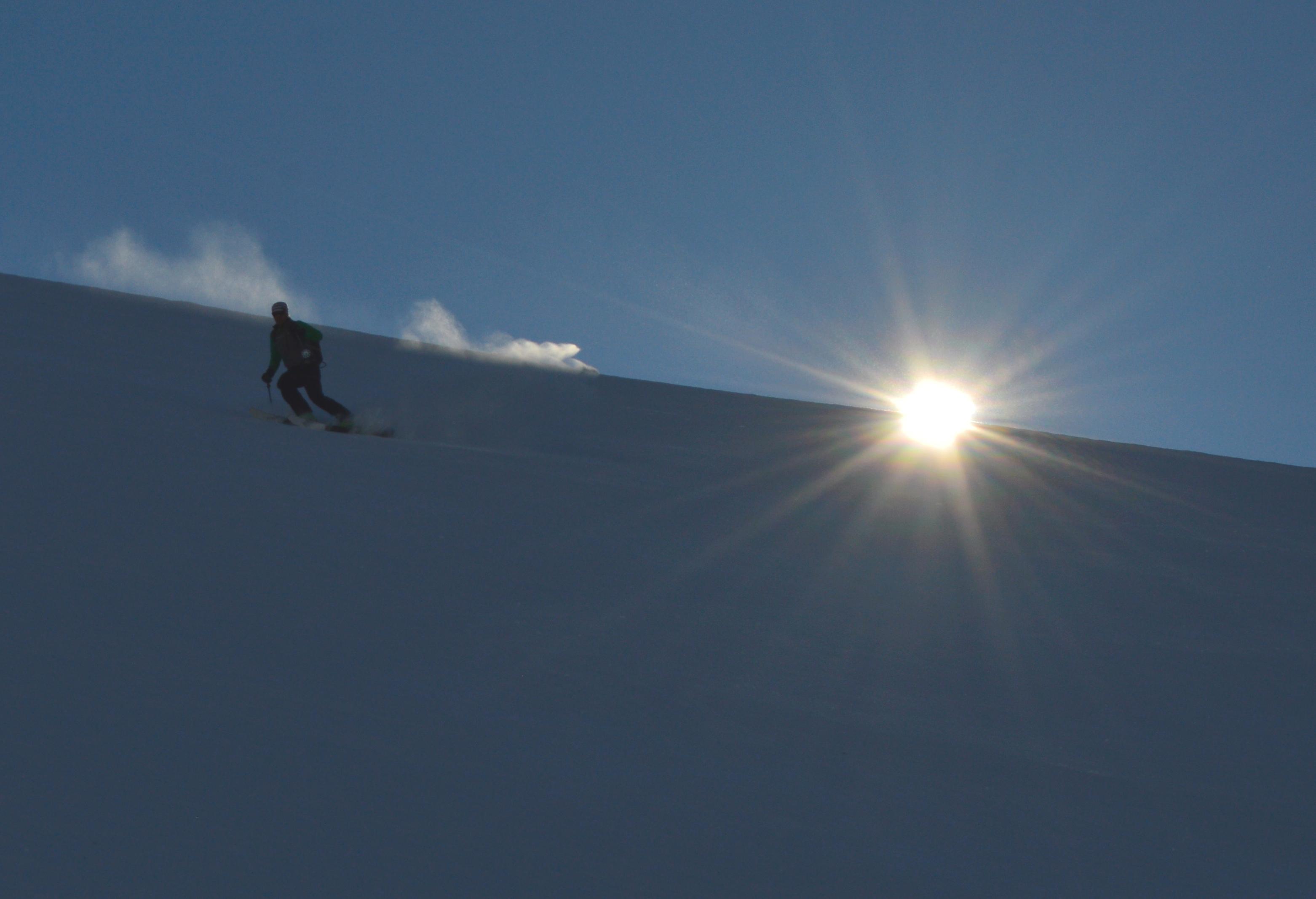 Die Schneeverhältnisse waren überraschend gut. Beim Aufstieg hatten wir noch mit viel schlechteren Bedingungen gerechnet. Größtenteils fuhren wir über tragenden Windharsch wie auf einer Piste ab. Unten im Graben waren dann noch ein paar Schwünge in gesetztem und windbehandelten Pulverschnee zu finden.