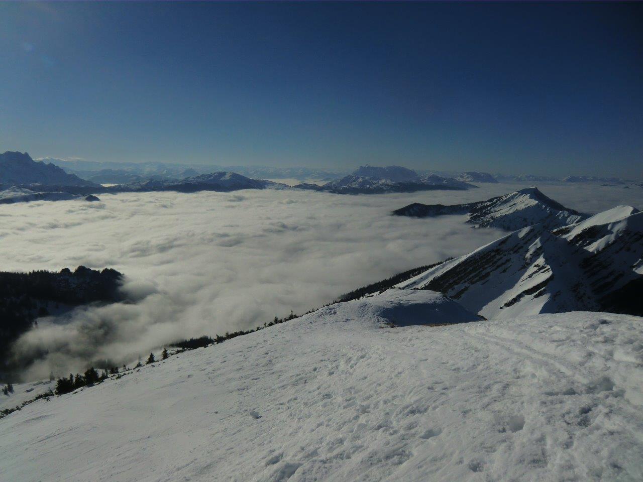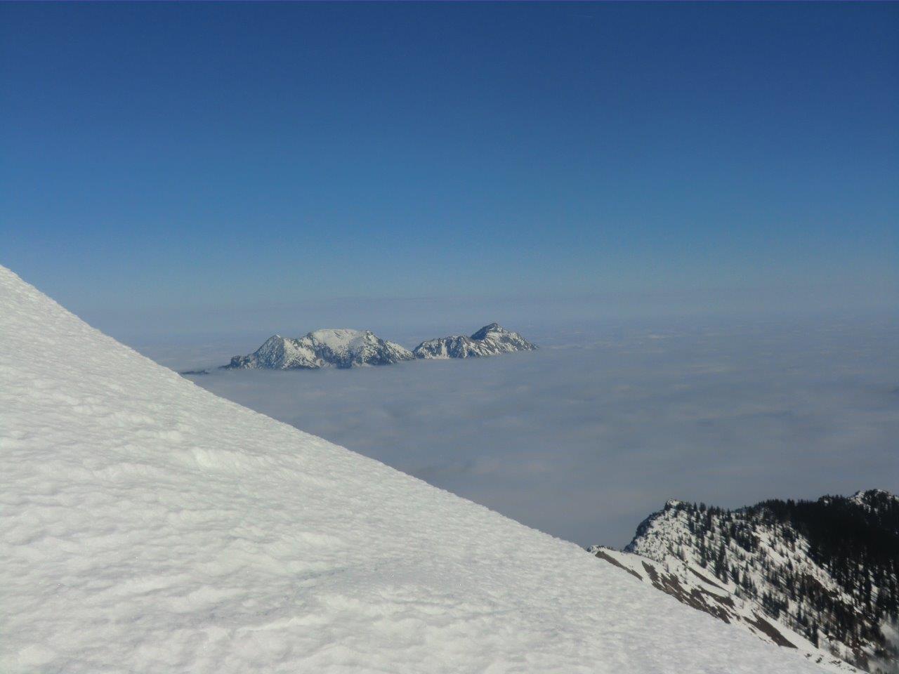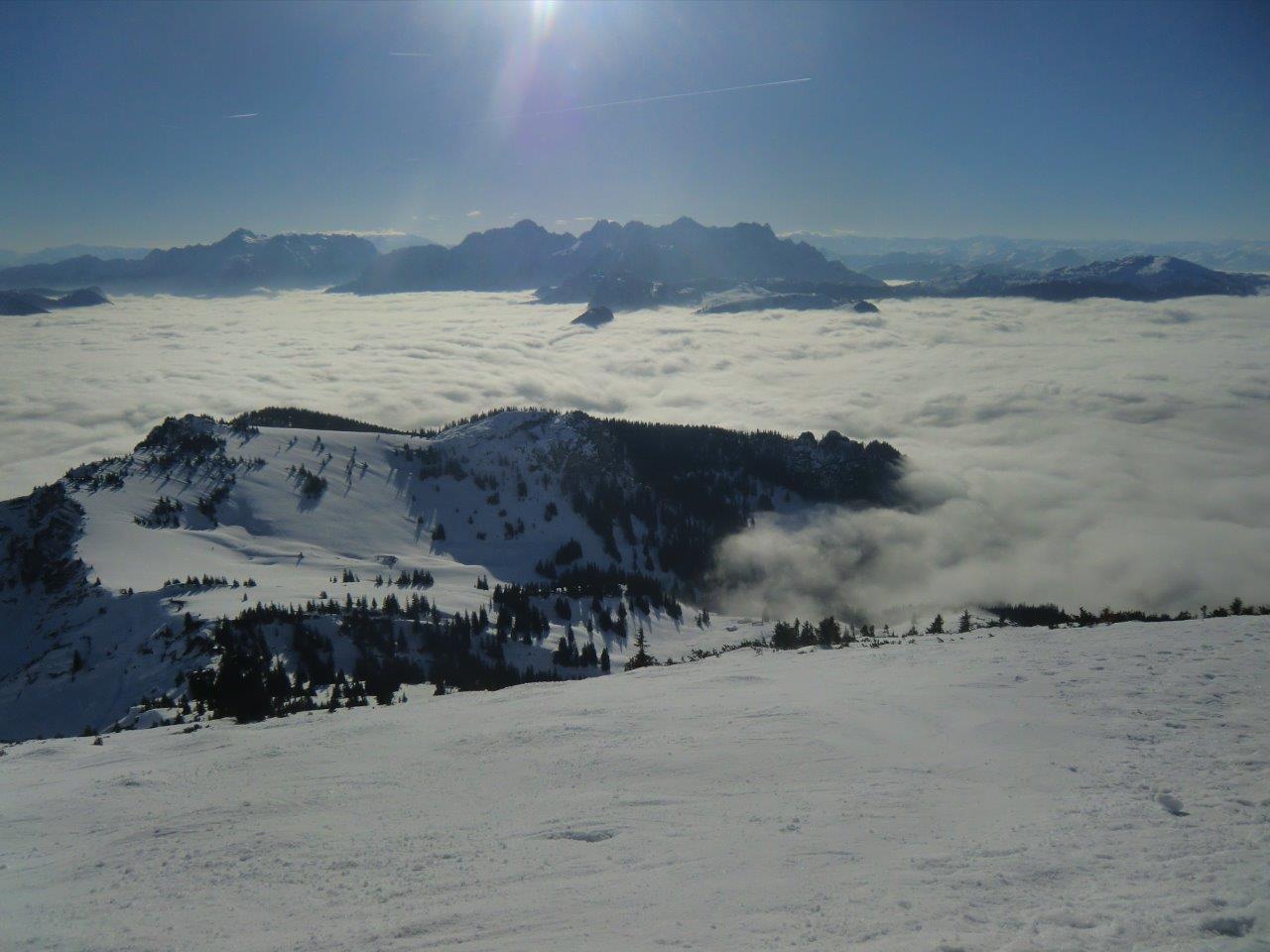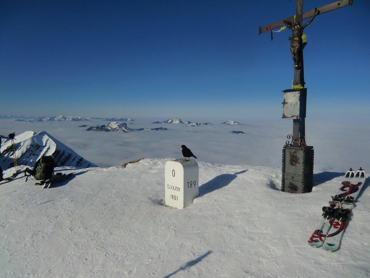 Die Rettung in diesen Bruchharschzeiten. Von unten bis oben ein pippifeiner fester und griffiger Schneepanzer und angenehm pistenartig eingefahren - rechts und links des breiten Pistenkorridors allerdings Bruchharsch-Todeszone. Am Gipfel lebhafter kalter Südwind. Wirklich kein T-Shirt-Wetter heute, dafür bombastische Fernsicht. Die Nebeldecke wabberte ganztägig bei 1500m. Die Sonnenbank auf der Hochalm war zeitweise eine Nebelbank.