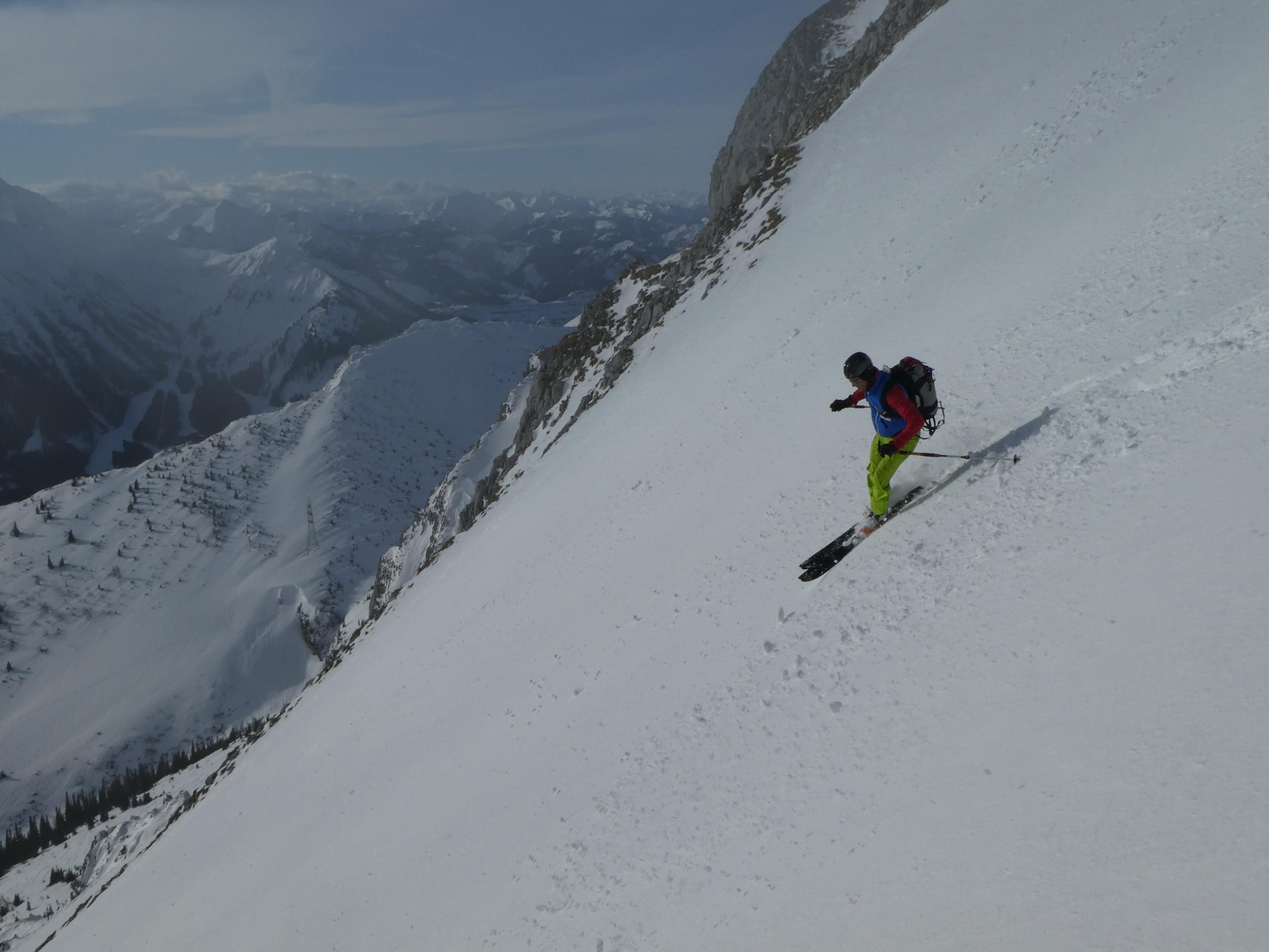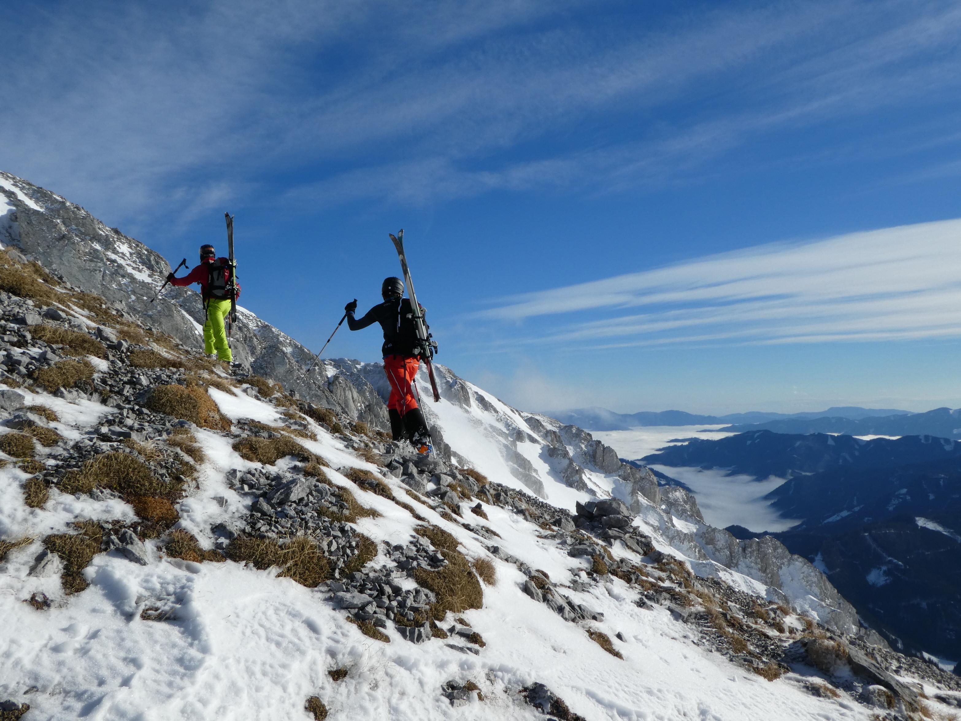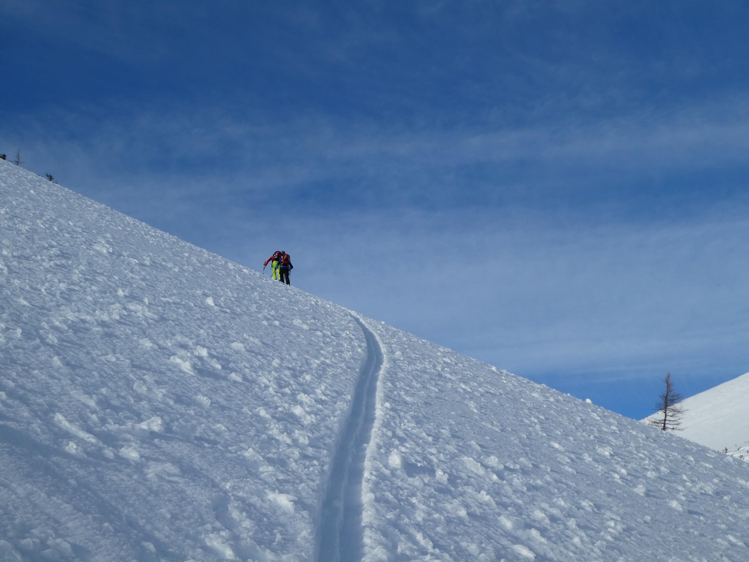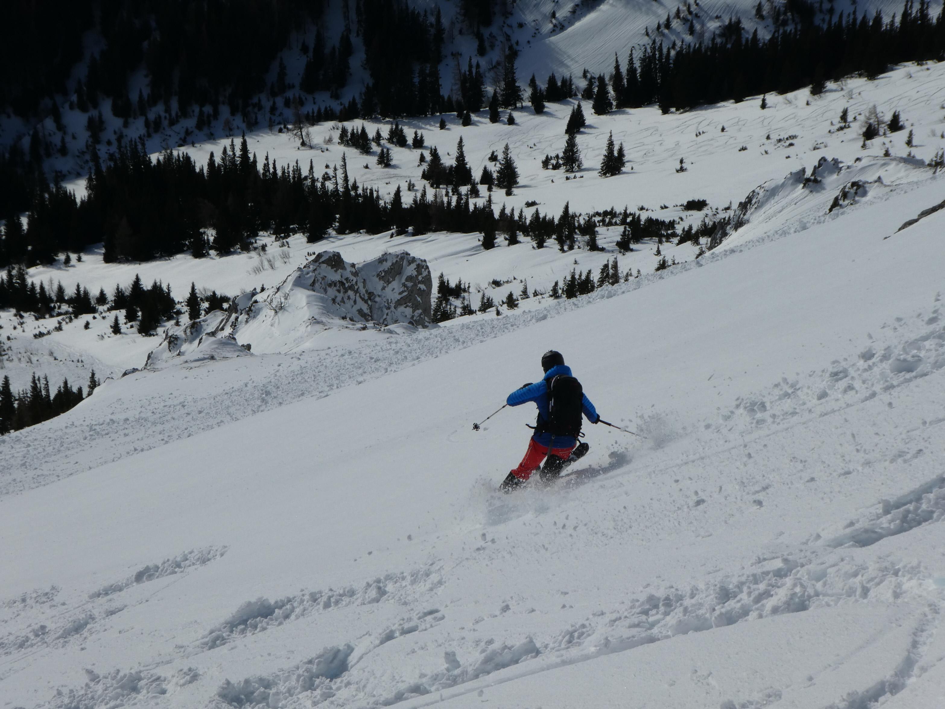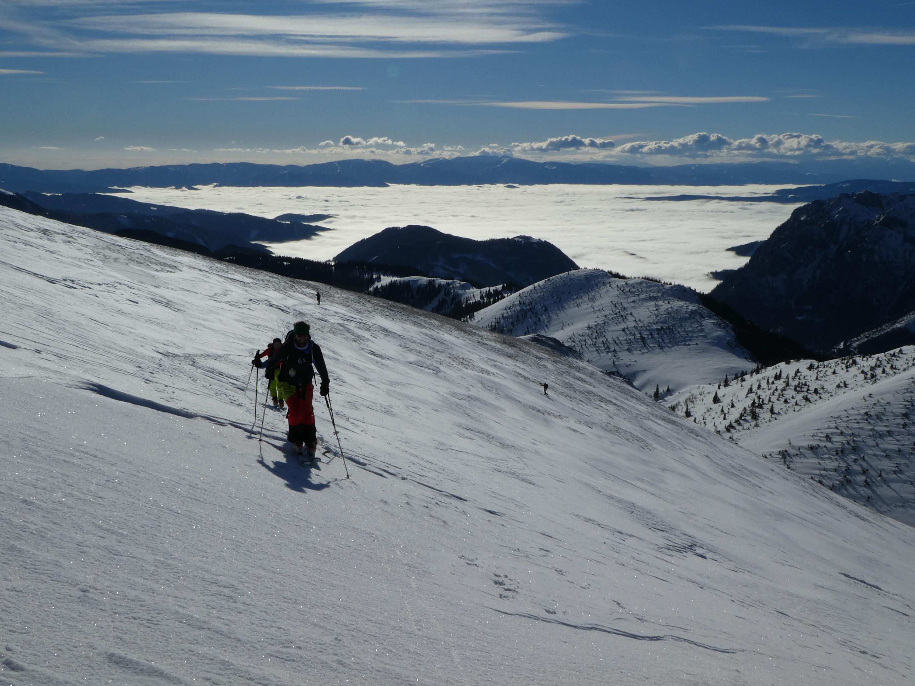 Vom Präbichl (Almhäuser) - Obere Handlalm - Leobner Mauer (1.870 m) (direkt über Westflanke) - Zwischenabfahrt in den Ochsenboden - Wildfeld - Lamingegg (1.959 m) - Namenloser Gipfel SO vom Lamingegg (2.010 m) - Hochturm 2.081 m; Wiederanstieg aus dem Schneeloch auf die Leobner Mauer; insges. 1.460 Hm
