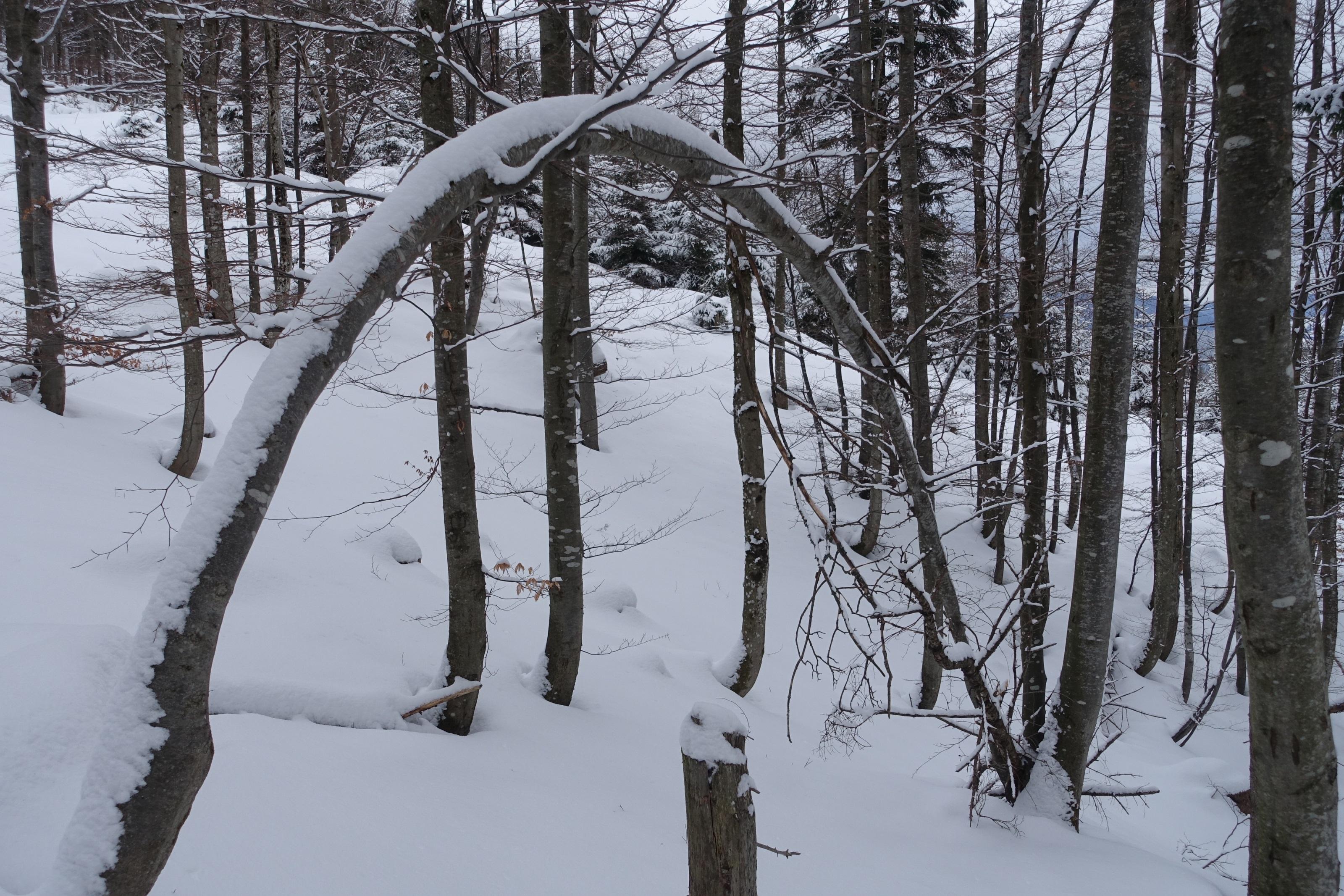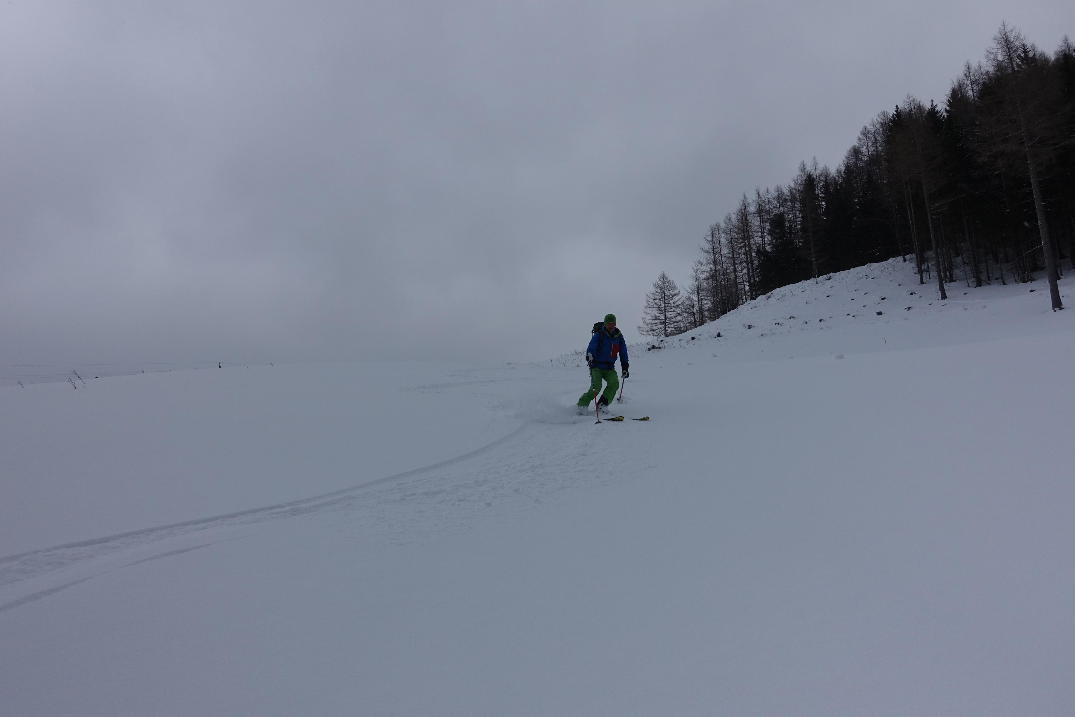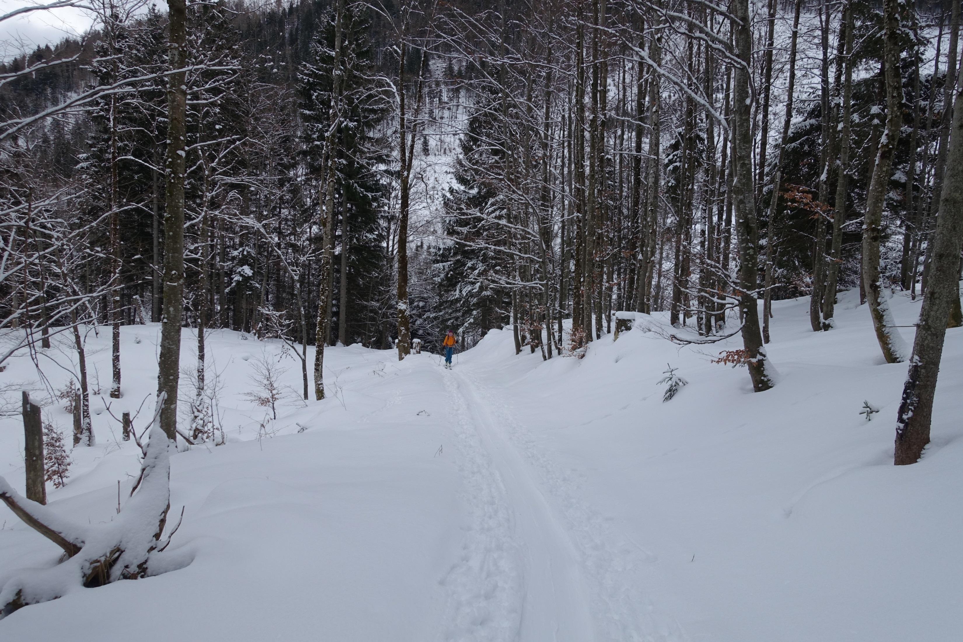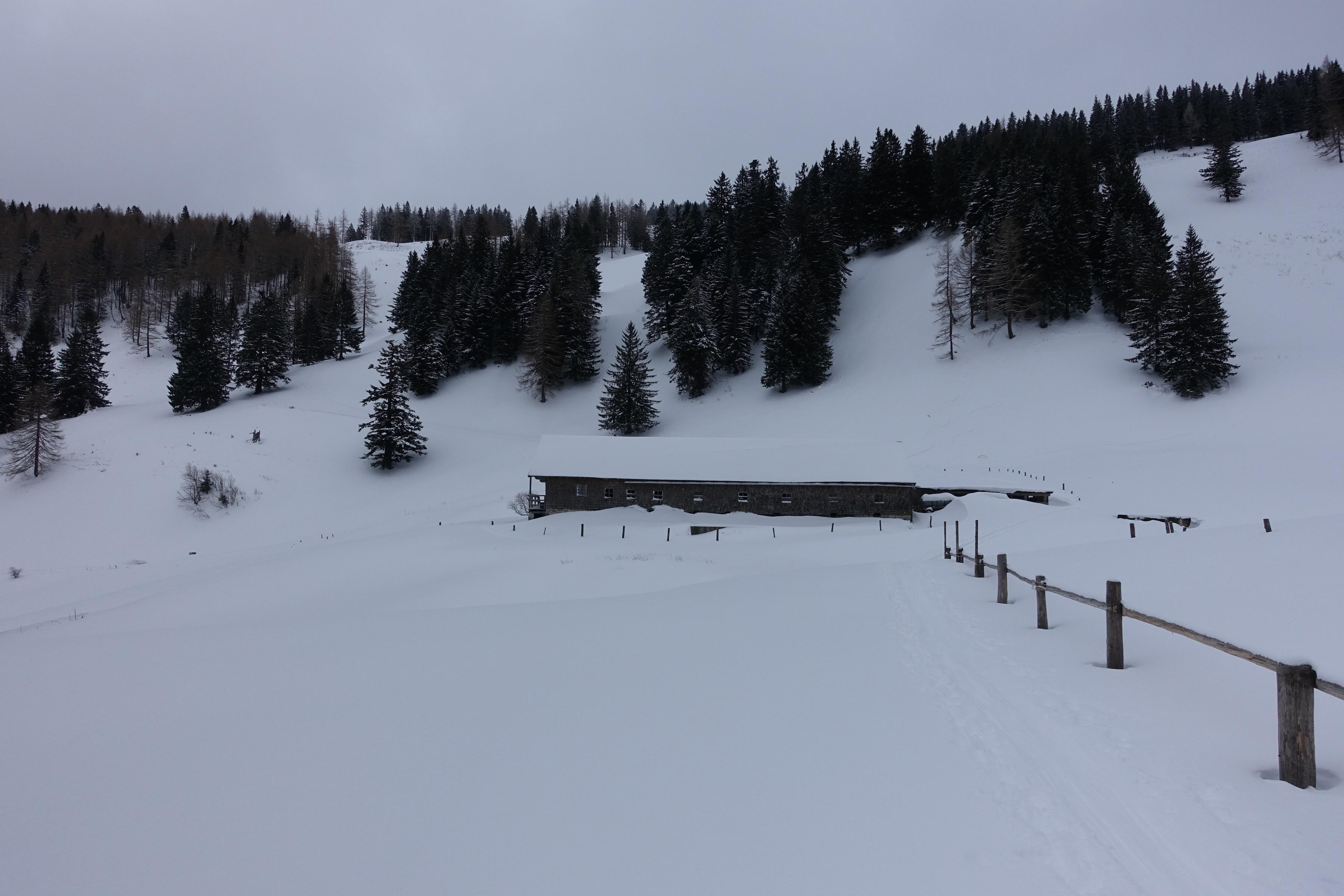 Nochmals Faistenau bzw. Tiefbrunnau und wieder Neuschnee. Aufstieg auf der rechten Grabenseite unterm Gartenberg zur Stubneralm und weiter zum Gipfel.