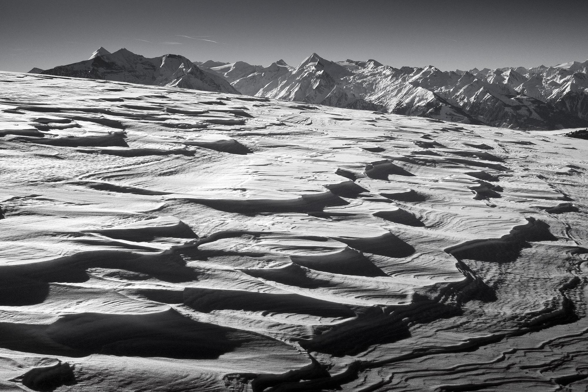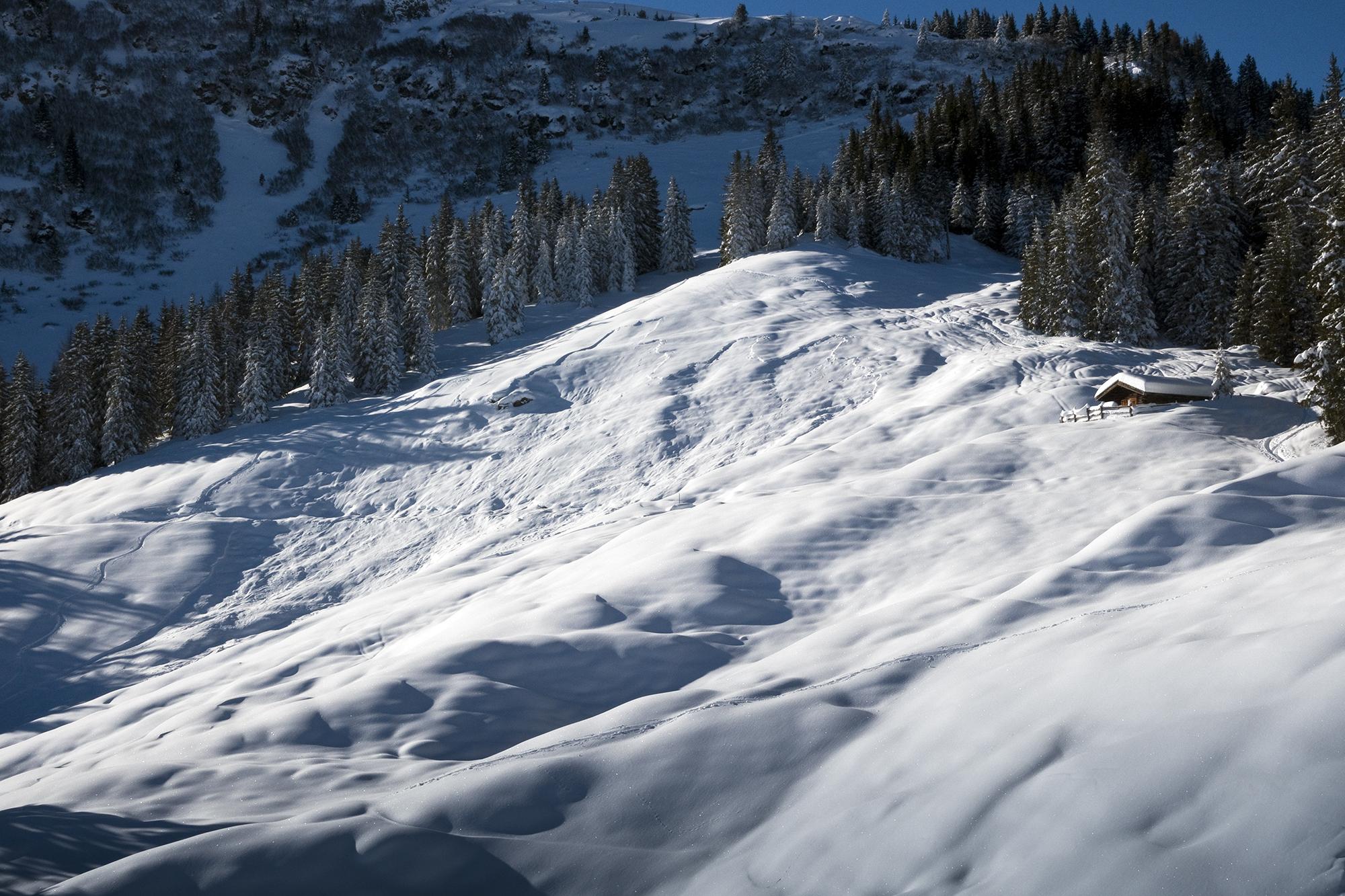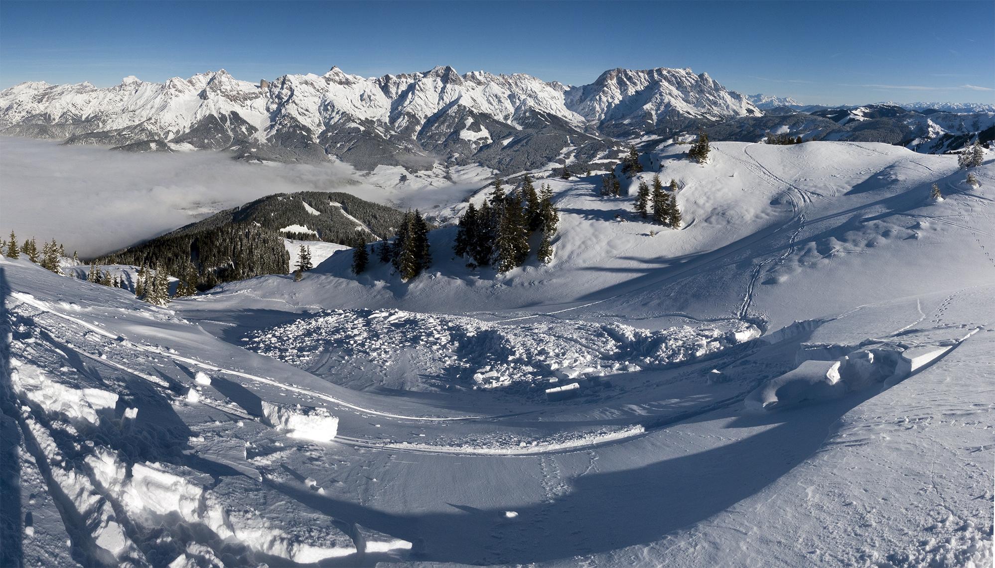 Von Unterberg auf der Ostseite im tiefen Pulverschnee. Im Gegensatz dazu kann man die Schwalbenwand von der Westseite (Gerling) noch gar nicht gehen, dort ist sehr viel weniger Schnee. Auf den Almen um die Skihütte haben sich nordostseitig einige Schneebretter entladen und sind wieder überschneit worden.