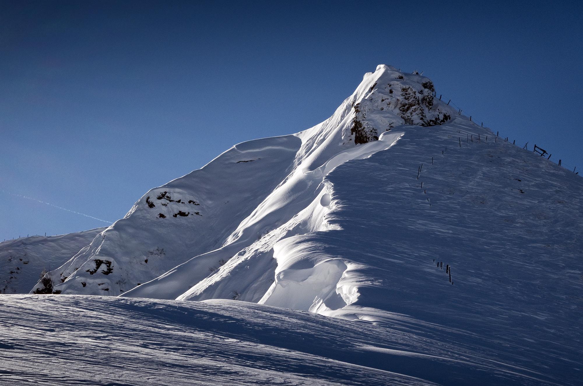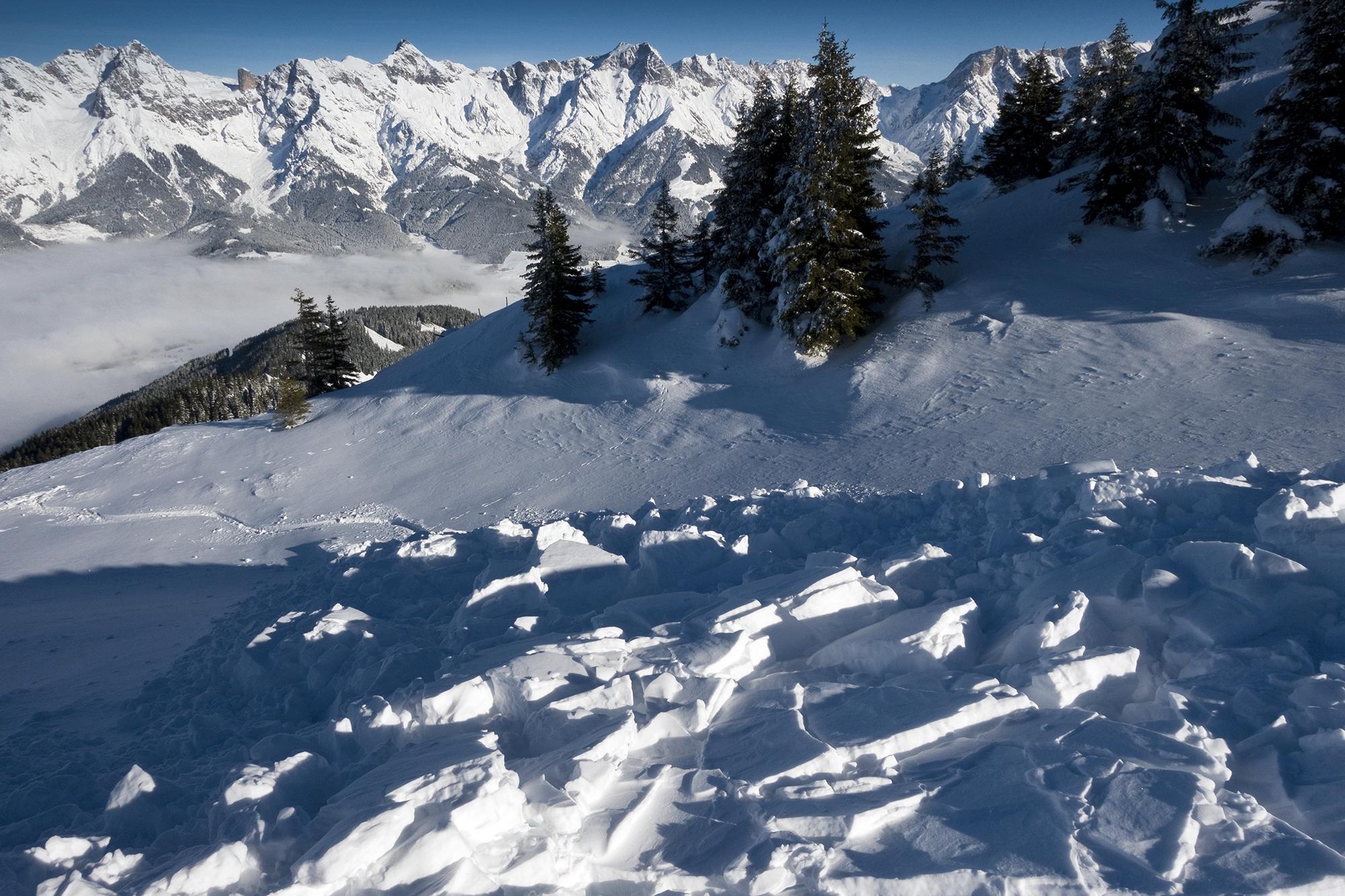Weiter oben direkt neben dem Brunnkopf auf dem Bergrücken trifft man wieder auf ein Schneebrett, dort ist im nicht sehr steilen Gelände ein Triebschneefeld abgebrochen. Der Schnee am Bergrücken ist verblasen und windgepresst. Der Schwalbenwandgipfel ist verwechtet. Die Abfahrt ist ab der Baumgrenze ein Pulververgnügen bis ins Tal. Sonnseitig schon leicht angestochen, - aber es gibt ja genug Schattenhänge von Brunnkopf und Schwalbenwand hinunter!