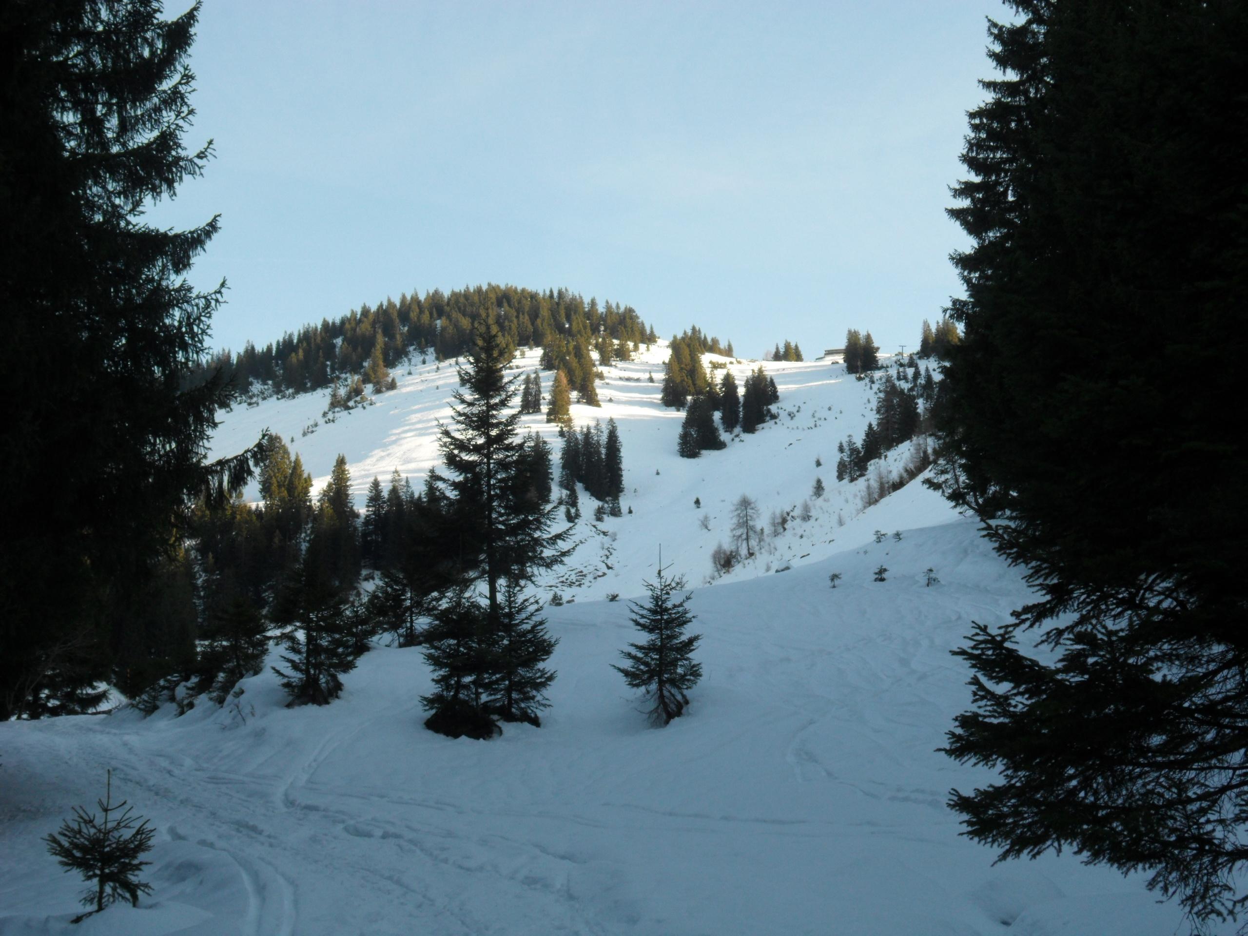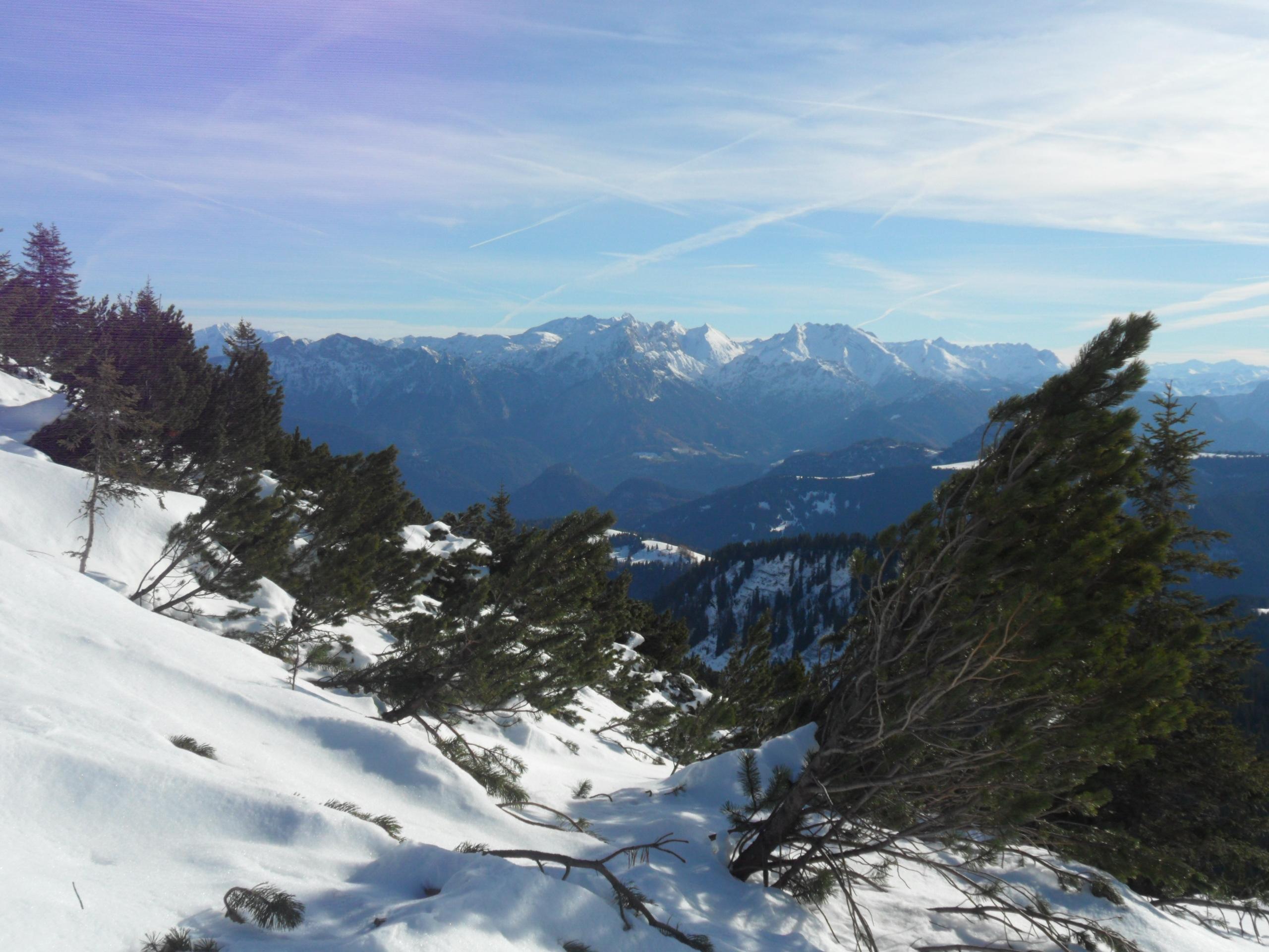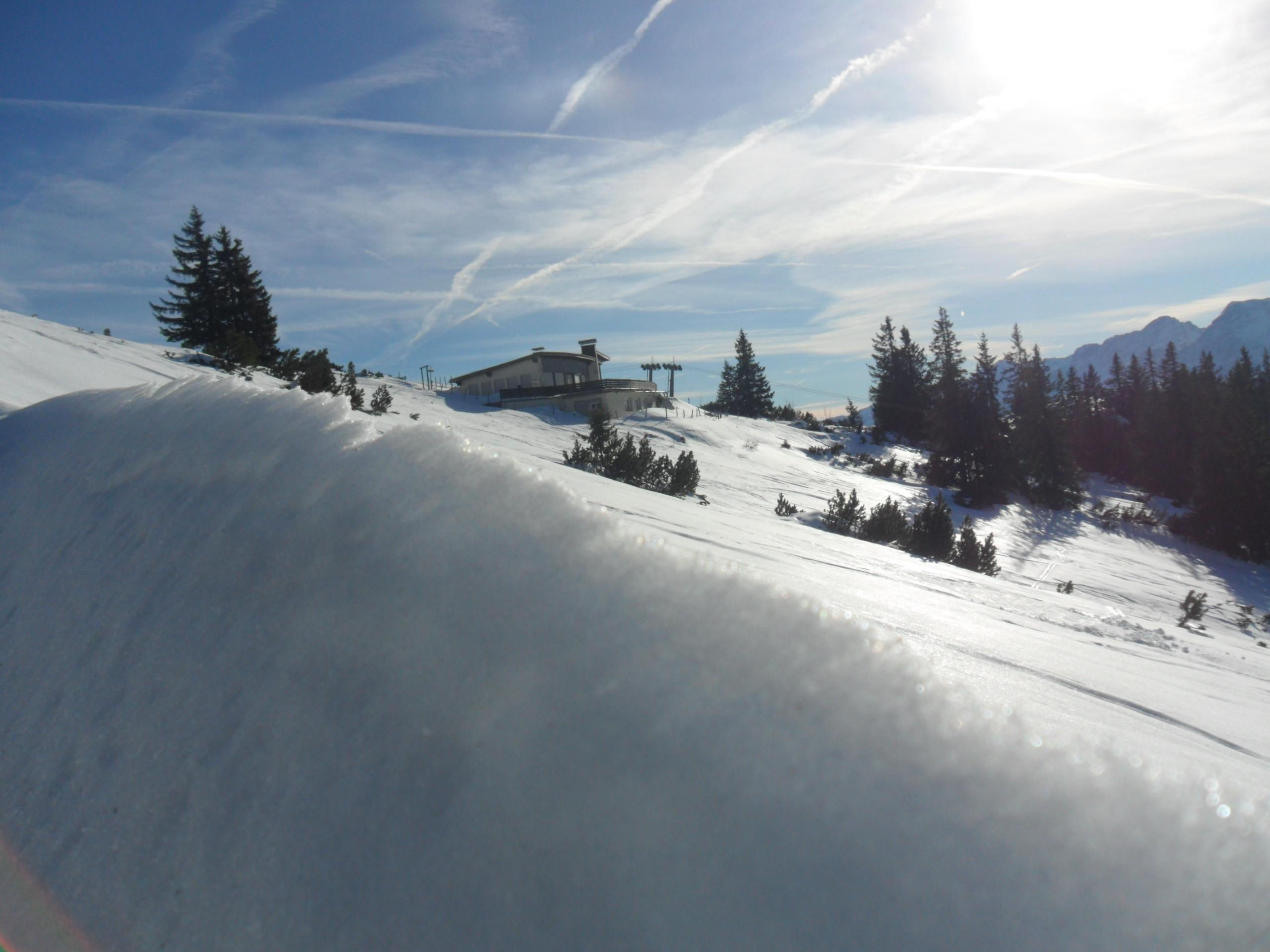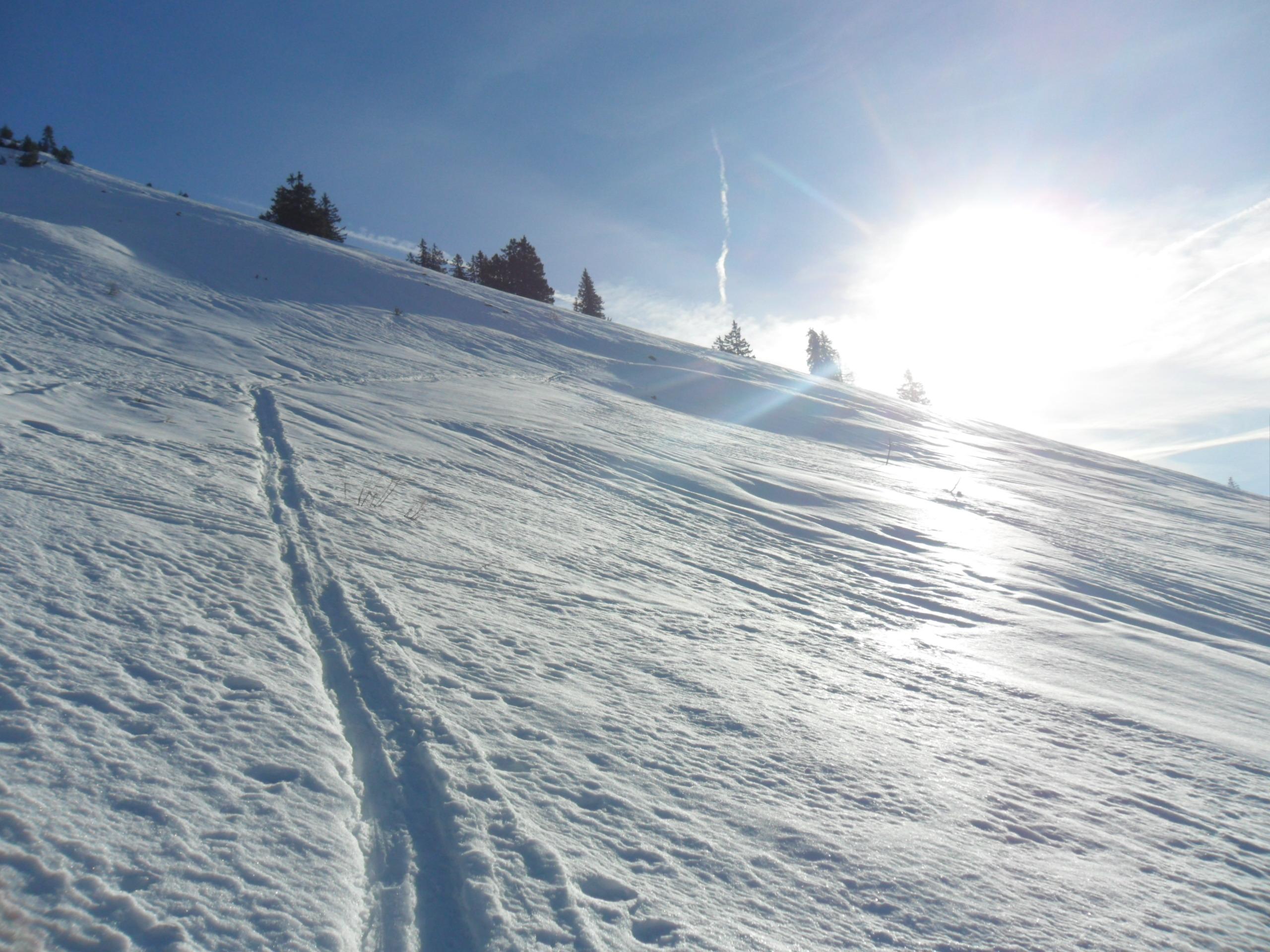 Bei der Abfahrt hatte man je nach Hanglage die Auswahl zwischen Bruchharsch und Firn. Ging besser als erwartet. :-). Die Latschen sind gut überdeckt und man bricht nicht mehr ein.