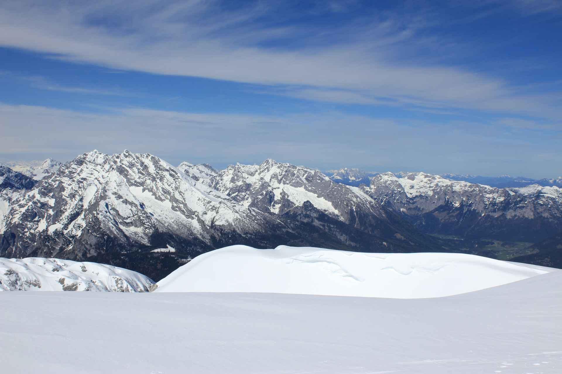 Vom Parkplatz Hinterbrand frührer Start um 7:00 Uhr auf den Hohen Göll. Zur Schneelage: Im unteren Teil des Apeltals konnten die Ski für Mai schon relativ früh angezogen werden. Allerdings sind Harsch Eisen für den unteren Teil empfehlenswert dabei zu haben. Im mittleren Teil des Apeltals kam dann die Sonne hervor und sorgte gleich mal für Wärme und weichere Schneeverhältnisse. Abfahrt ganz OK. Auch das Hohe Brett ist noch machbar.