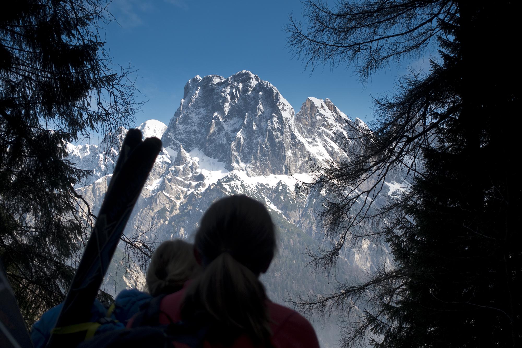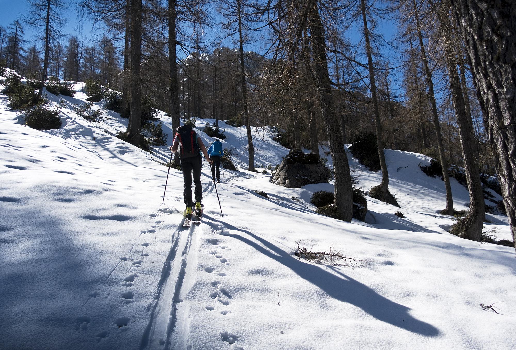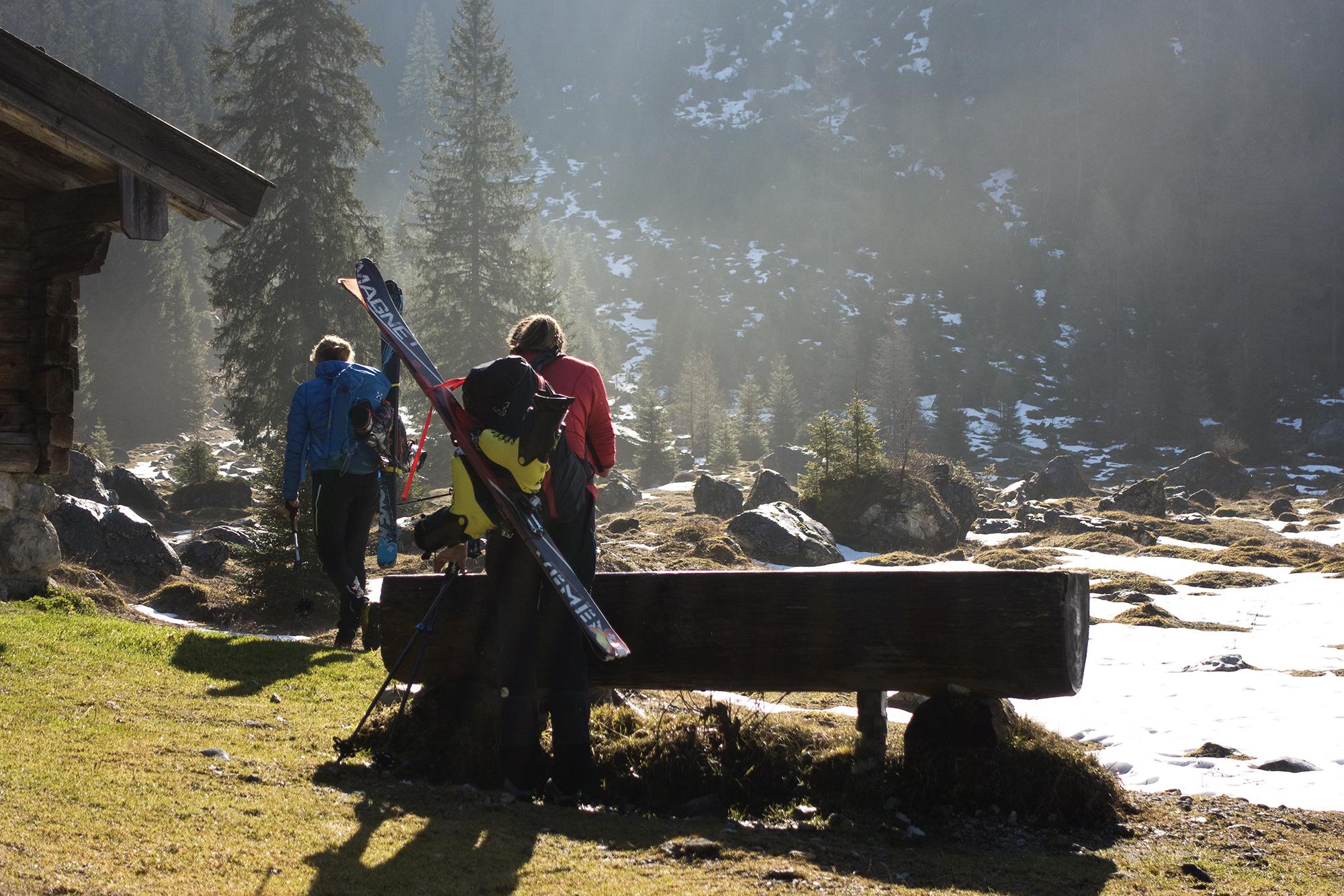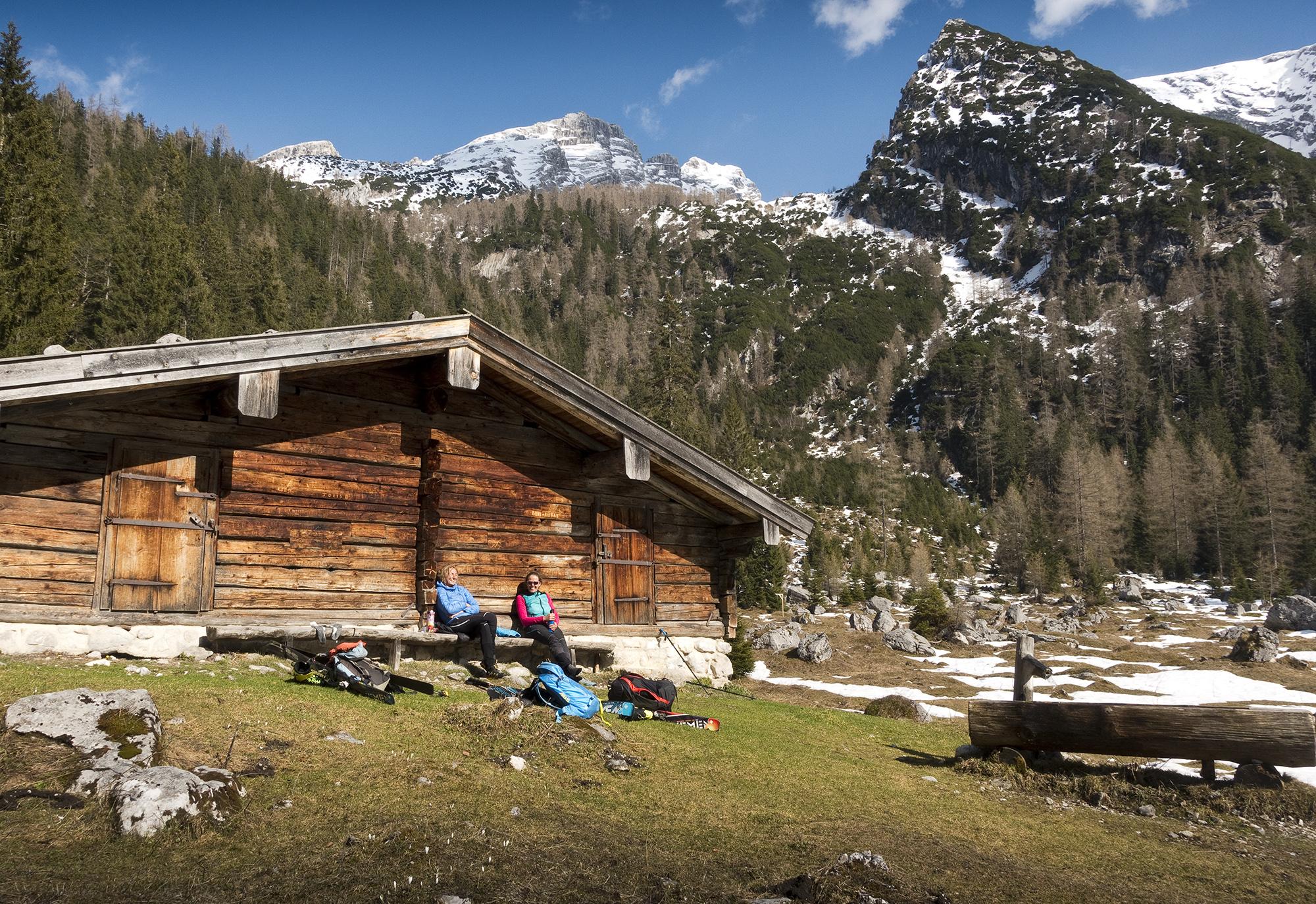 Tatsächlich, es gibt ihn noch, den Winter! An der Hocheisalm kann man die Ski anschnallen, und darüber tut sich eine märchenhafte Winterwelt auf, die den Frühling rund um die Mittereisalm fast vergessen lässt. Fast, - denn der frische Schnee ist feucht, bei der Abfahrt ziemlich bald zäh, und saugt sich am Ski fest.