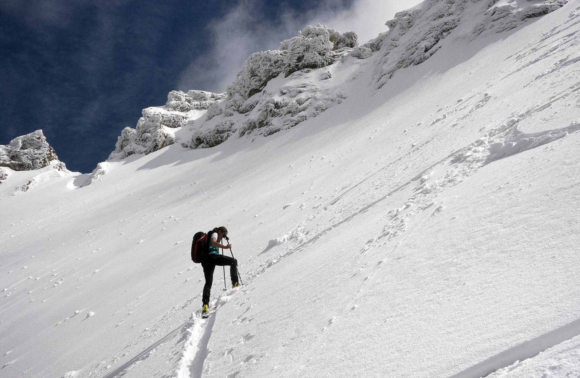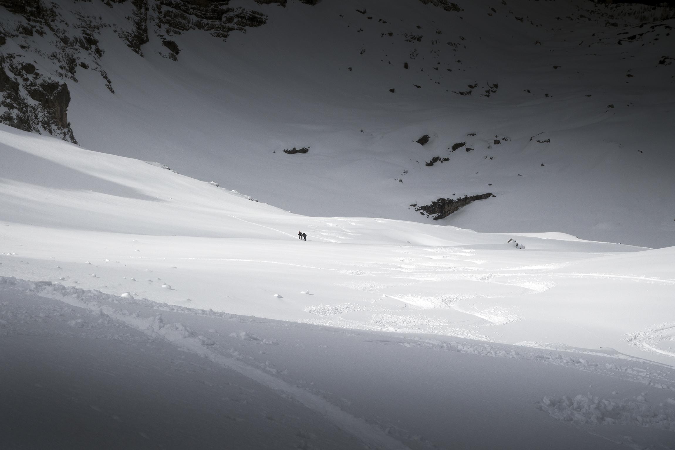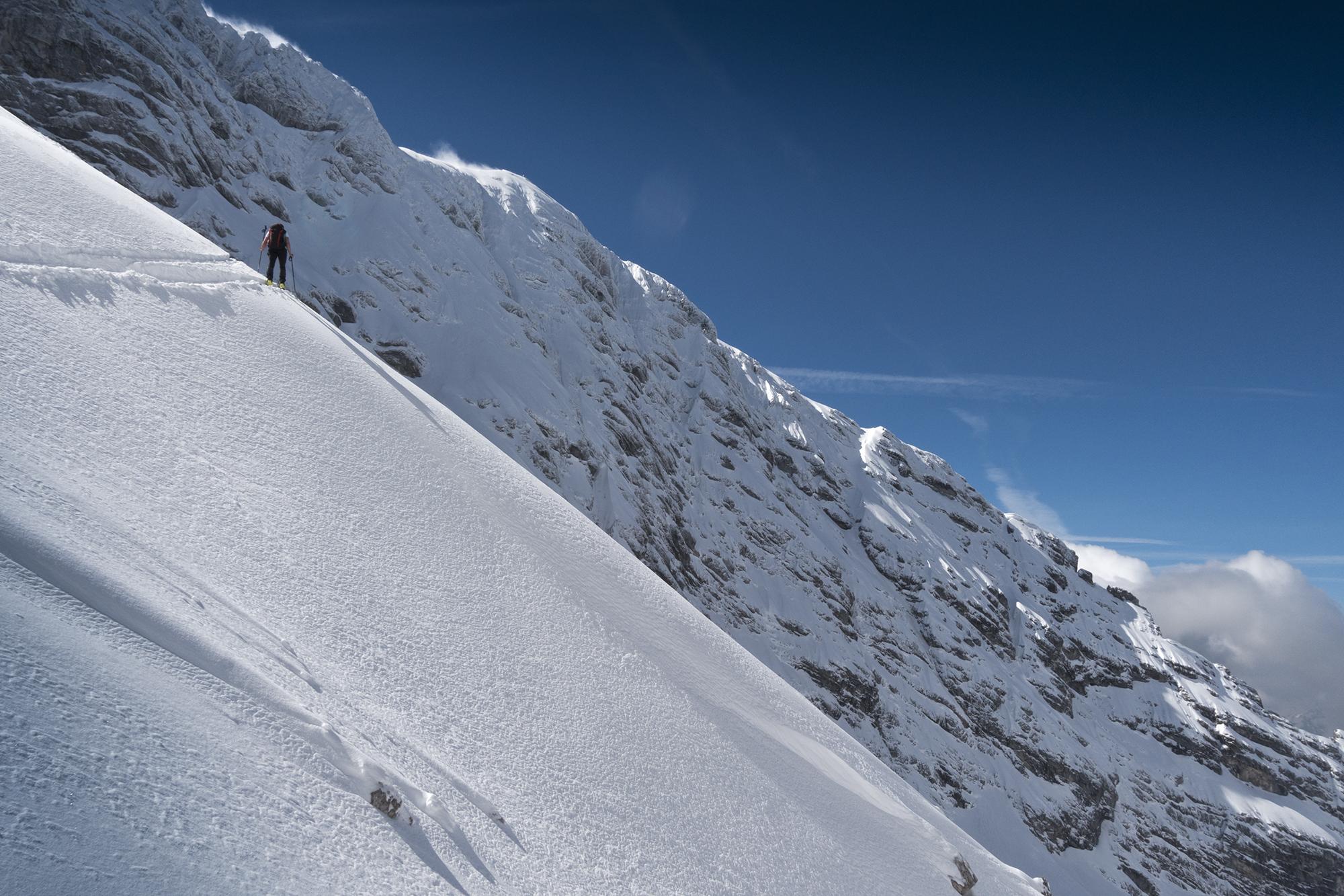 Nur ganz oben haben ein paar Steine unter dem neuen Schnee gelauert, insgesamt ist noch richtig viel im großen Kar vorhanden.
