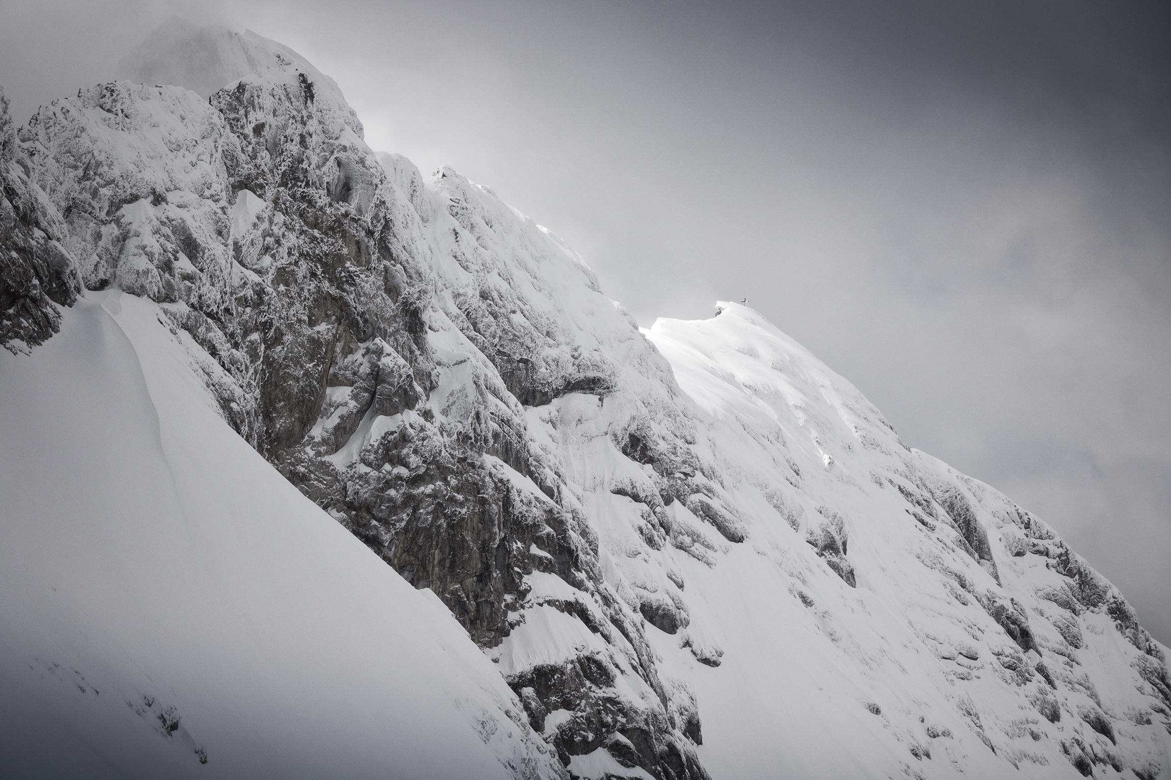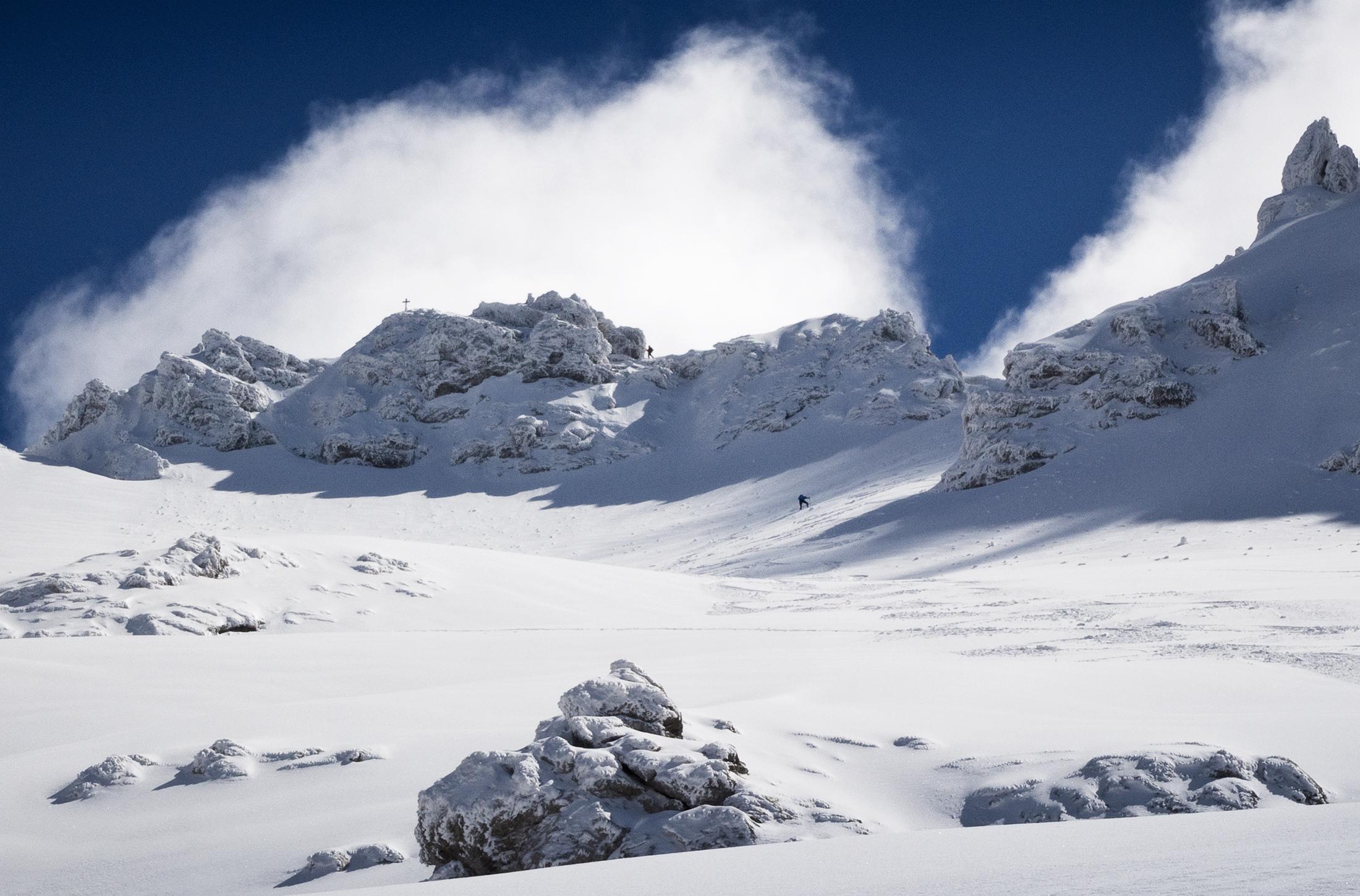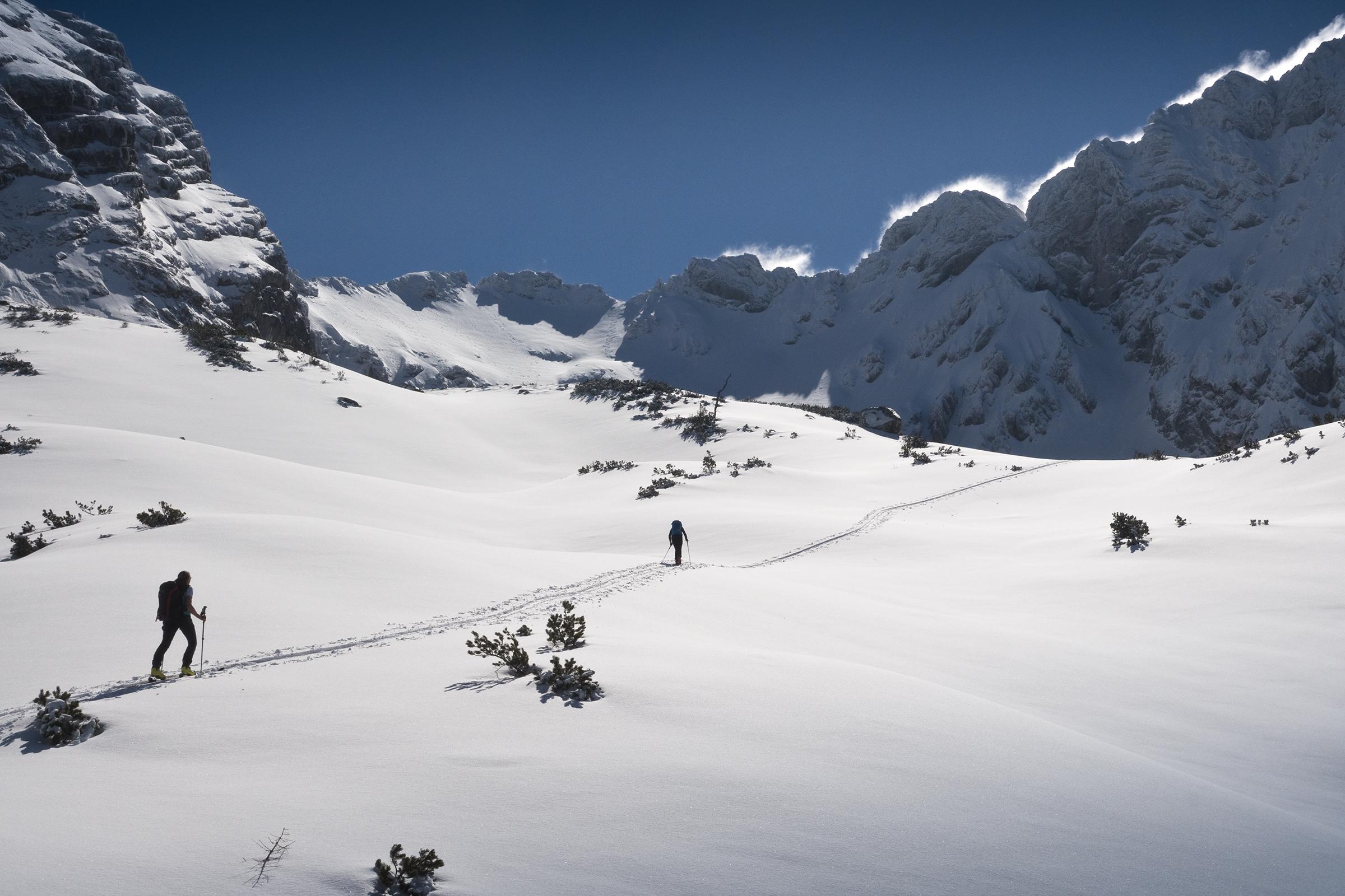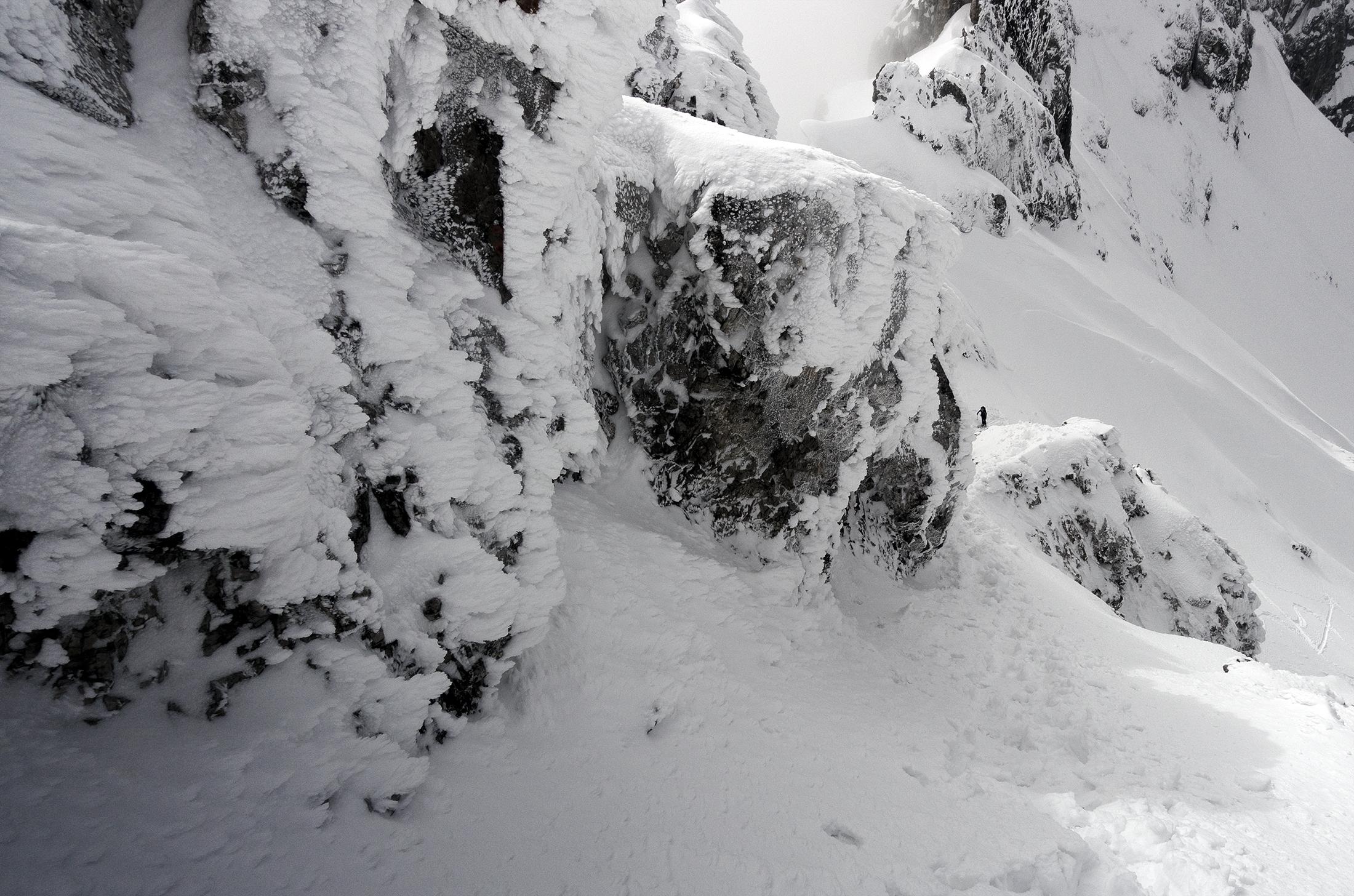 Nur ganz oben haben ein paar Steine unter dem neuen Schnee gelauert, insgesamt ist noch richtig viel im großen Kar vorhanden.
