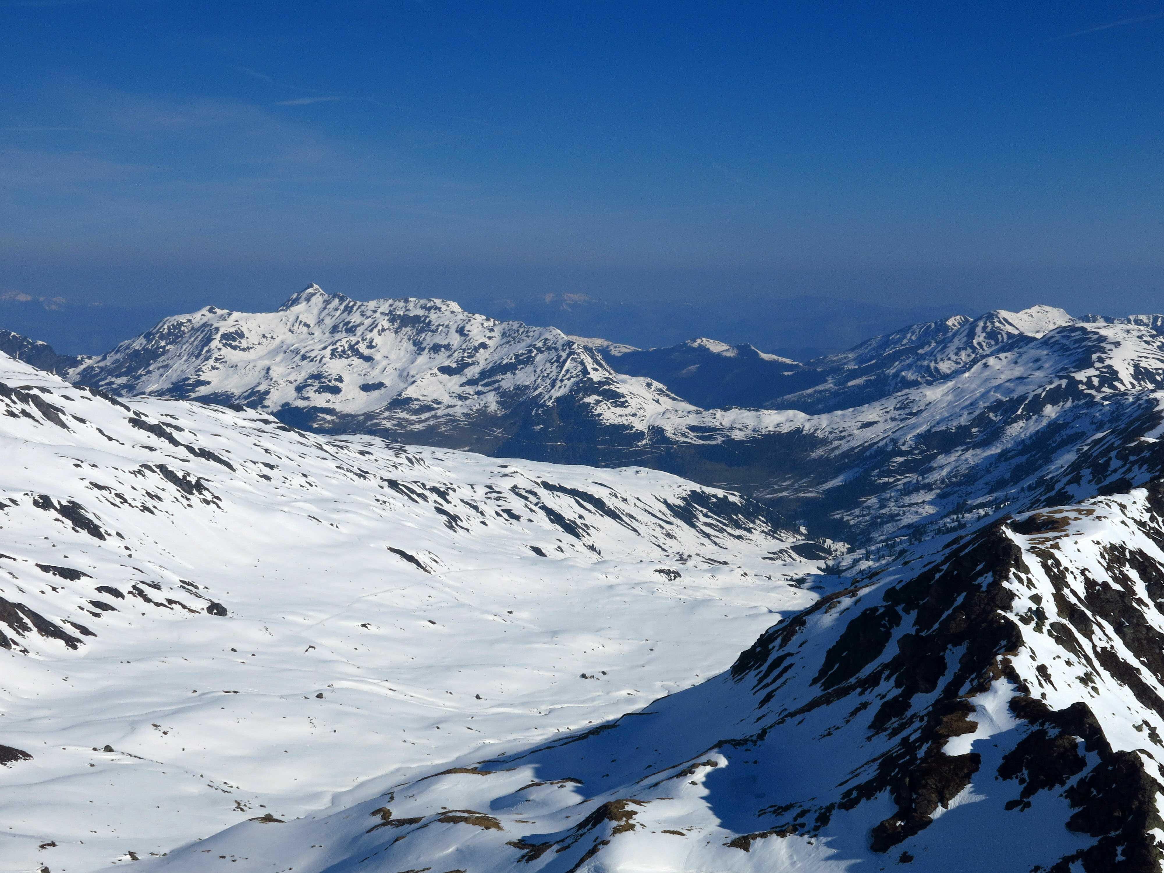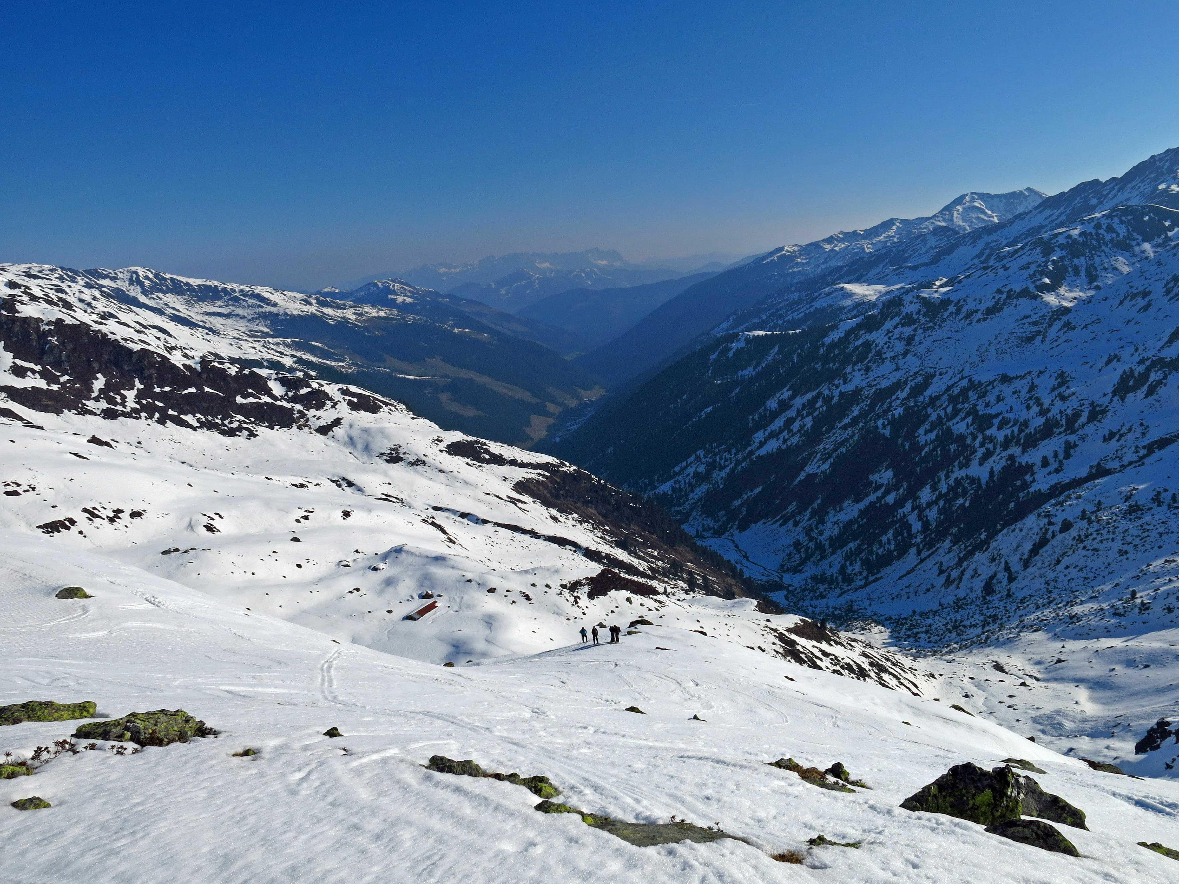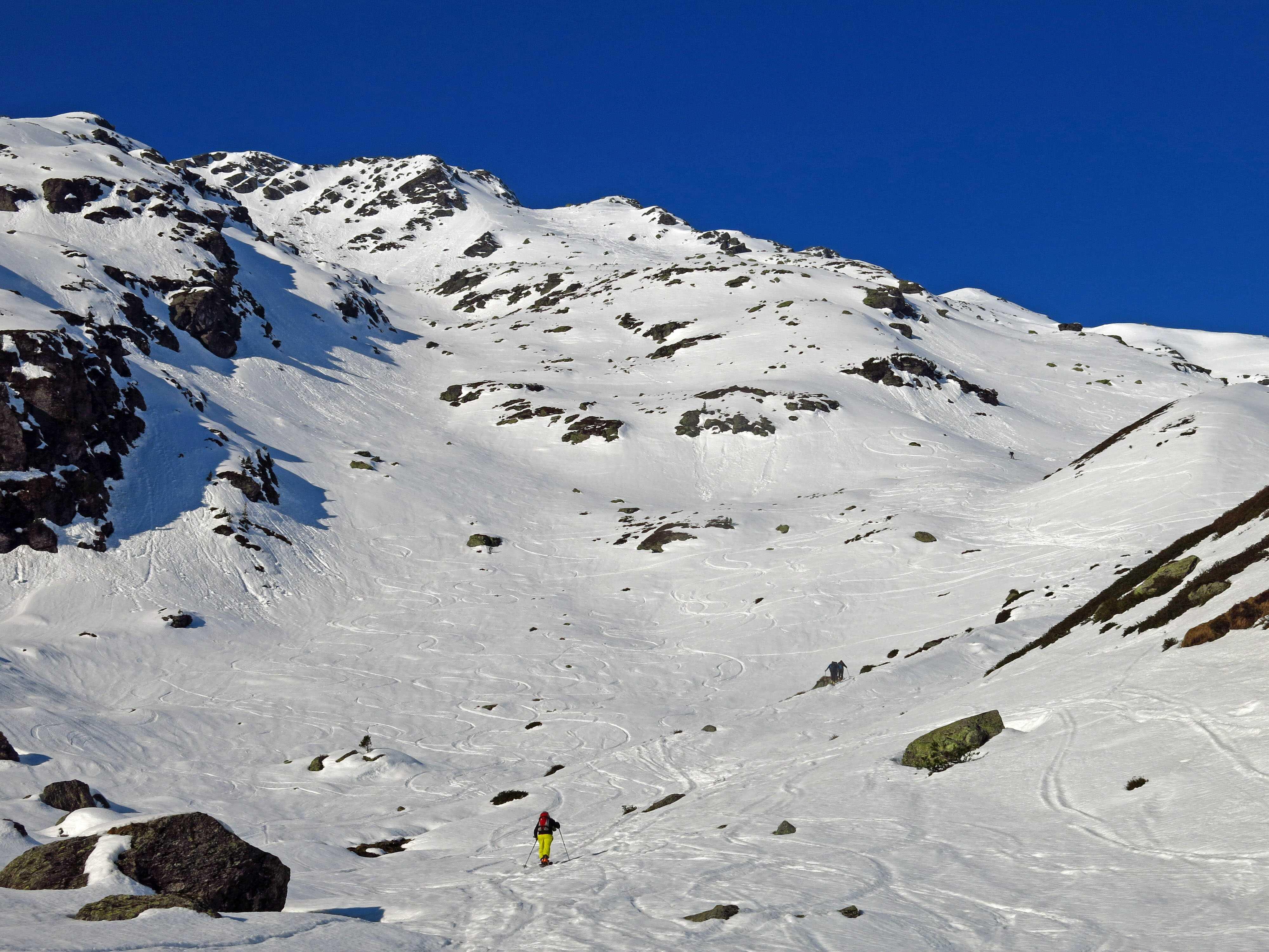 Schneelage: Ski nur ca. 5 Min. getragen, später auf dem Fahrweg nochmals 2 kurze apere Stellen, ansonsten alles noch mit Ski möglich. Hinter der Oberkaralm wirds sonnseitig auf dem Sommerweg nicht mehr lange durchgehend mit Ski gehen (jetzt schon kurze apere Stellen), die Latschen auf der anderen Talseite sind nicht zu. Oberhalb im Kar noch ausreichend, wenn auch nicht üppig Schnee. Abfahrt um ca. 10:15: Oberer Teil im Schatten noch hart, in der Sonne schön firnig. Im unteren Teil brach man zunehmend durch, entsprechend hielt sich hier der Fahrspaß in Grenzen.