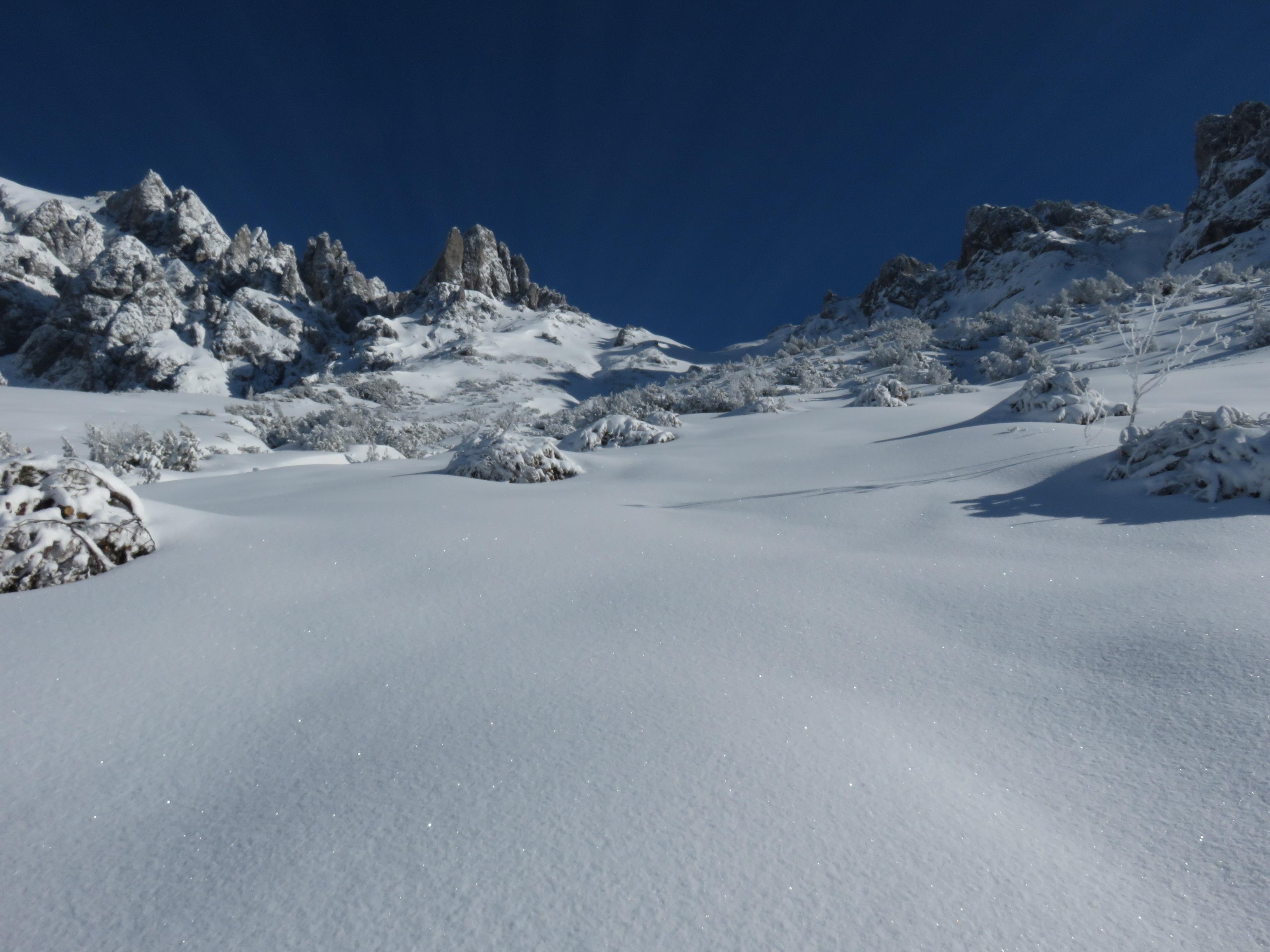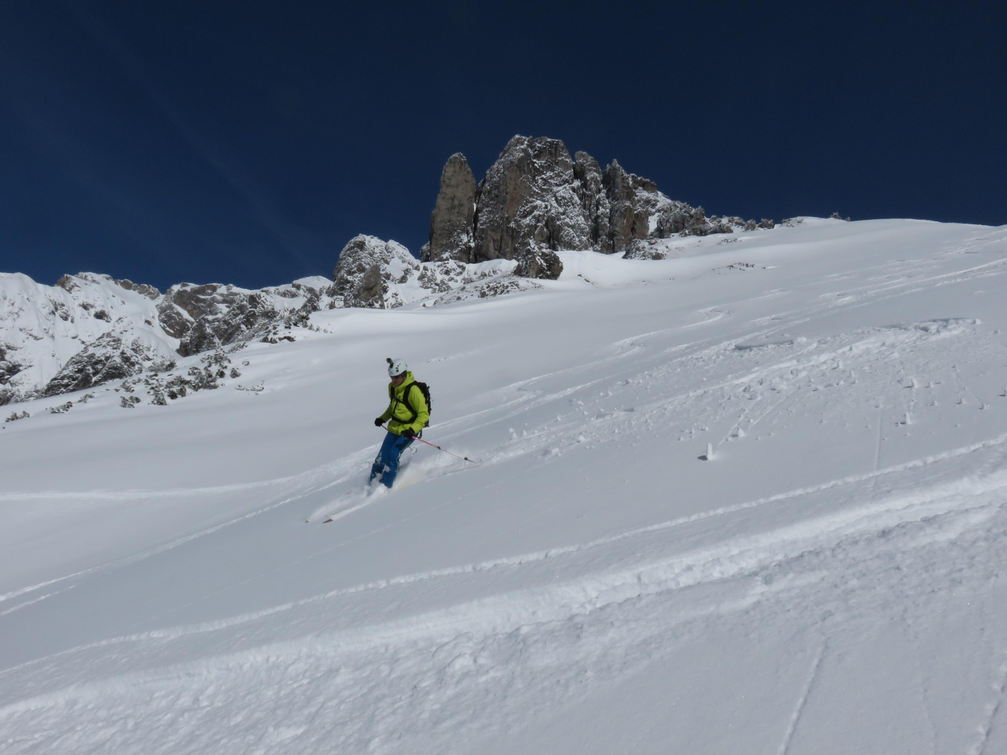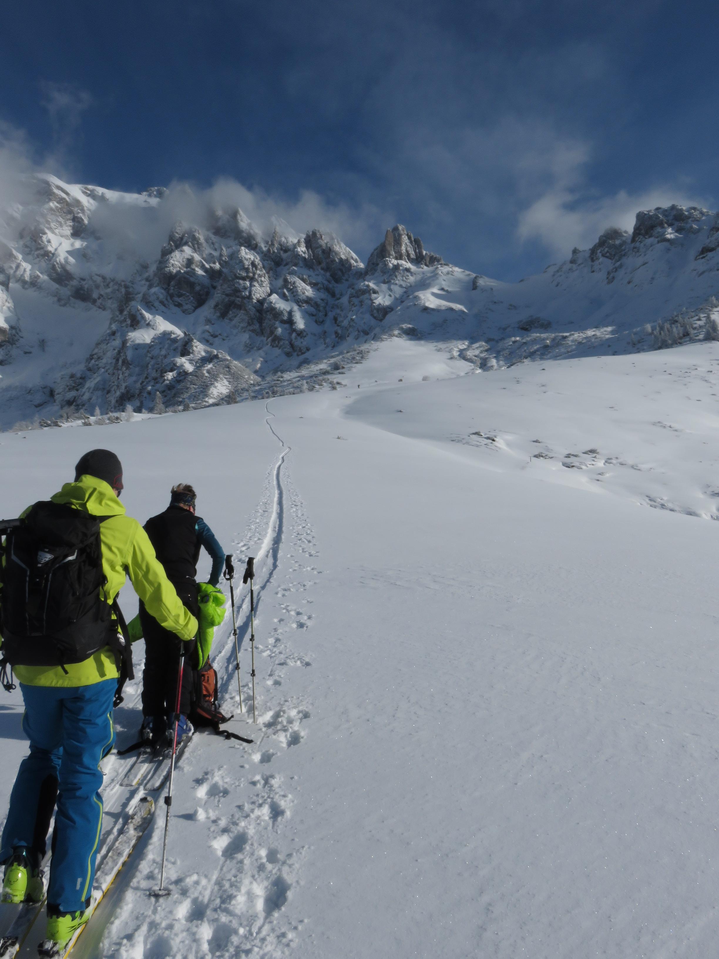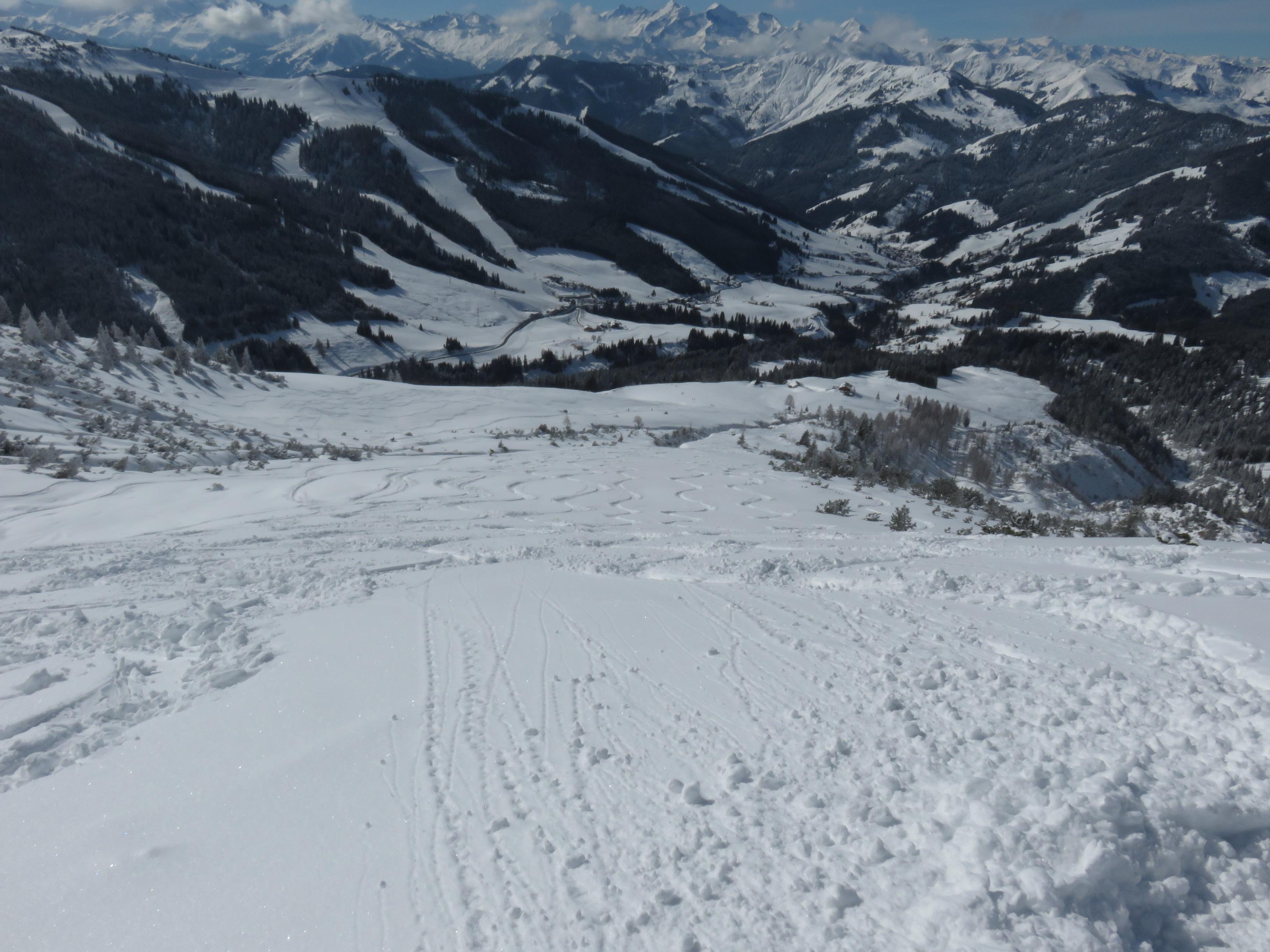 Schnee: 10-15cm Pulver auf festem Untergrund. Am Vormittag wenig Tourengeher unterwegs.