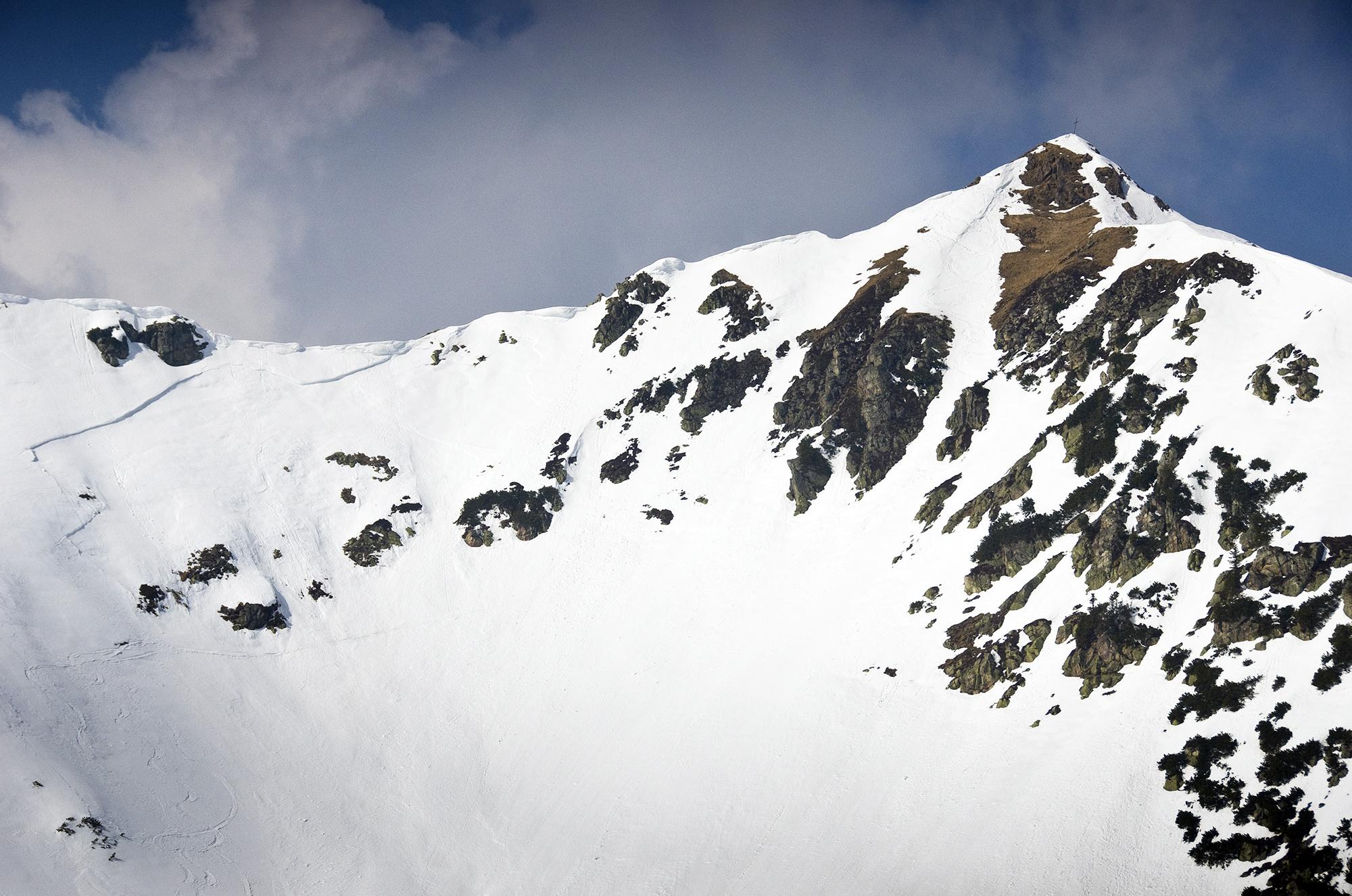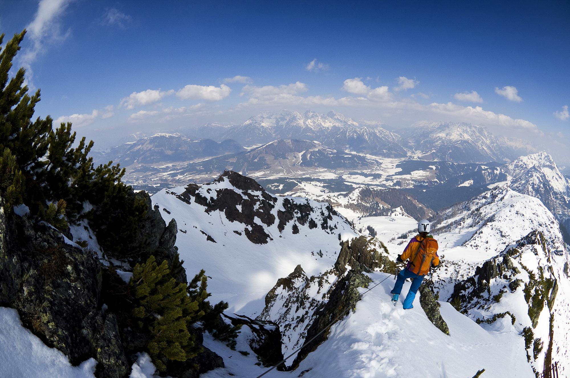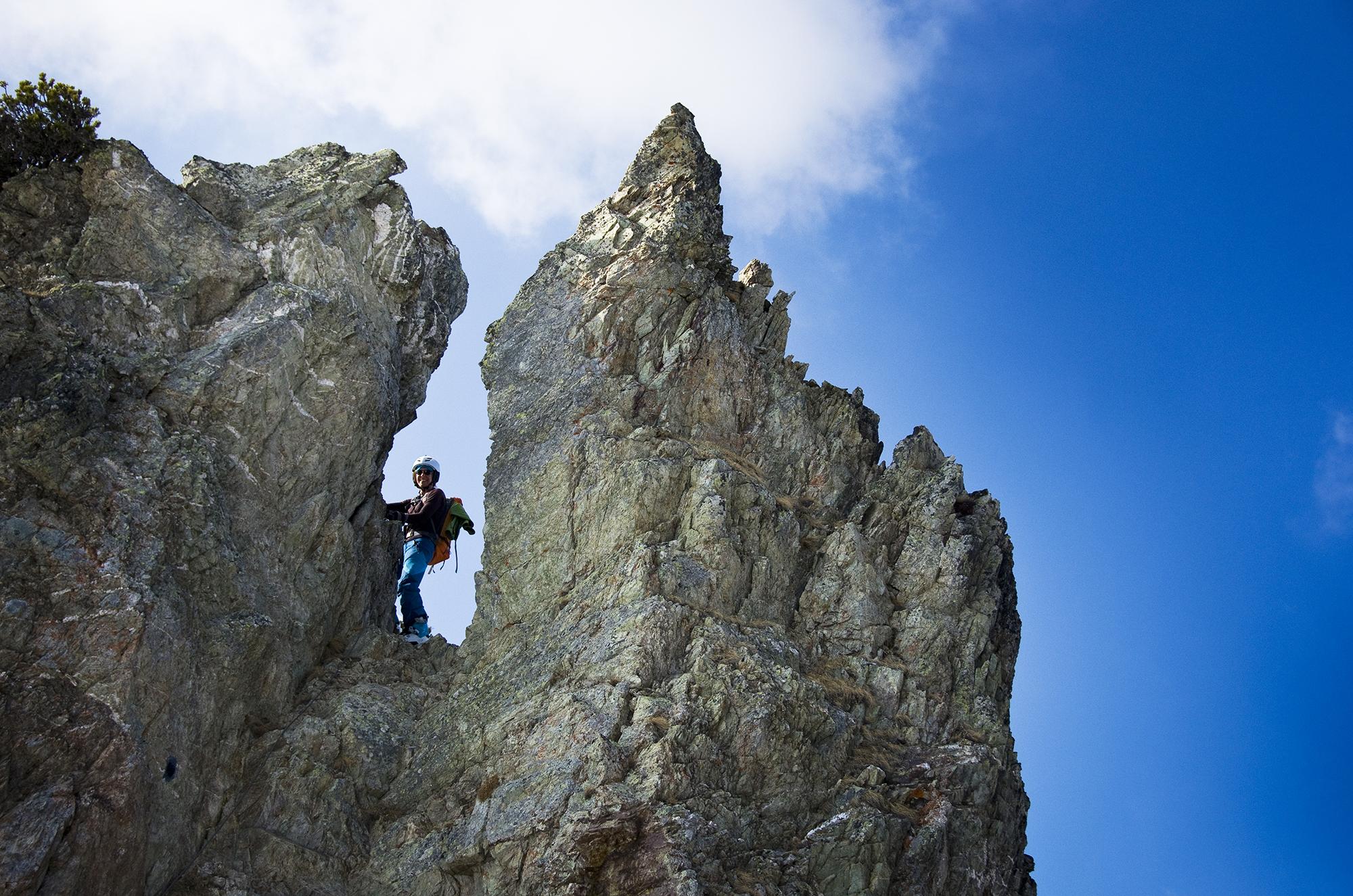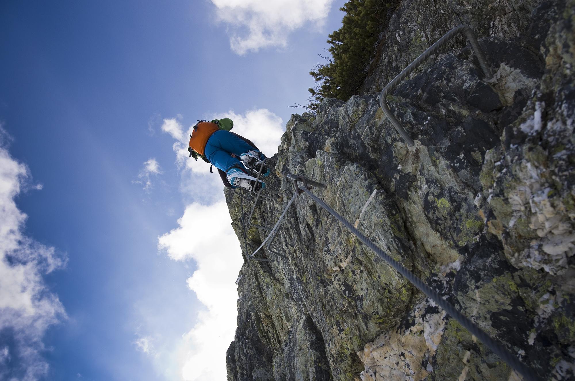 Zunächst wollten wir auf den Wildseeloder, aber da es in der Nacht nicht durchgefroren hatte, - die Skistecken sanken manchmal tief durch! - und wir im steilen Hang dann auch noch auf Schneemäuler trafen, sind wir umgekehrt und mit einigen Firnschwüngen zum See hinab und auf die Henne. Oben angekommen sind wir dann noch den Grat-Klettersteig hinunter und wieder rauf. Weniger Wühlerei als gedacht, die Felspassagen weitgehend schneefrei.
