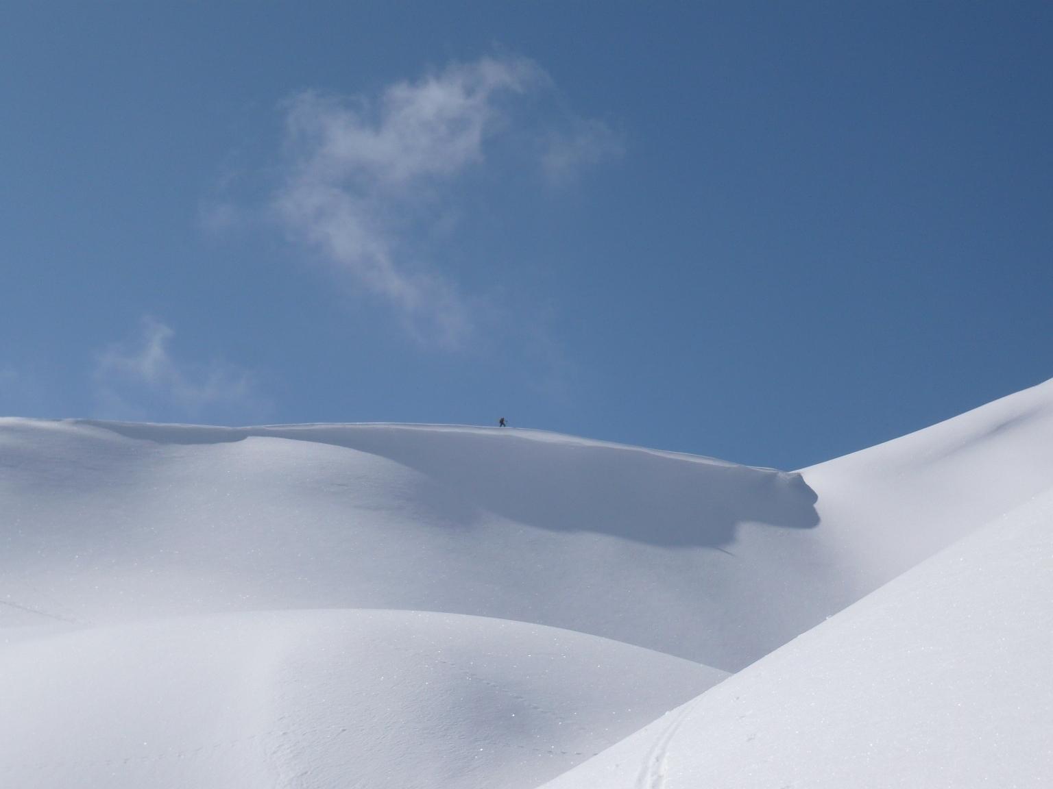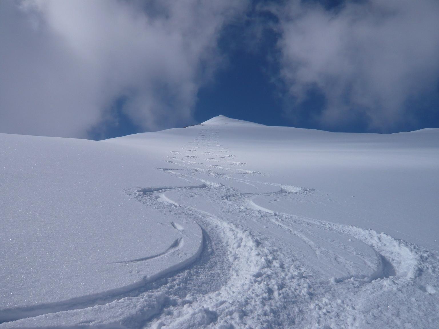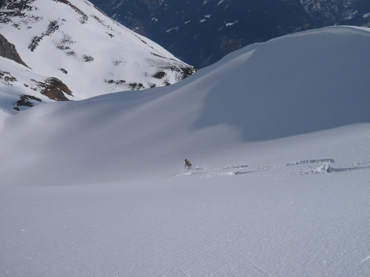 Verhältnisse: Schneeverhältnisse bei entsprechendem Verhalten sehr sicher. Je nach Sonne gesetzter Pulverschnee oder halbwegs tragfähiger, schmieriger Firn. Grenze zwischen beiden zum Teil sehr scharf auf wenigen Zentimetern. Wetter zuerst freundlich, dann gegen Mittag auffrischender bis stürmischer Wind aus Süden, wo der Alpenhauptkamm von der Früh weg in einer Wolkenmauer steckte.