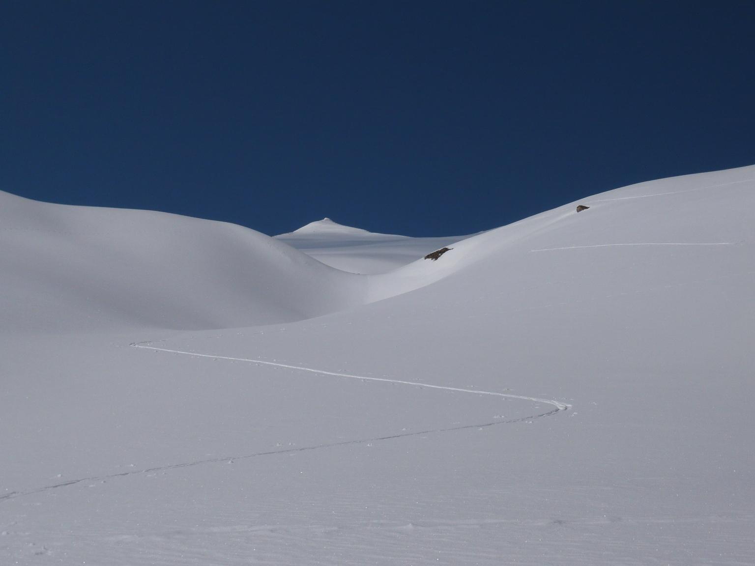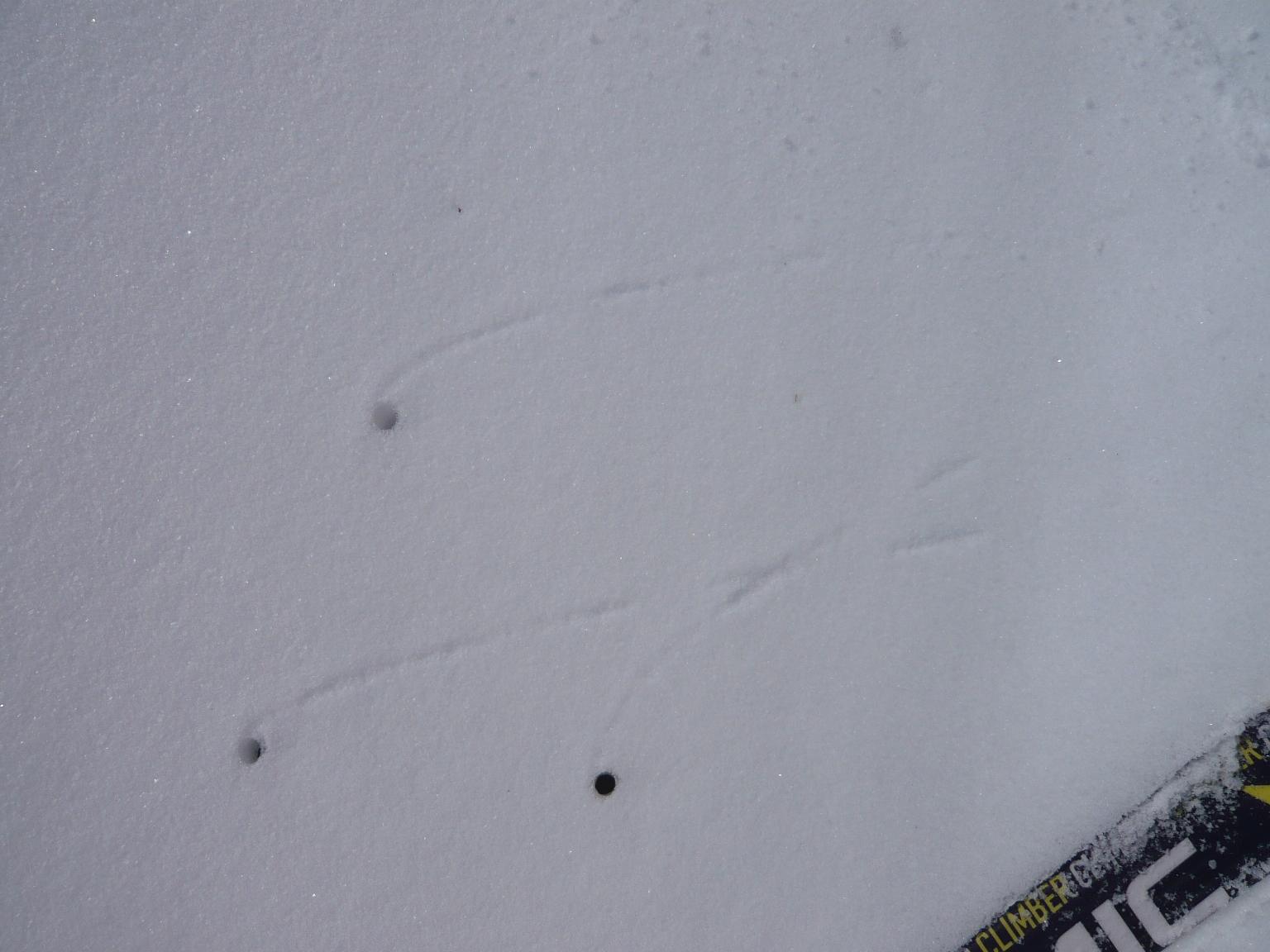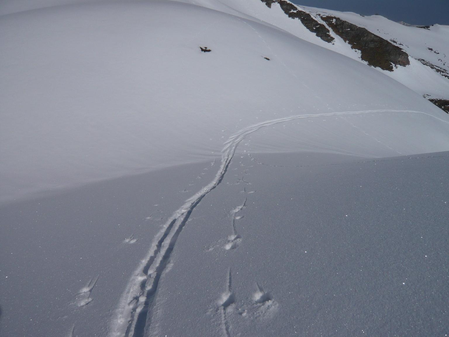 Verhältnisse: Schneeverhältnisse bei entsprechendem Verhalten sehr sicher. Je nach Sonne gesetzter Pulverschnee oder halbwegs tragfähiger, schmieriger Firn. Grenze zwischen beiden zum Teil sehr scharf auf wenigen Zentimetern. Wetter zuerst freundlich, dann gegen Mittag auffrischender bis stürmischer Wind aus Süden, wo der Alpenhauptkamm von der Früh weg in einer Wolkenmauer steckte.