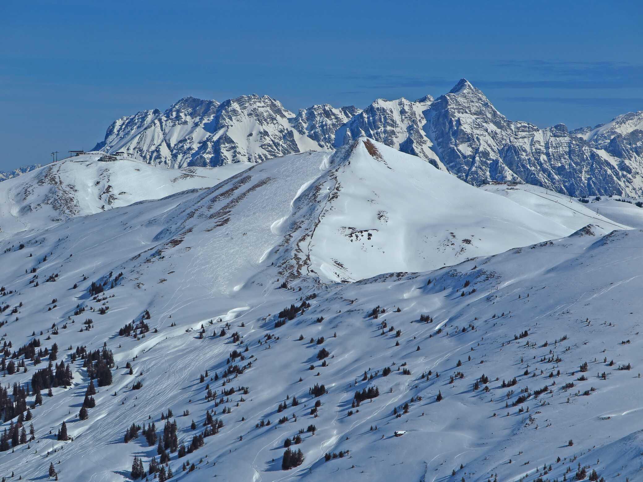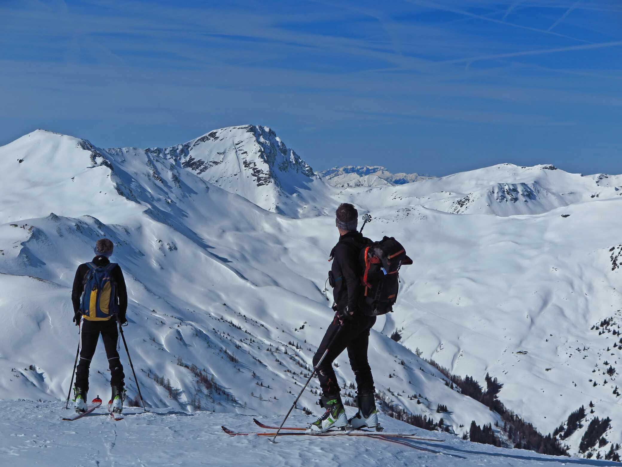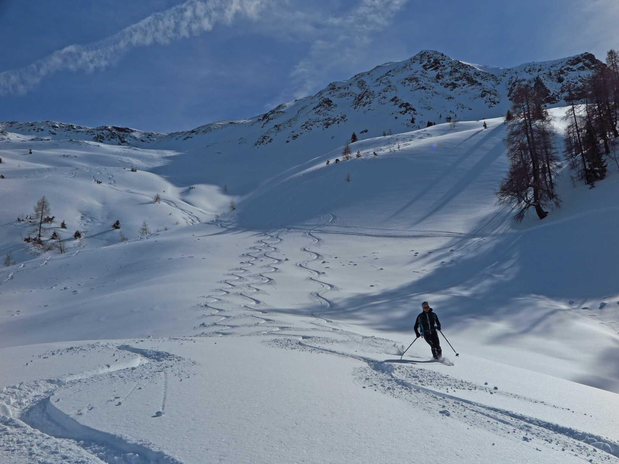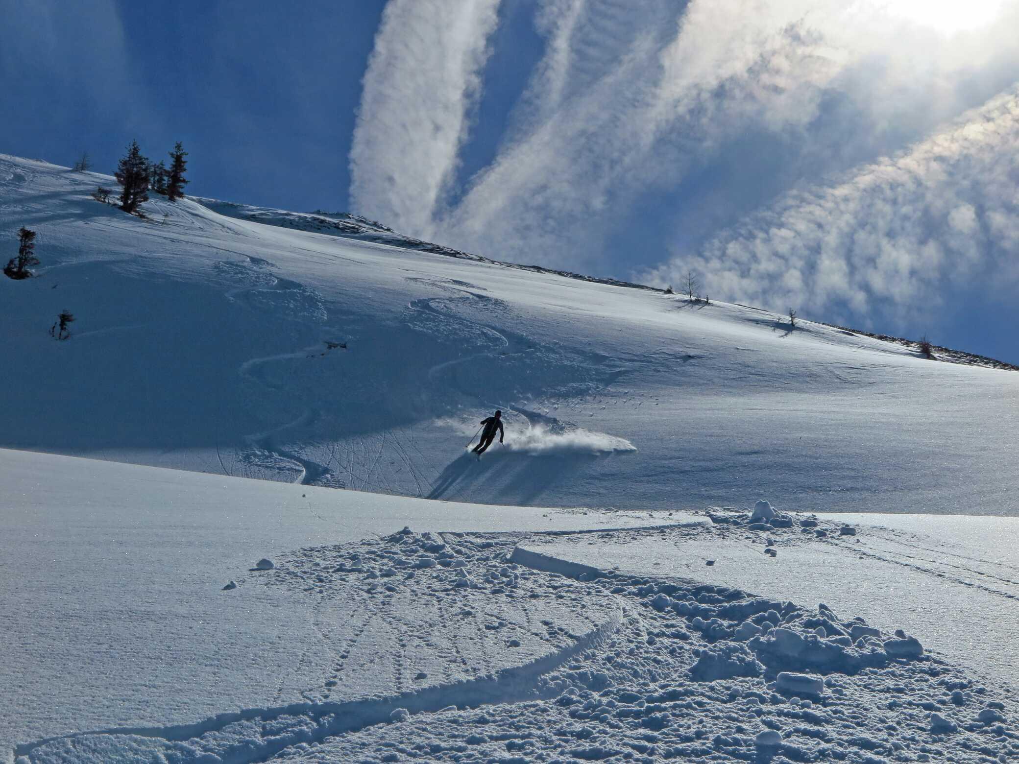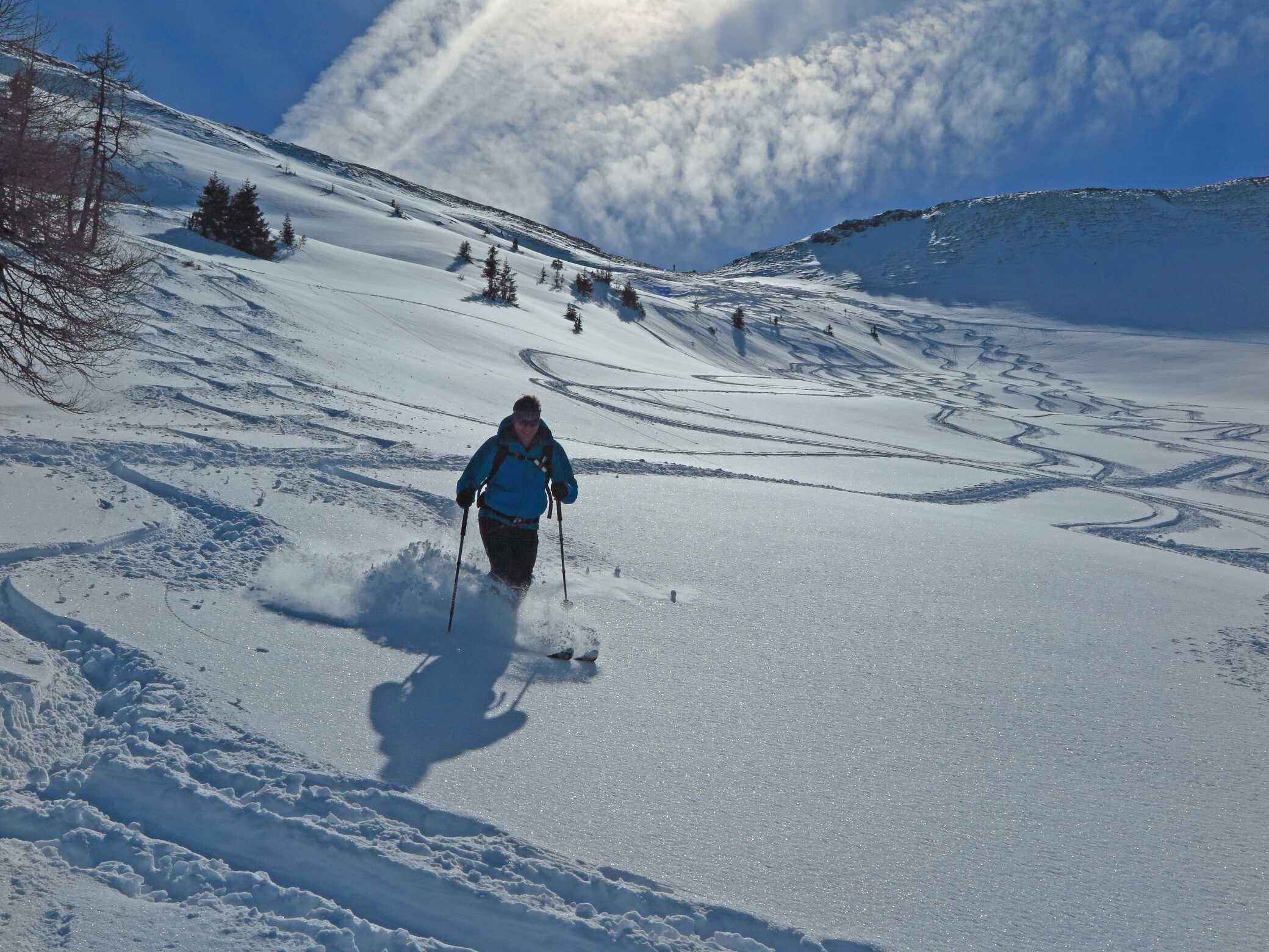 Schneelage: Ca. 20 - 30cm Pulverauflage (schattseitig), sonnenbeeinflusste W-Hänge am frühen Vormittag noch mit einer leichten Kruste. Gipfelregionen und Grate stark abgeblasen, auch in den Hängen Windeinfluss der vergangenen Woche sichtbar. Untergrund manchmal recht ungleichmäßig. Abfahrten in den Schattenhängen in sehr schönem Pulverschnee. Auch S-seitig waren schöne Spuren im Pappschnee zu sehen.
