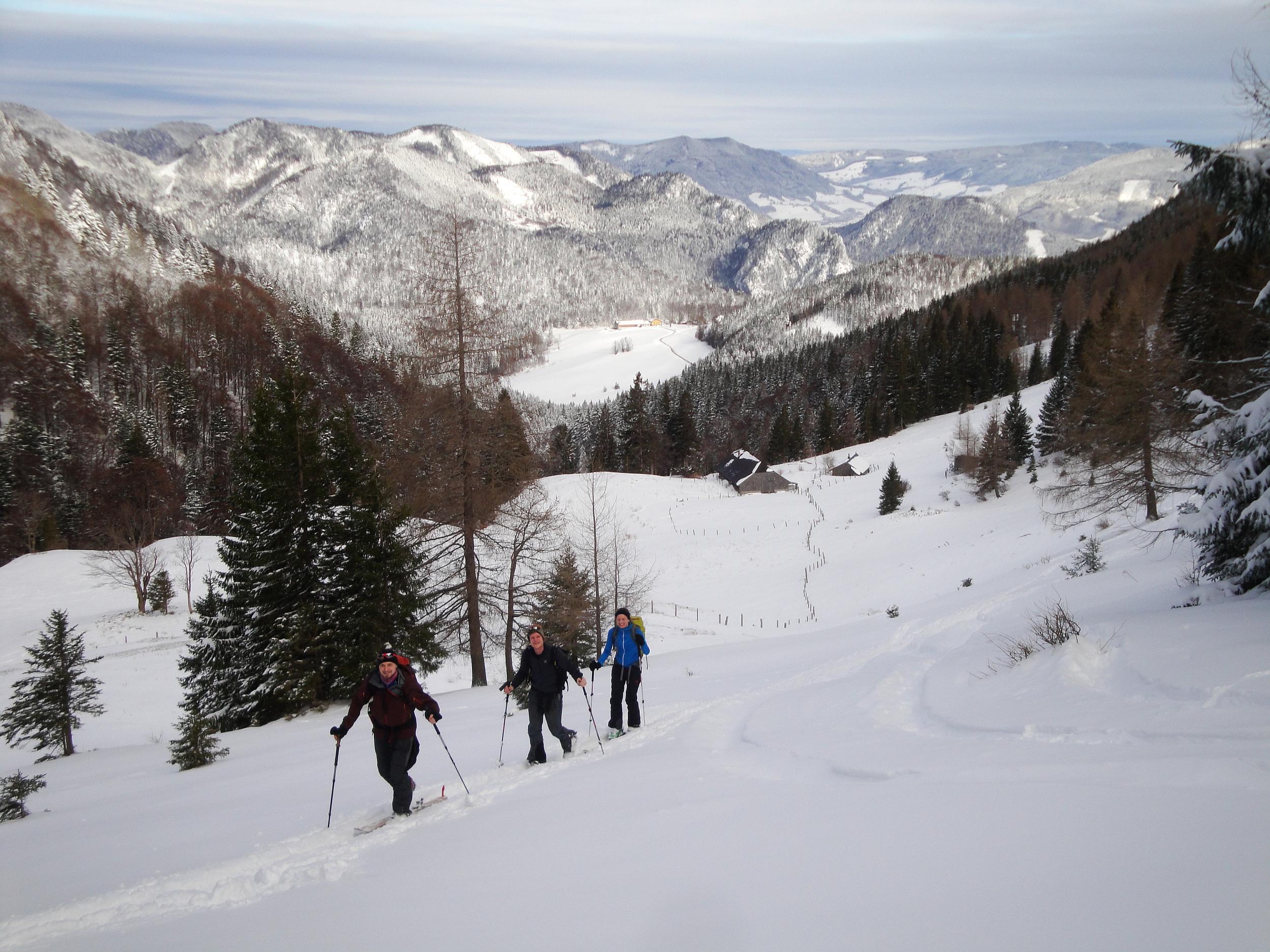 Der Anstieg auf das Zwölferhorn von der Tiefbrunnau ist mehr als beliebt. Wählt man jedoch die Route über die Mehlsackalm wird man nur wenige Schitourengeher antreffen.