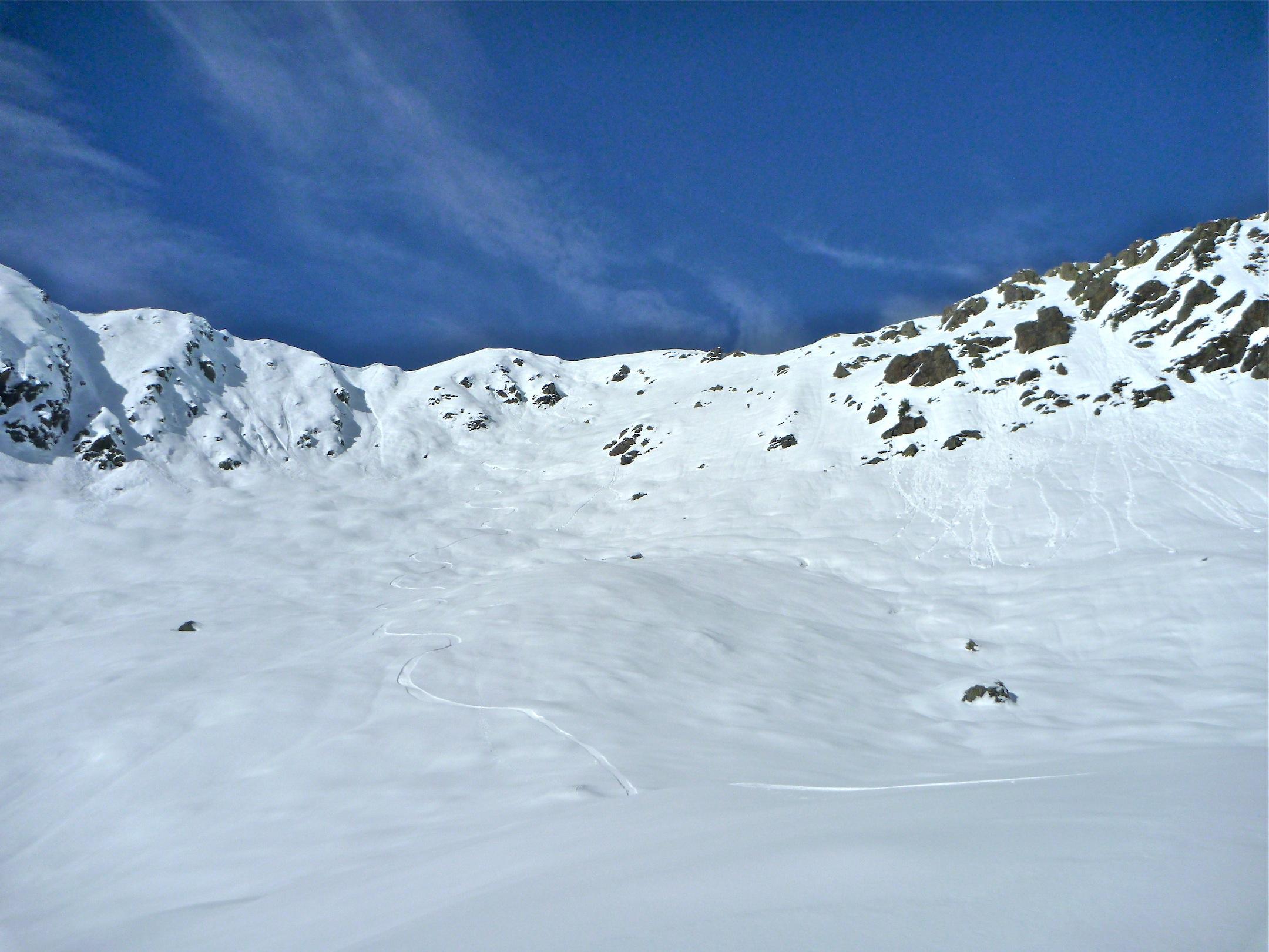 Schnee: vormittags guter Harschdeckel von unten bis oben, nachmittags oben soft unten sehr nass, 200hm oberhalb Farnkaseralm dauerhaft tief und nass