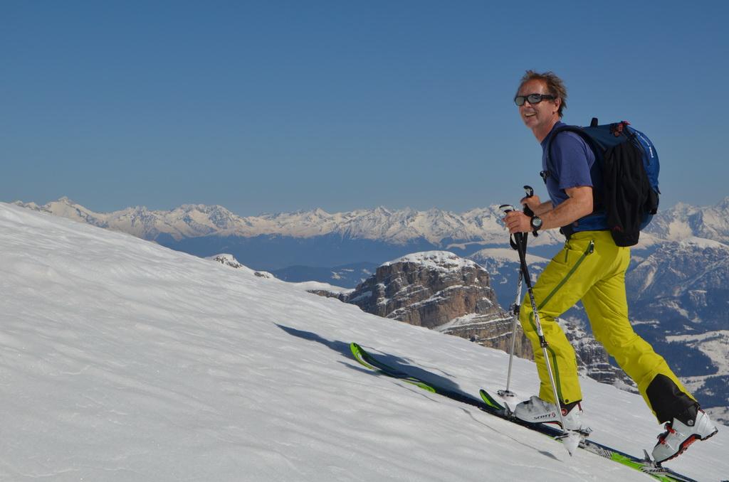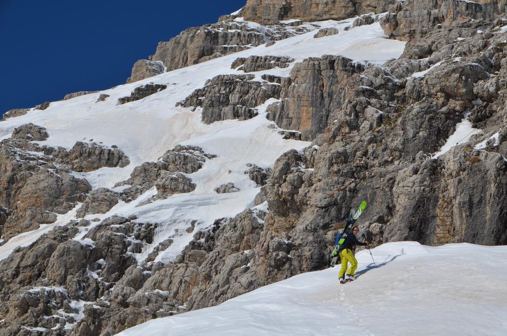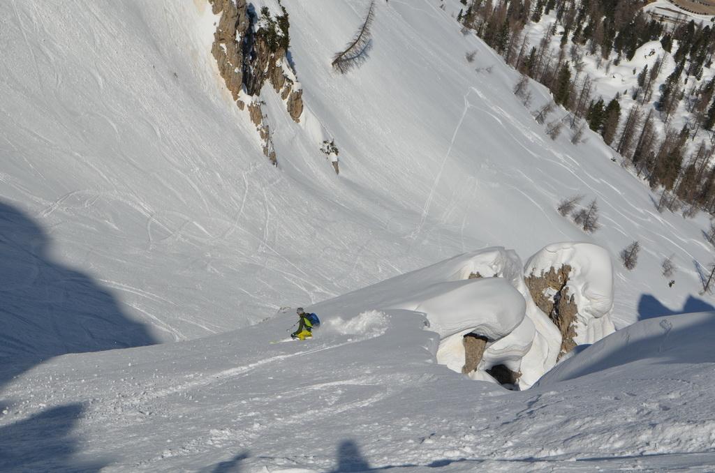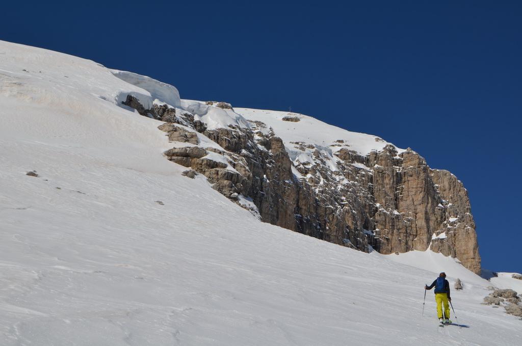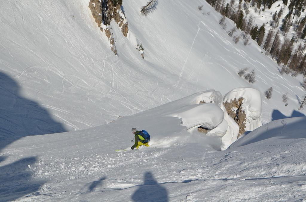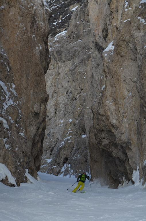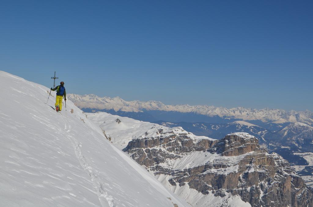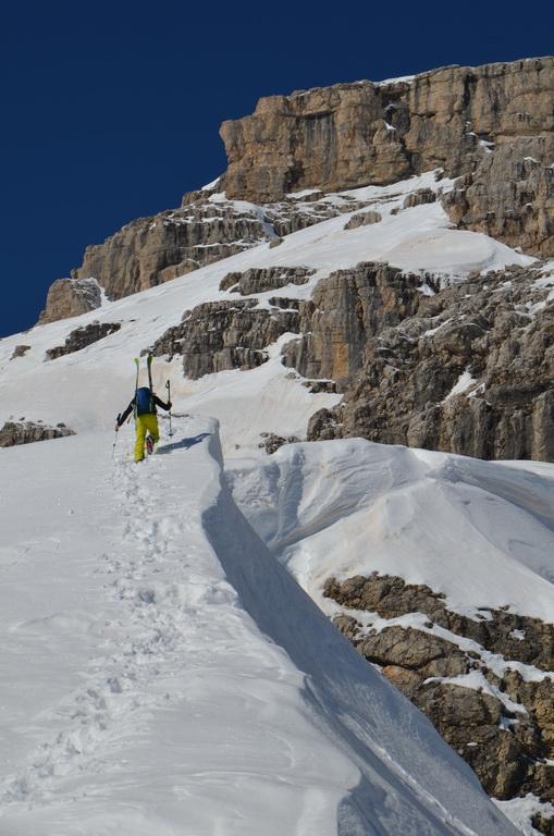 Wenn man rechtzeitig unterwegs ist herrschen zur Zeit wirklich gute und sichere Bedingungen in den Dolomiten. Auch heute haben wir uns unsere Tour mit Lifthilfe etwas erleichtert. Der Aufstieg ist zum größten Teil ostseitig und war bei uns wirklich gut zum Stapfen bzw. weiter oben zum gehen. Allerdings befinden sich dort auch einige steile Aufschwünge und man sollte bei diesen Temperaturen und der jetzigen Sonneneinstrahlung zeitig unterwegs sein. Am kurzen Klettersteig haben wir uns entschieden die Steigeisen anzuziehen und ein paar kurze eisige Stellen waren daher auch rasch überwunden. Wir haben es wirklich perfekt erwischt, aufgrund der guten Schneelage konnte man direkt vom Gipfel abfahren wobei diese Gipfelflanke mit super Firnverhältnissen aufwartete. Der vorwiegend nordseitige Mittelteil war noch einmal eine Herausforderung in Bezug auf die Wahl der Abfahrtslinie, da diese von oben nicht einsehbar war. Hier wurden wir mit super Pulver belohnt was sich auch hinunter durch das Val de Litres so fortsetzte. Ab einer Höhe von ca. 1800m wurde der Schnee dann zunehmend feuchter und die letzten Meter in Richtung Corvara waren dann echt mühsam. WIr haben dann noch einen kurzen Abstecher zum Passo Pordoi gemacht um den Canale Holzer zu fahren. Dieser ist zur Zeit wirklich leicht zu fahren und gleicht im oberen Teil schon eher einer steilen Buckelpiste. Die Abseilpiste ist komplett eingeschneit und man kann die Rinne problemlos durchfahren