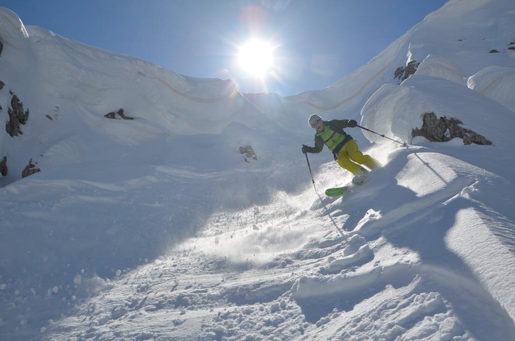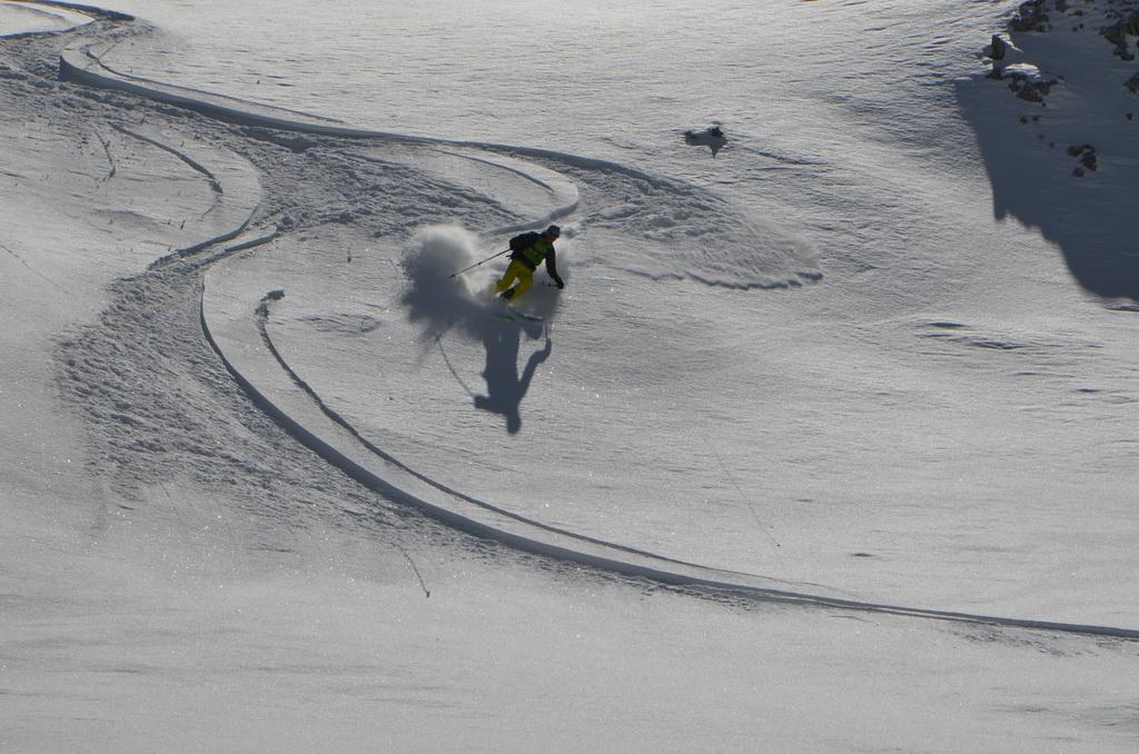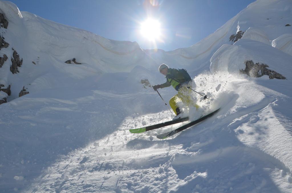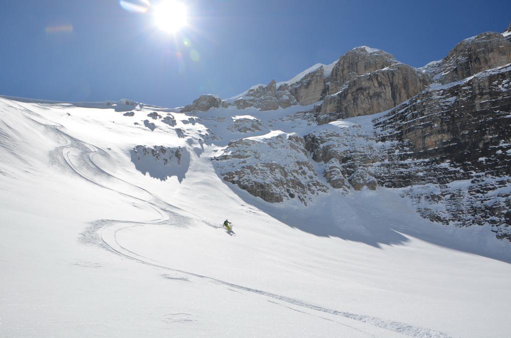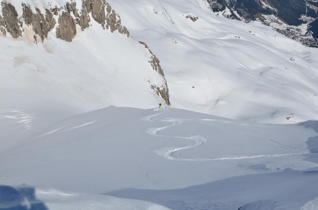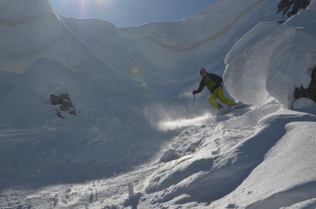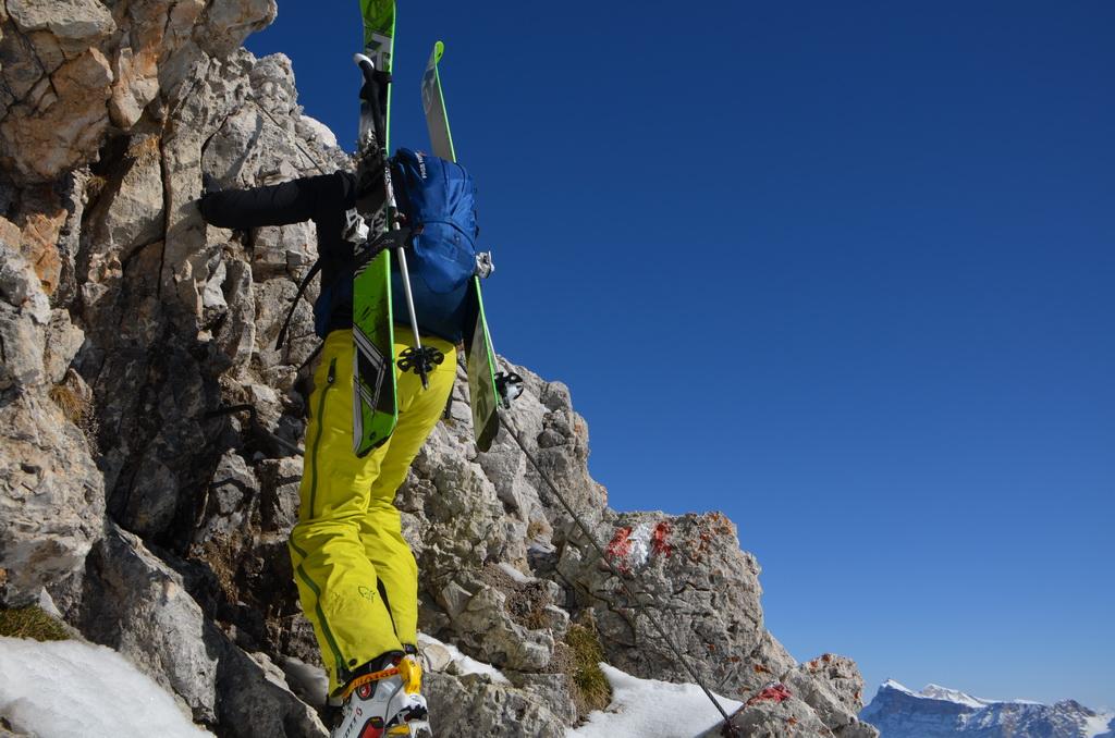 Wenn man rechtzeitig unterwegs ist herrschen zur Zeit wirklich gute und sichere Bedingungen in den Dolomiten. Auch heute haben wir uns unsere Tour mit Lifthilfe etwas erleichtert. Der Aufstieg ist zum größten Teil ostseitig und war bei uns wirklich gut zum Stapfen bzw. weiter oben zum gehen. Allerdings befinden sich dort auch einige steile Aufschwünge und man sollte bei diesen Temperaturen und der jetzigen Sonneneinstrahlung zeitig unterwegs sein. Am kurzen Klettersteig haben wir uns entschieden die Steigeisen anzuziehen und ein paar kurze eisige Stellen waren daher auch rasch überwunden. Wir haben es wirklich perfekt erwischt, aufgrund der guten Schneelage konnte man direkt vom Gipfel abfahren wobei diese Gipfelflanke mit super Firnverhältnissen aufwartete. Der vorwiegend nordseitige Mittelteil war noch einmal eine Herausforderung in Bezug auf die Wahl der Abfahrtslinie, da diese von oben nicht einsehbar war. Hier wurden wir mit super Pulver belohnt was sich auch hinunter durch das Val de Litres so fortsetzte. Ab einer Höhe von ca. 1800m wurde der Schnee dann zunehmend feuchter und die letzten Meter in Richtung Corvara waren dann echt mühsam. WIr haben dann noch einen kurzen Abstecher zum Passo Pordoi gemacht um den Canale Holzer zu fahren. Dieser ist zur Zeit wirklich leicht zu fahren und gleicht im oberen Teil schon eher einer steilen Buckelpiste. Die Abseilpiste ist komplett eingeschneit und man kann die Rinne problemlos durchfahren
