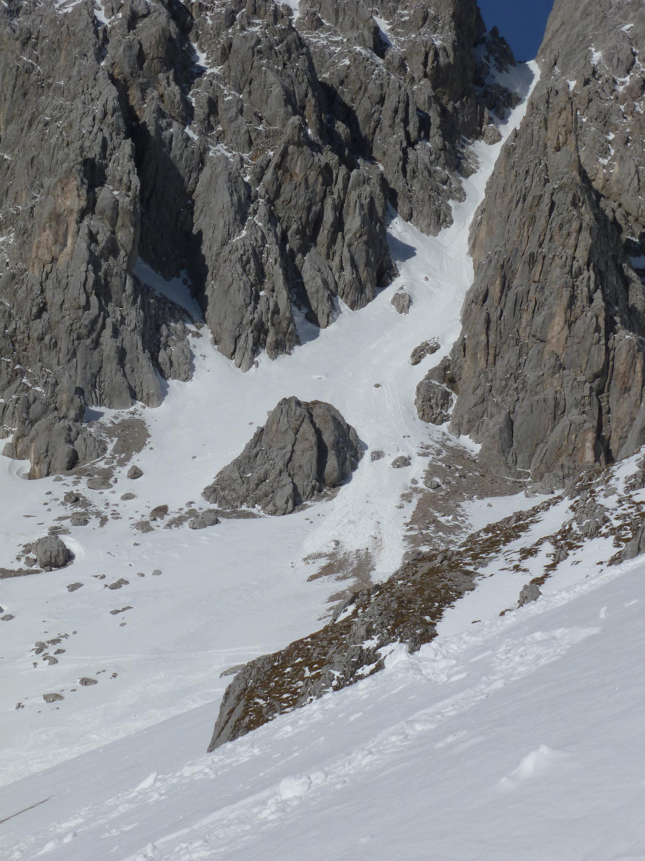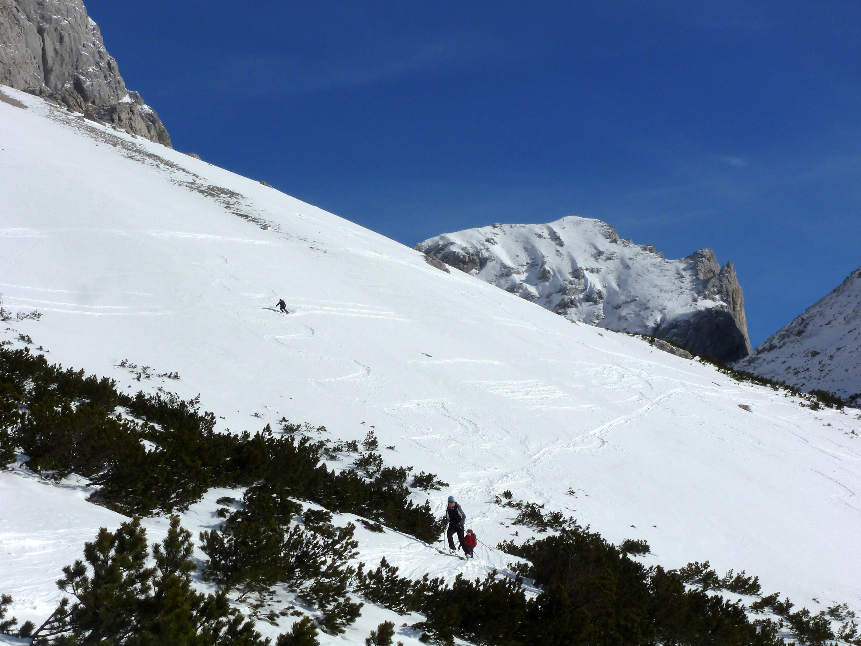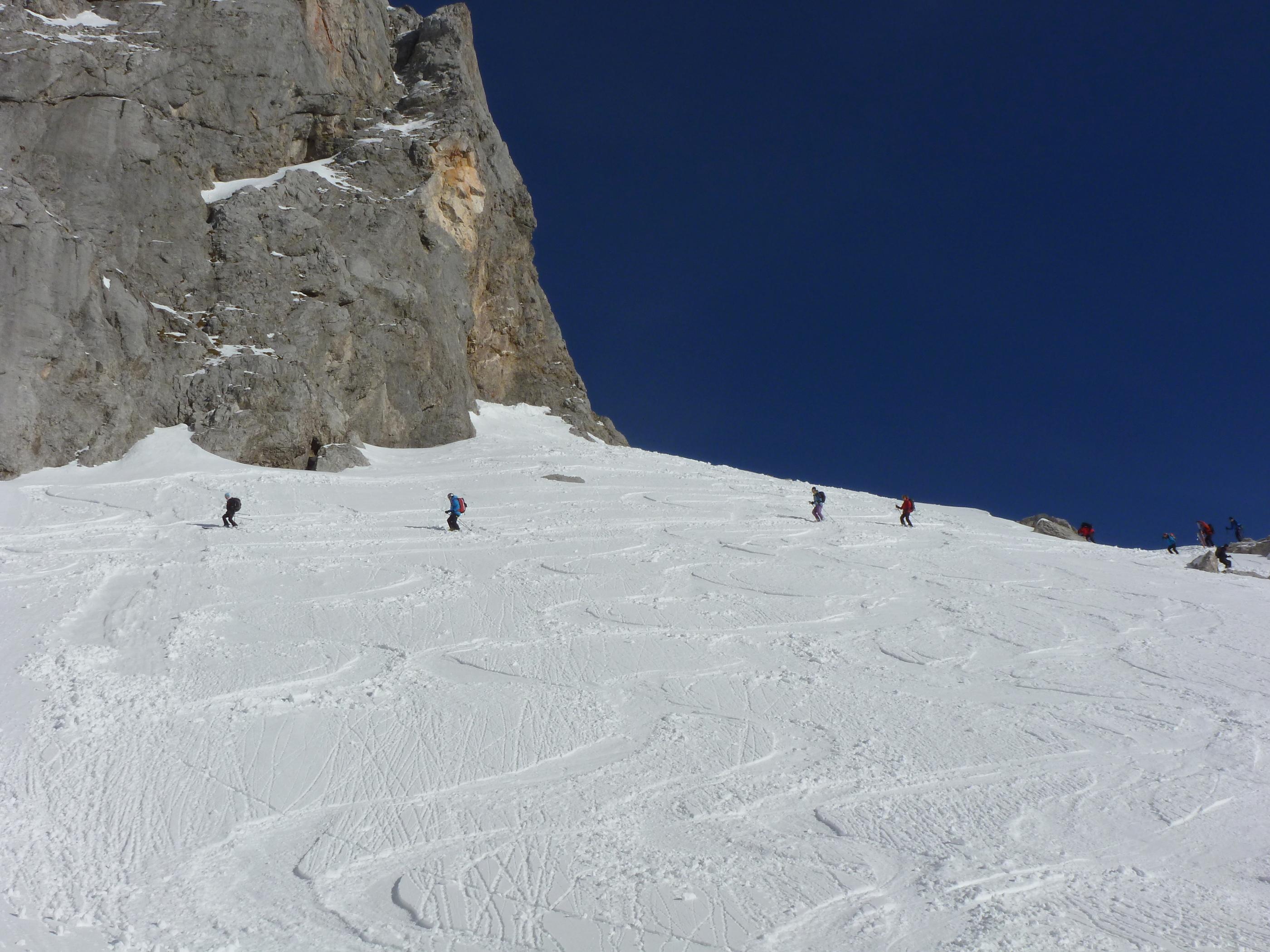 Dem Bericht und den Spuren von N. Zollhauser folgend, konnten wir zum Jahresausklang gleichfalls noch letzte Pulver-Reste entdecken, wobei Wind und Sonne schon wieder ein Stück Arbeit mehr verrichtet haben. Gegenüber dem gestrigen Pulver im Gebiet um die Südwiener im Vergleich jedoch deutlich geringere Neuschnee-Auflage. Auch alle Varianten der Sulzenschneid und des Windlegerkares mit seinen steilen Seitenästen waren stark besucht. Bei der Abfahrt konnten wir gegen 13:00 Uhr einen spontanen Lawinen-Abgang aus einer der steilen Rinnen beobachten, der auch über ein bereits teilweise ausgapertes Geröllfeld drüberfuhr. Den Latschengürtel rund um den Schnittlauchmoosboden sollte man bei den dzt. Verhältnissen zumindest in der Abfahrt am besten umgehen. Abfahrt auf der Rodelbahn bis zum Parkplatz befahrbar, ganz unten zwar eisig, aber weitestgehend steinfrei!