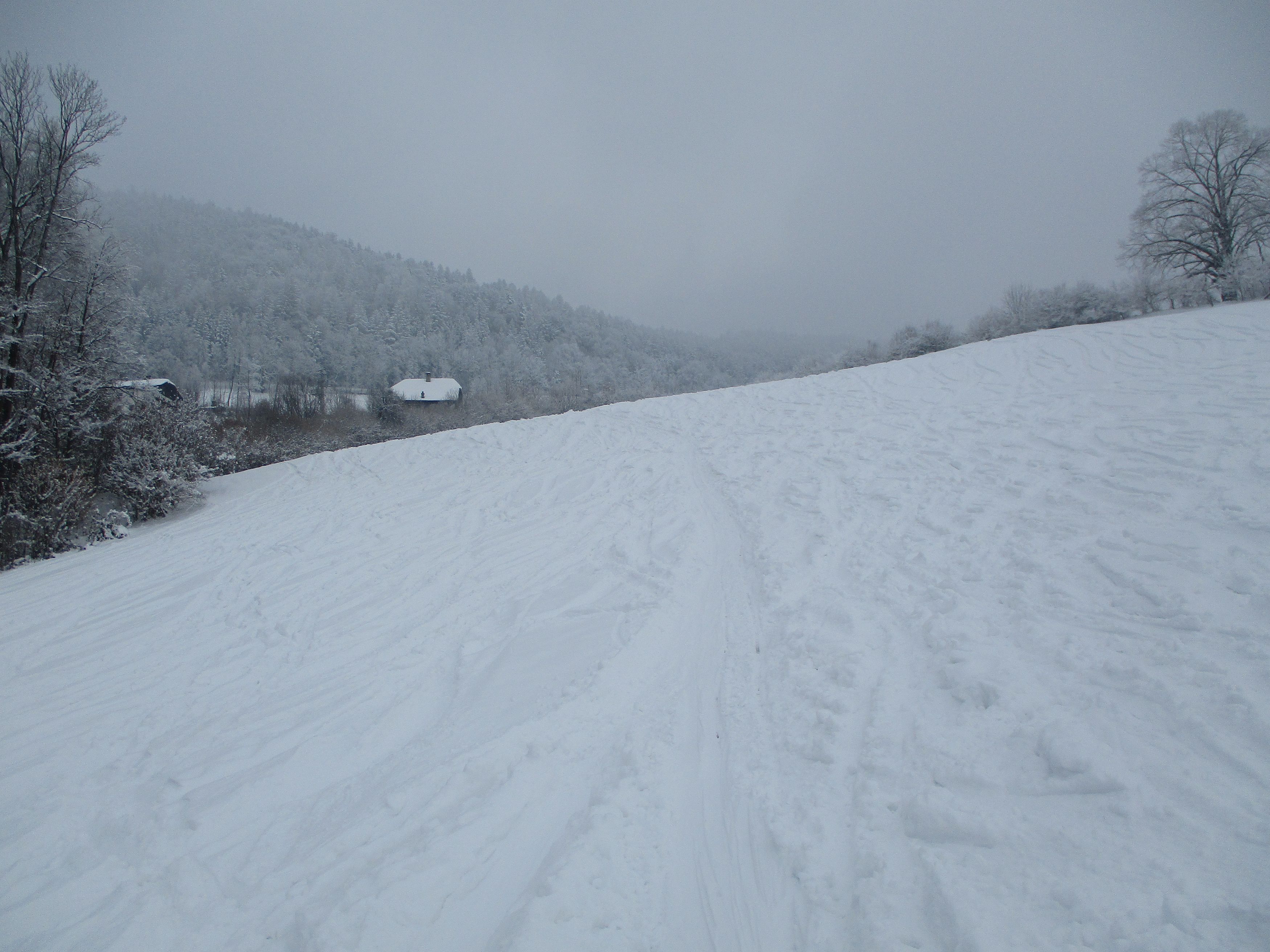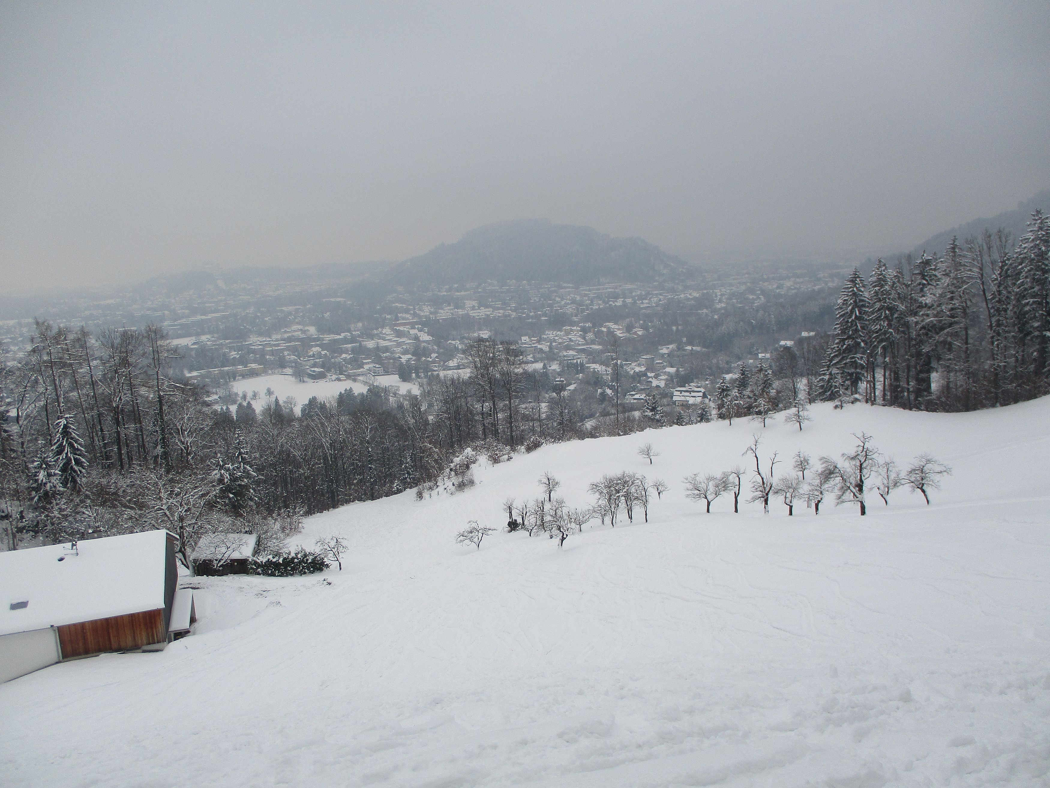 Gaisberg von der Gänsbrunnstraße. Die Bauernwiesen sind ohne Bodenkontakt zu befahren ,dafür schon stark verspurt. Eine Abfahrtsvariante vom Gipfel zur Bahntrasse war rustikal, die Bahntrasse von der Gaisbergstraße zum Rundwanderweg gut zu befahren. Die Waldabfahrt ( Hohlweg) zur Gänsbrunnstraße ist größtenteils eisig im letzten Teil auch steinig. Wetter : stark bewölkt,ab Zistelalm kalter Wind.