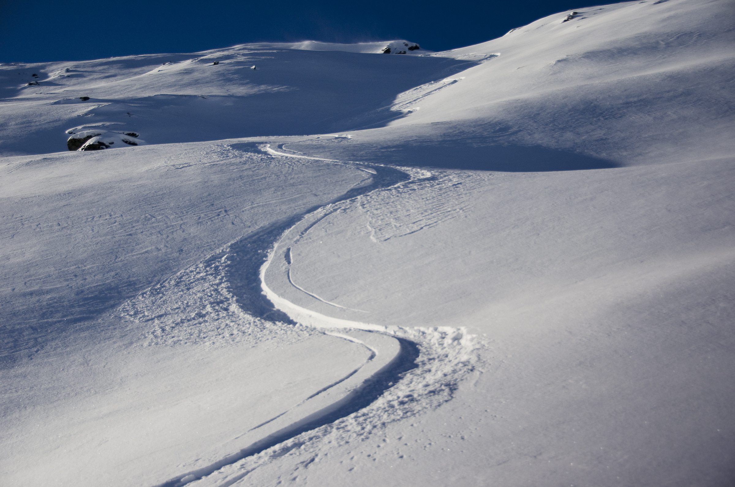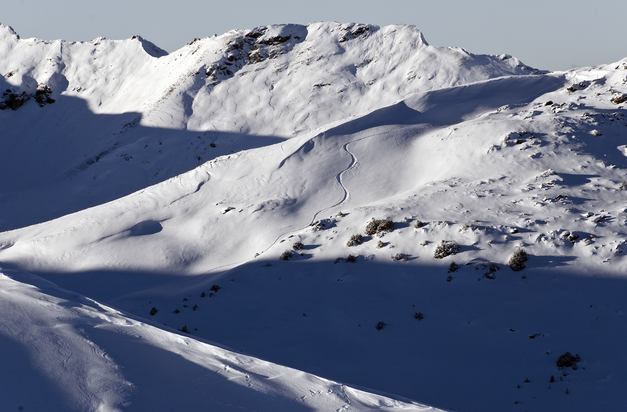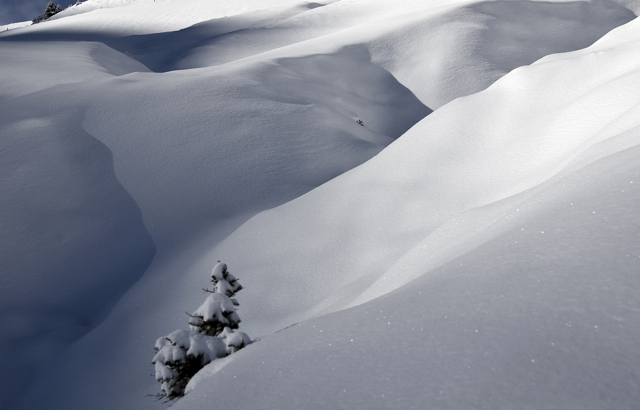 Die Abfahrt nach Norden ist im oberen Teil noch schneearm, aber im Lärchenhang staubt der knietiefe Pulver.