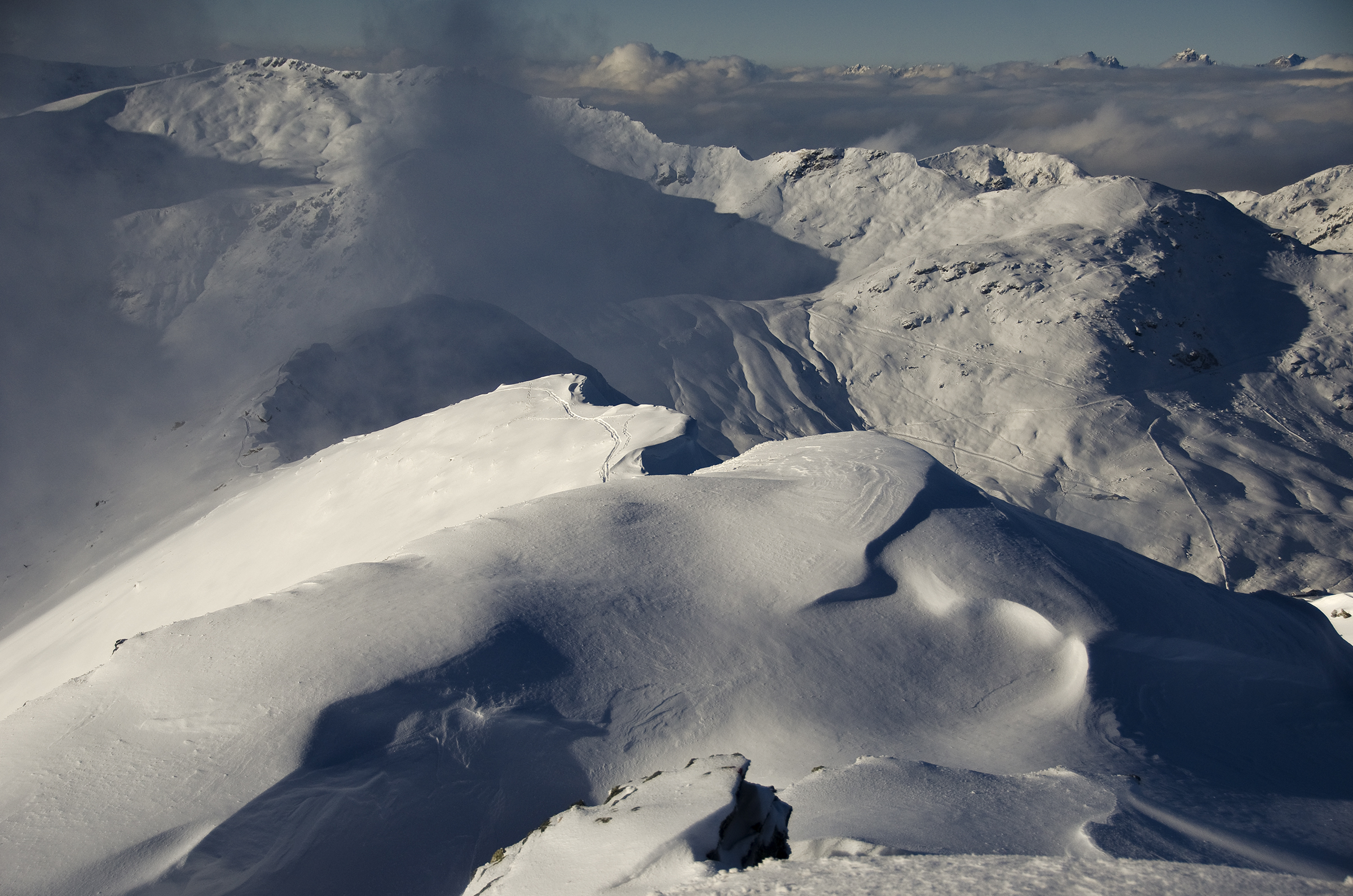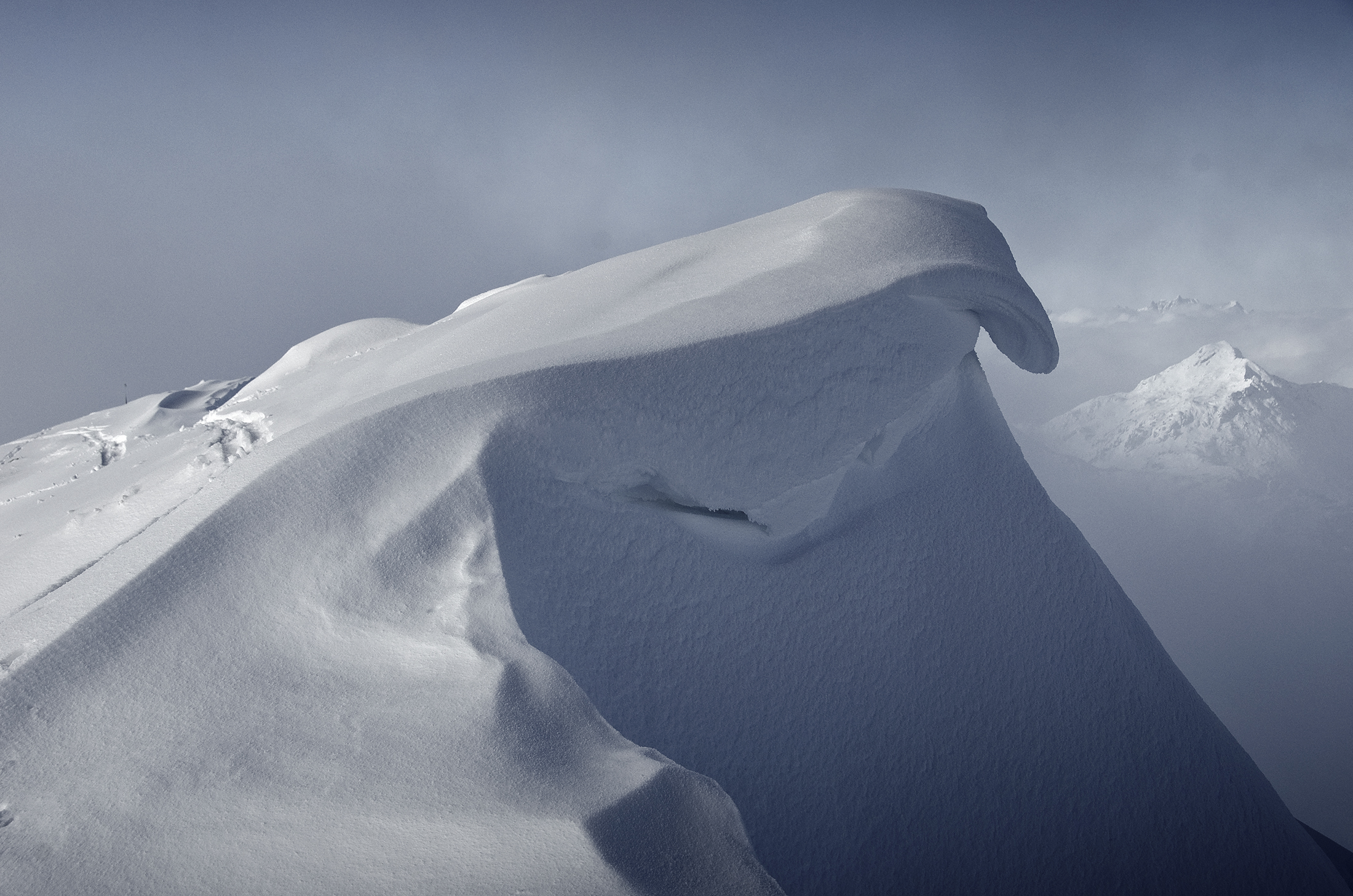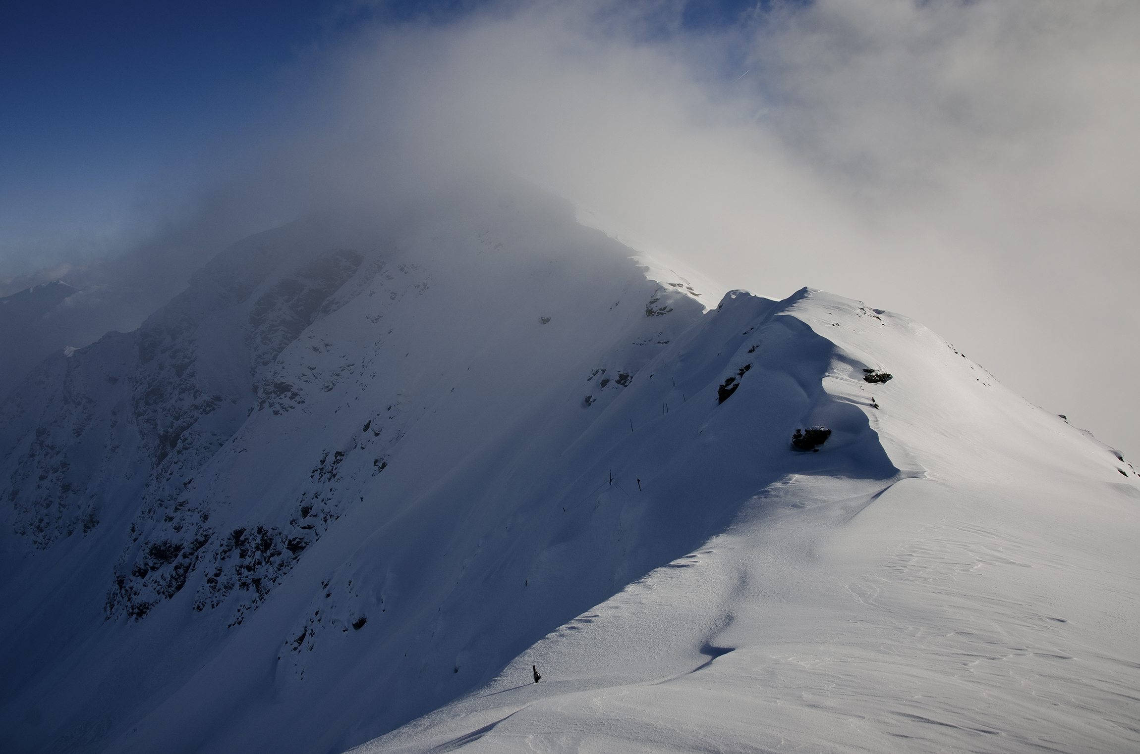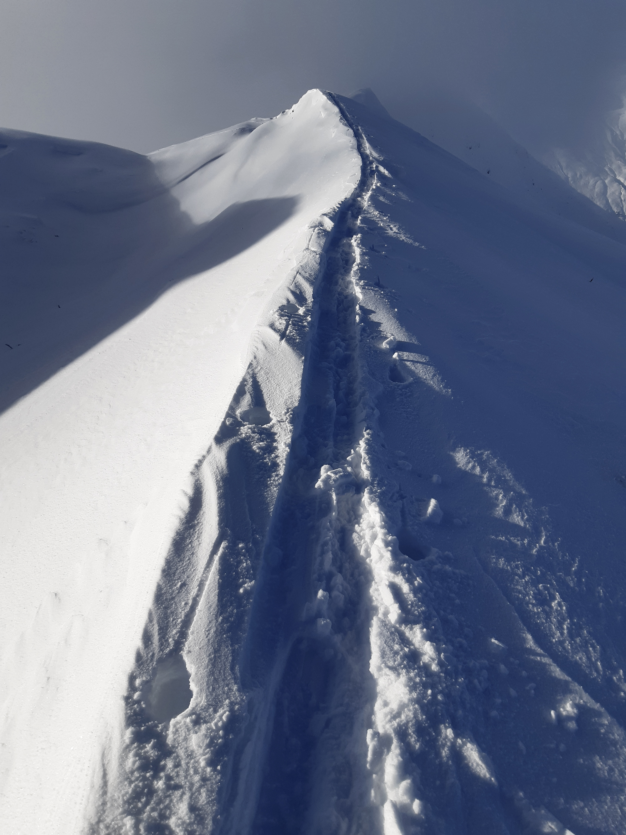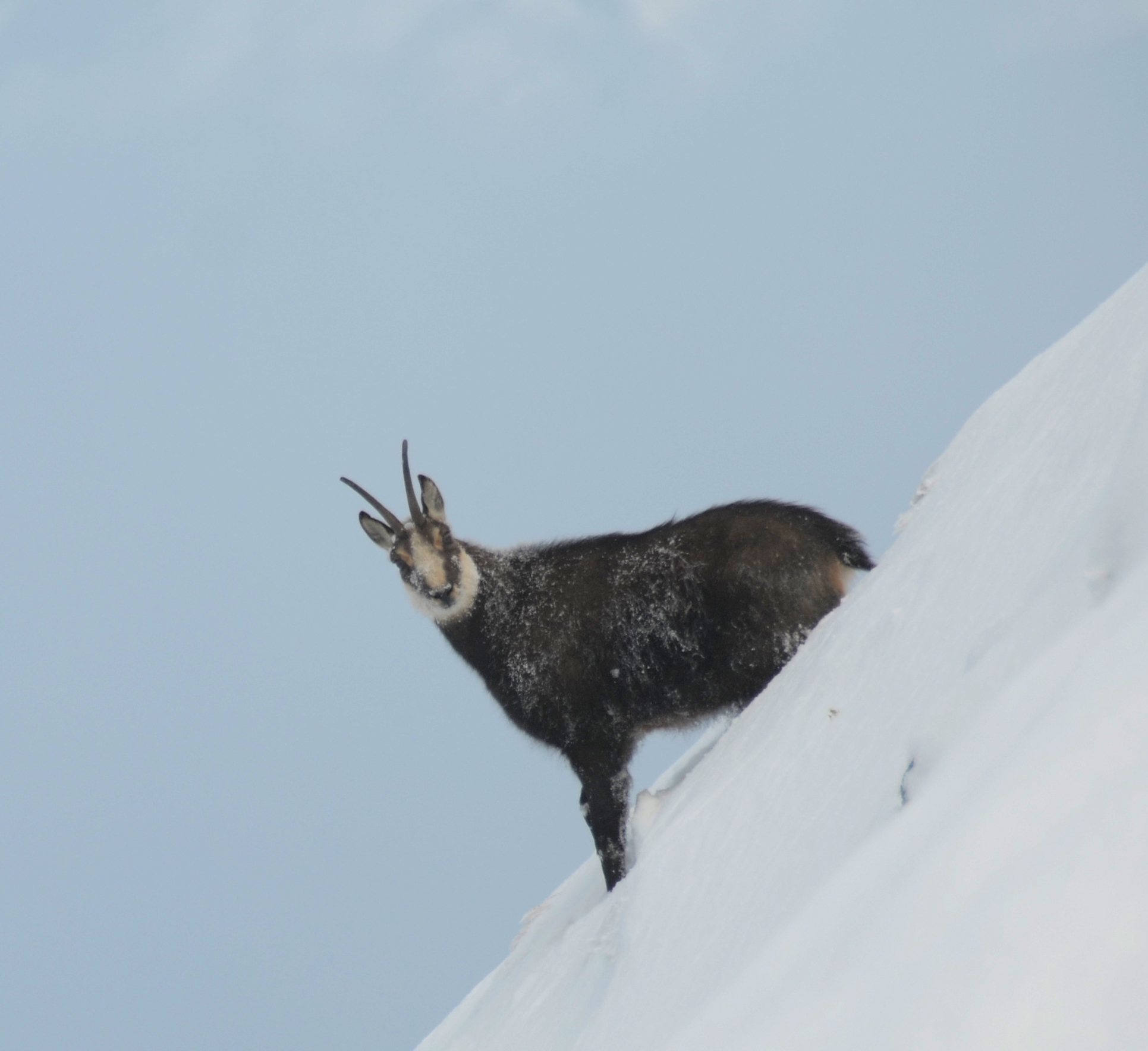 Am Grat zum Manlitz weht eisiger Westwind. Der Schnee ist abwechselnd Triebschnee und Windharsch, und die Sicht ist schlecht, weil aus dem Oberpinzgau die Wolken hinaufdrücken. Weiter oben liegt sogar eine dünne Neuschneeschicht am Grat. Plötzlich steht ein weiterer Einzelgänger vor mir: Die Gams ist ebenso überrascht wie ich.
