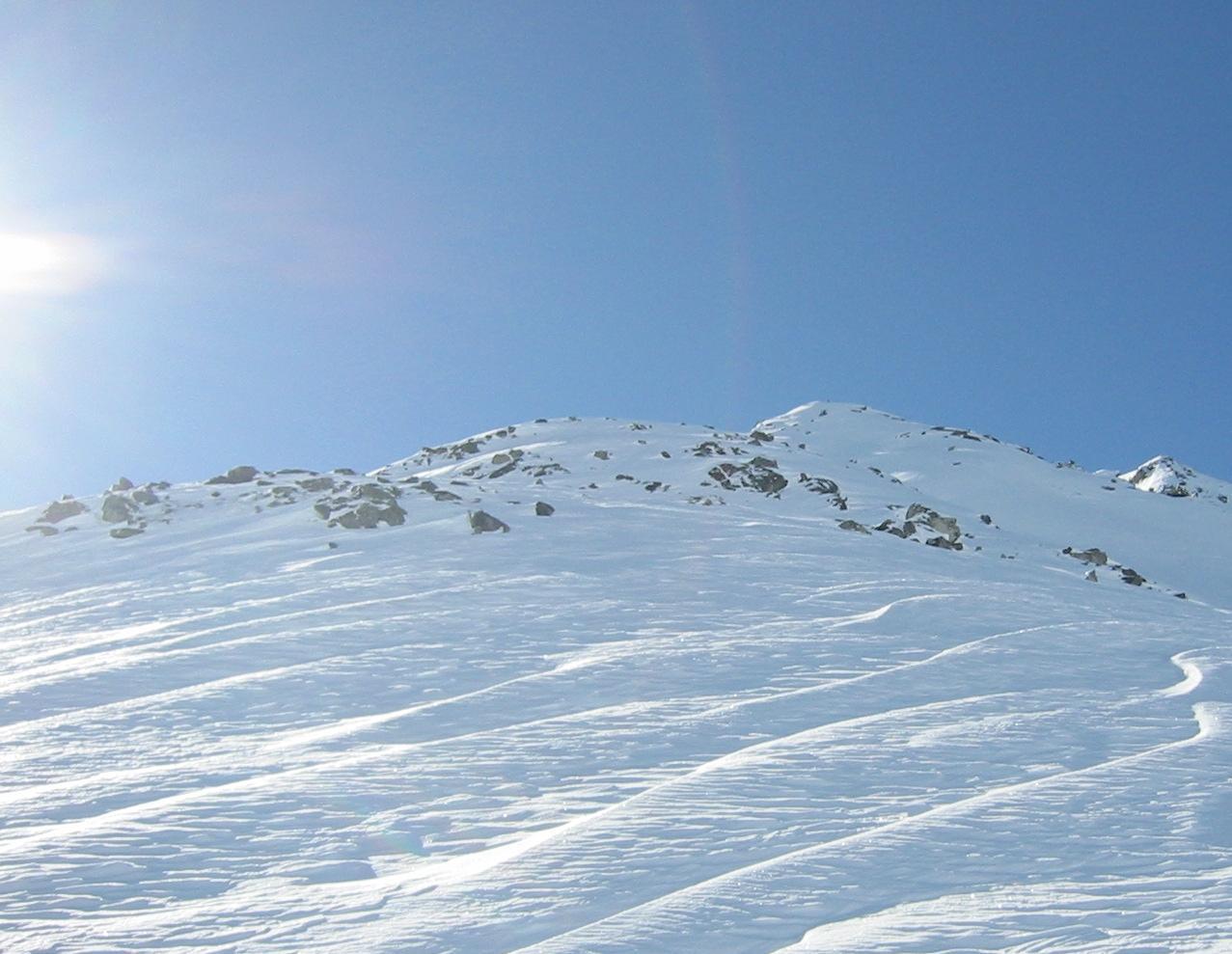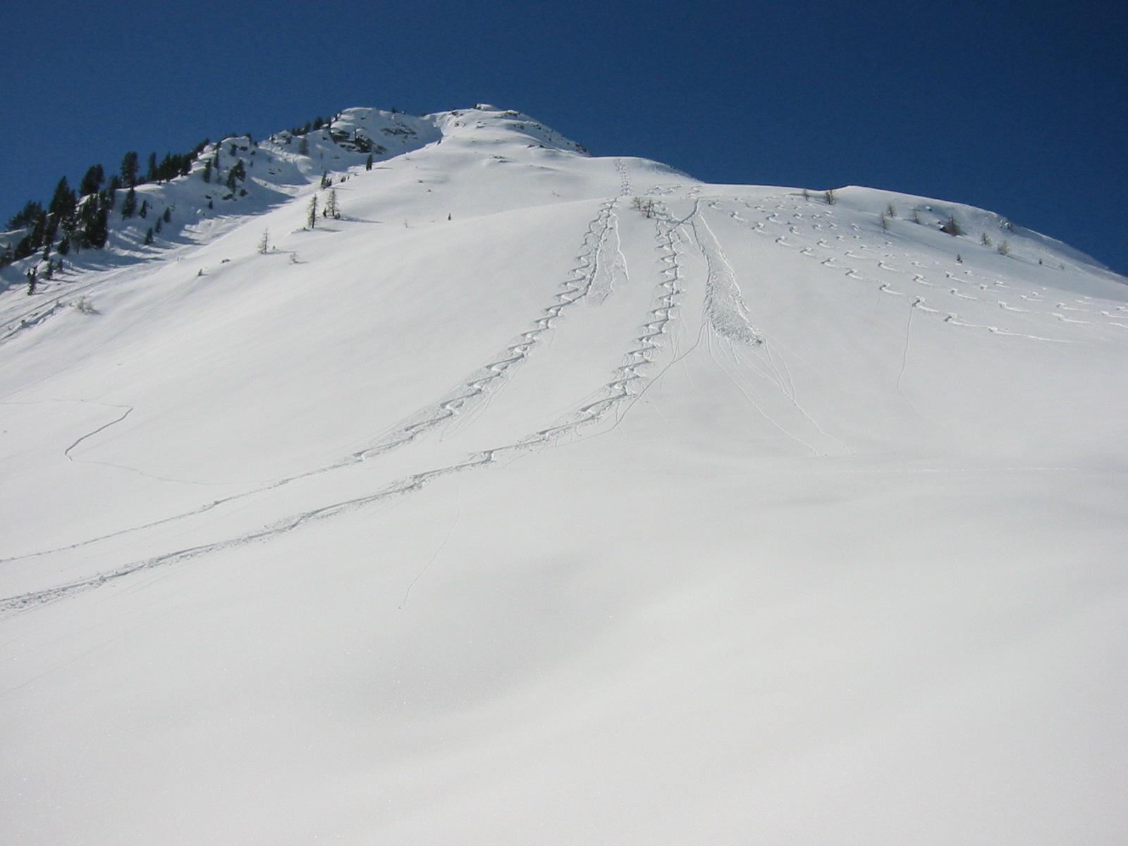 die schneckenköpfe (vorgelagerte gebirgsgruppe zur wildkarstpitze) zählen sicher nicht zu den idealen skitourenberge. ich persönlich kenne nur 3 personen, die sich bis dato in diese gegend ihre tiefschwünge versucht haben. dennoch ist der abgebildete hang einer der reizvollsten für mich. aufgrund seine eponiertheit (NO) und seinem gefälle (?) leider auch nur selten befahrbar. heuer gelang es mir glücklicherweise 2 mal.