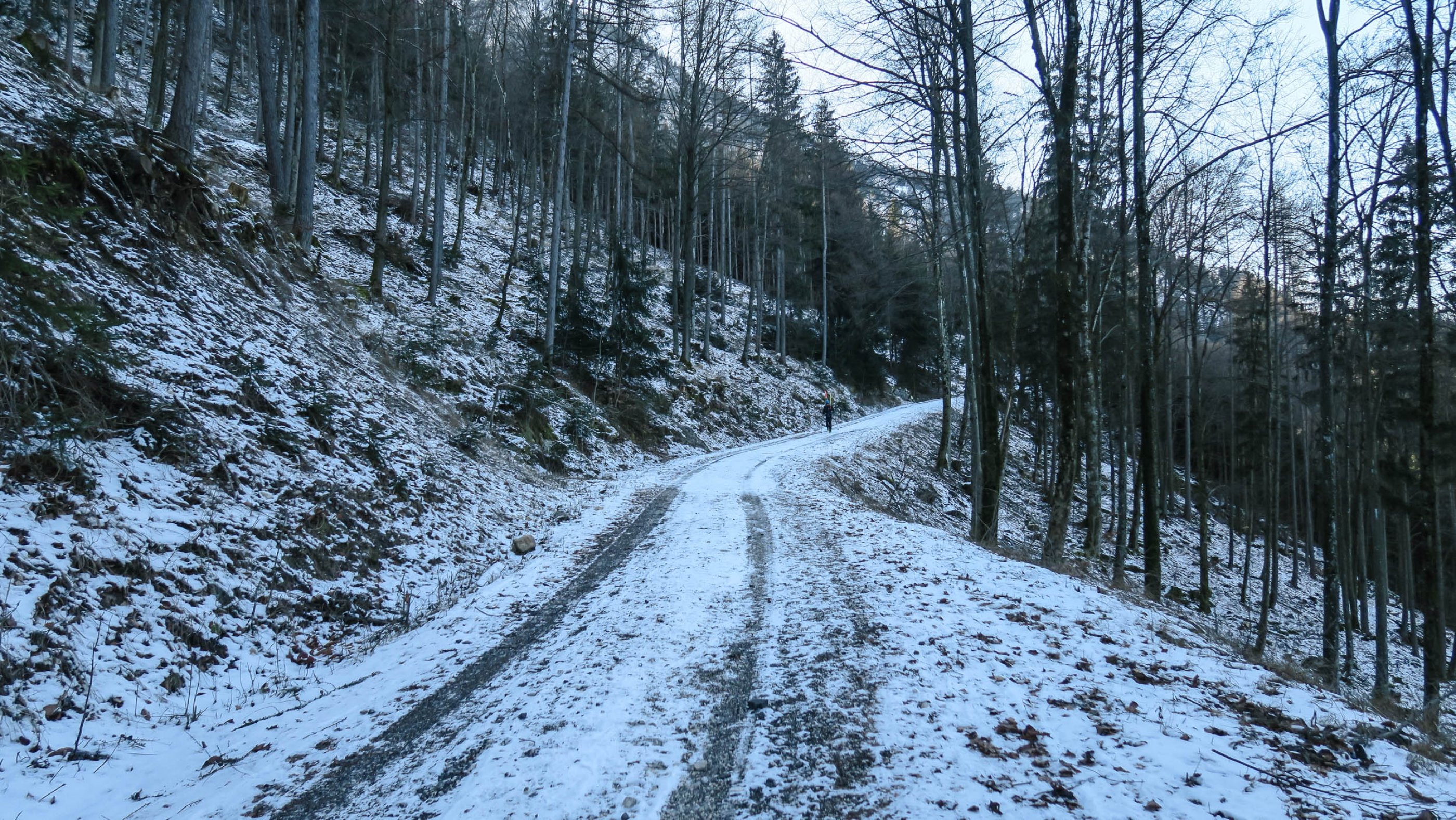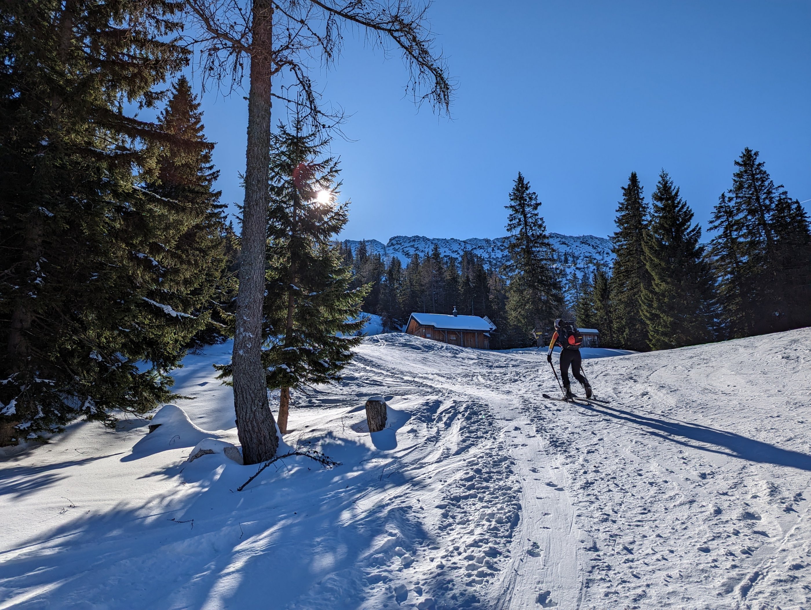 Steilhang hat nur 2cm Schnee mit Steingarnitur, daher tragen wir fast bis kurz unter die Abzweigung (zur Umfahrung). Ab dann mit Ski bergauf. Hinunter nehmen wir dann die Umfahrung, die geht bis kurz vor der vorletzten Kehre (je nachdem wie sehr man seine Ski mag). Also ca. 150 - 200hm tragen.