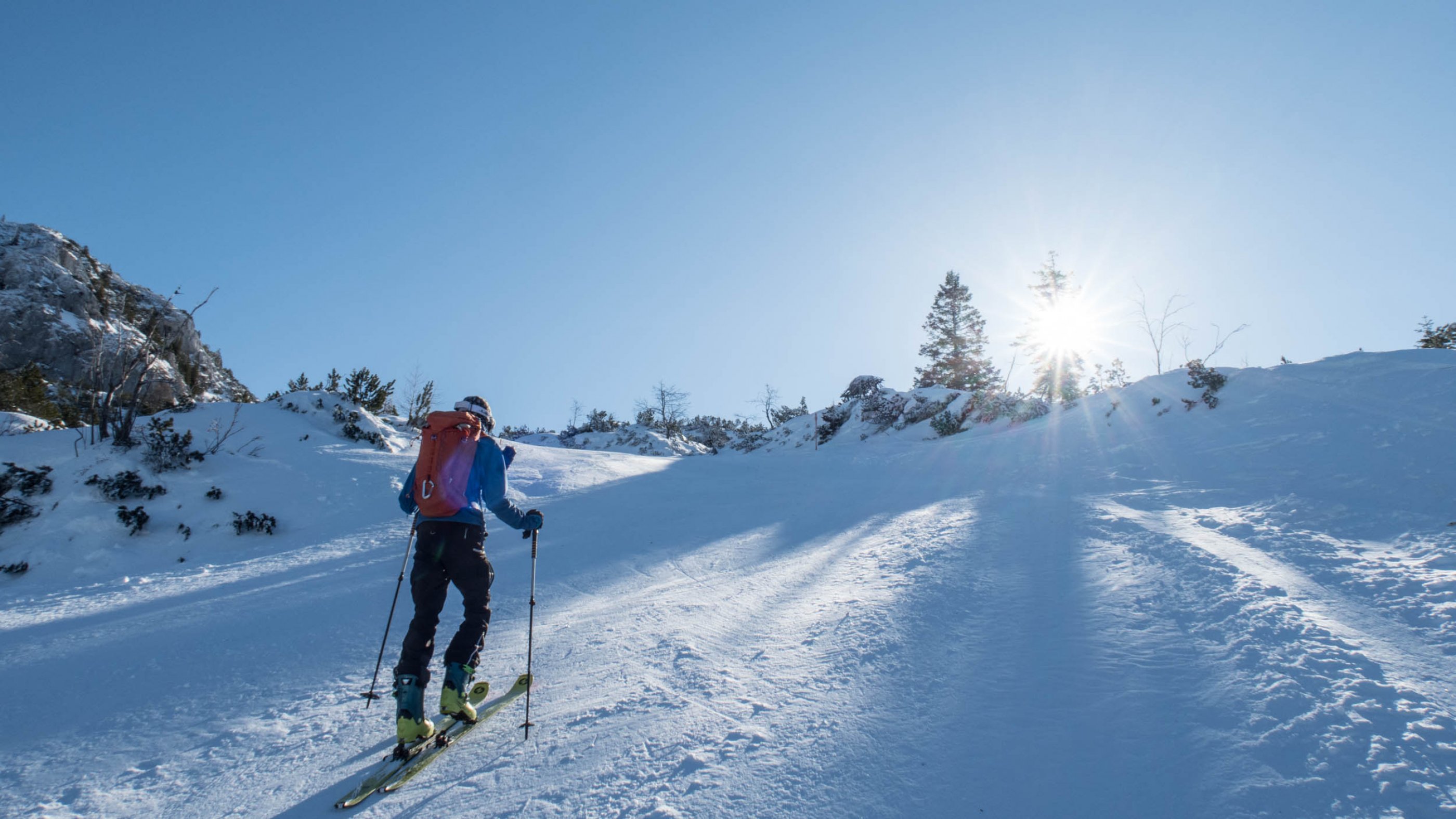 Untersberg-Stoaski einpackln und los gehts. Zapfig ist's nur kurz, über den Steilhang wird einem eh gleich warm.