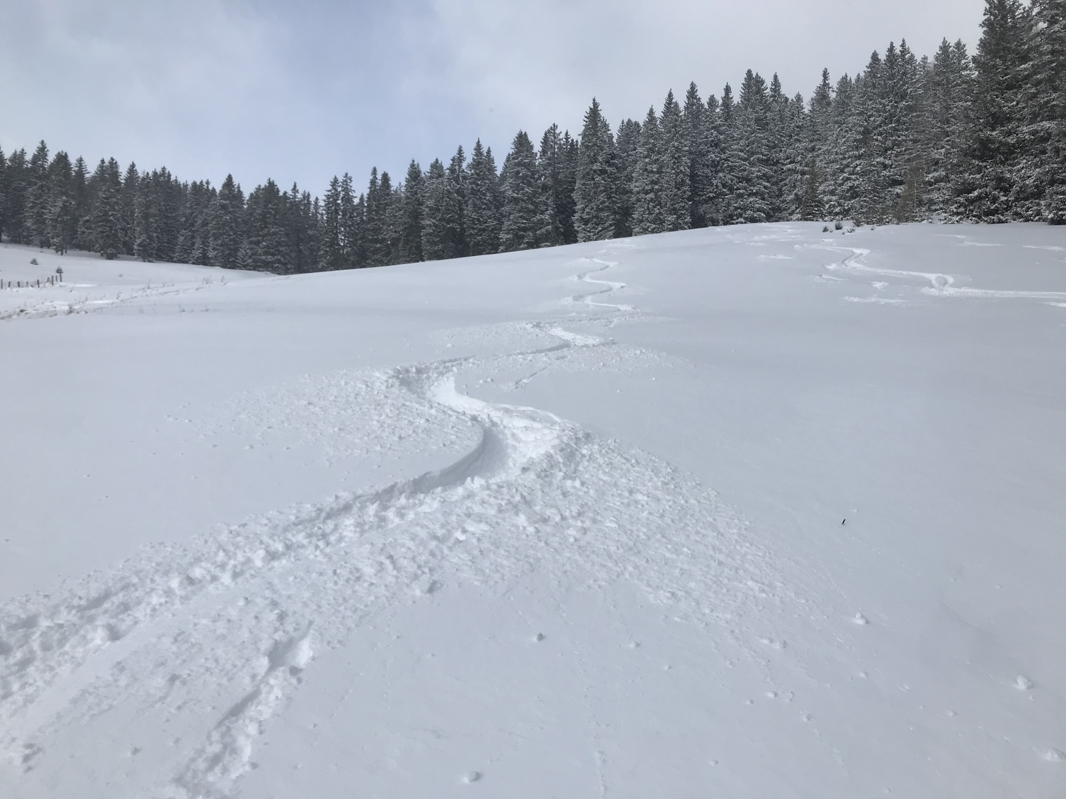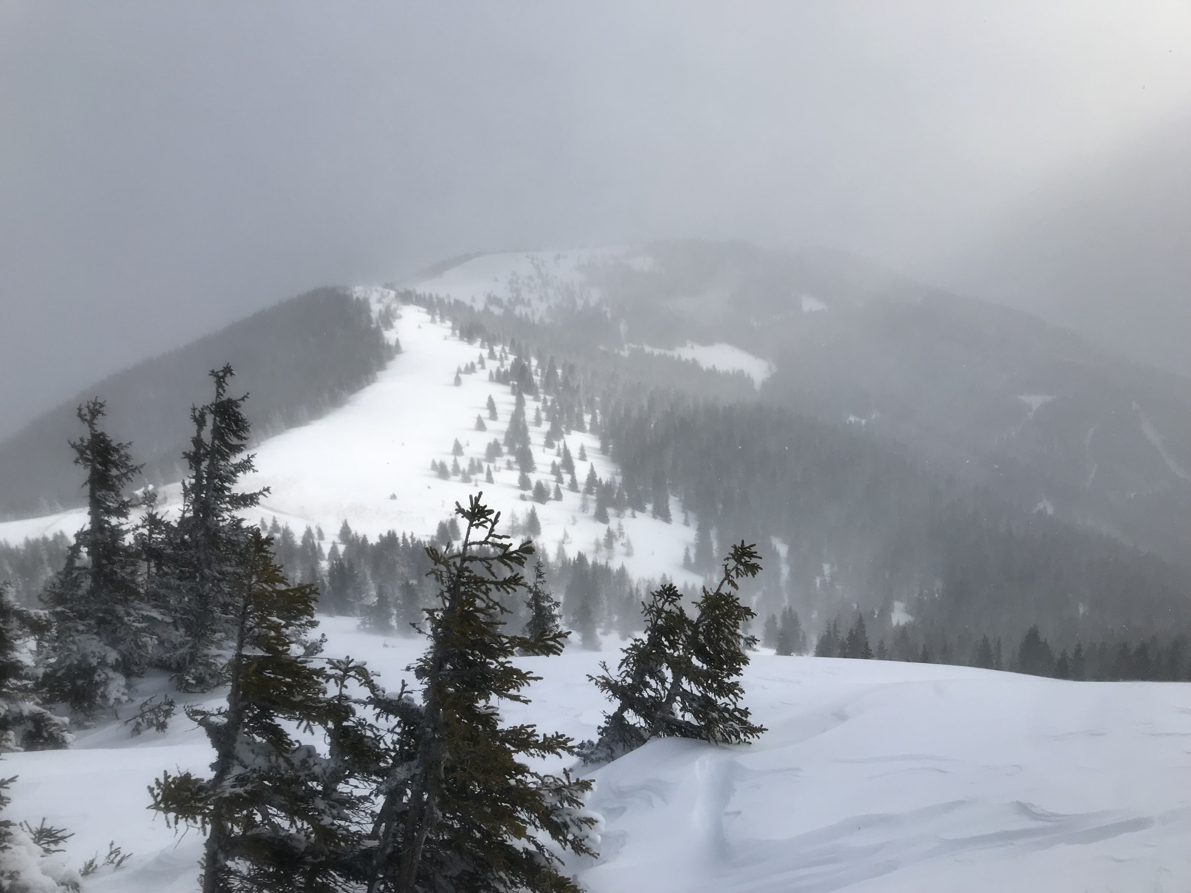 vom Parkplatz in der Gaal weg ausreichend Schnee, weiter oben dann im Verlauf frischer toller Pulver, daher gute Abfahrtsbedingungen. Nur im Gipfelbereich stürmisch mit leichtem Schneefall.