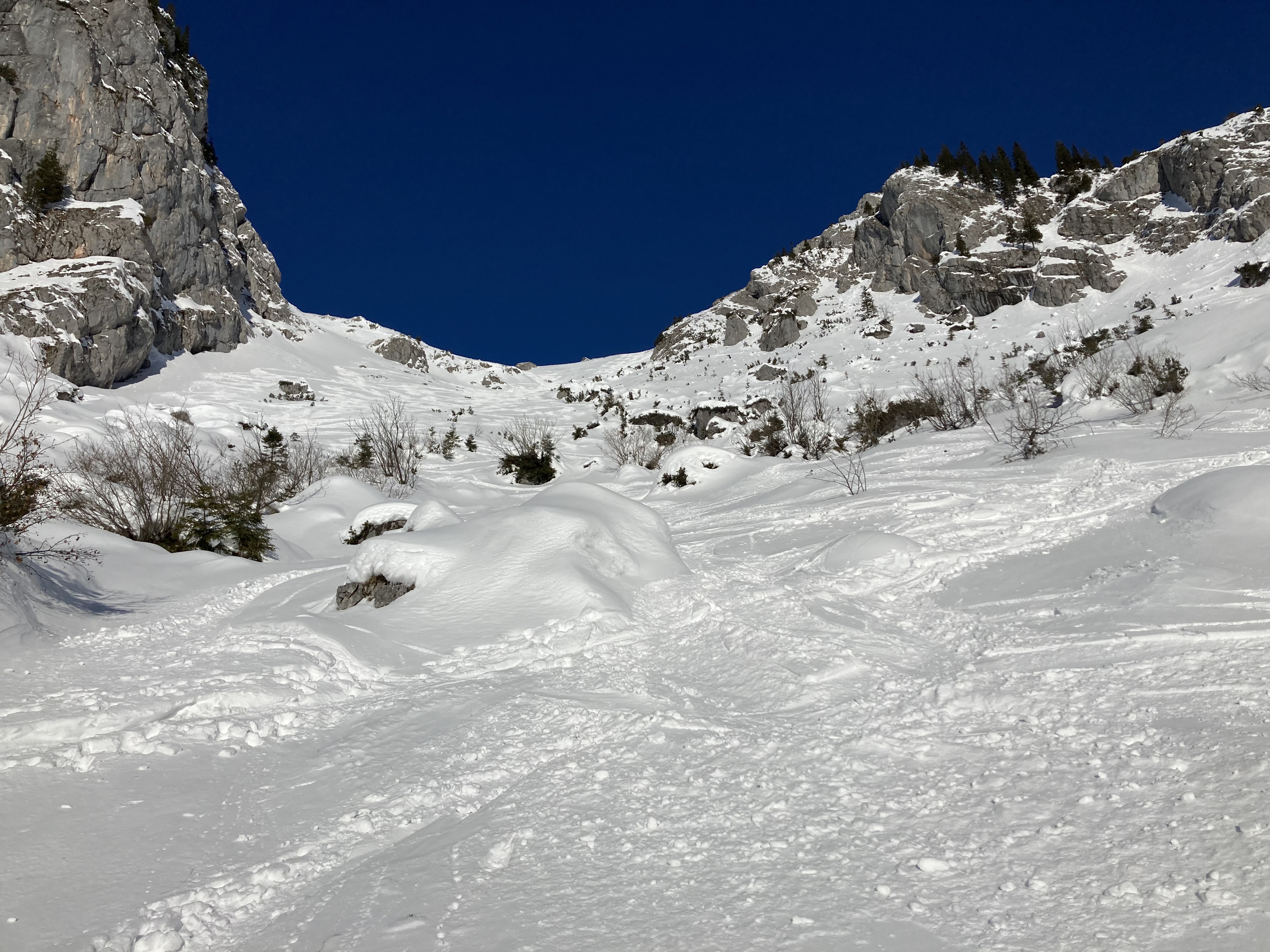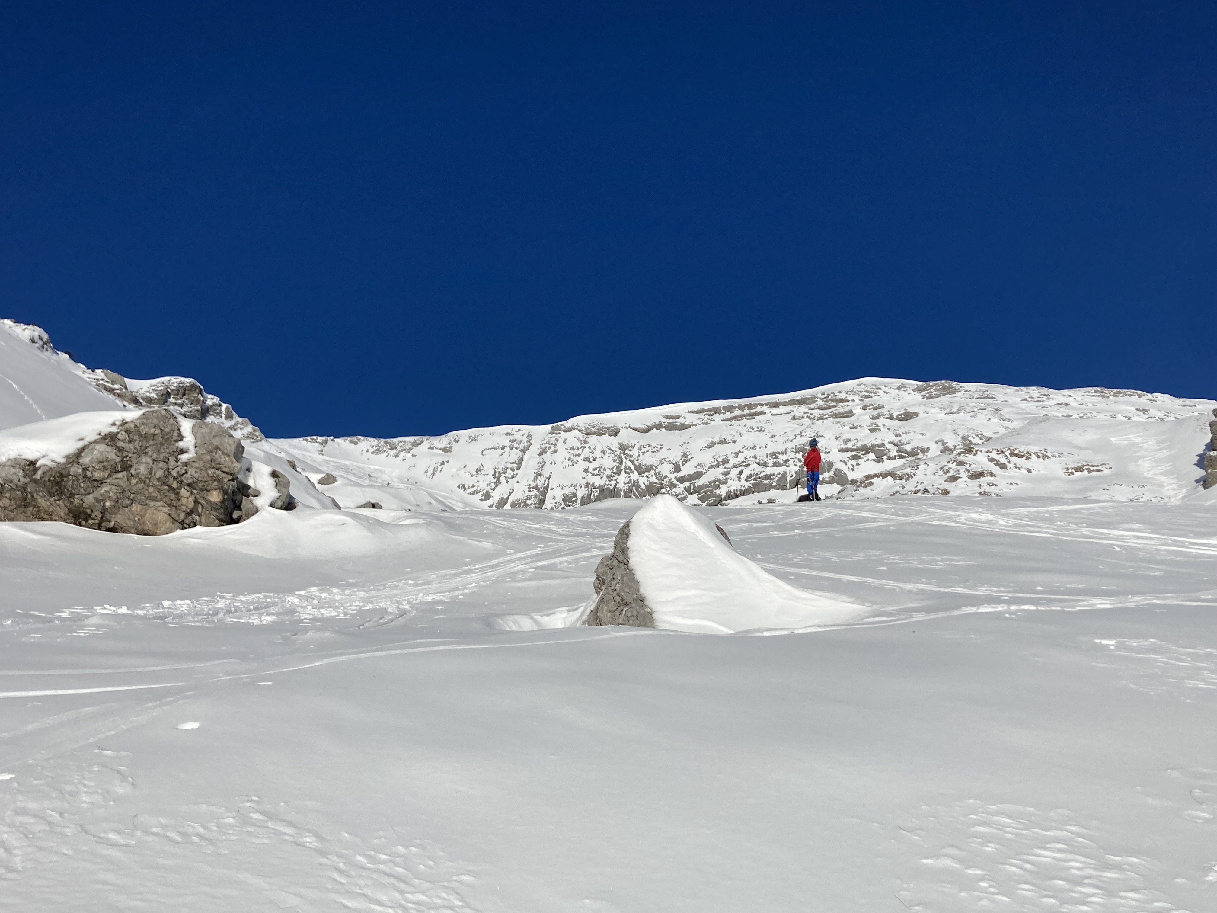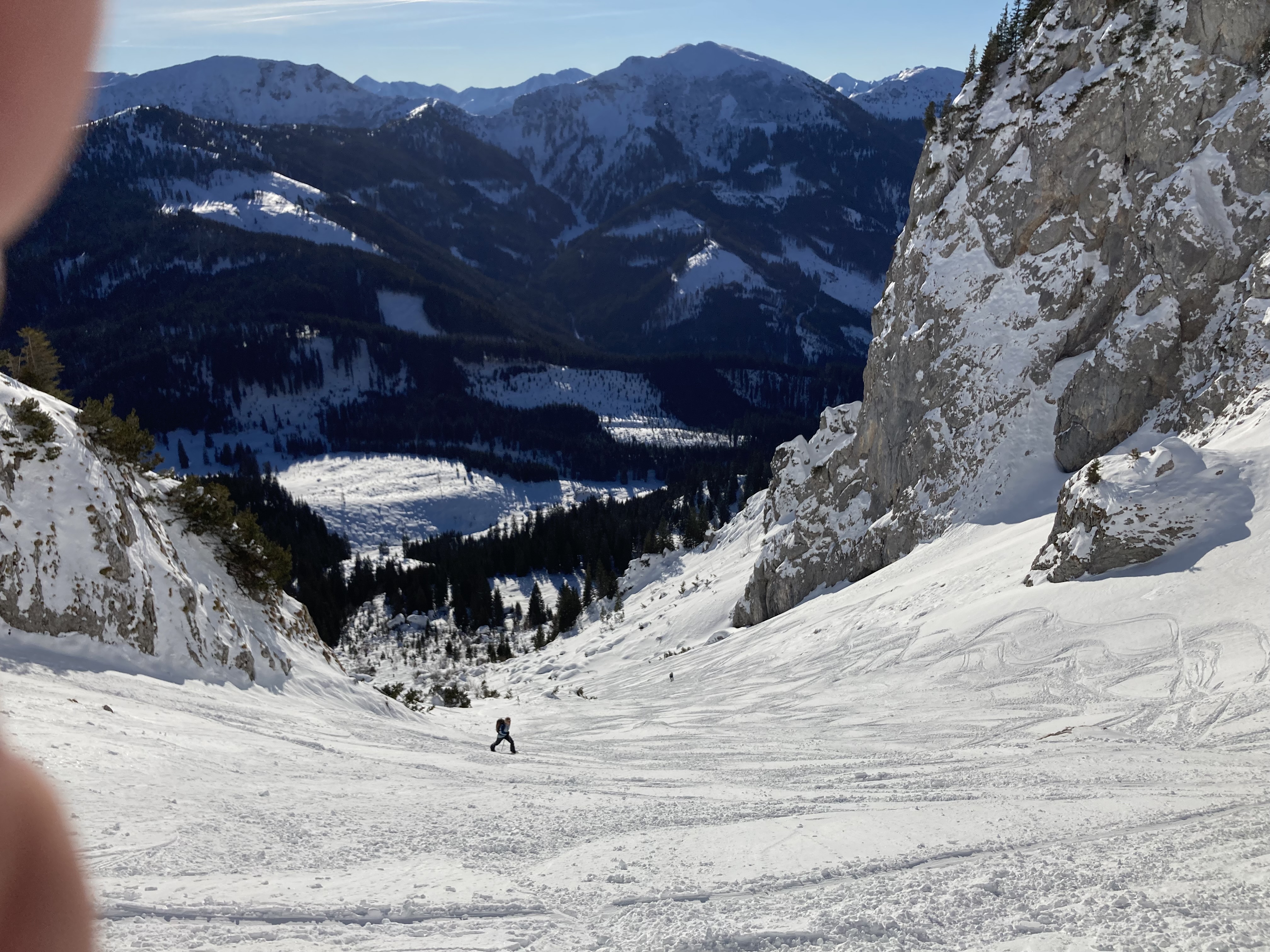 Start bei -11° C am Parkplatz bei der Ebner Klamm; ab der Ebeneralm war es in der Sonne angenehm warm, bzw. zum Schwitzen ;o). Der sonnige Aufstieg bei weitgehender Windstille war ein landschaftlicher Genuss. Die 5-10 cm Neuschnee auf der harten Harschunterlage waren nur im unteren Teil der Tour gleichmäßig verteilt. Vom Gipfel bis auf ca. 1500 m (Direttissima Abfahrt vom Gipfel) waren die Bedingungen teilweise recht abwechslungsreich aber sehr sicher!